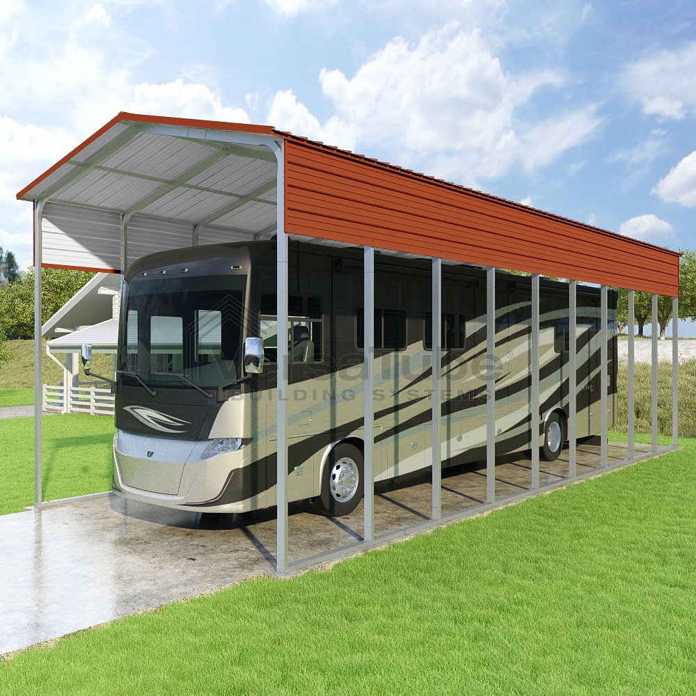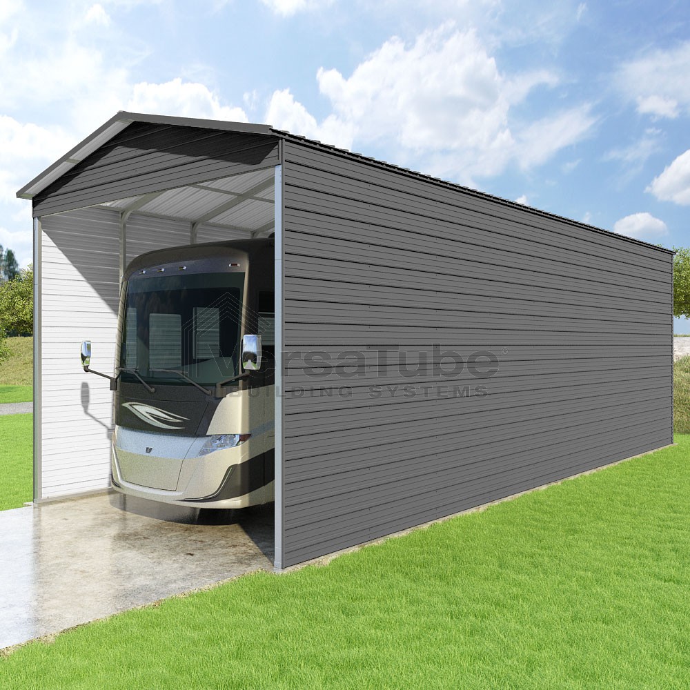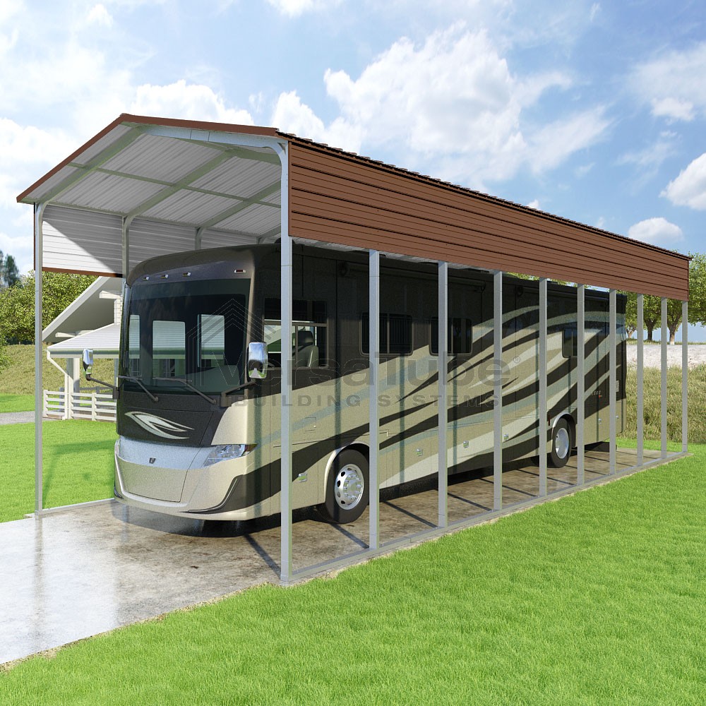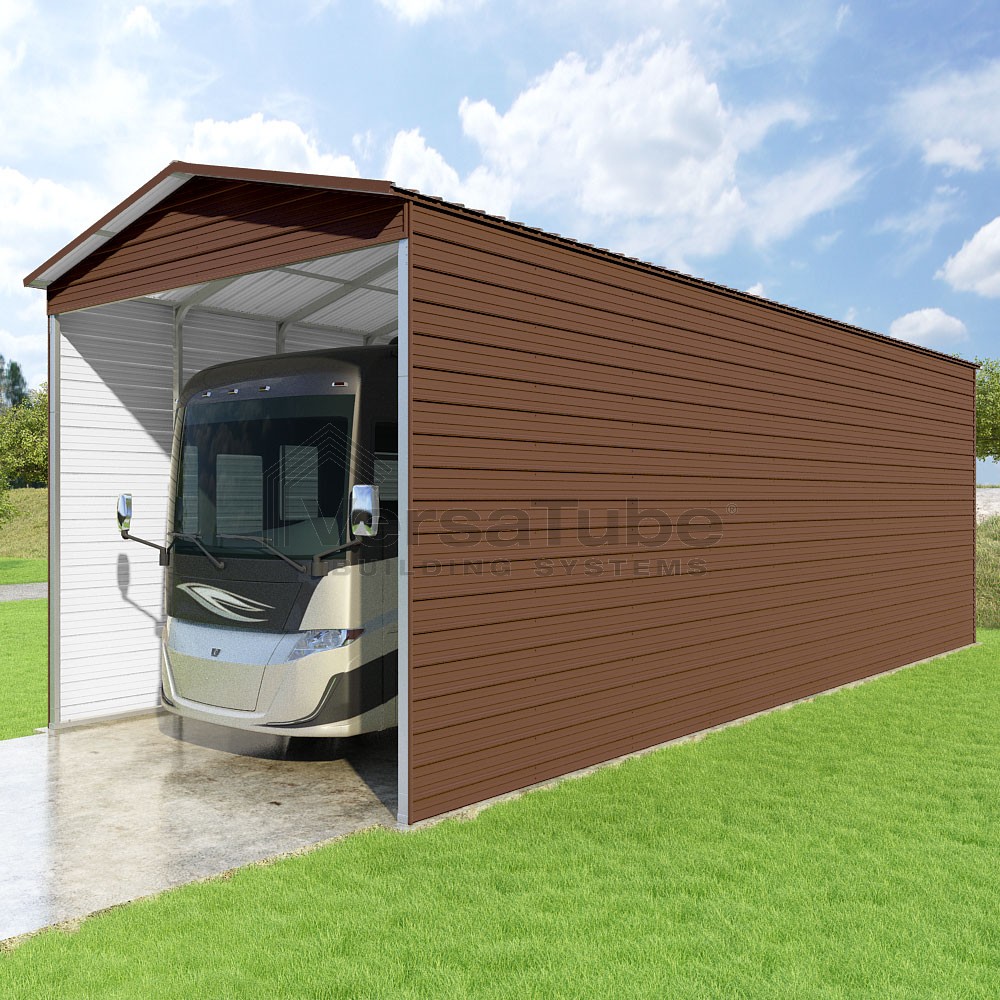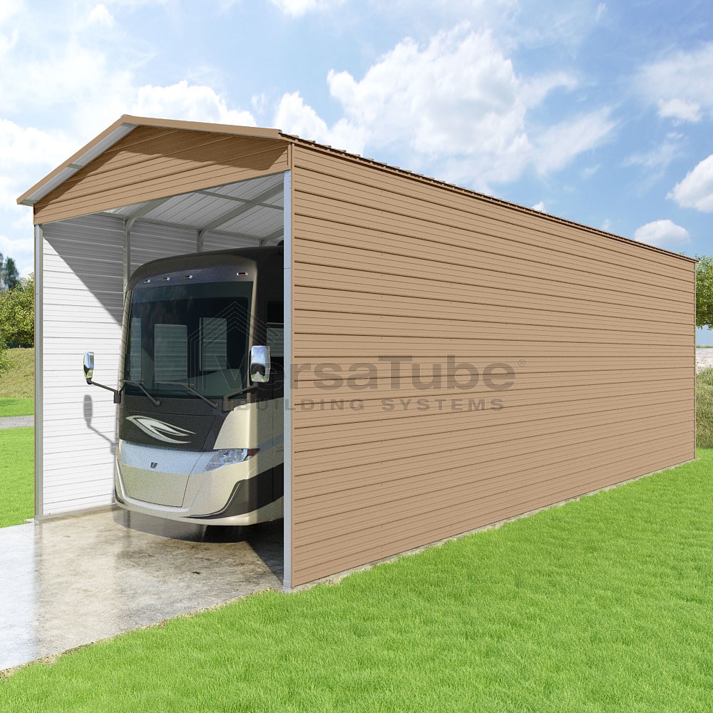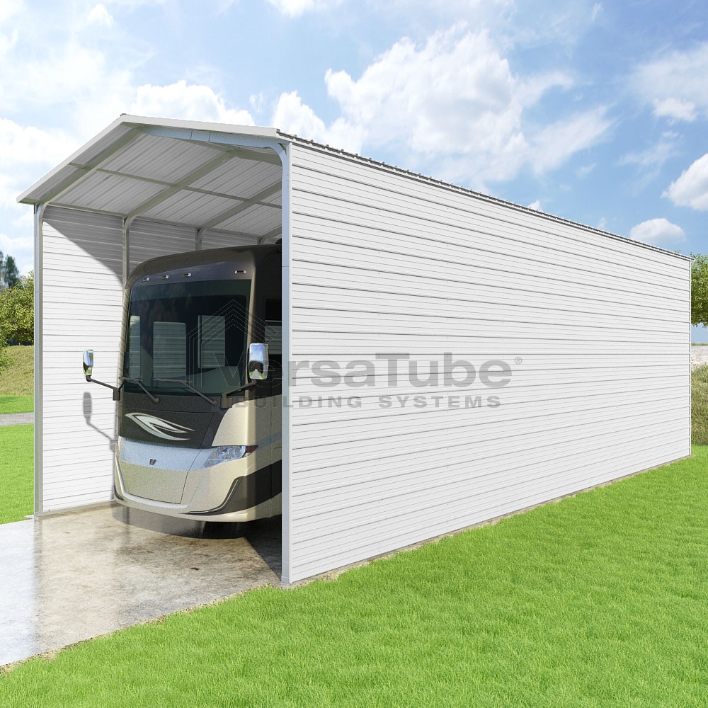 Pinnacle Series DIY carport kit features vertical sheet metal roof panels with ridge cap, gable and eave trim for an A-frame roof style and extended coverage on both ends.
