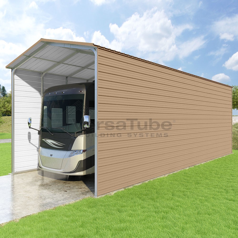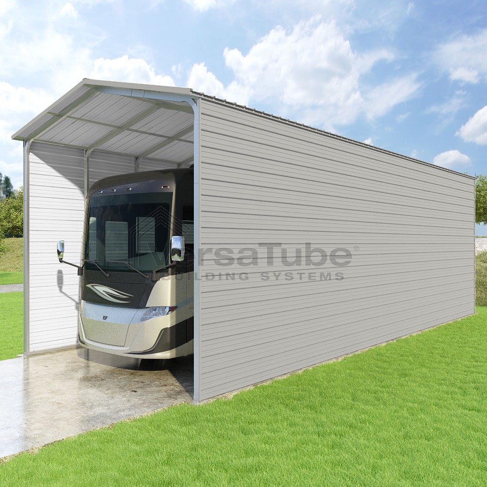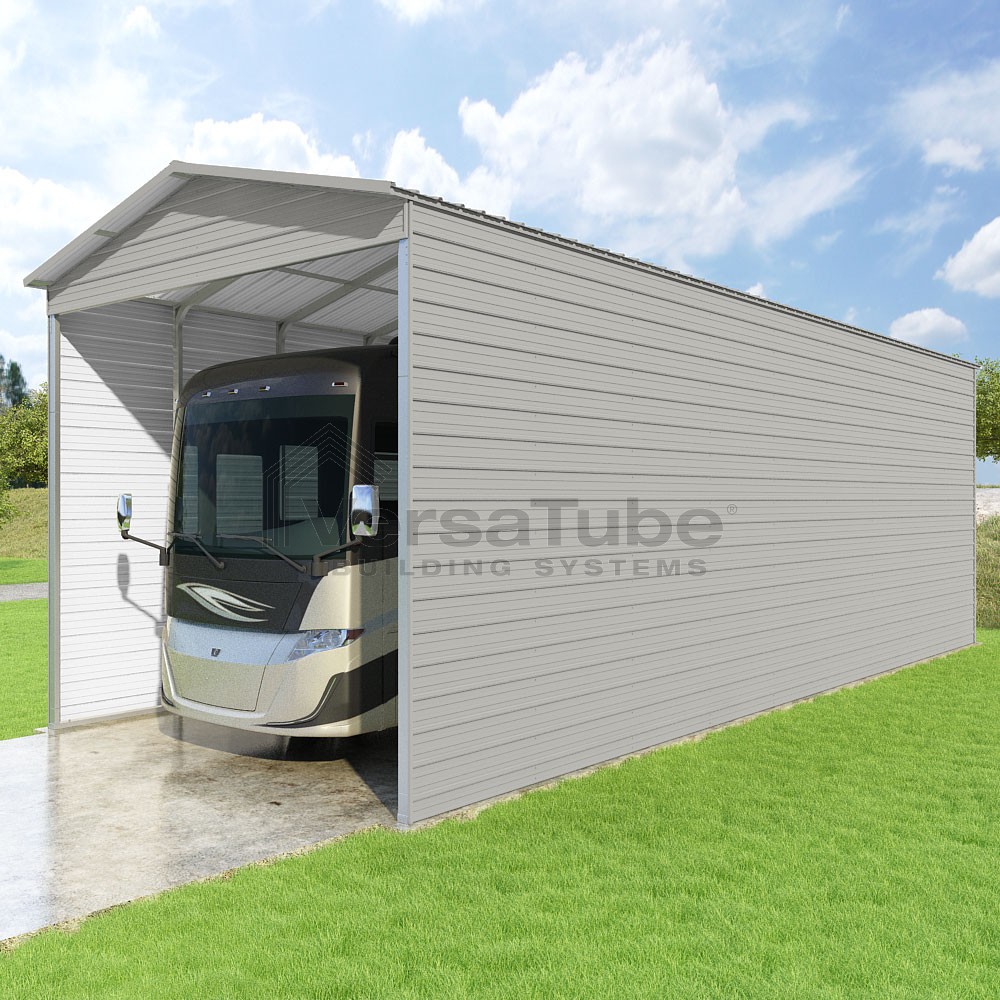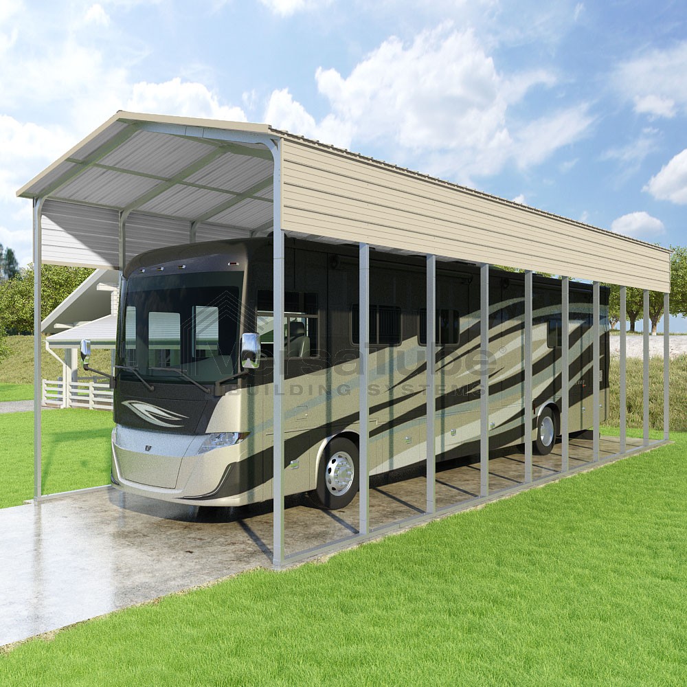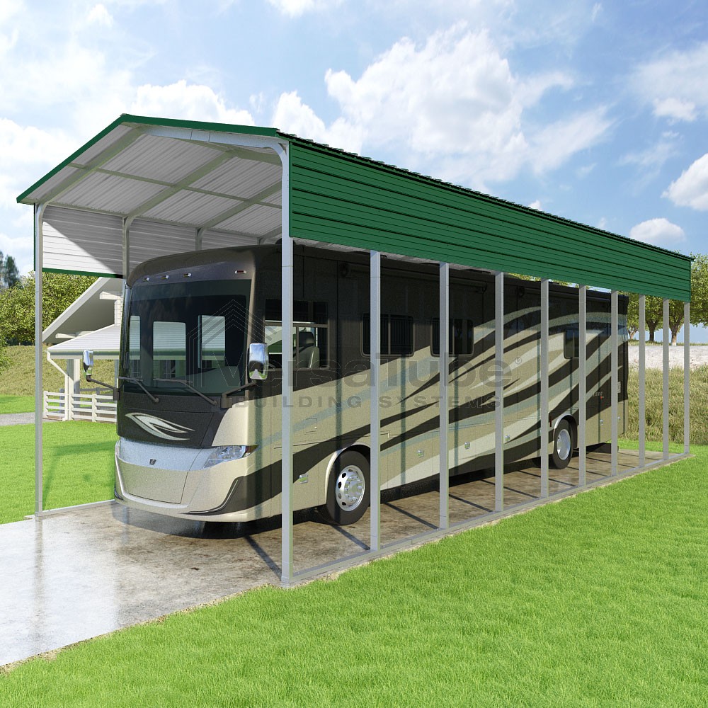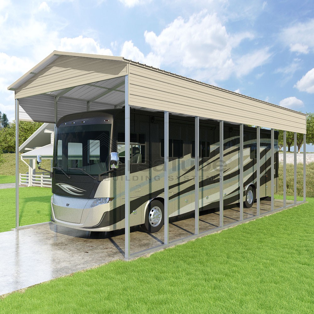 Pinnacle Series DIY carport kit features vertical sheet metal roof panels with ridge cap, gable and eave trim for an A-frame roof style and extended coverage on both ends.