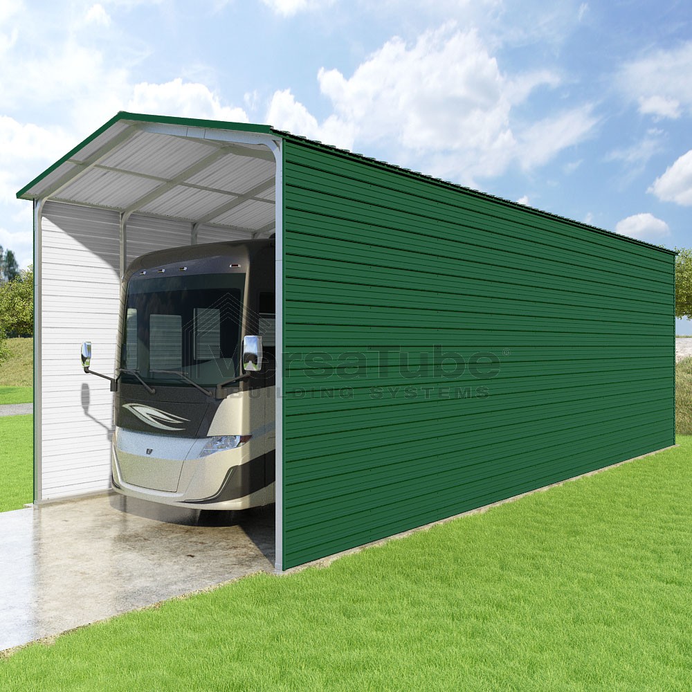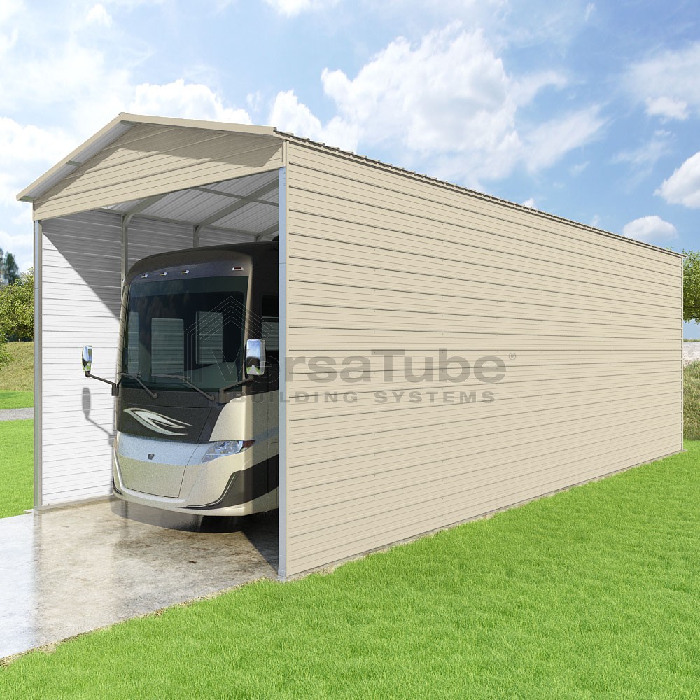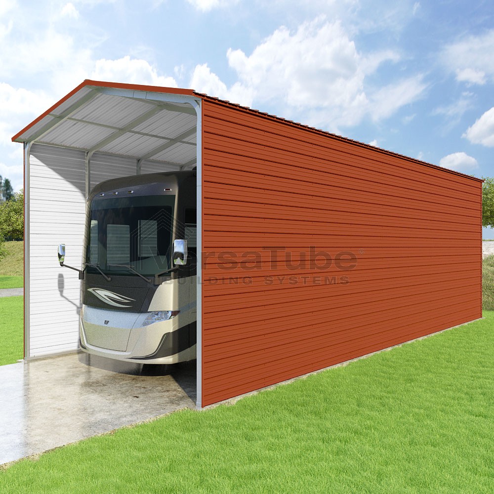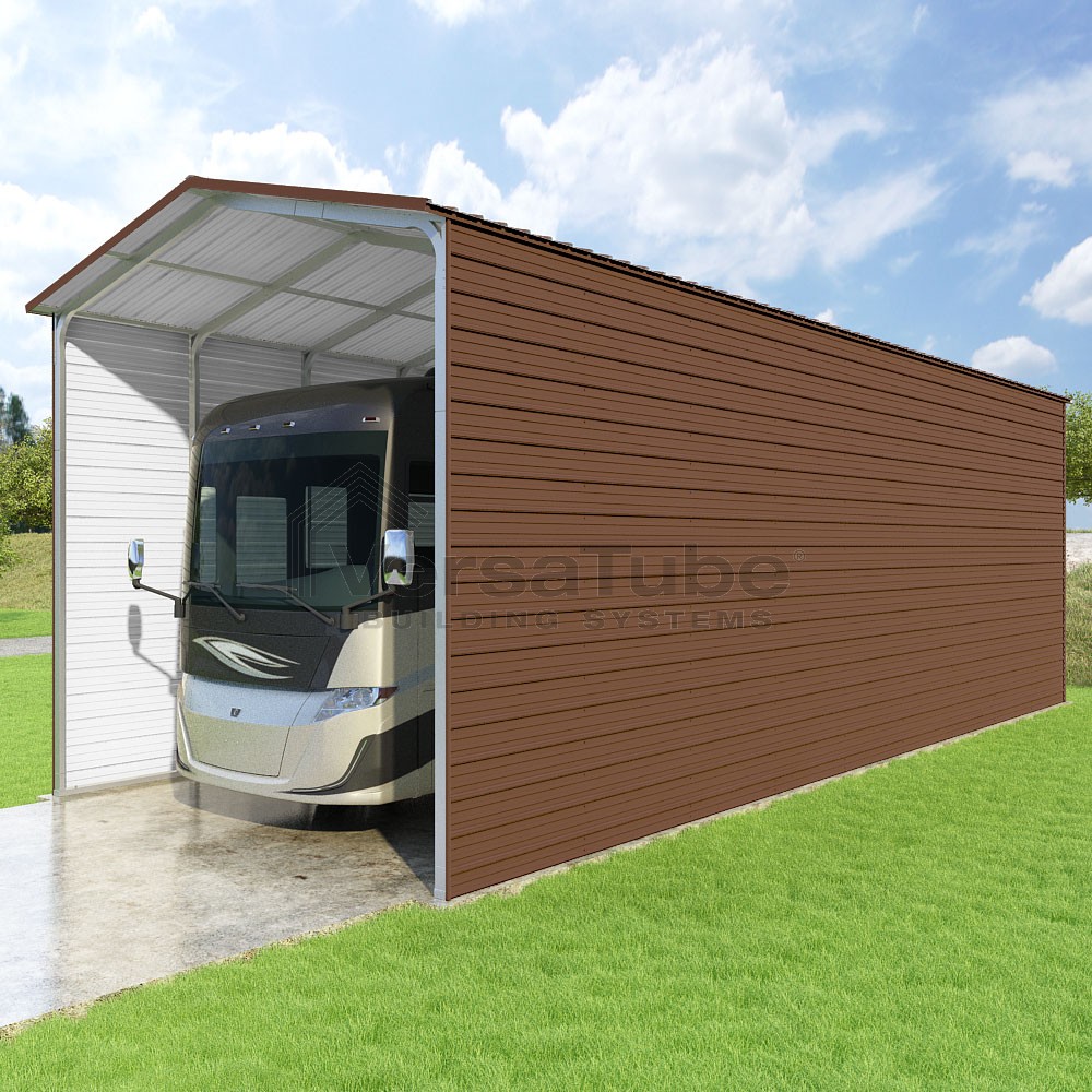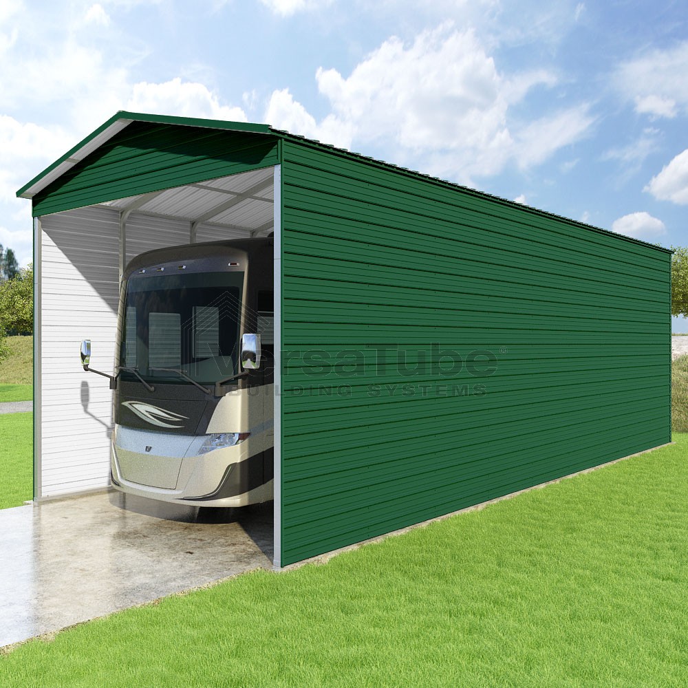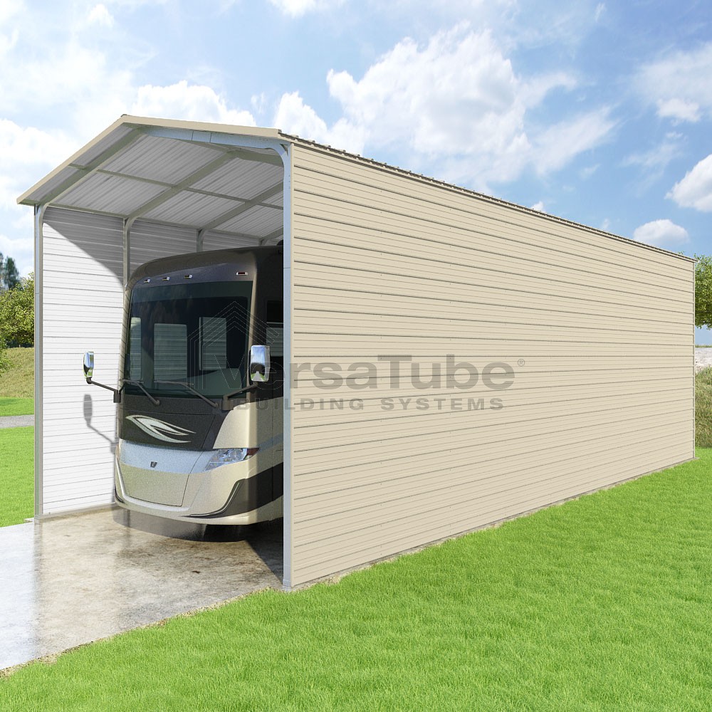 Pinnacle Series DIY carport kit features vertical sheet metal roof panels with ridge cap, gable and eave trim for an A-frame roof style and extended coverage on both ends.