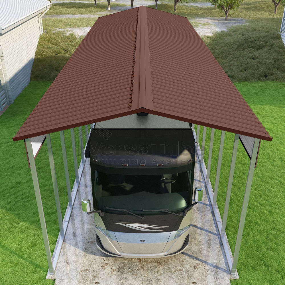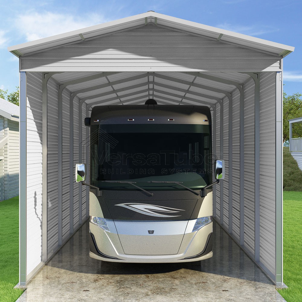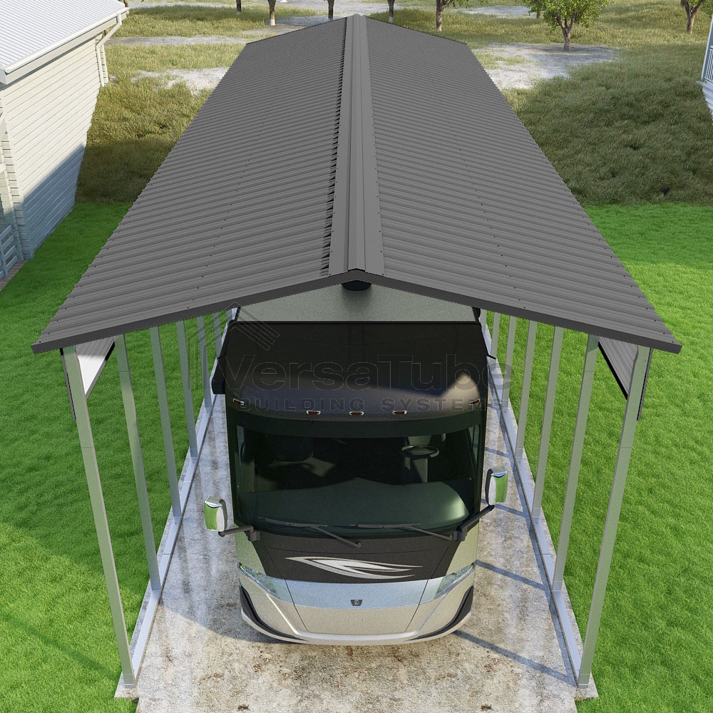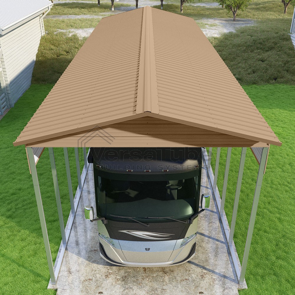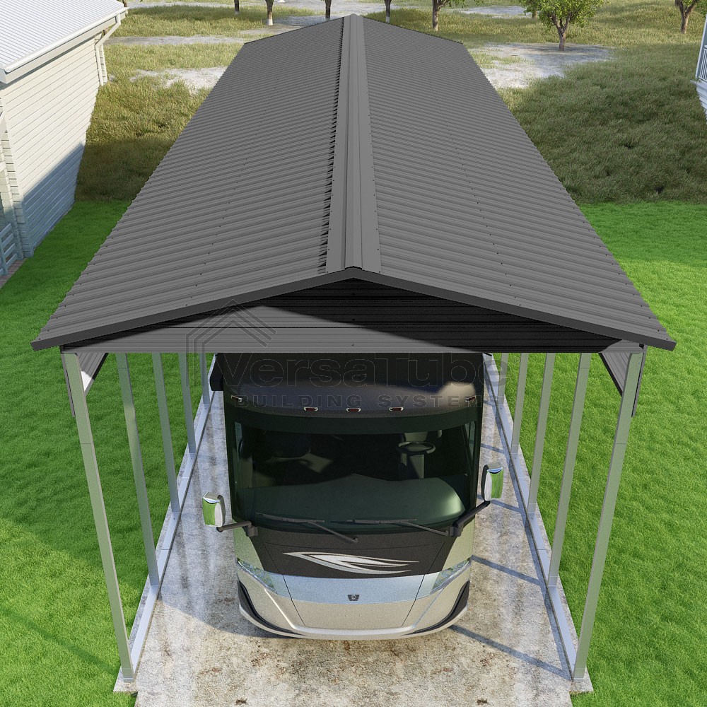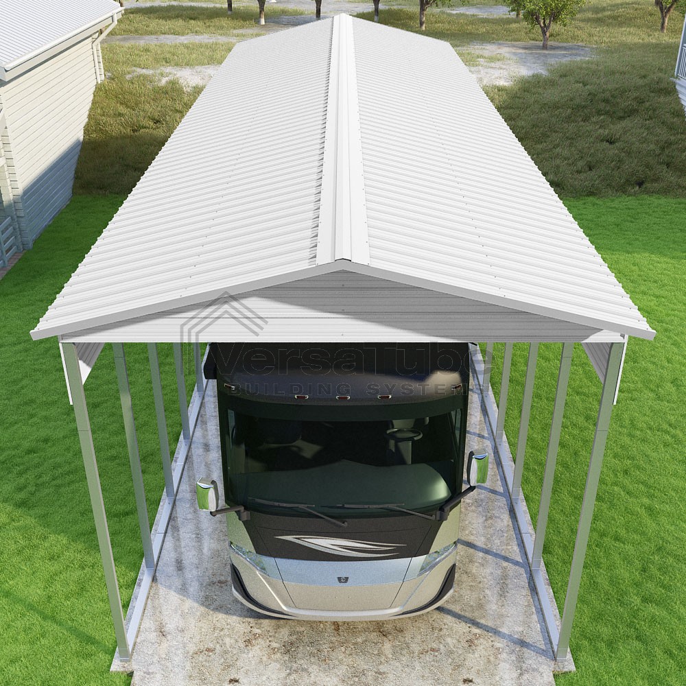 Pinnacle Series DIY carport kit features vertical sheet metal roof panels with ridge cap, gable and eave trim for an A-frame roof style and extended coverage on both ends.