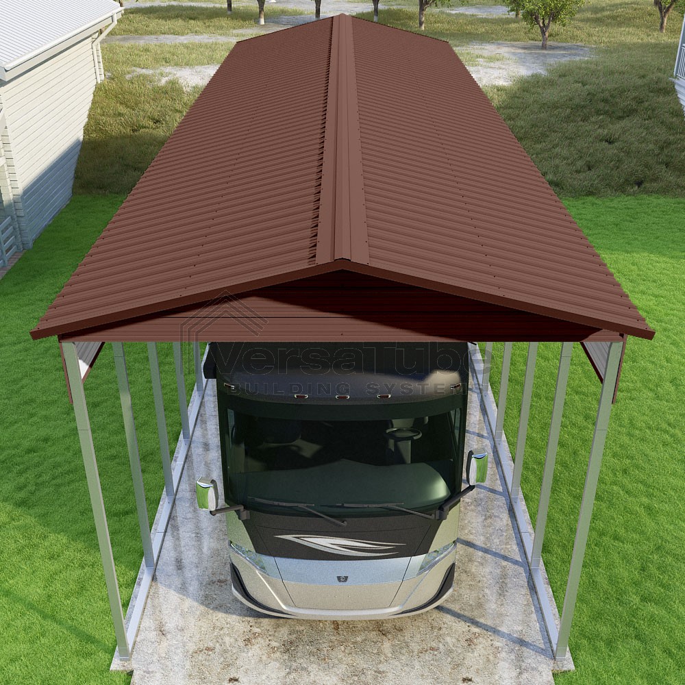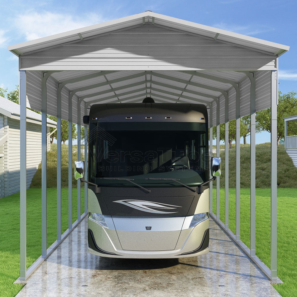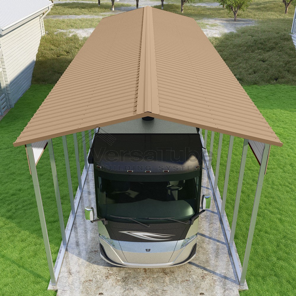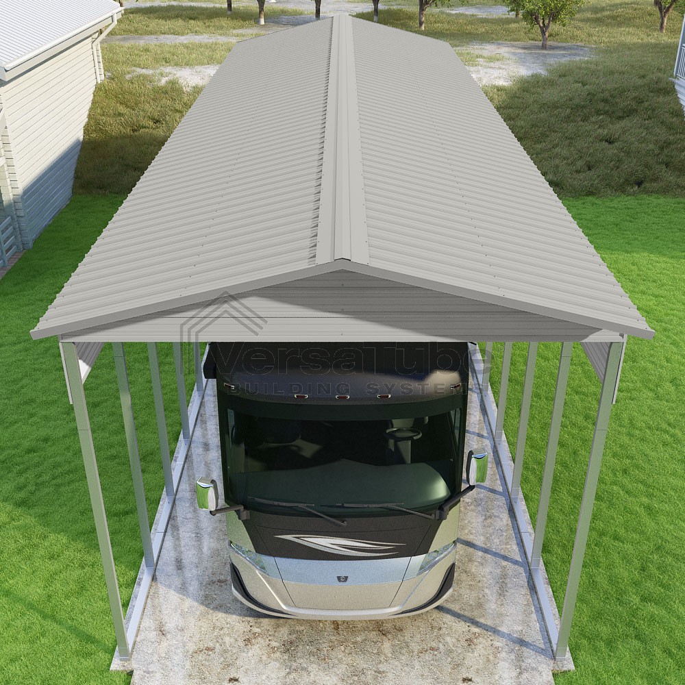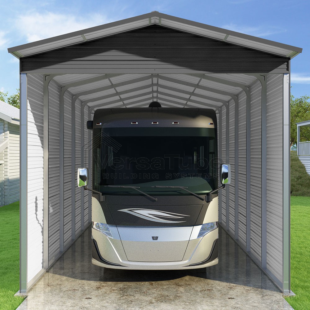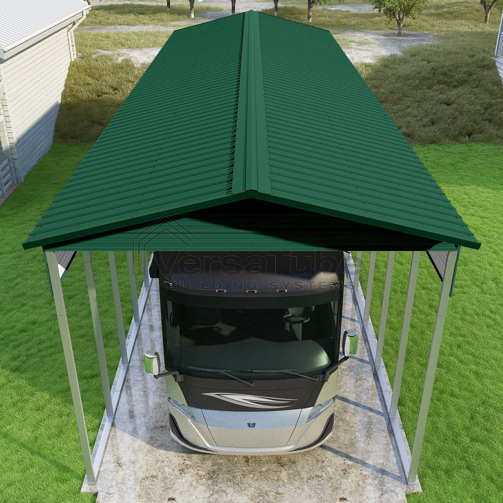 Pinnacle Series DIY carport kit features vertical sheet metal roof panels with ridge cap, gable and eave trim for an A-frame roof style and extended coverage on both ends.