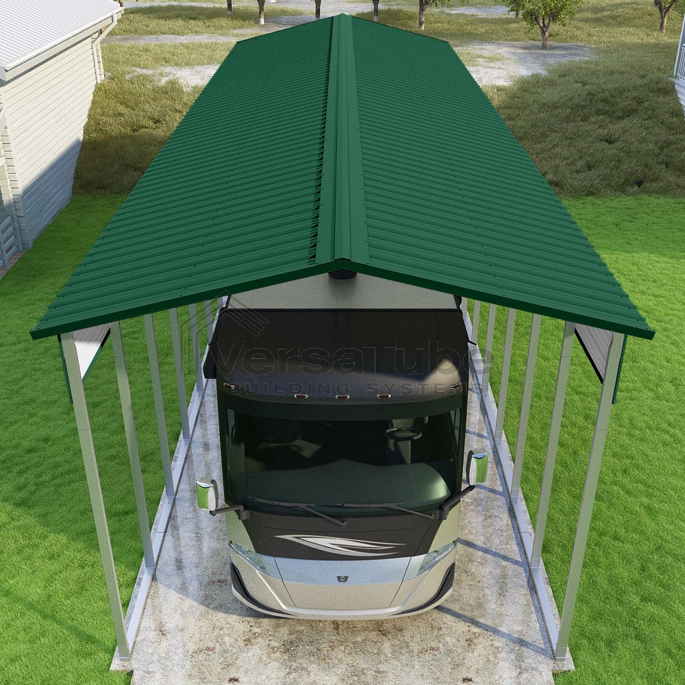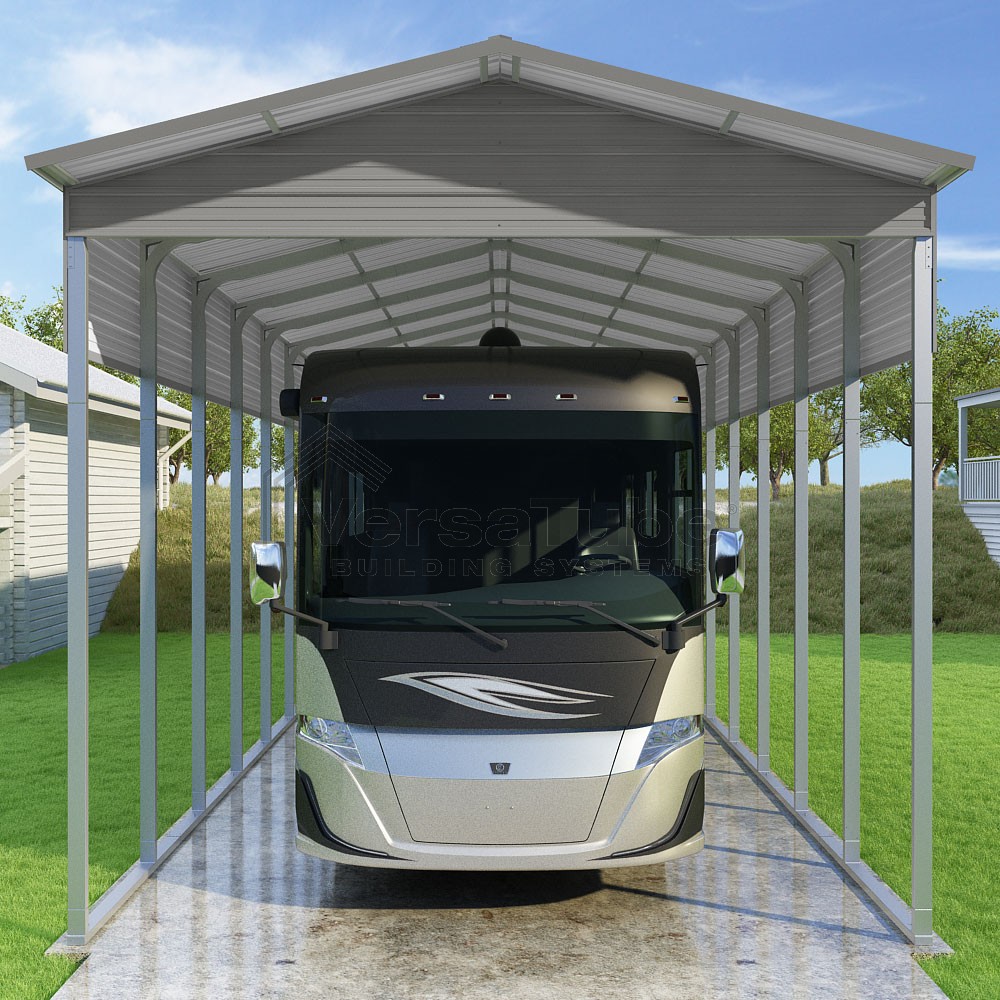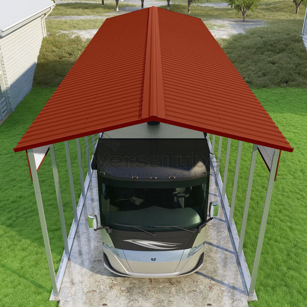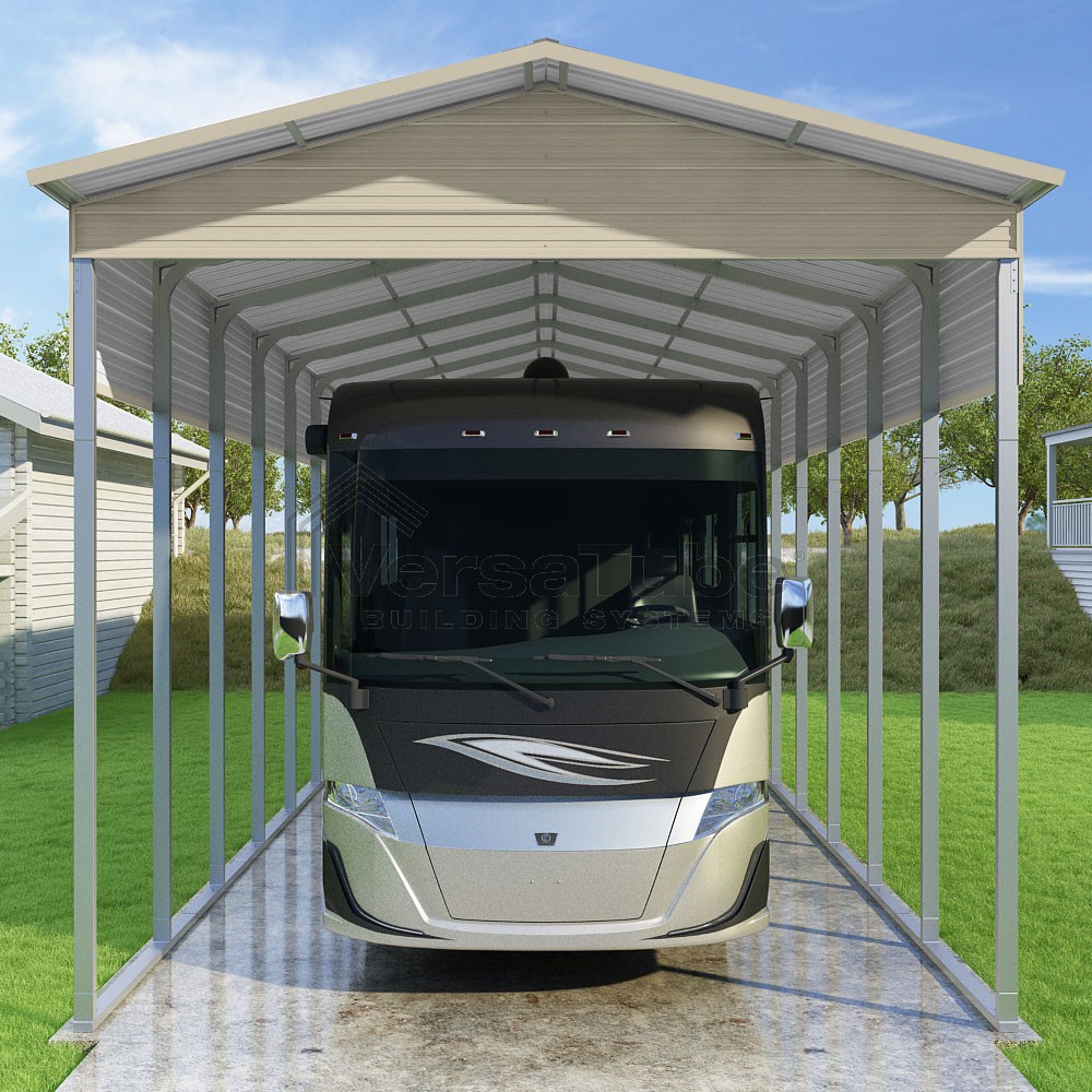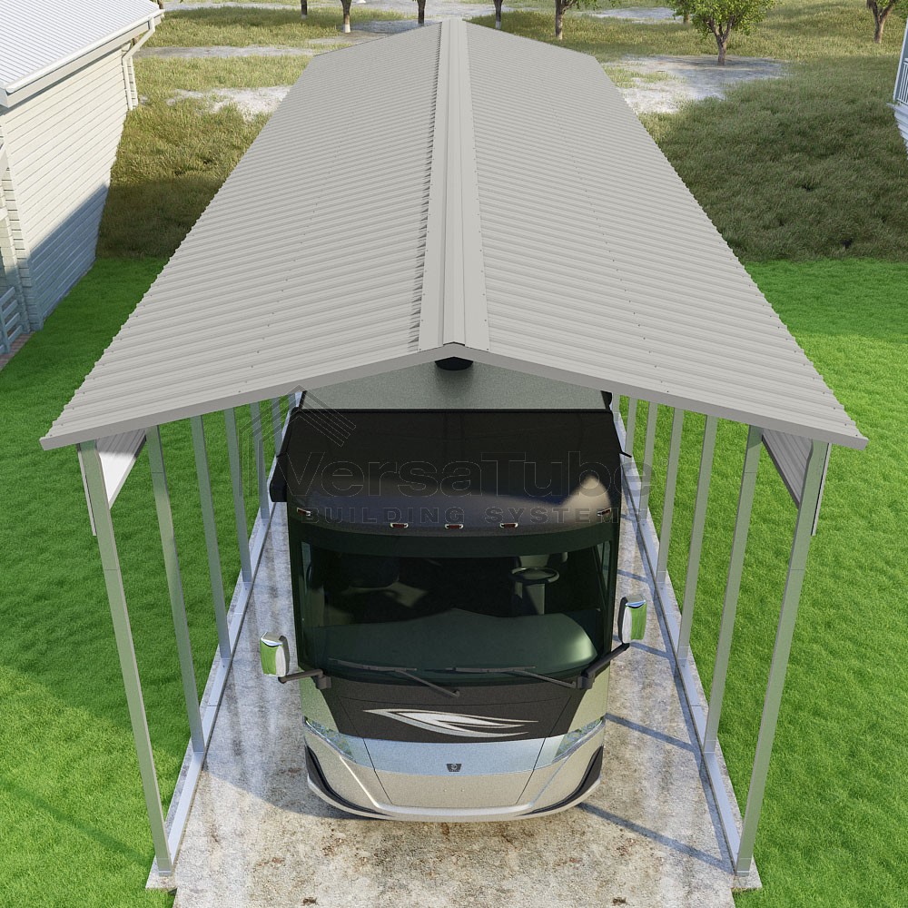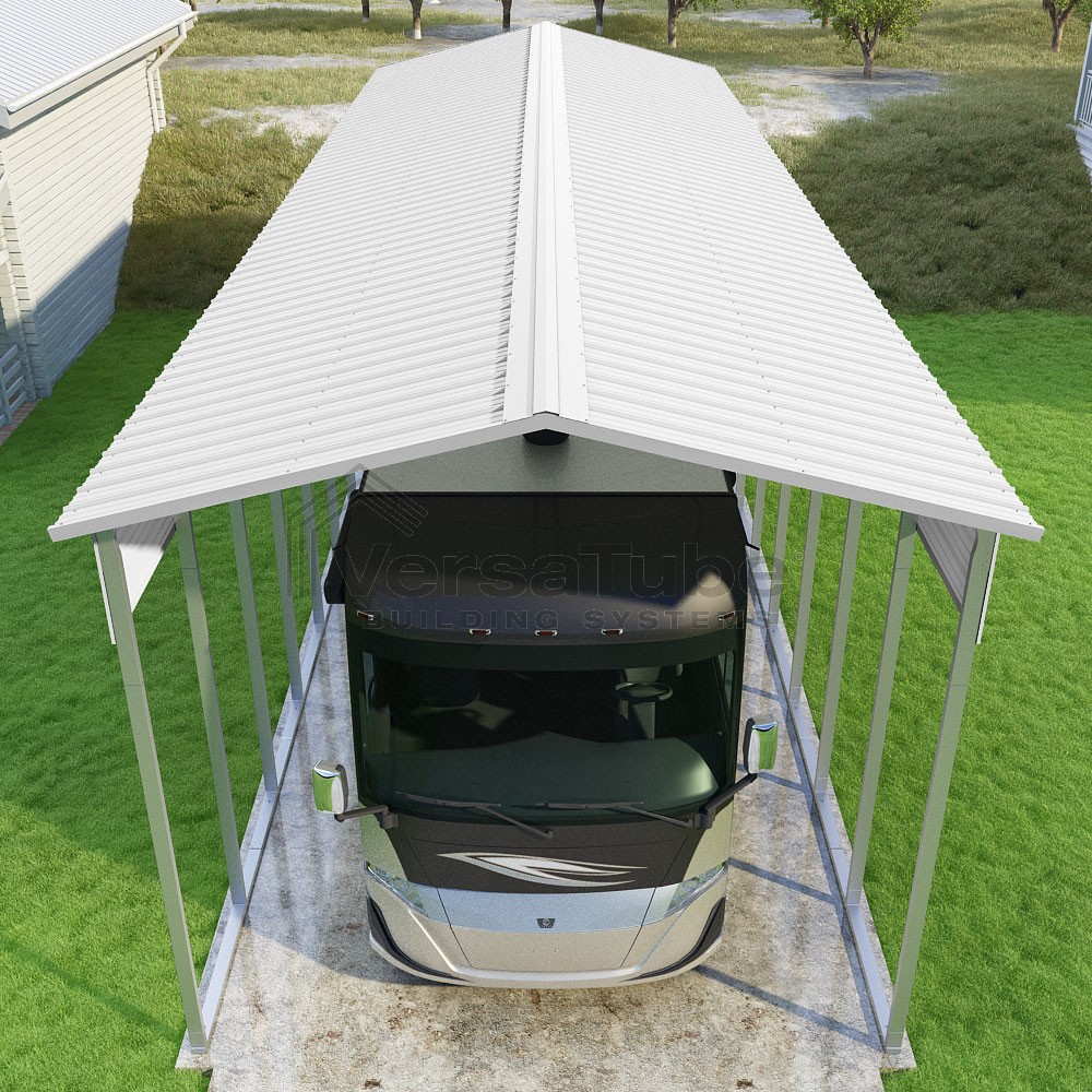 Pinnacle Series DIY carport kit features vertical sheet metal roof panels with ridge cap, gable and eave trim for an A-frame roof style and extended coverage on both ends.