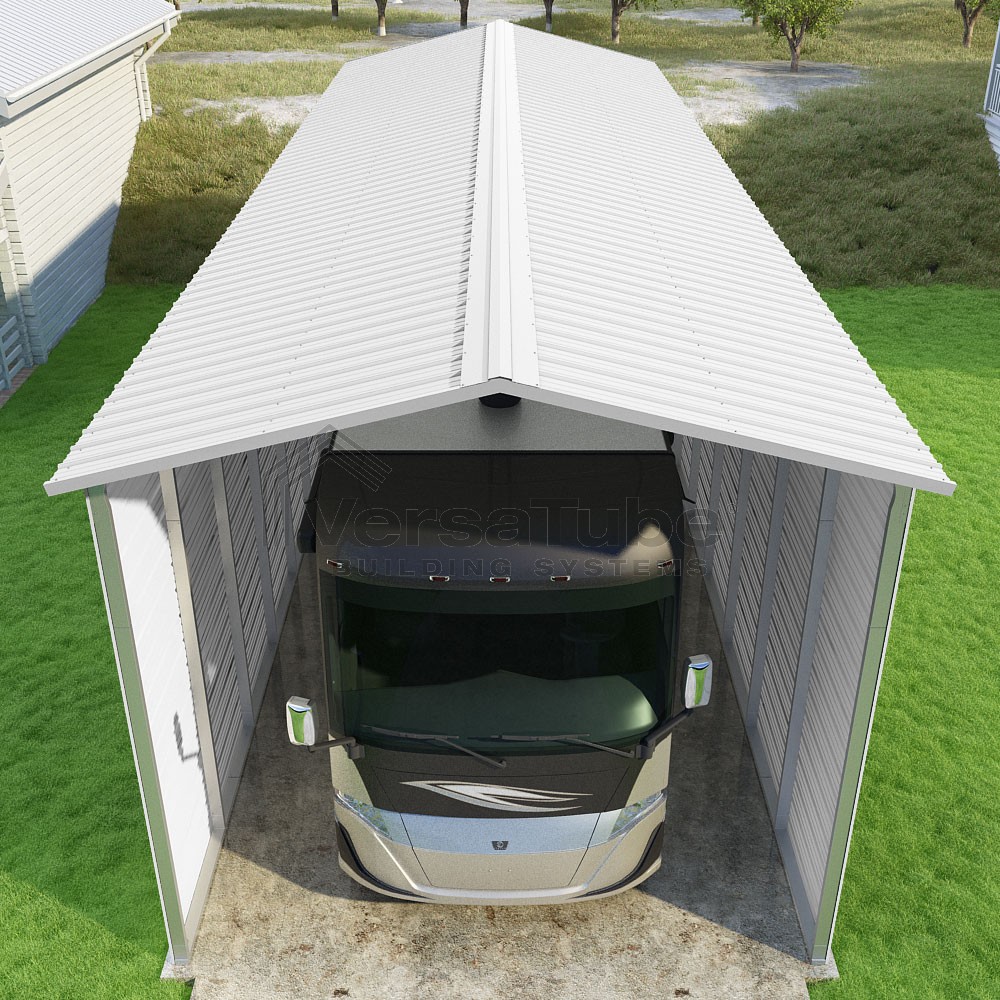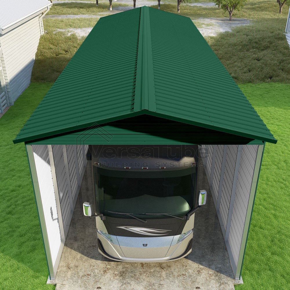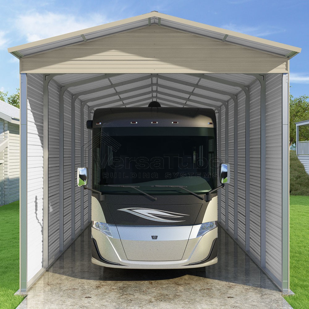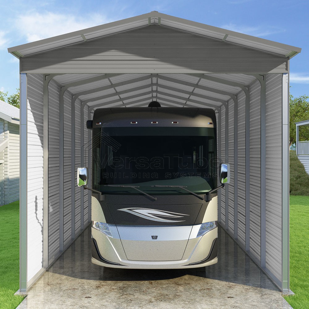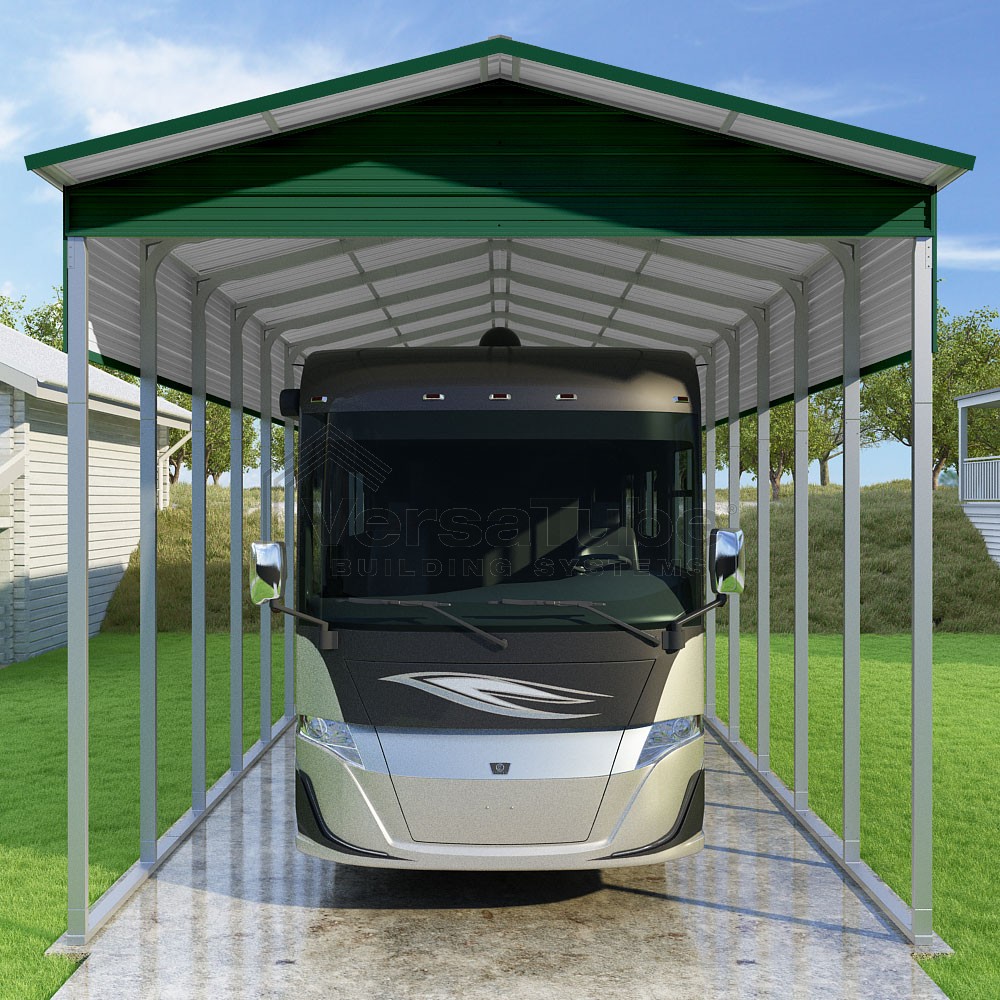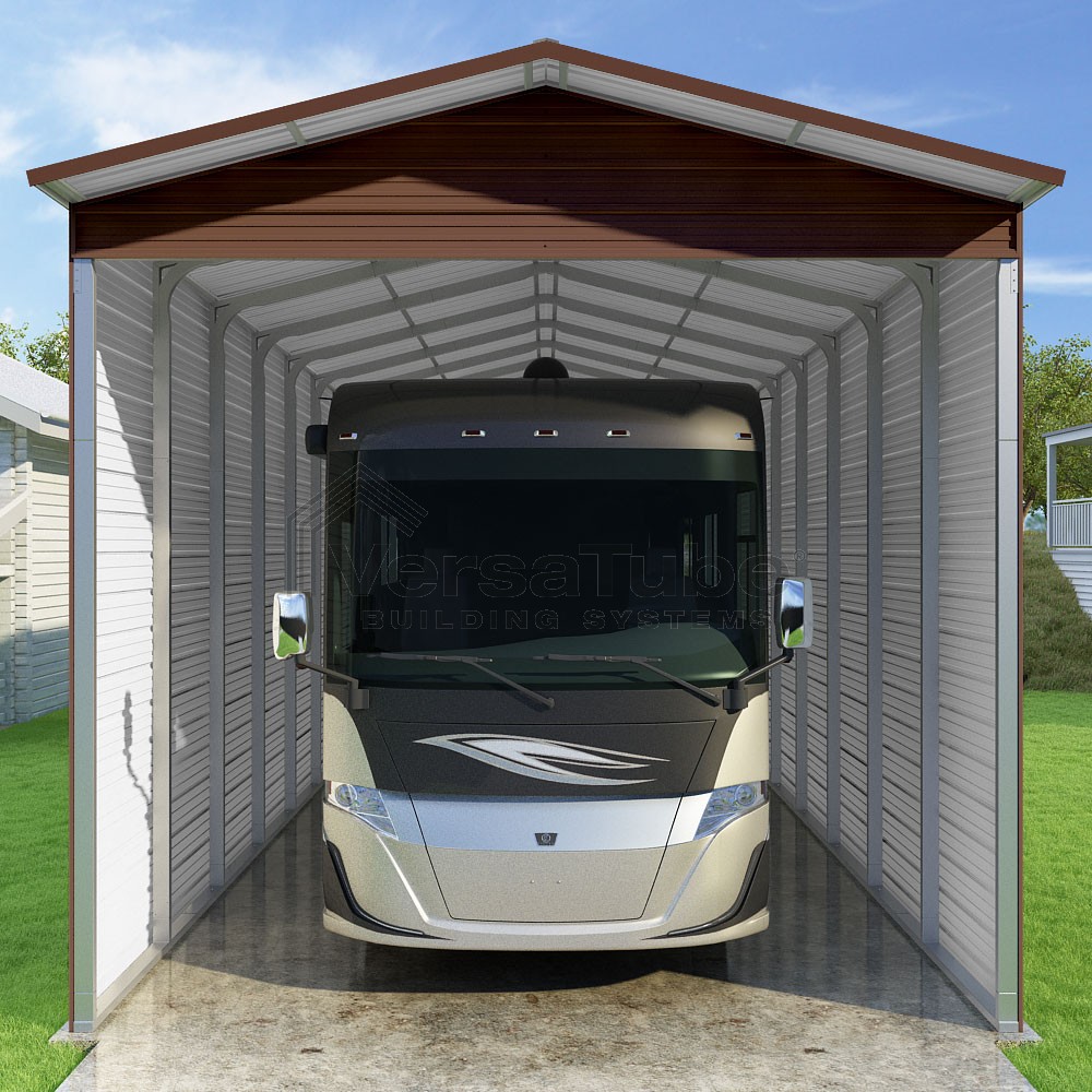 Pinnacle Series DIY carport kit features vertical sheet metal roof panels with ridge cap, gable and eave trim for an A-frame roof style and extended coverage on both ends.