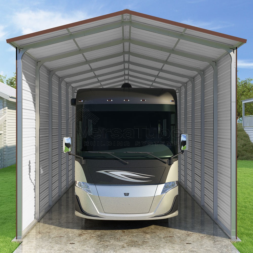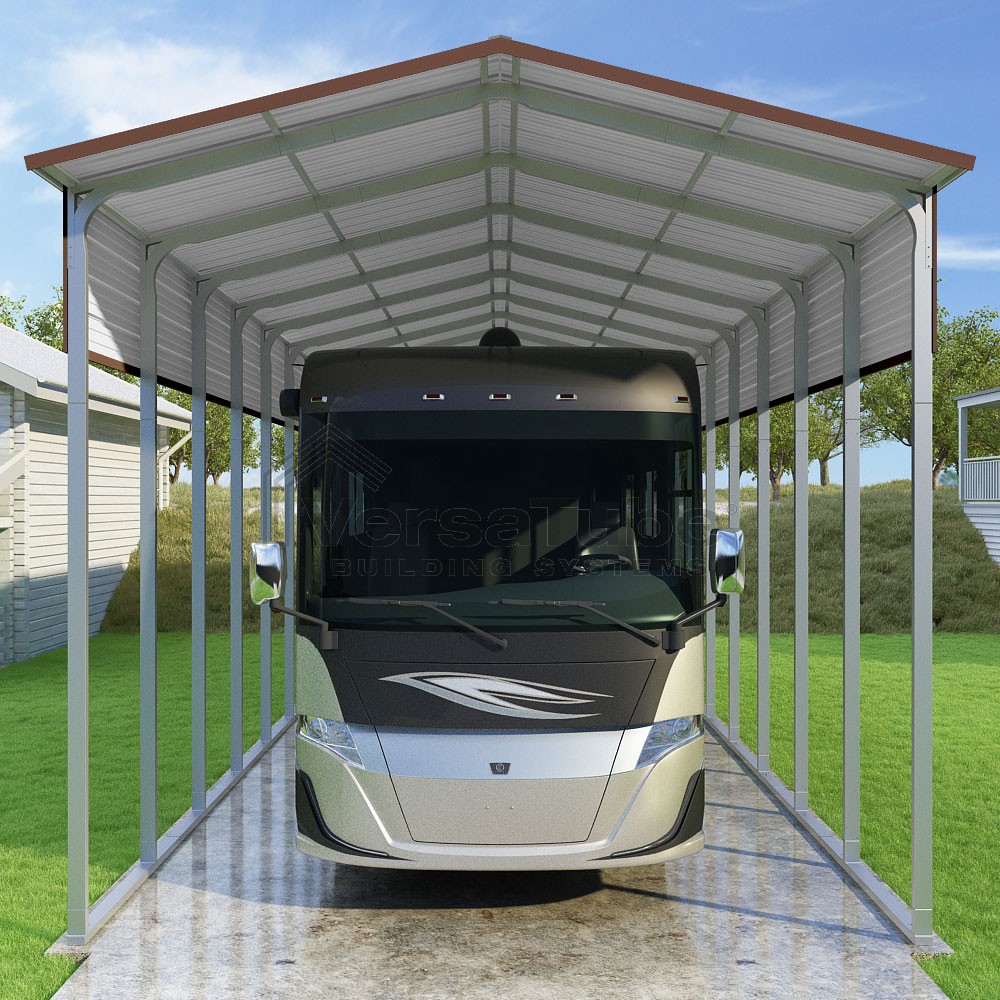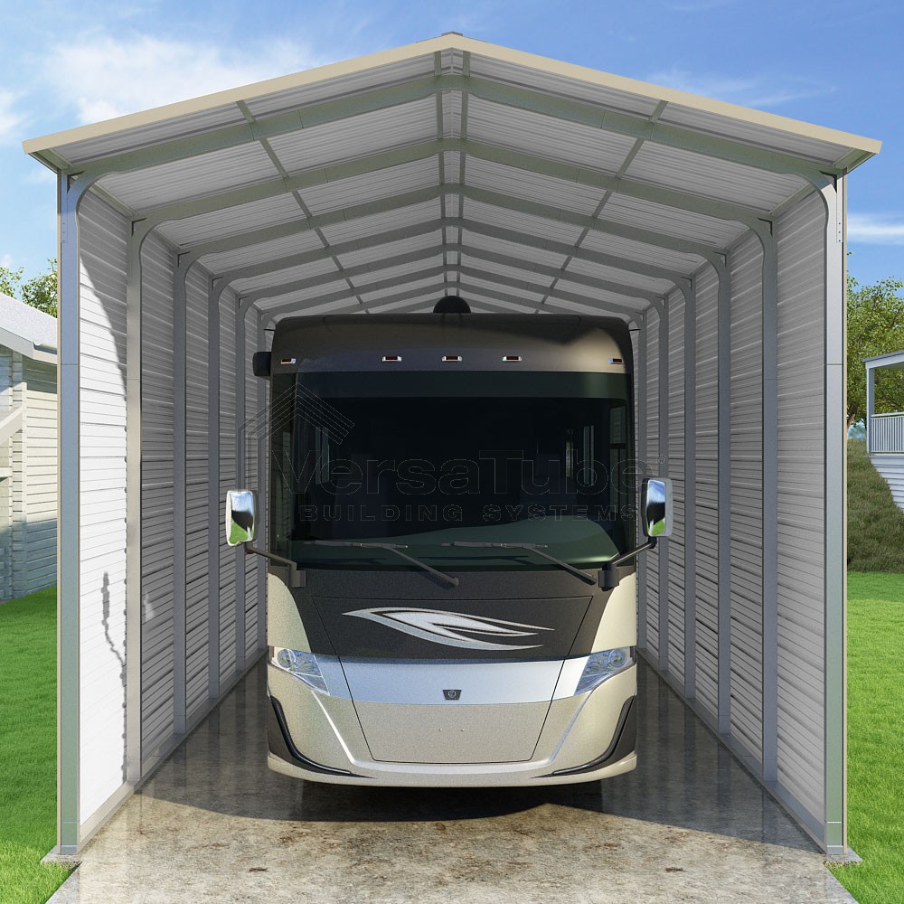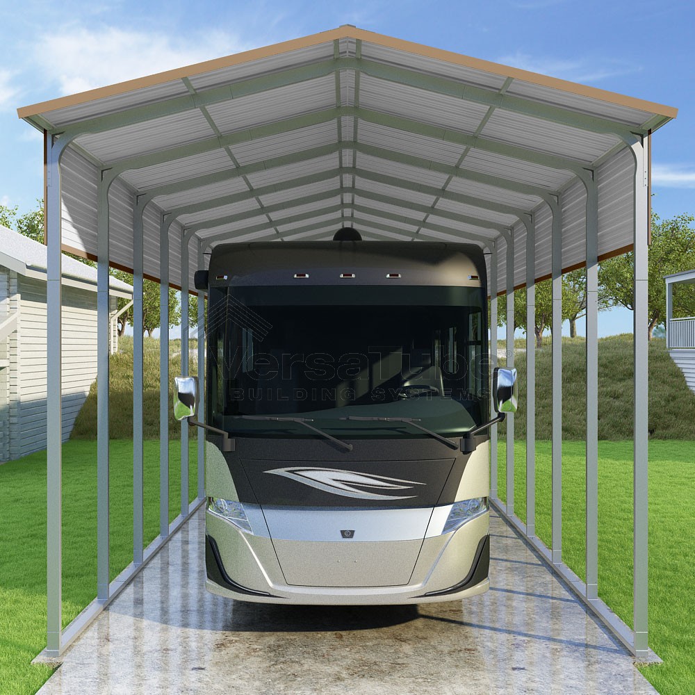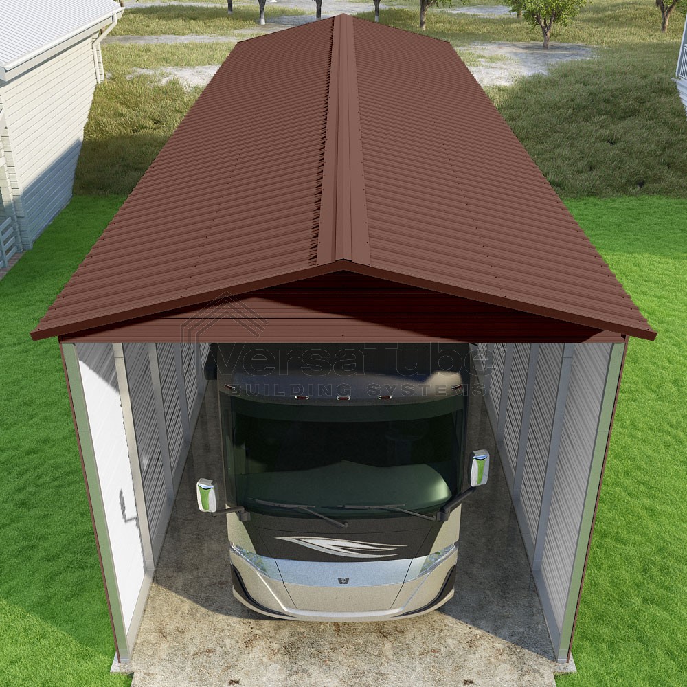 Pinnacle Series DIY carport kit features vertical sheet metal roof panels with ridge cap, gable and eave trim for an A-frame roof style and extended coverage on both ends.