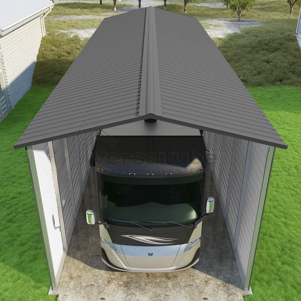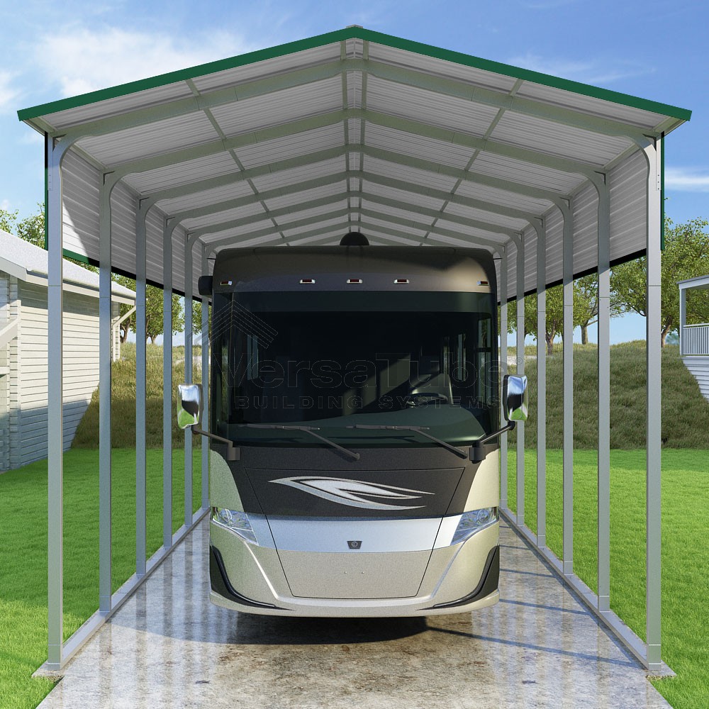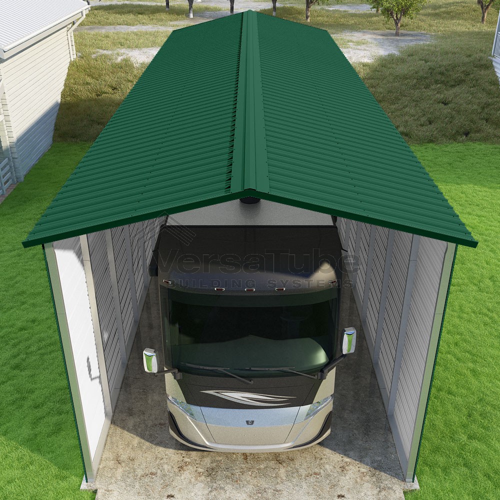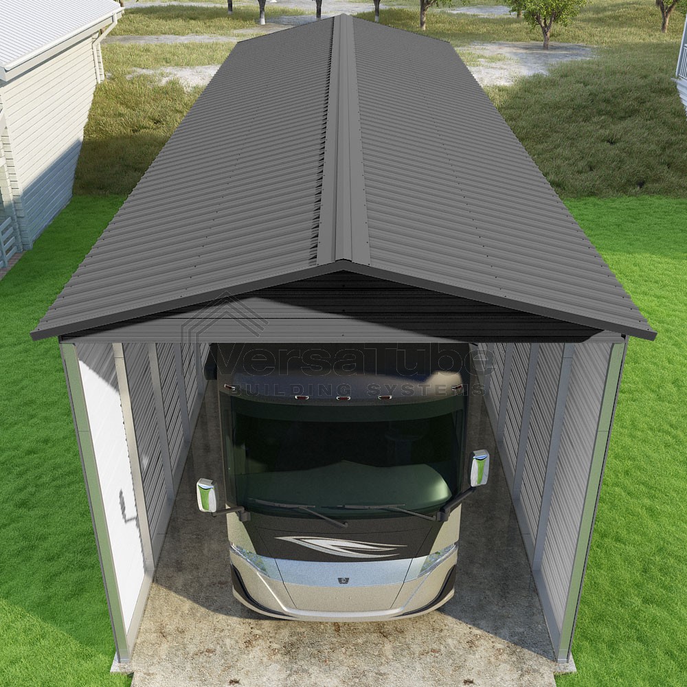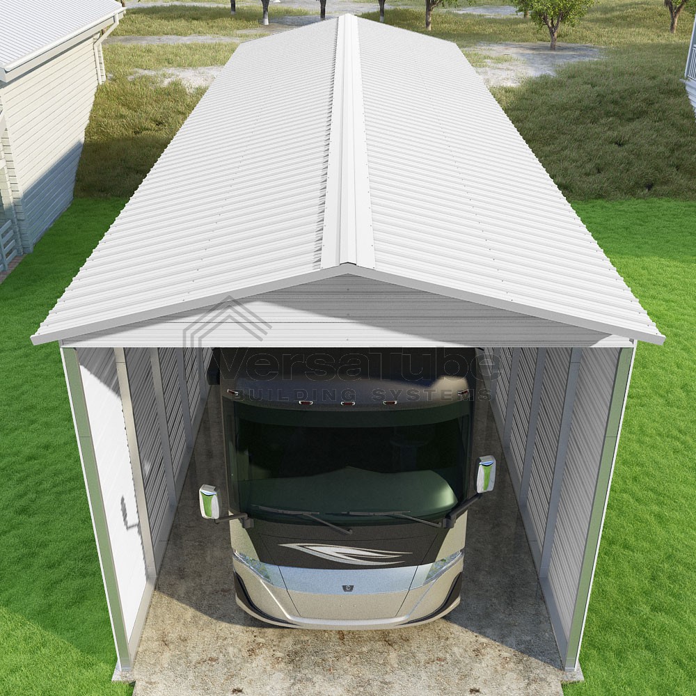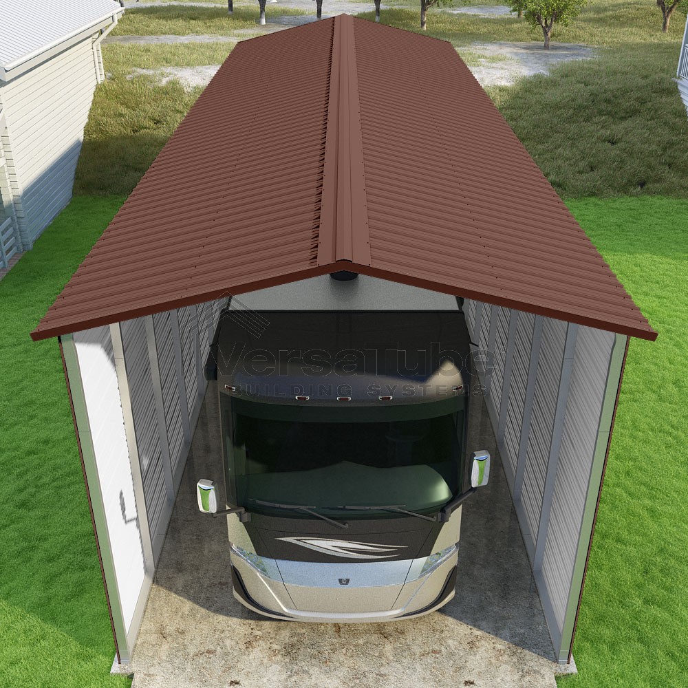 Pinnacle Series DIY carport kit features vertical sheet metal roof panels with ridge cap, gable and eave trim for an A-frame roof style and extended coverage on both ends.