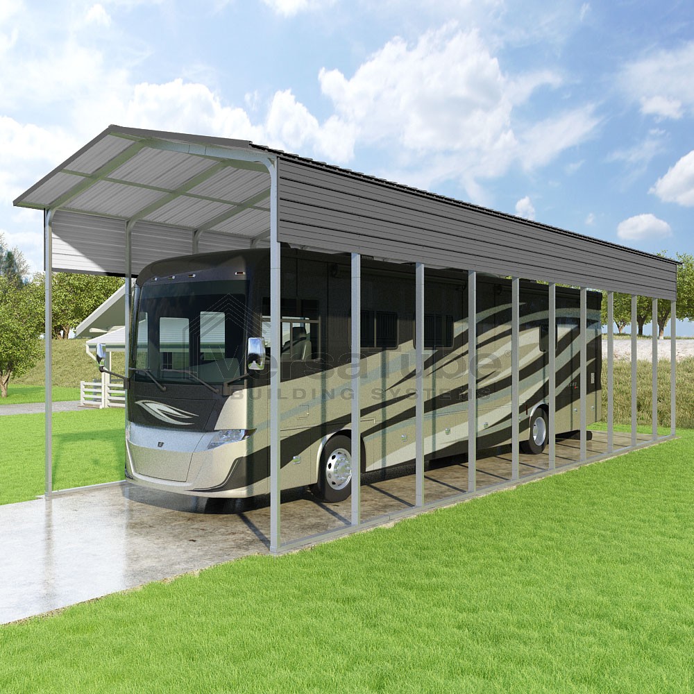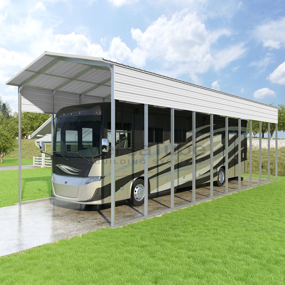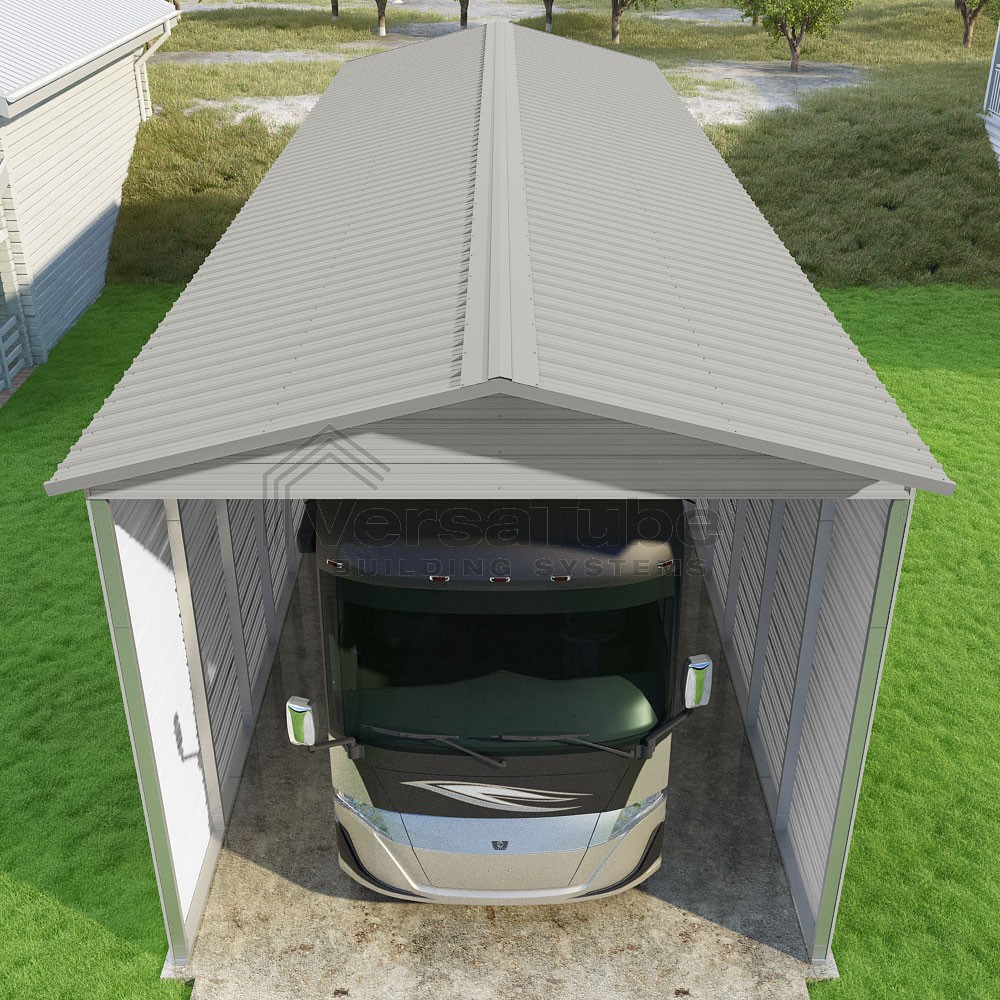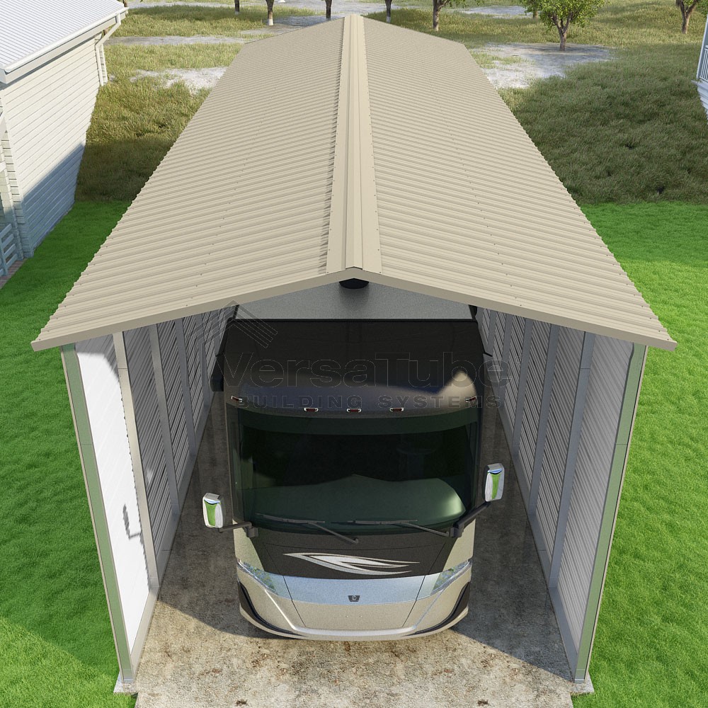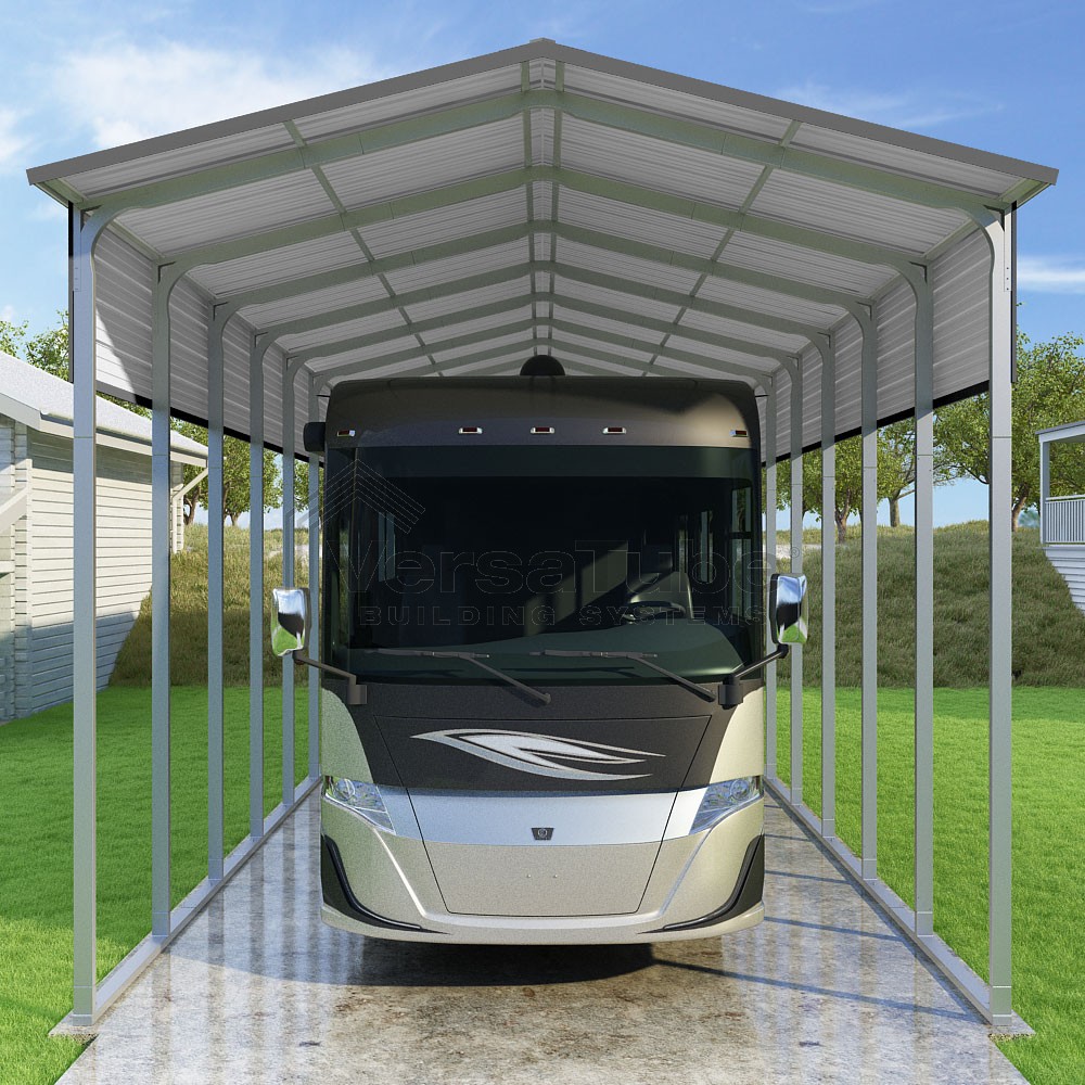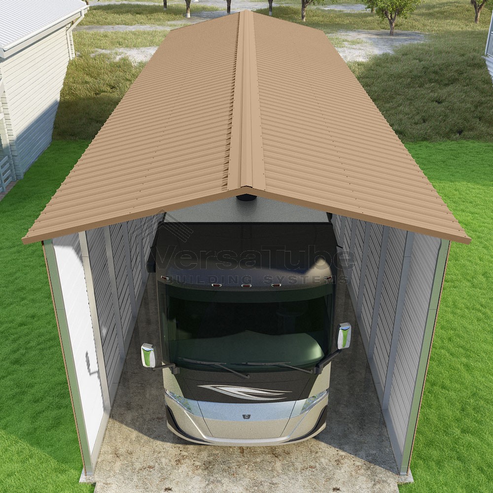 Pinnacle Series DIY carport kit features vertical sheet metal roof panels with ridge cap, gable and eave trim for an A-frame roof style and extended coverage on both ends.