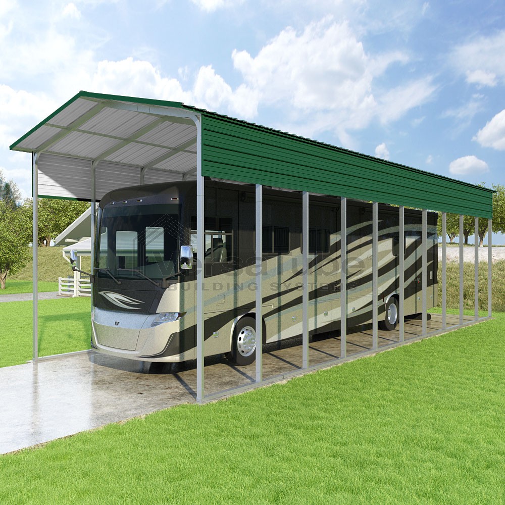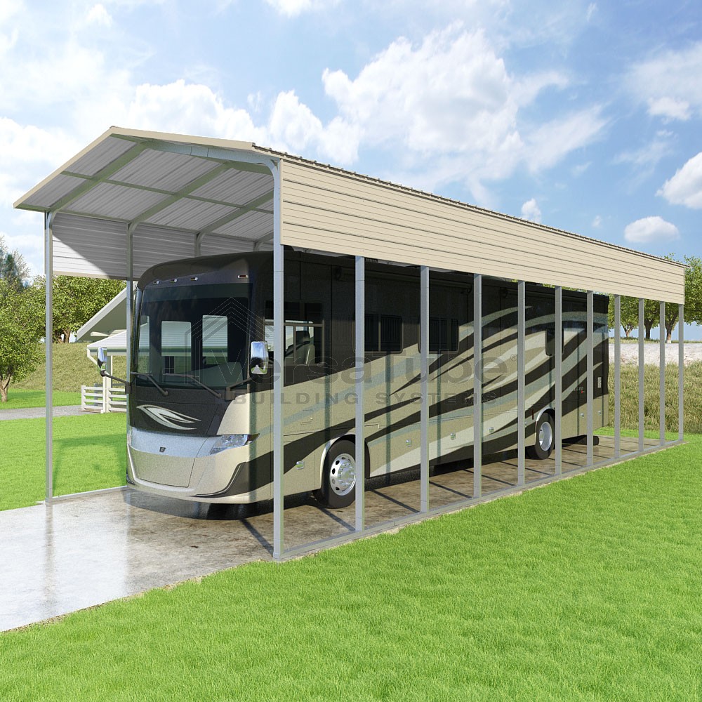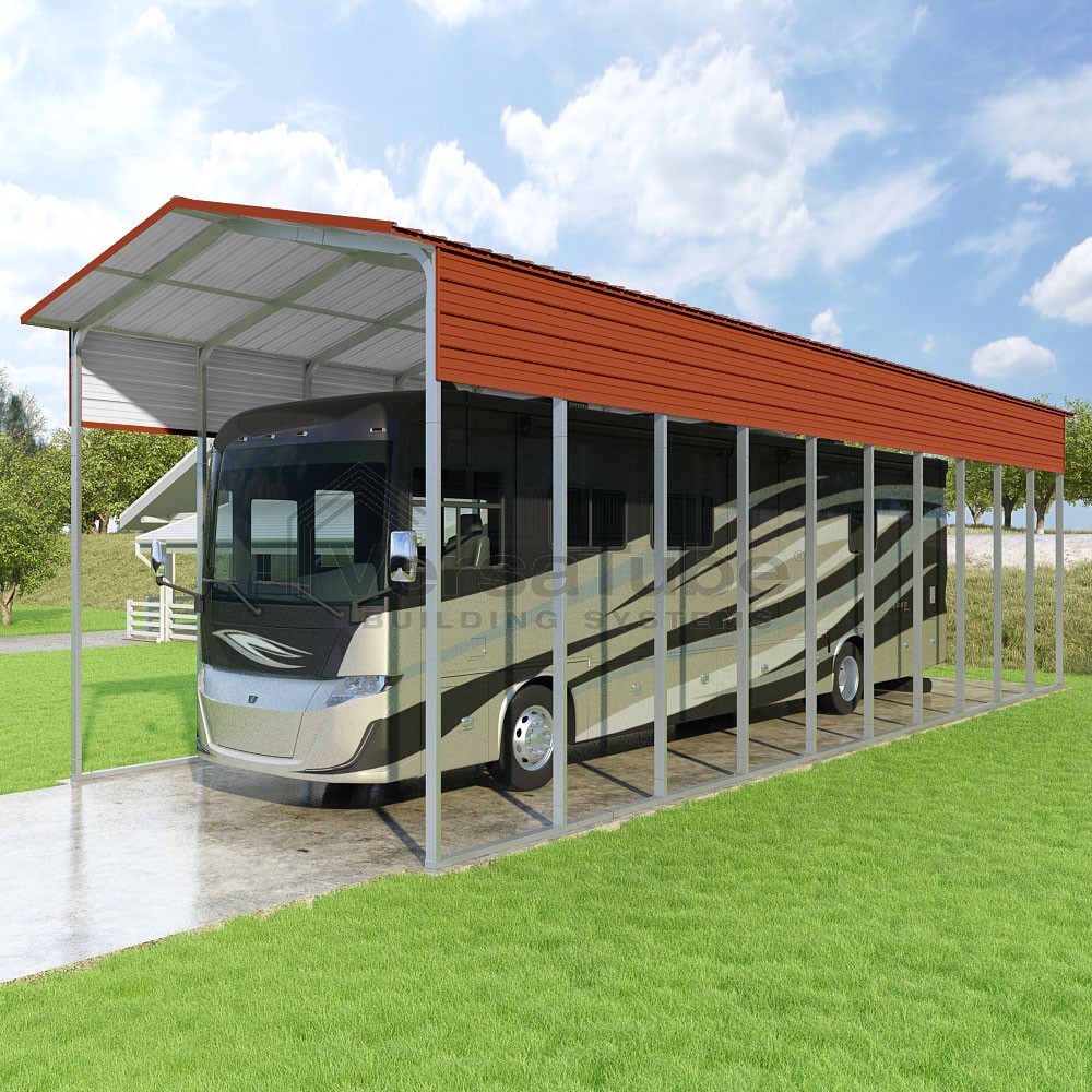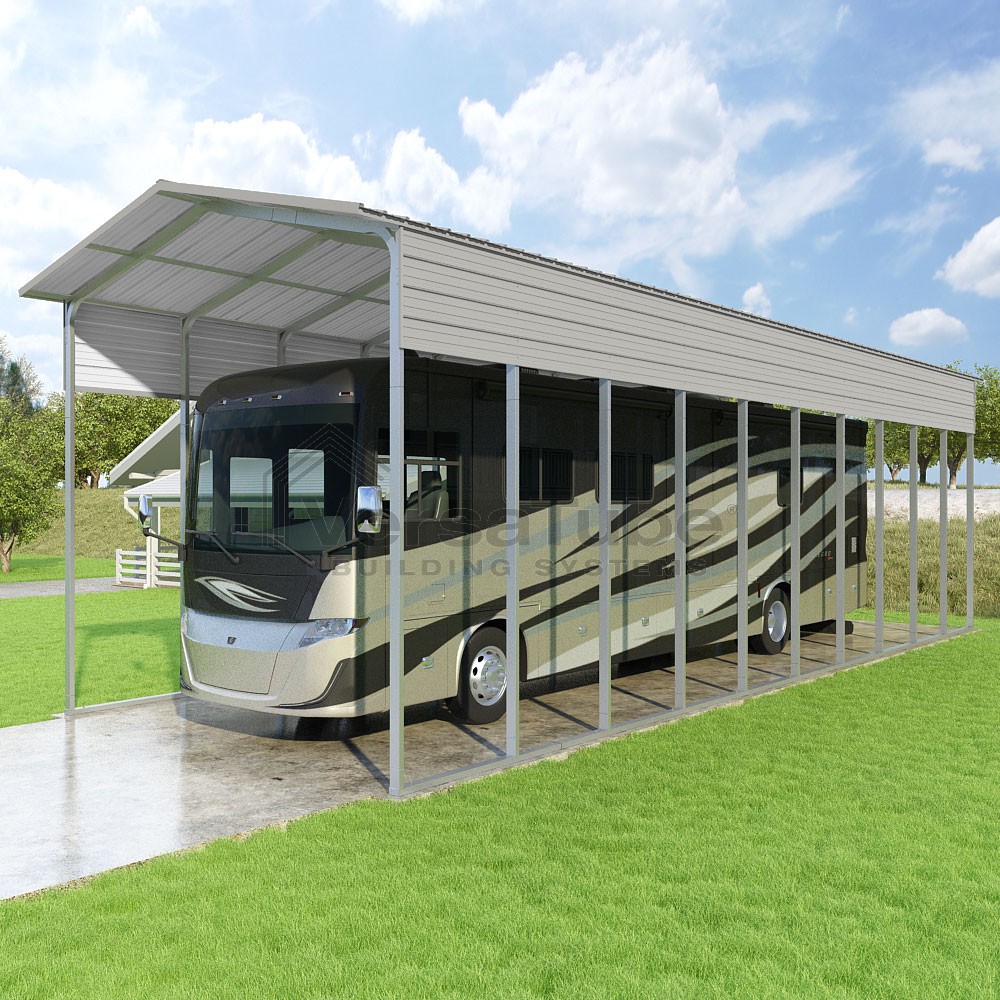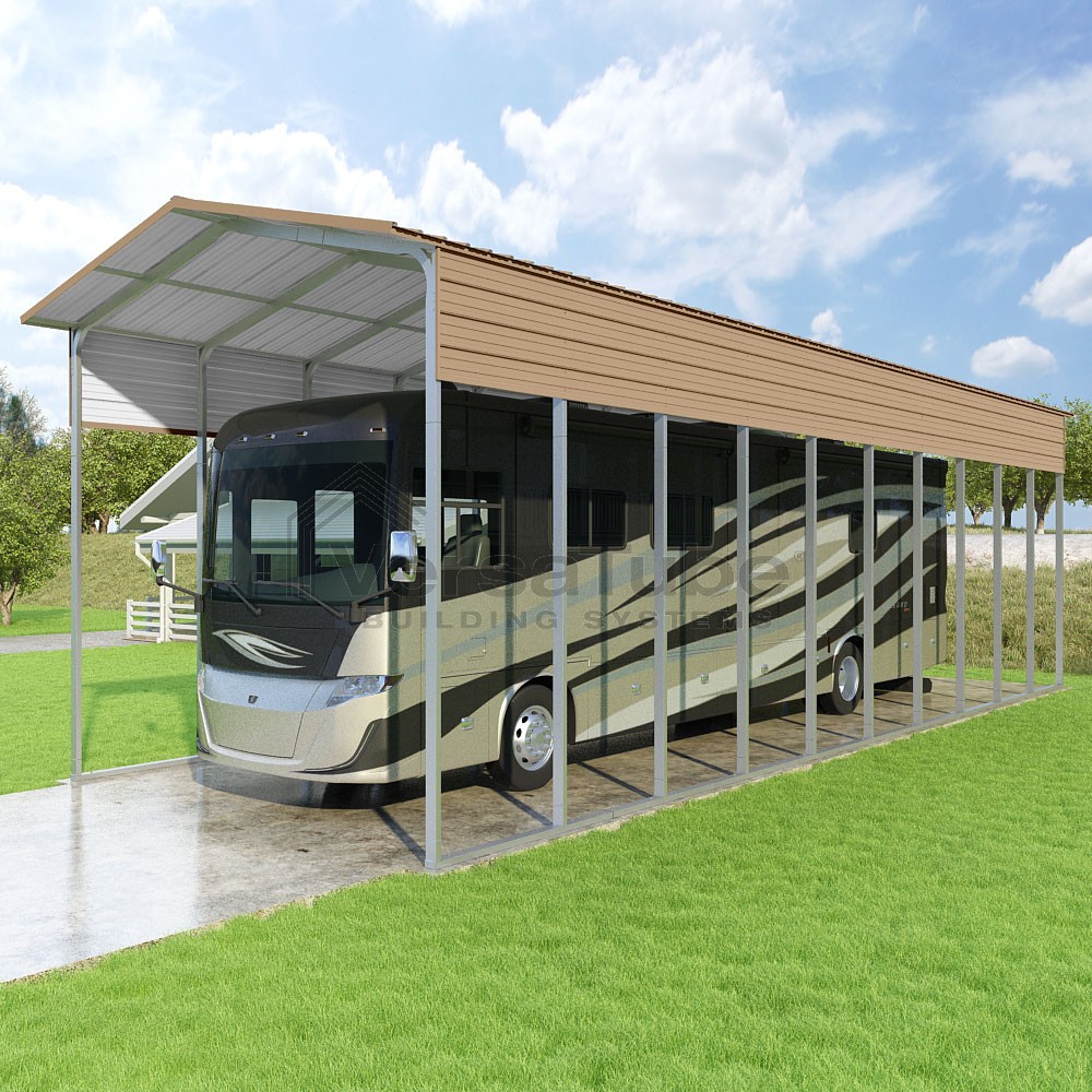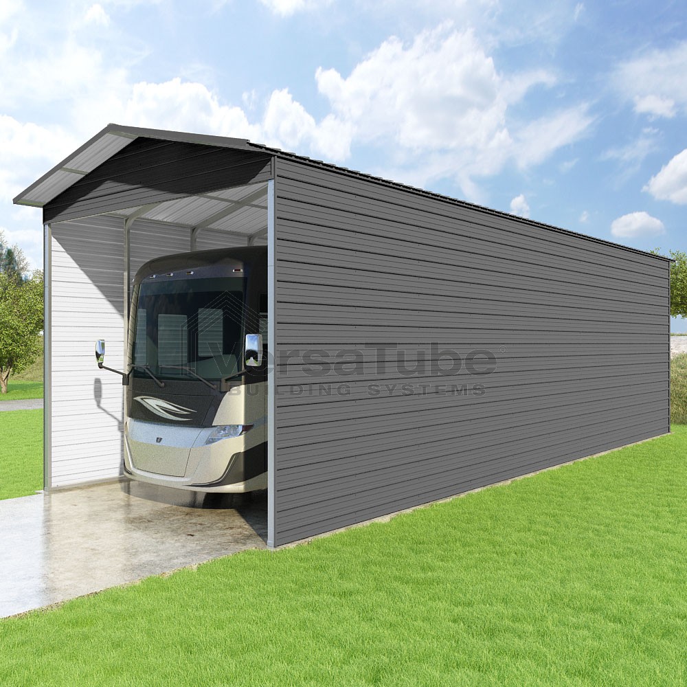 Pinnacle Series DIY carport kit features vertical sheet metal roof panels with ridge cap, gable and eave trim for an A-frame roof style and extended coverage on both ends.