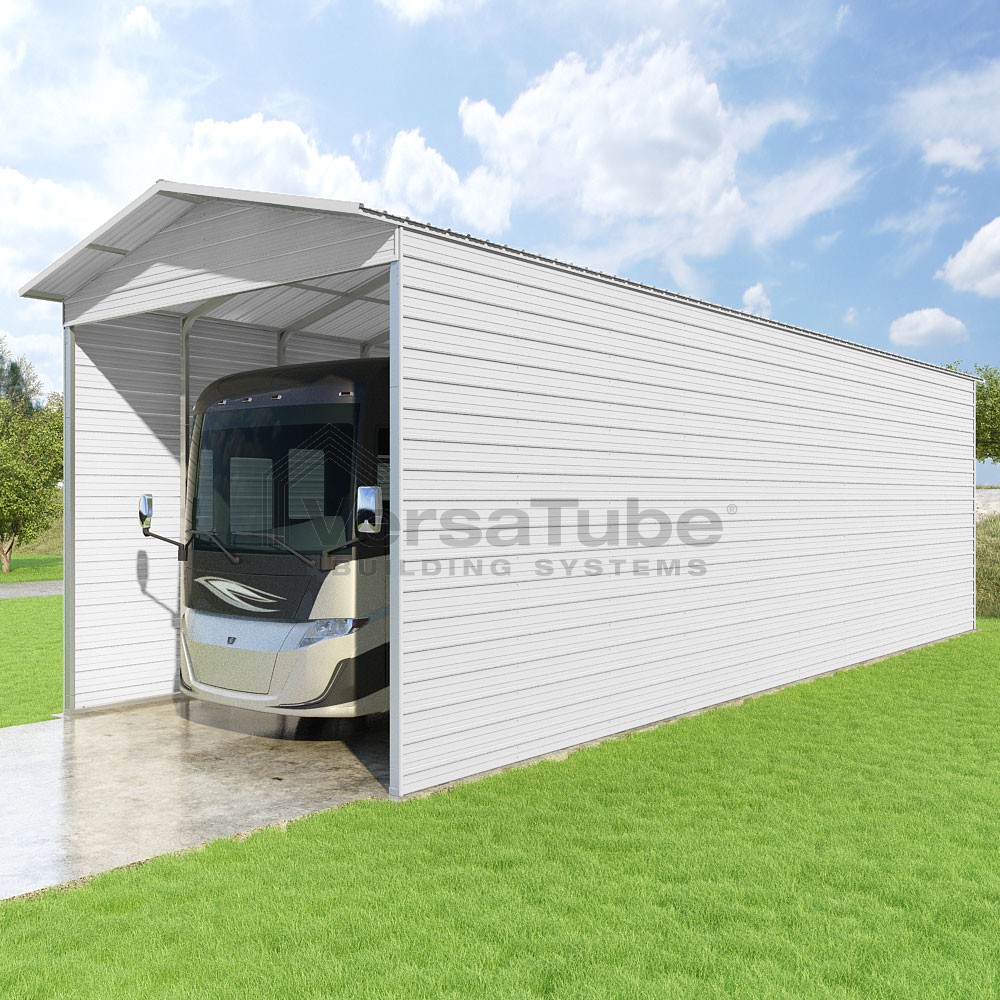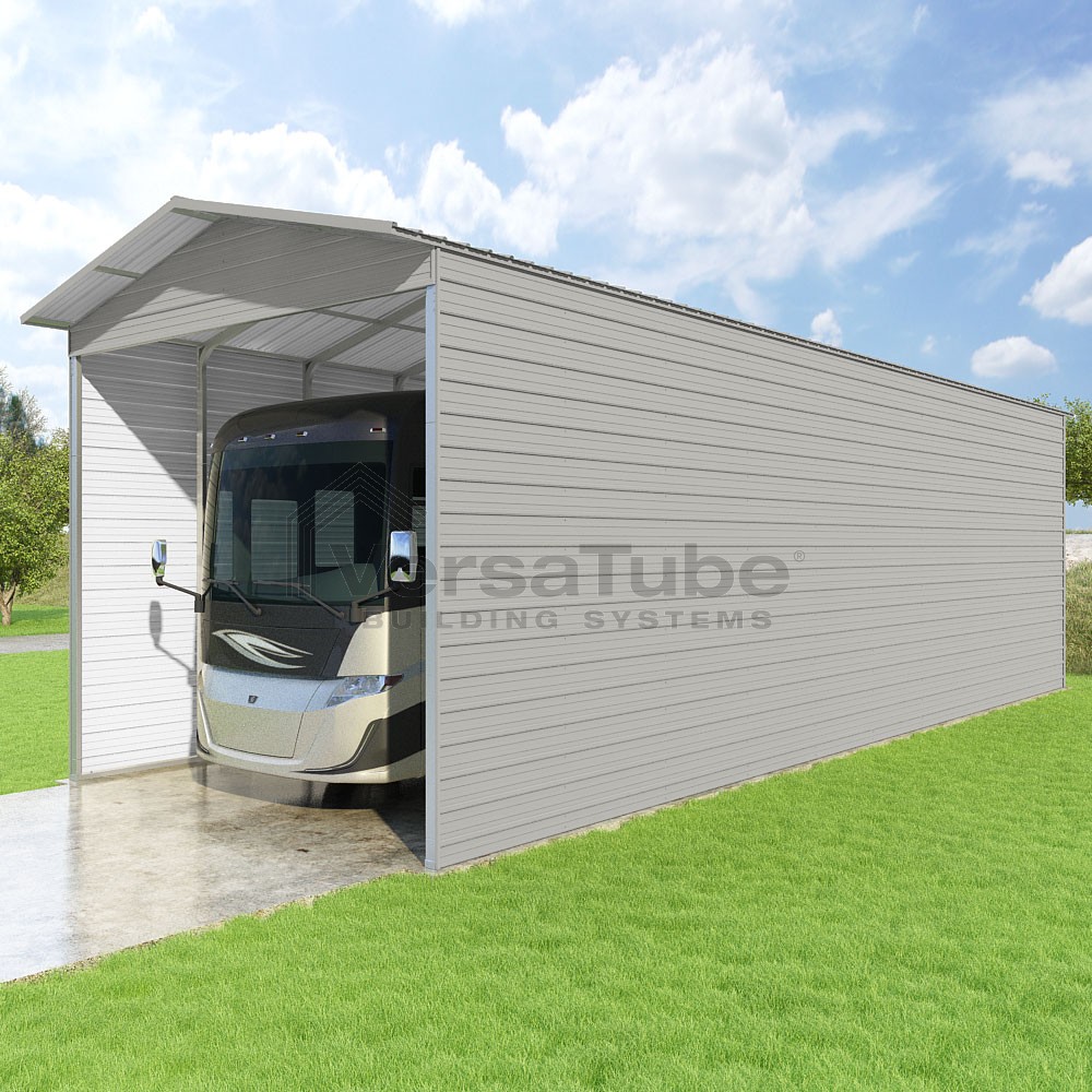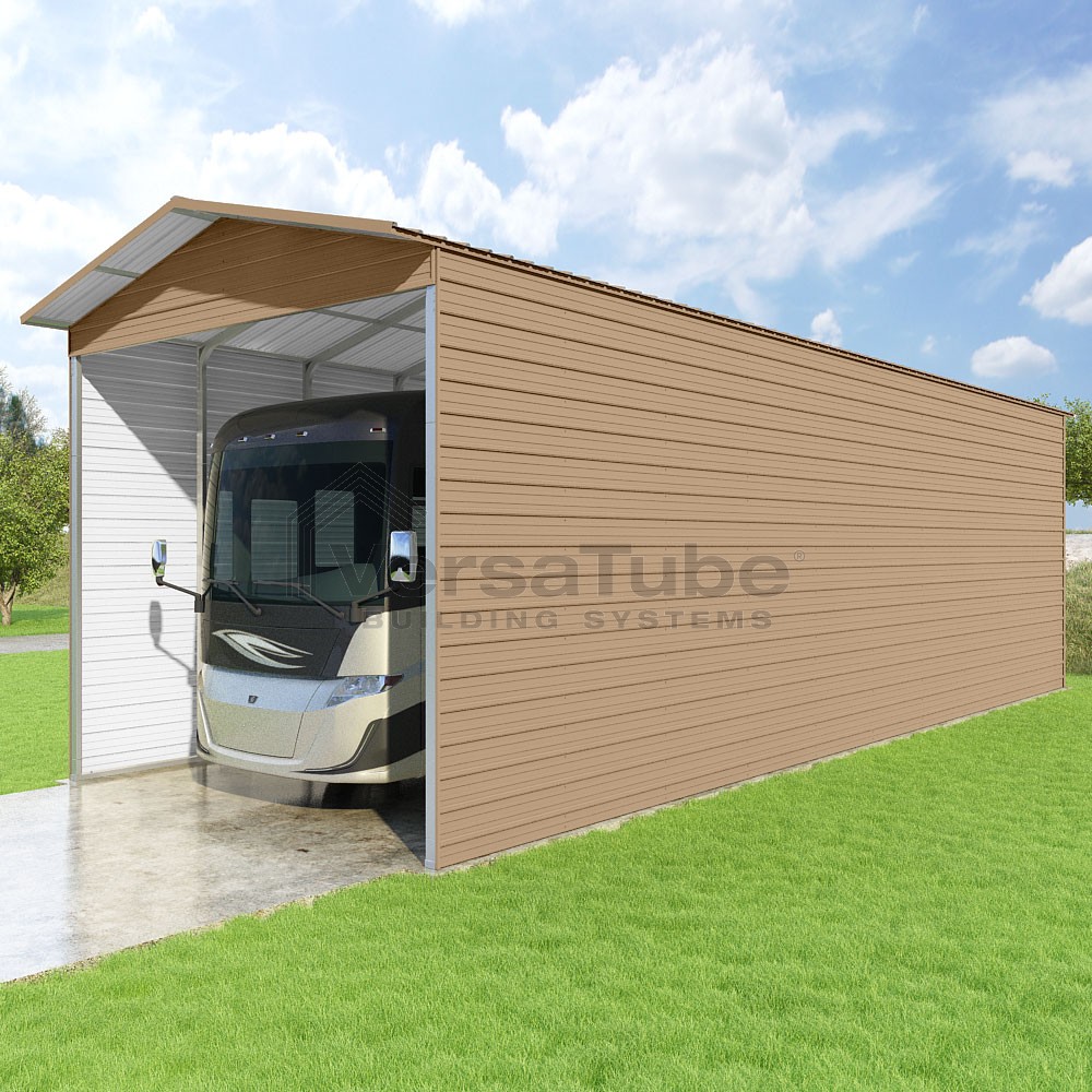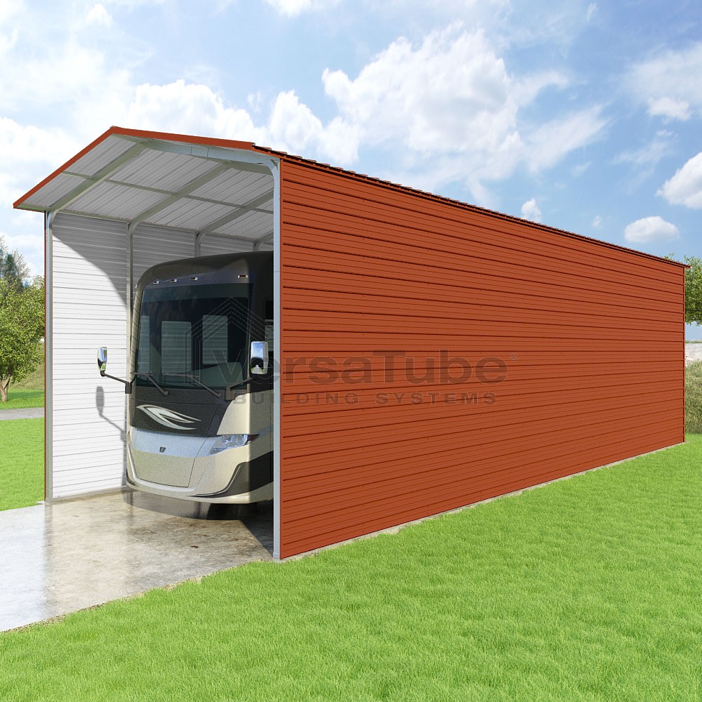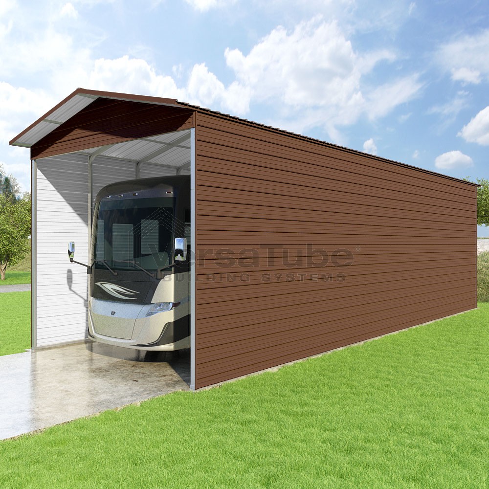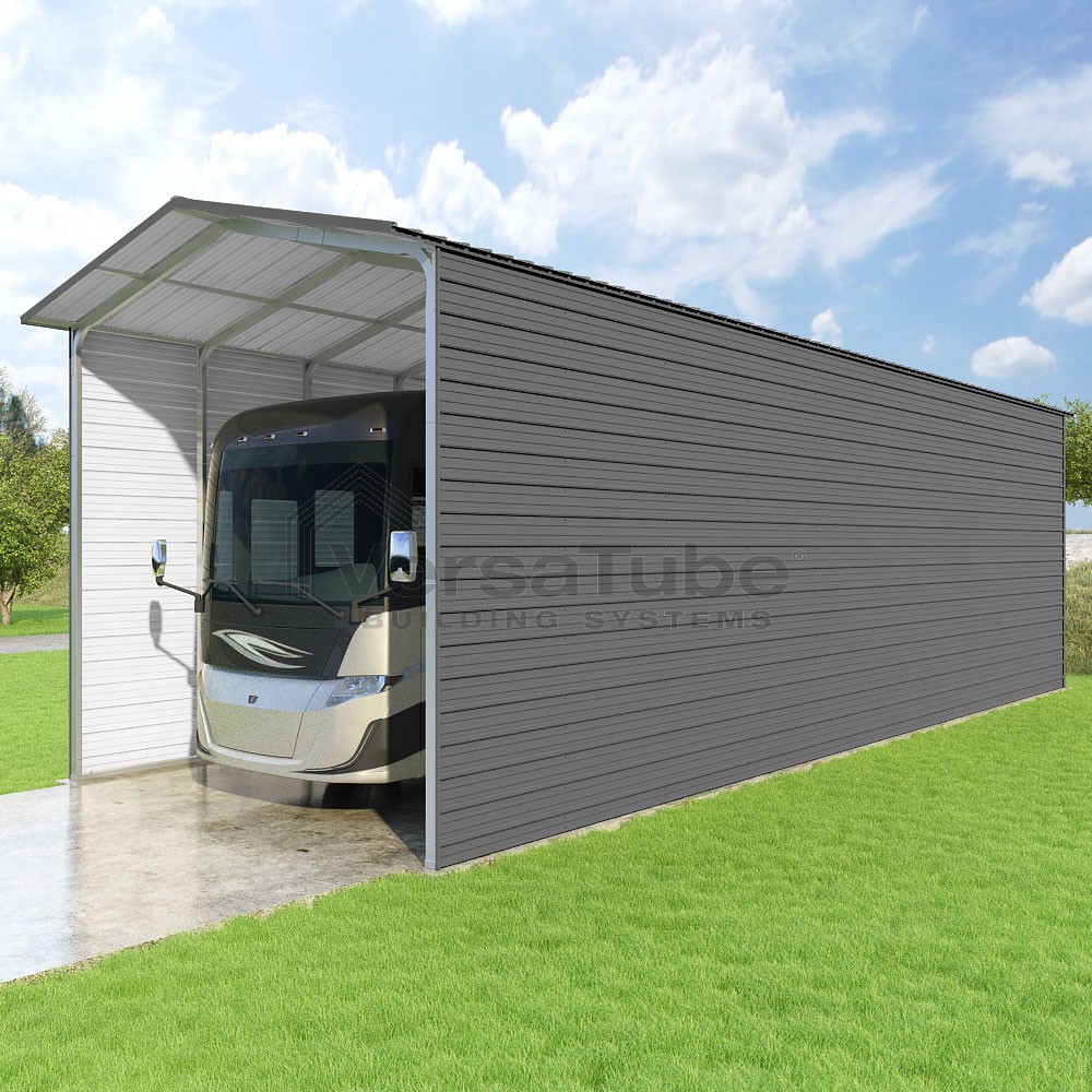 Pinnacle Series DIY carport kit features vertical sheet metal roof panels with ridge cap, gable and eave trim for an A-frame roof style and extended coverage on both ends.