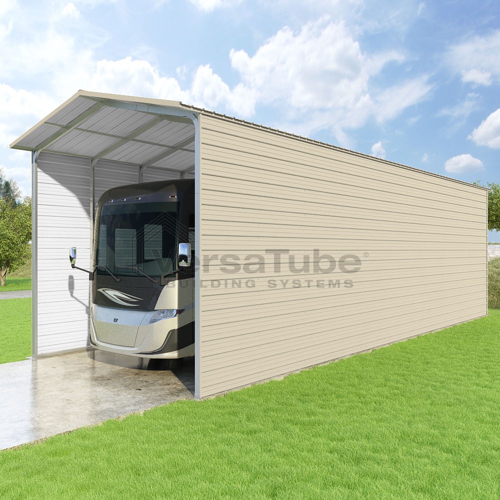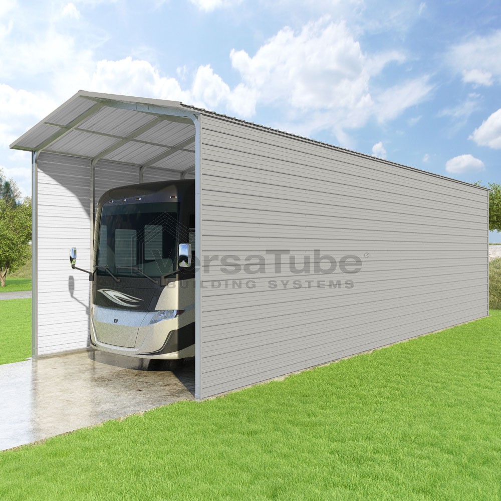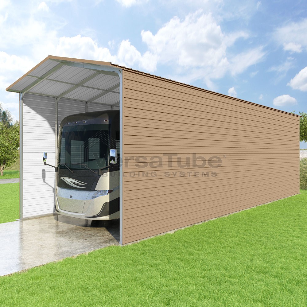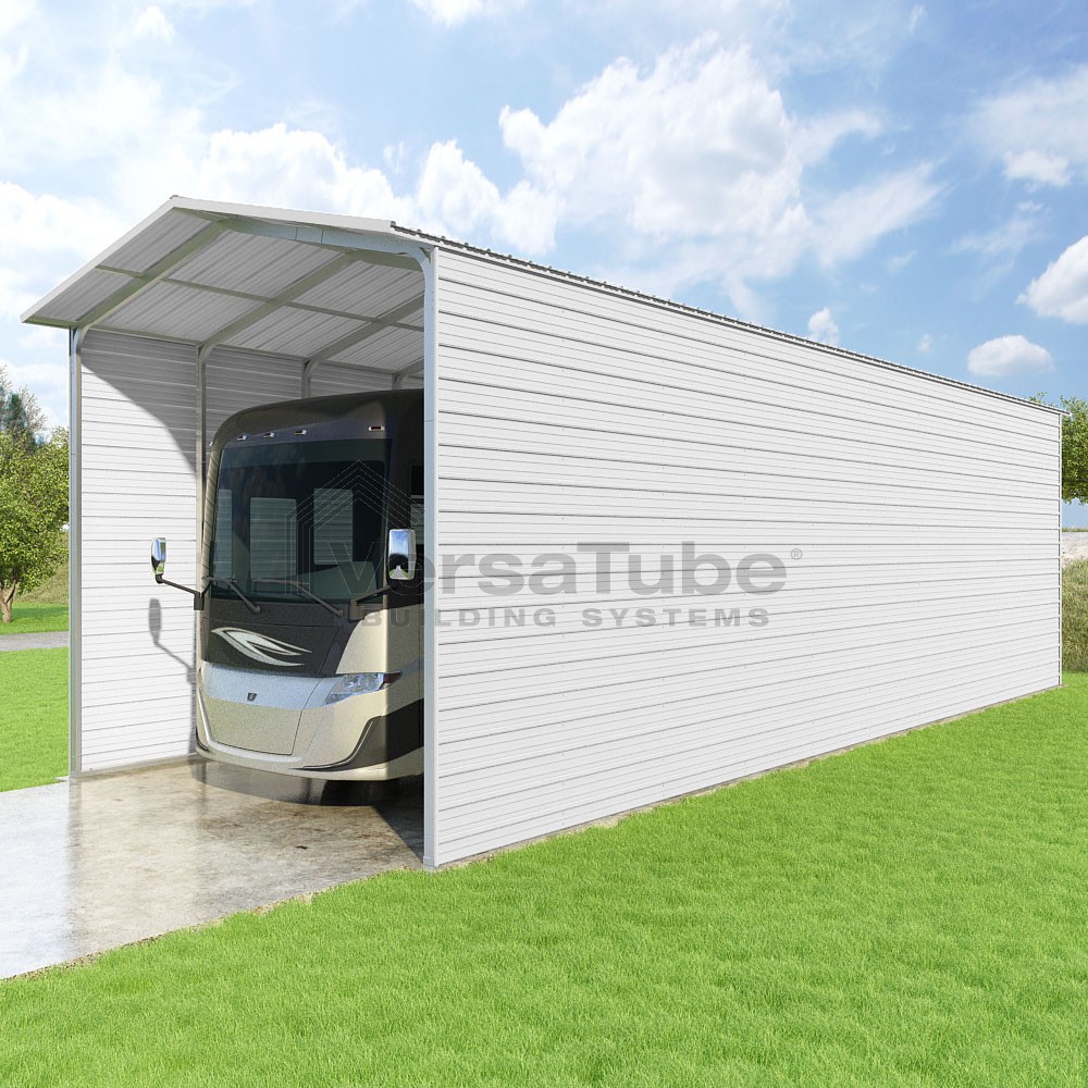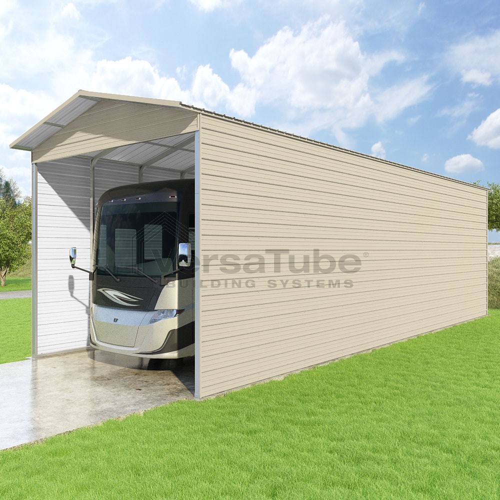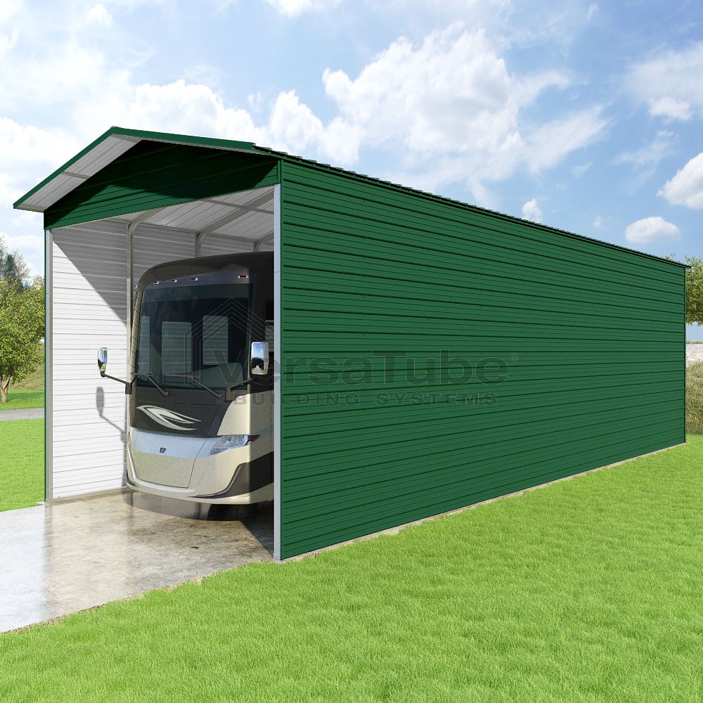 Pinnacle Series DIY carport kit features vertical sheet metal roof panels with ridge cap, gable and eave trim for an A-frame roof style and extended coverage on both ends.