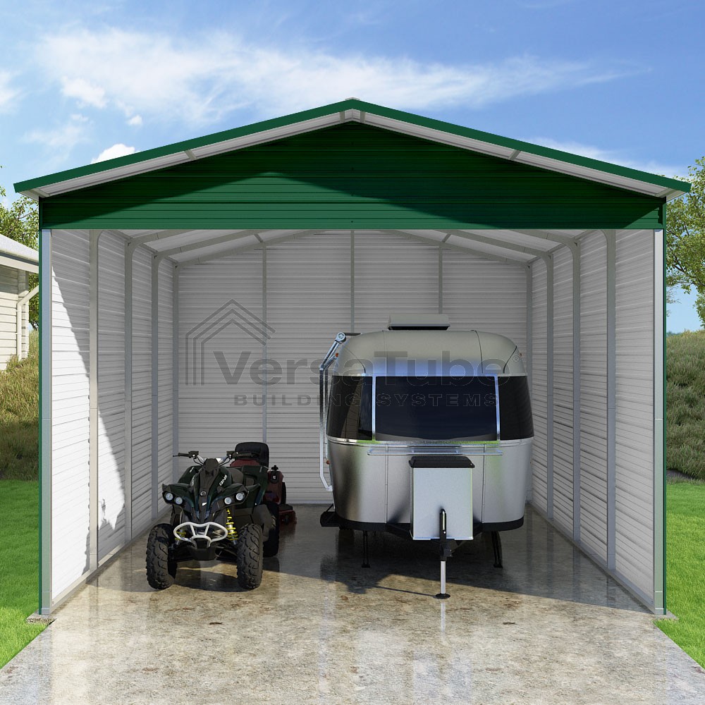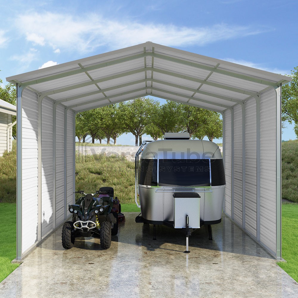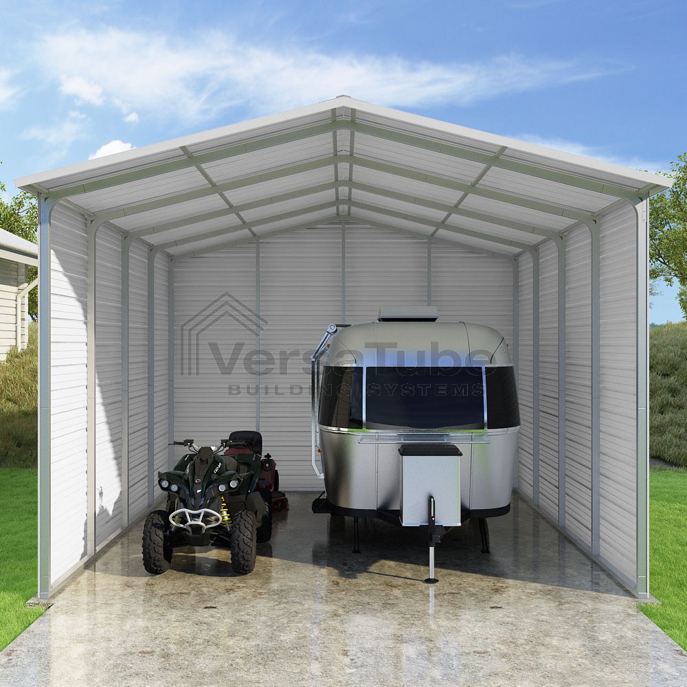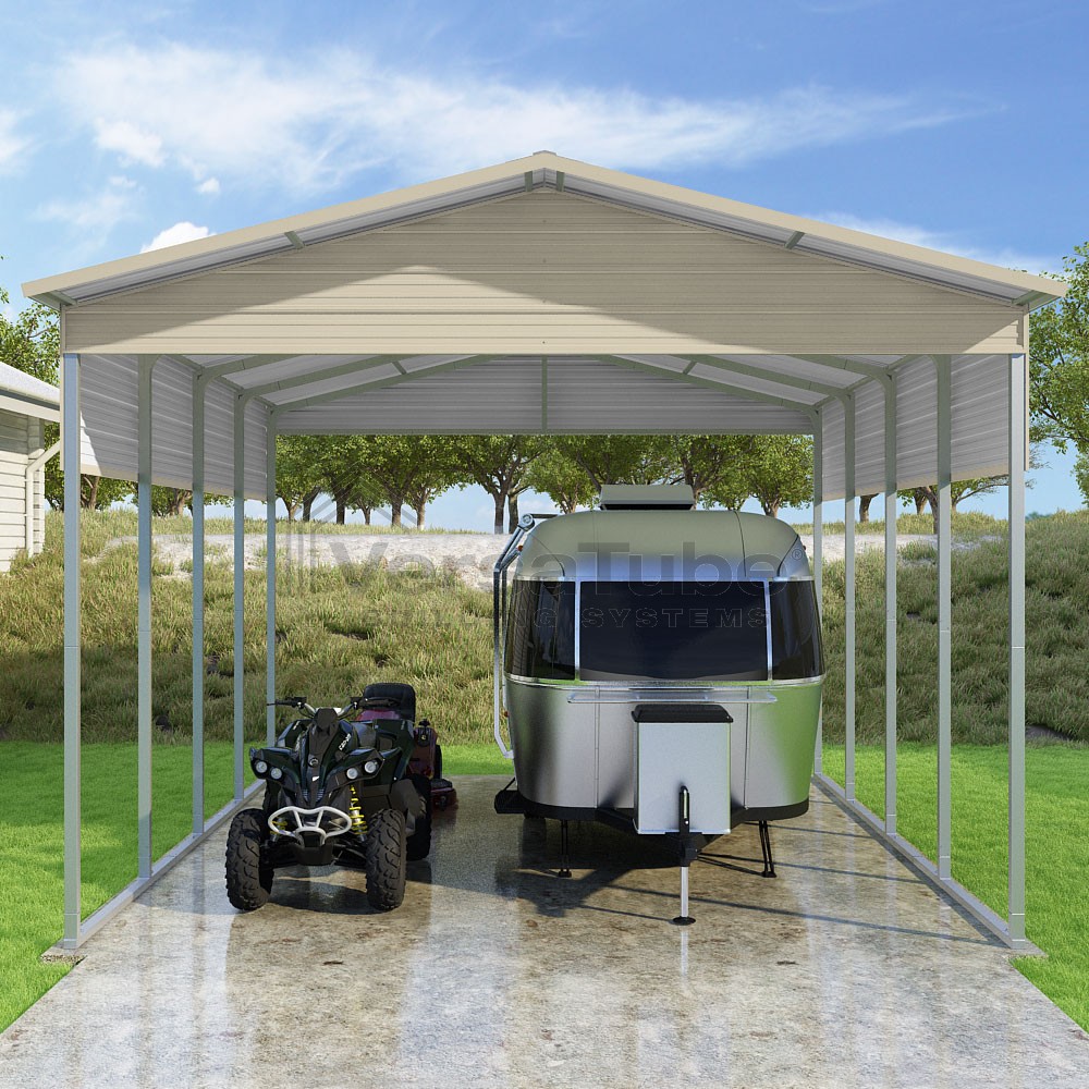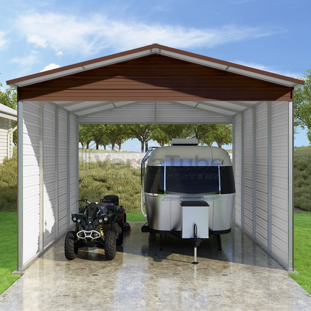Pinnacle Series DIY carport kit features vertical sheet metal roof panels with ridge cap, gable and eave trim for an A-frame roof style and extended coverage on both ends.