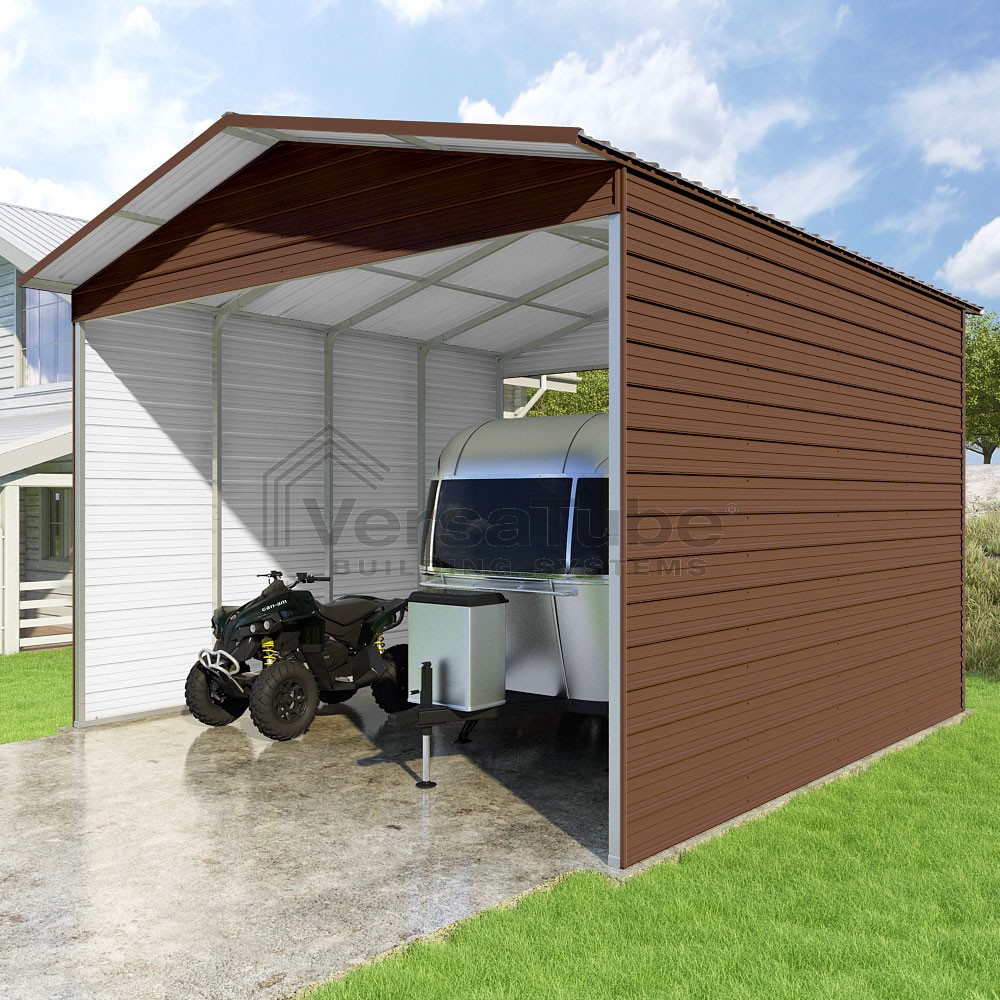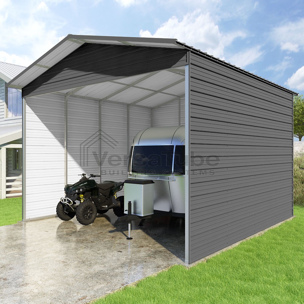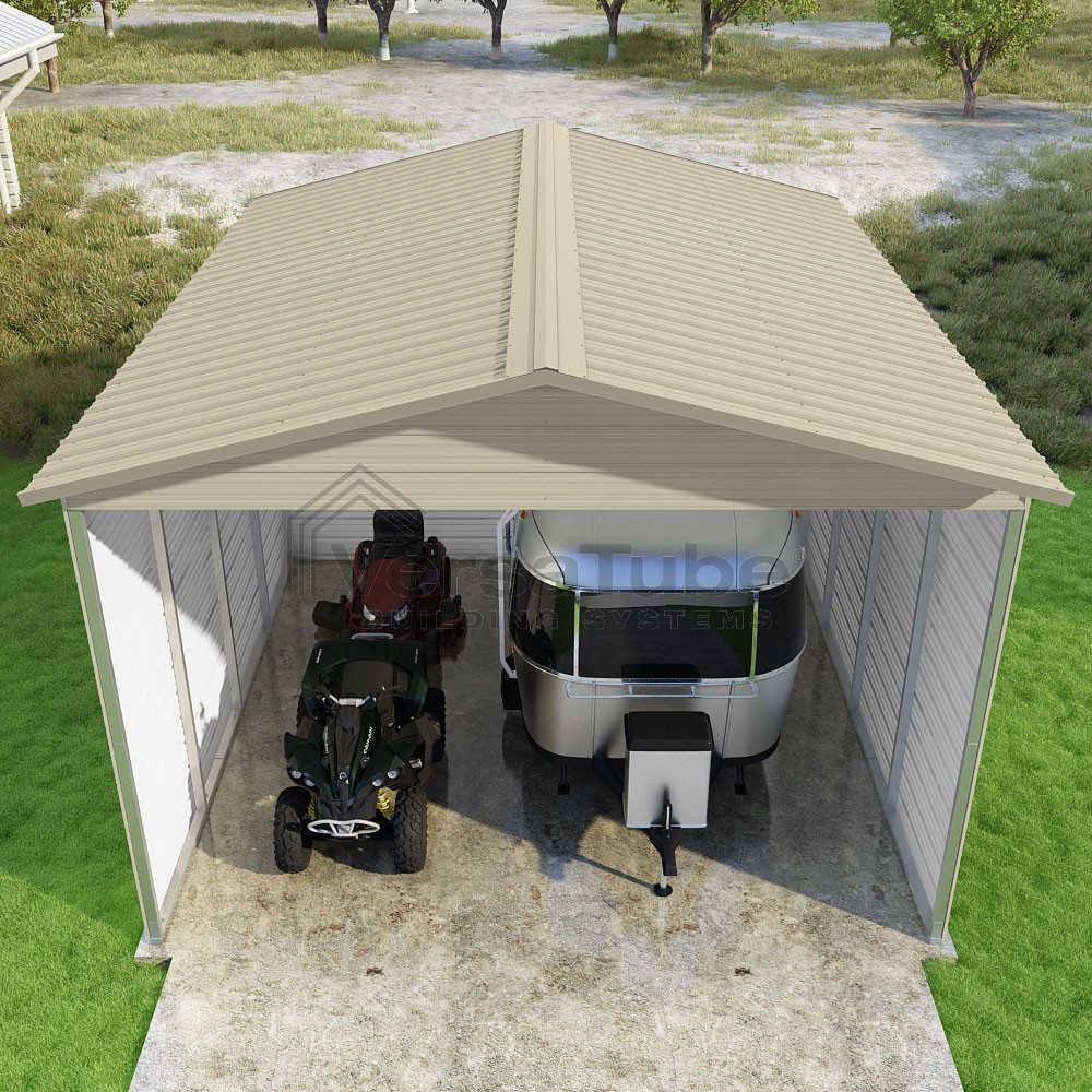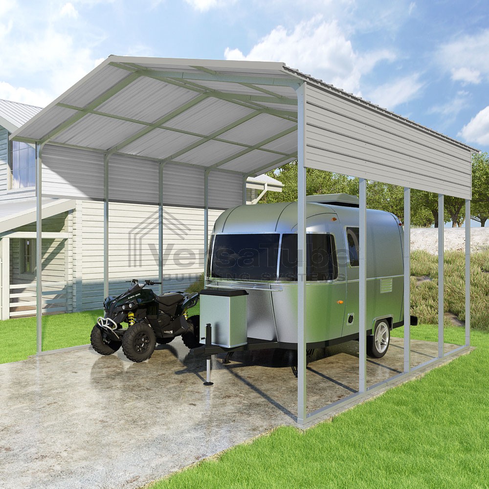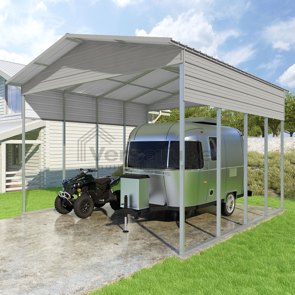 Pinnacle Series DIY carport kit features vertical sheet metal roof panels with ridge cap, gable and eave trim for an A-frame roof style and extended coverage on both ends.