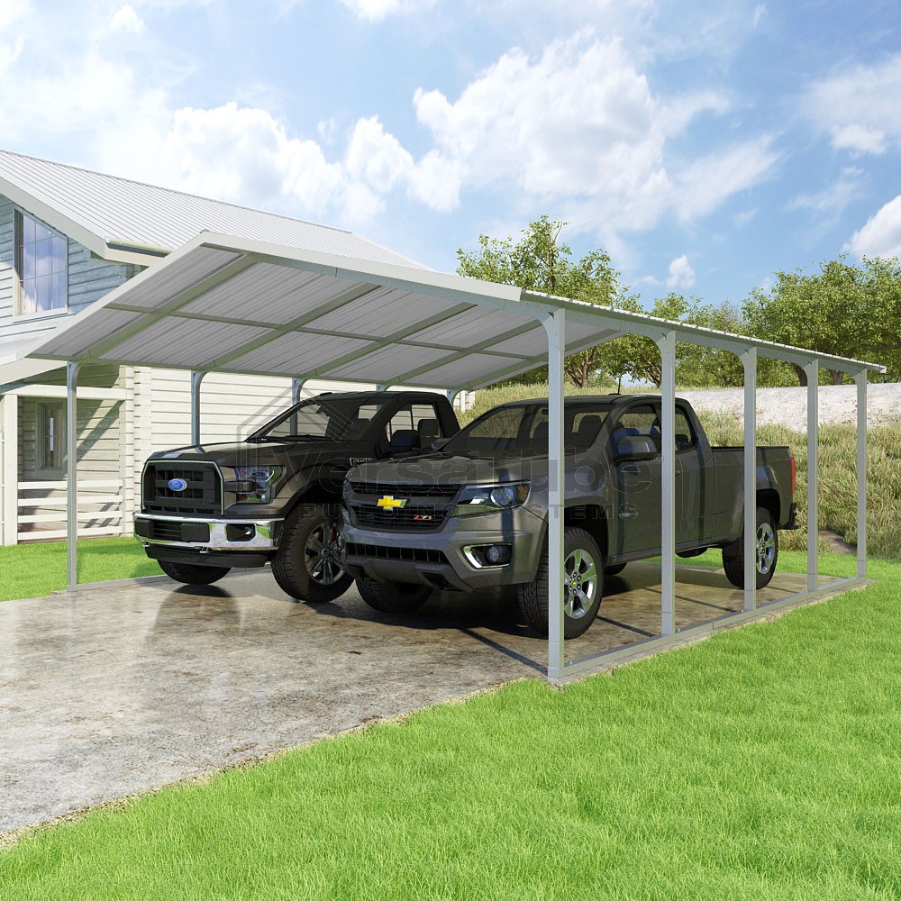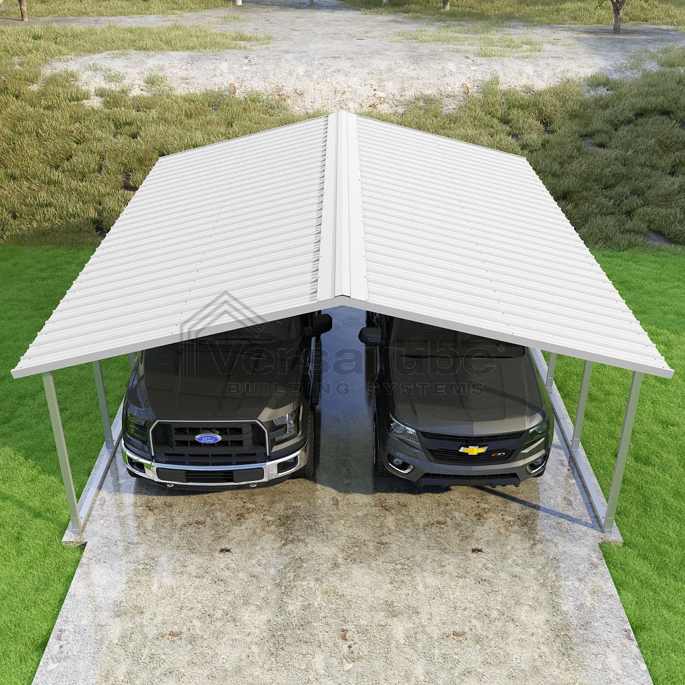 Pinnacle Series DIY carport kit features vertical sheet metal roof panels with ridge cap, gable and eave trim for an A-frame roof style and extended coverage on both ends.