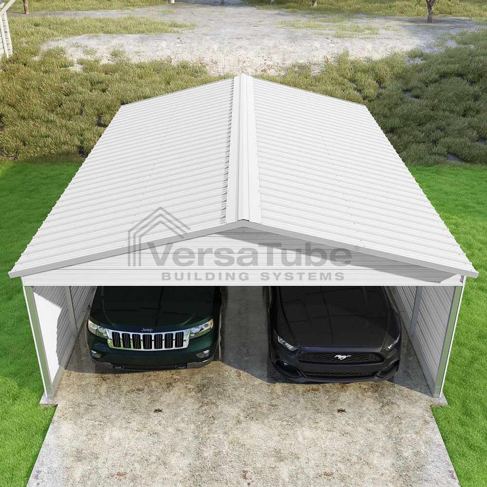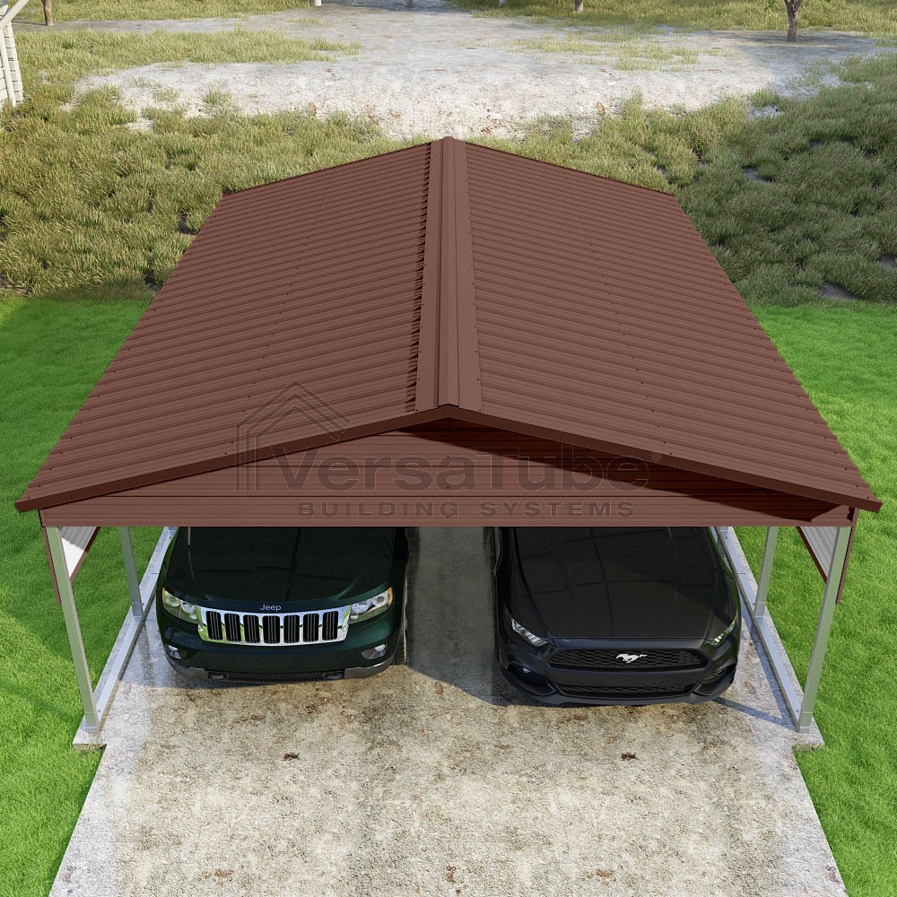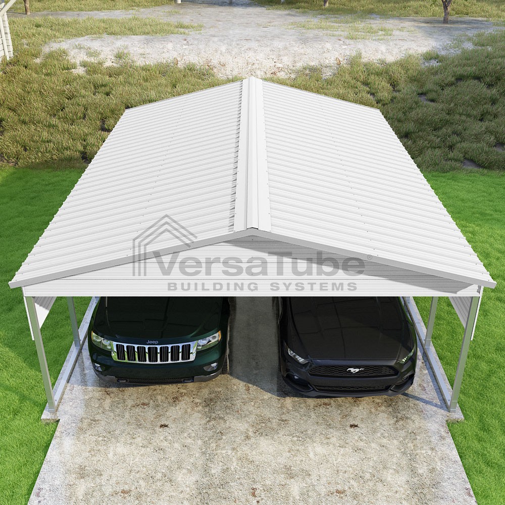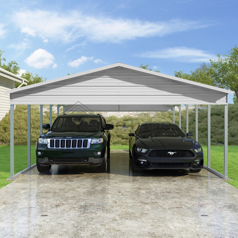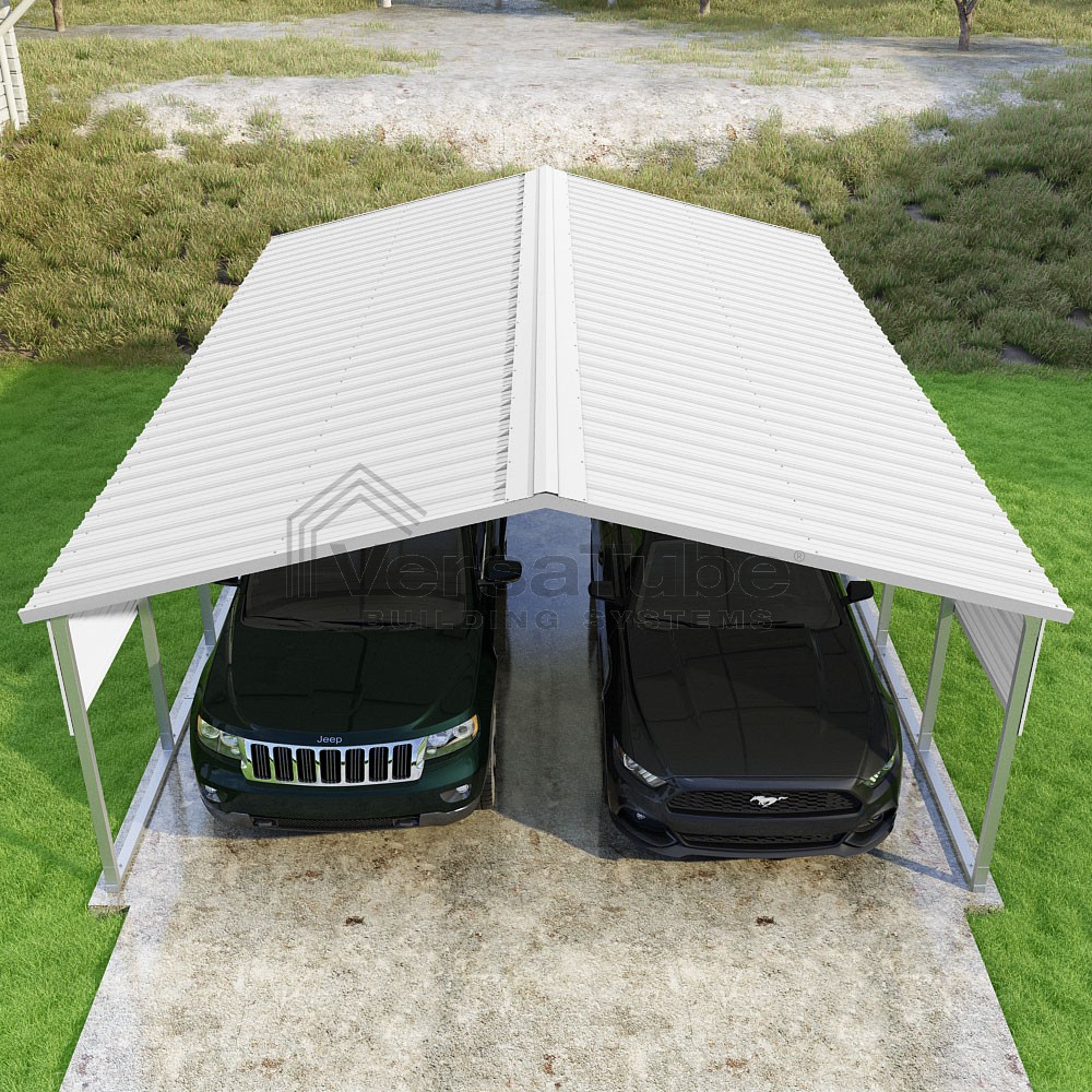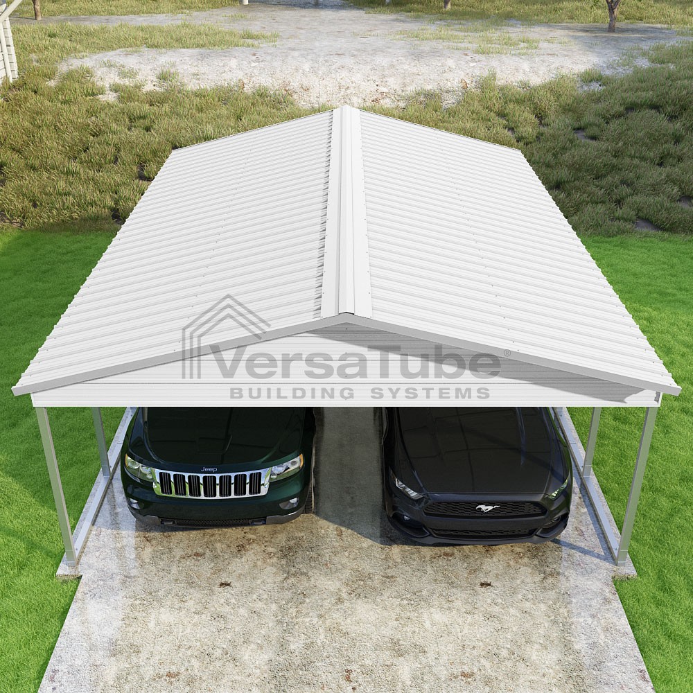 Pinnacle Series DIY carport kit features vertical sheet metal roof panels with ridge cap, gable and eave trim for an A-frame roof style and extended coverage on both ends.