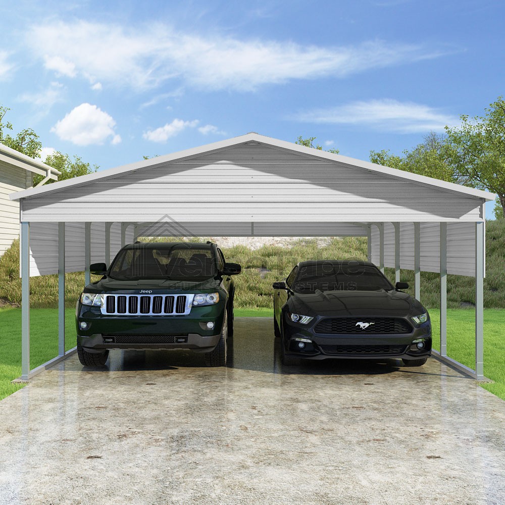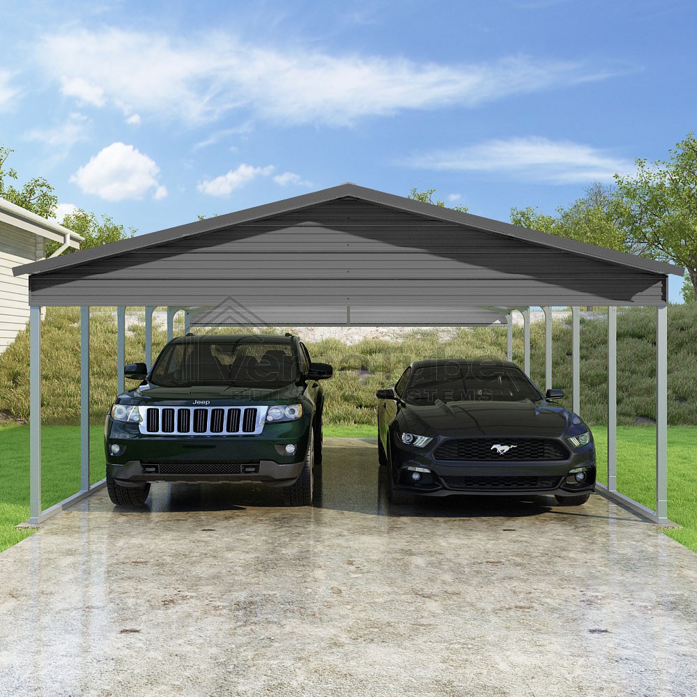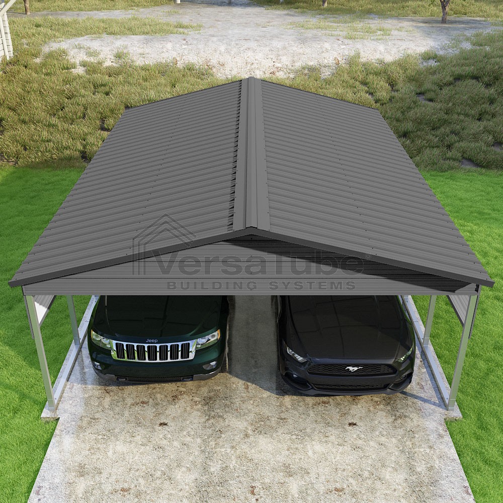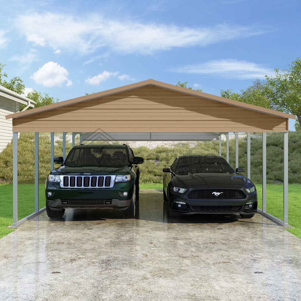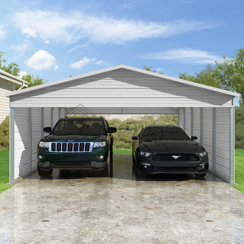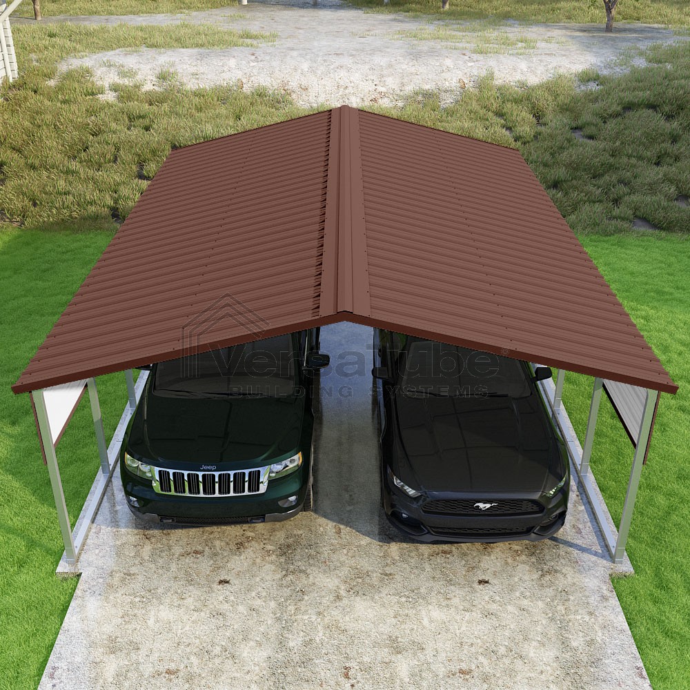 Pinnacle Series DIY carport kit features vertical sheet metal roof panels with ridge cap, gable and eave trim for an A-frame roof style and extended coverage on both ends.