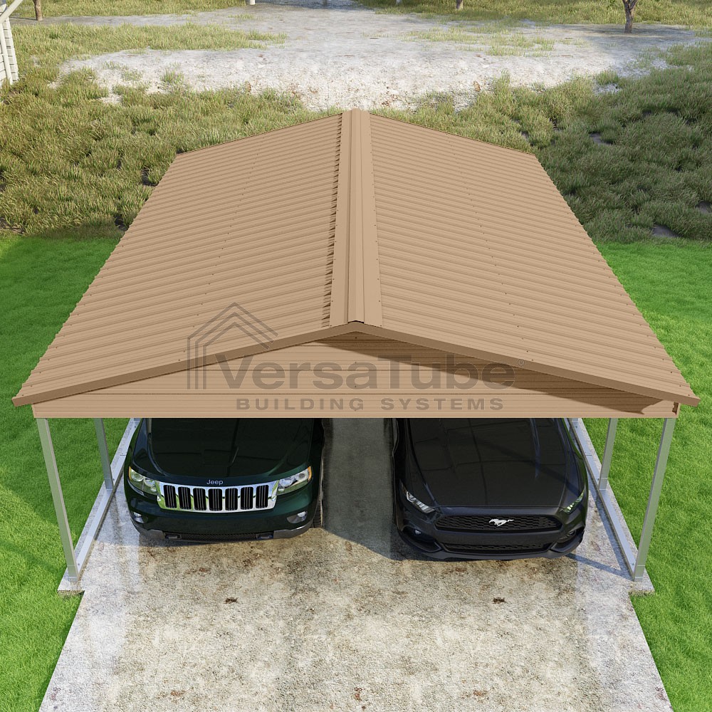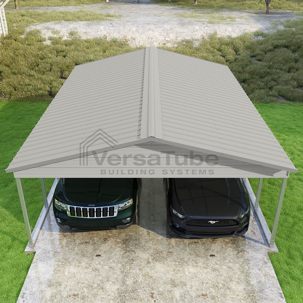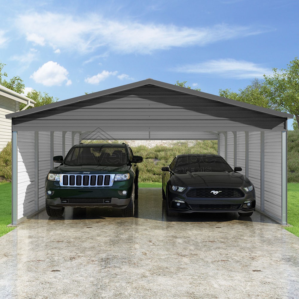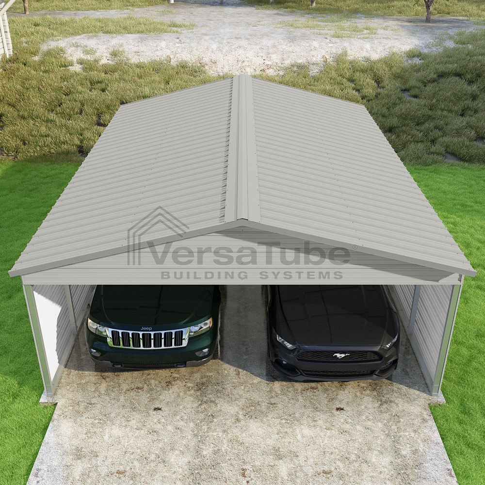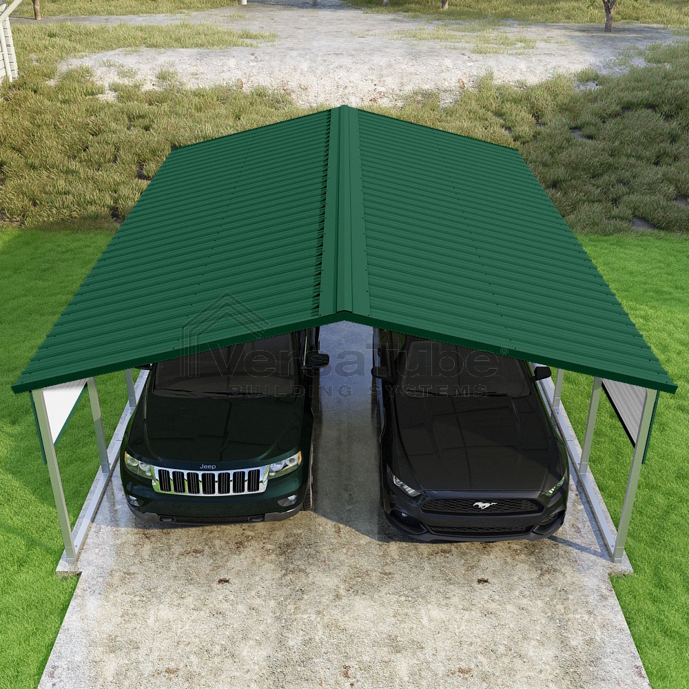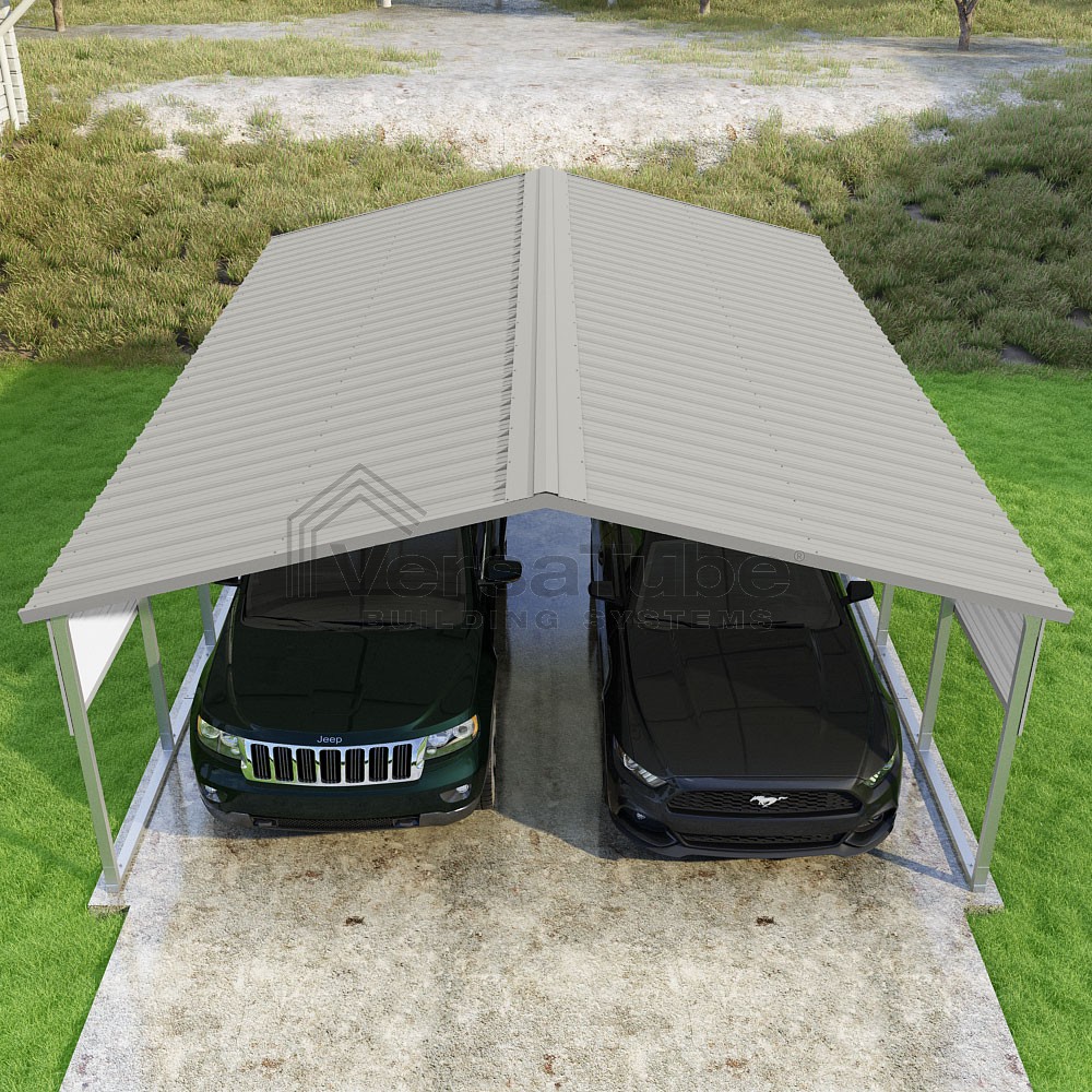 Pinnacle Series DIY carport kit features vertical sheet metal roof panels with ridge cap, gable and eave trim for an A-frame roof style and extended coverage on both ends.