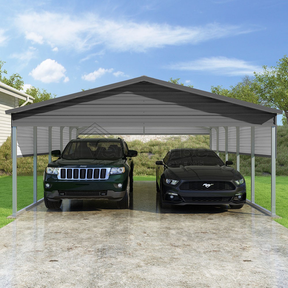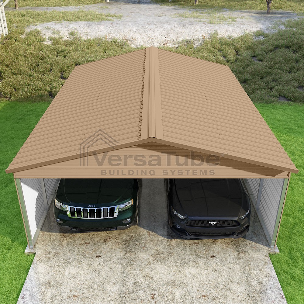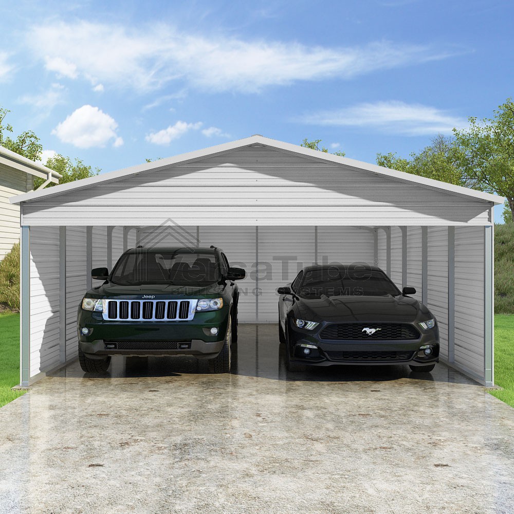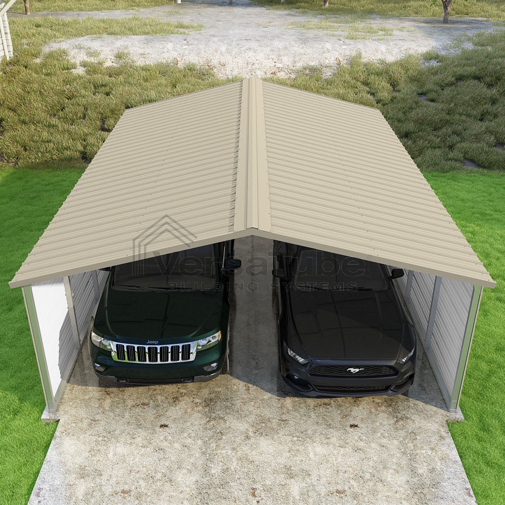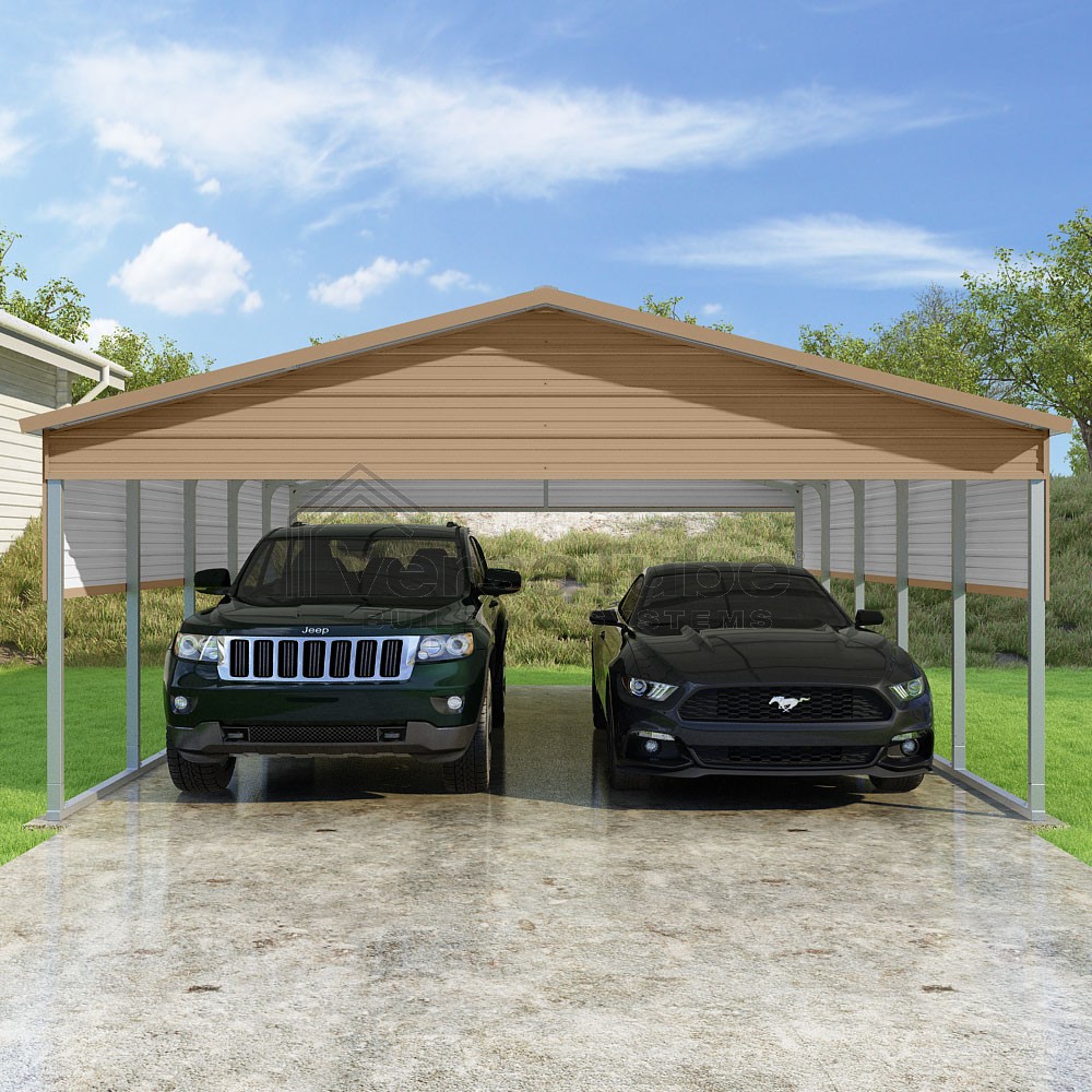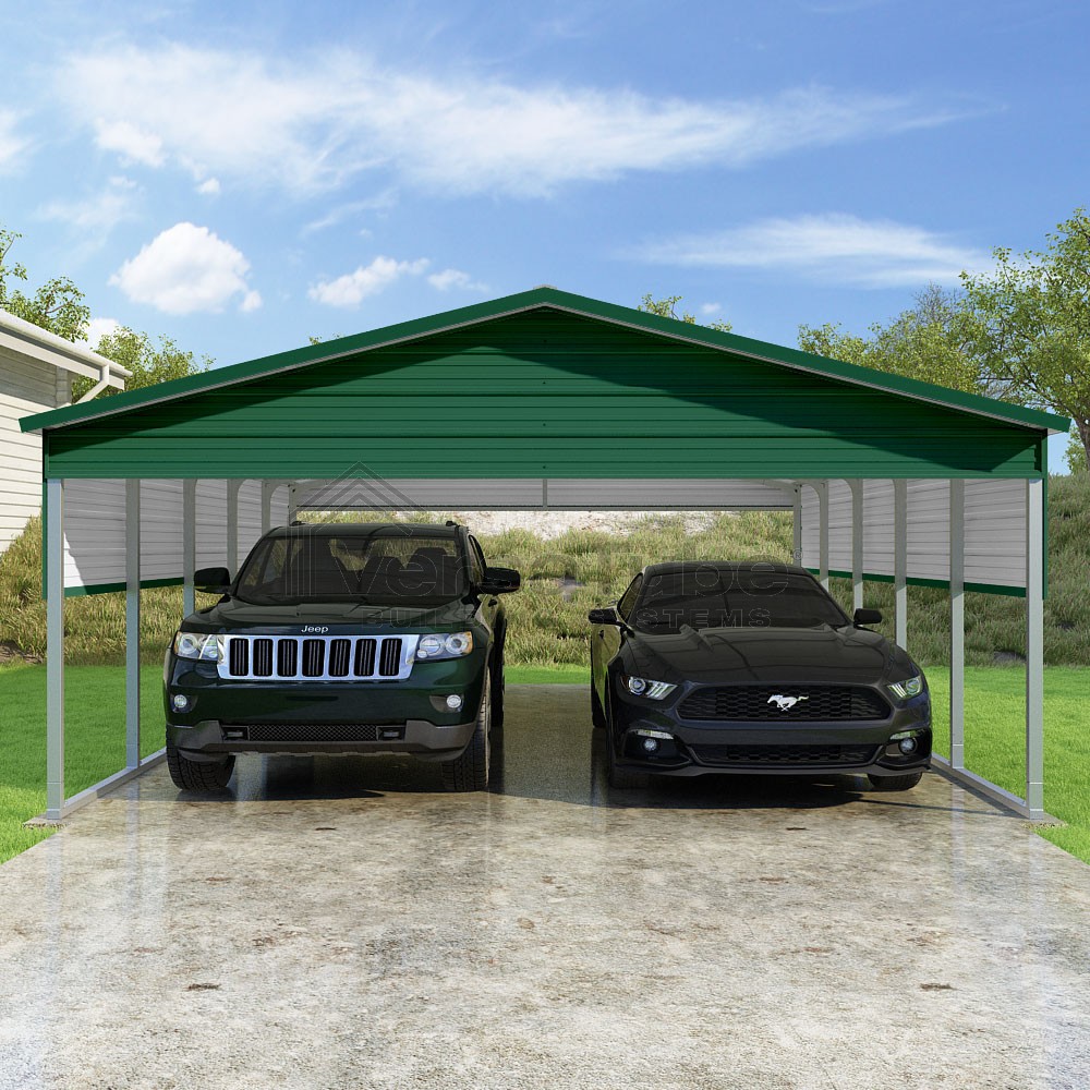 Pinnacle Series DIY carport kit features vertical sheet metal roof panels with ridge cap, gable and eave trim for an A-frame roof style and extended coverage on both ends.