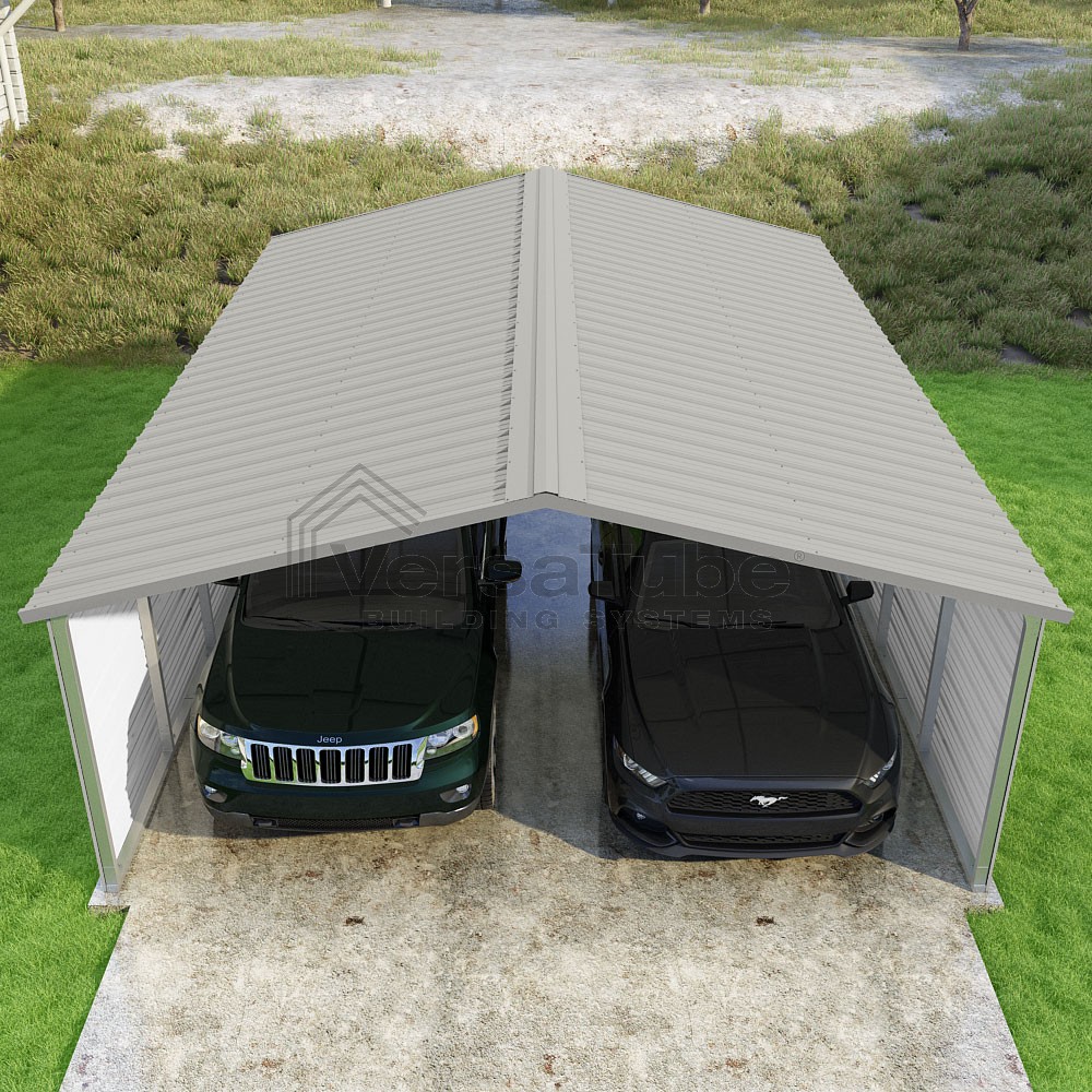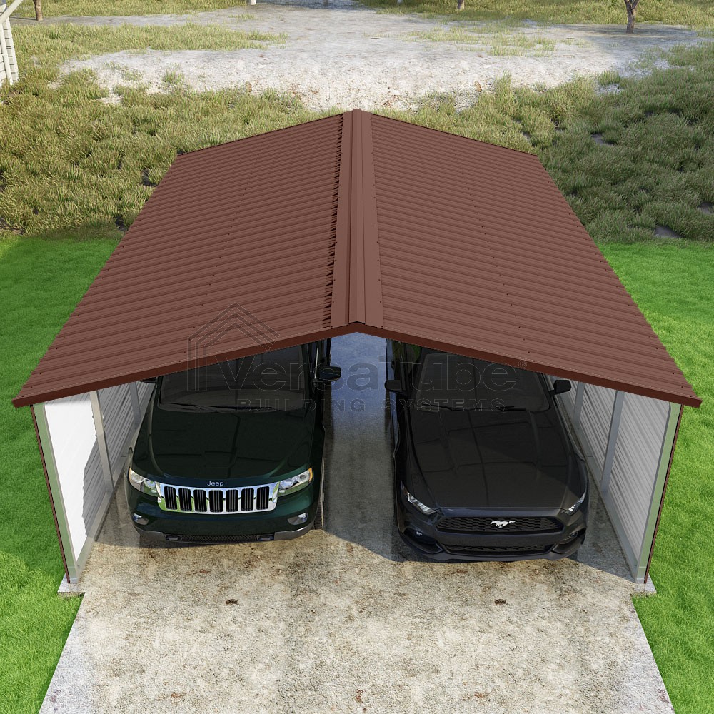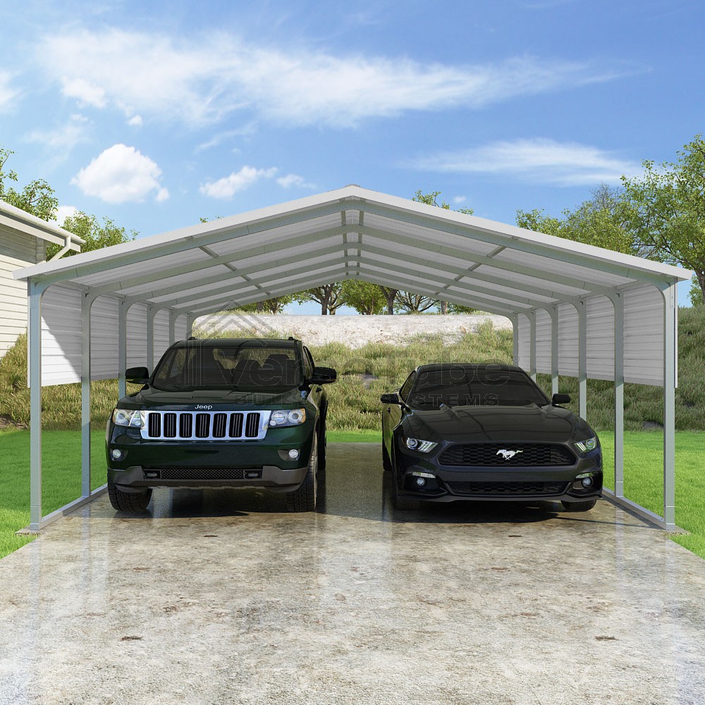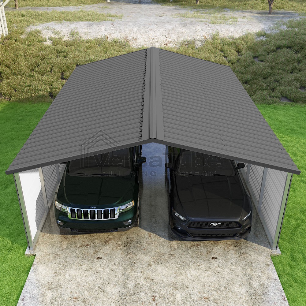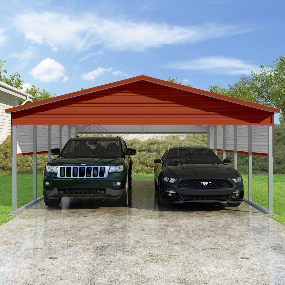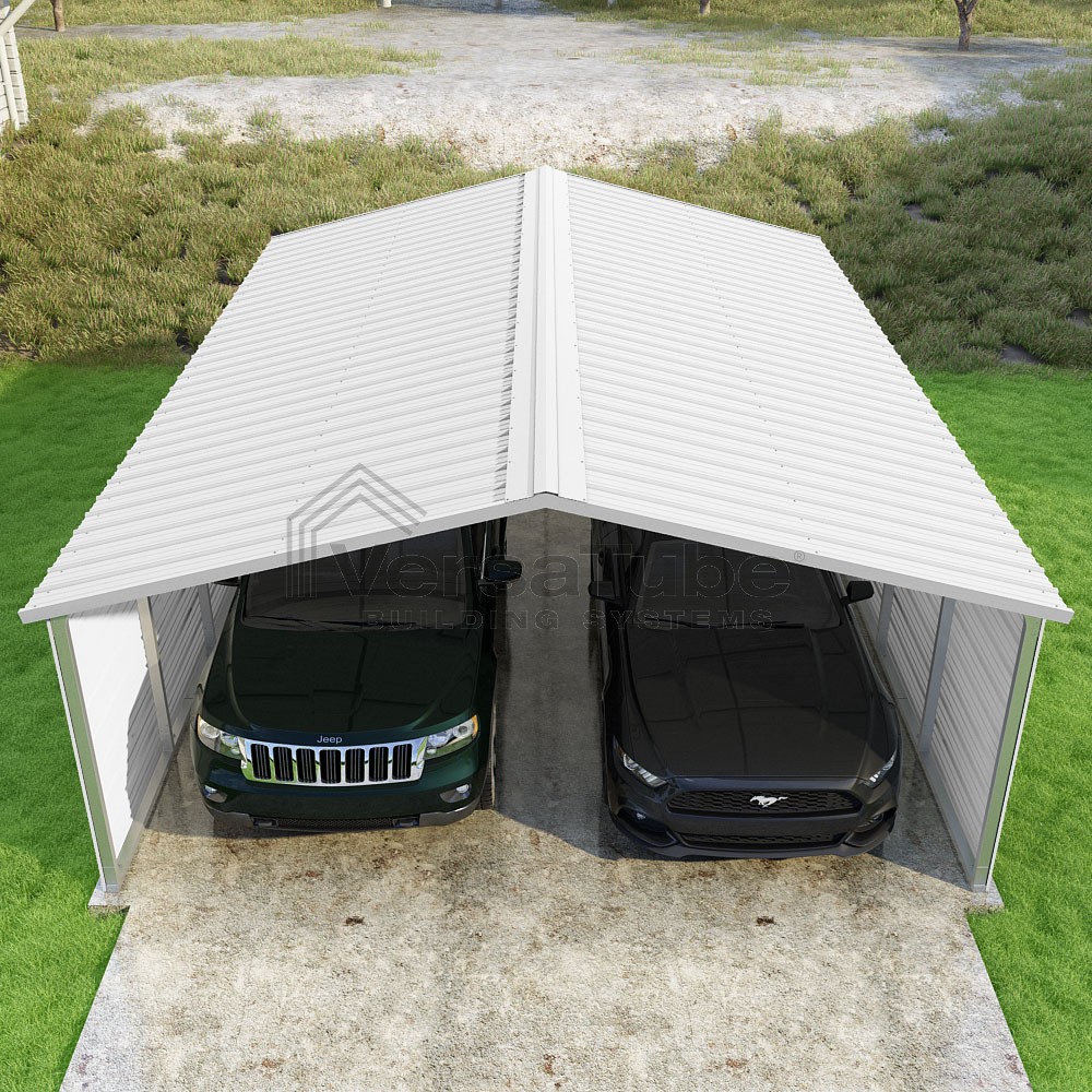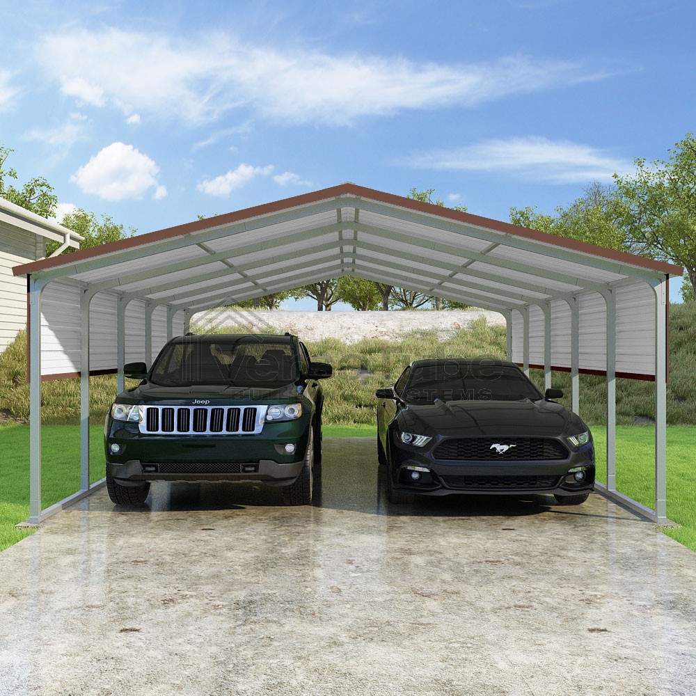 Pinnacle Series DIY carport kit features vertical sheet metal roof panels with ridge cap, gable and eave trim for an A-frame roof style and extended coverage on both ends.