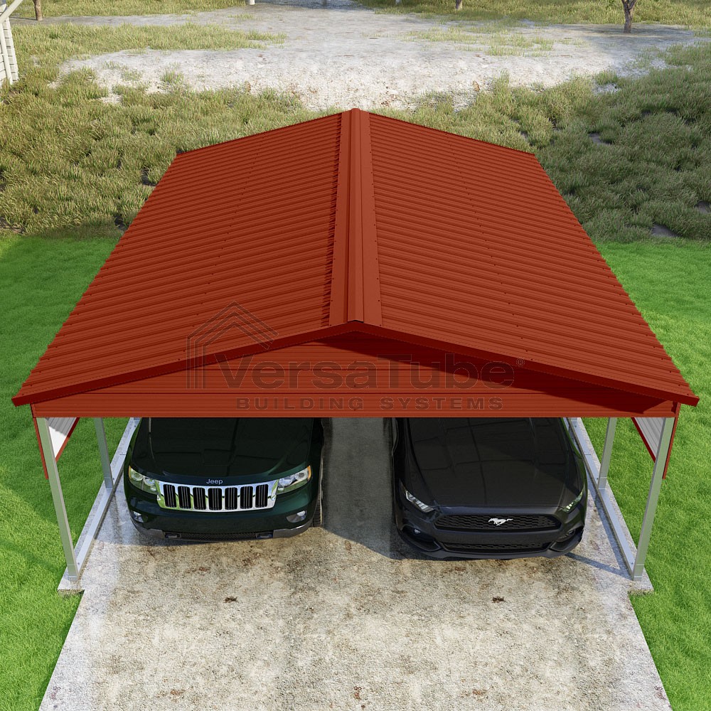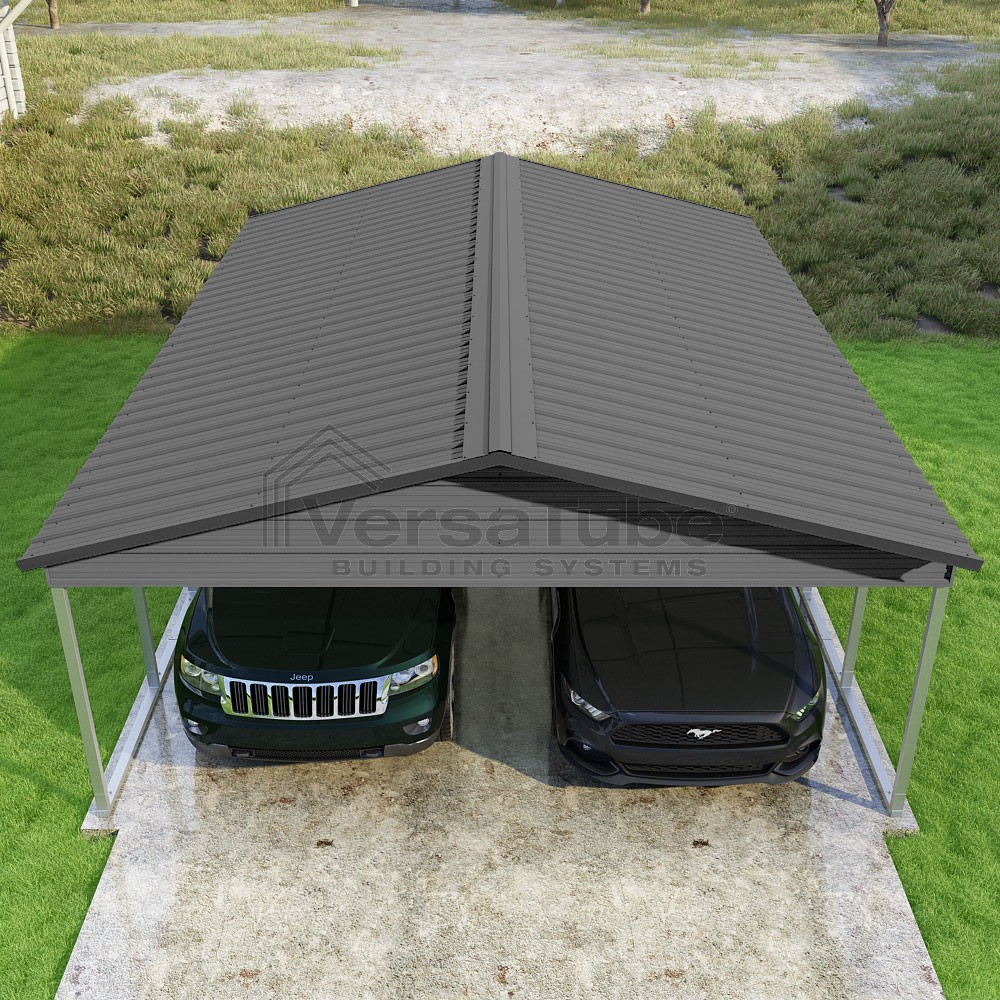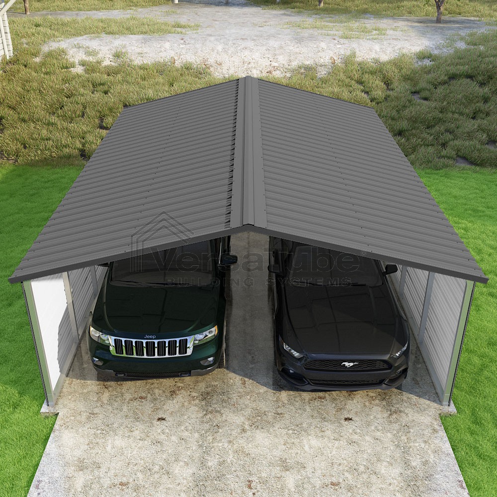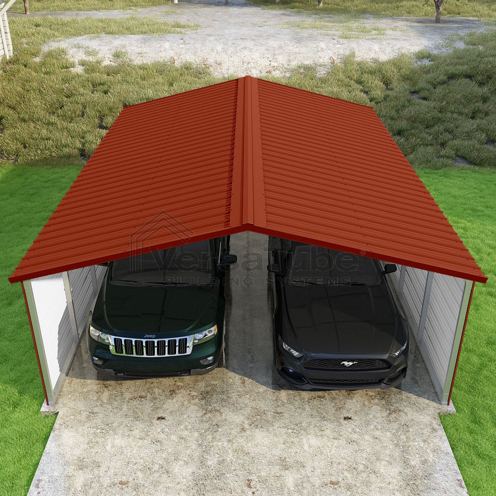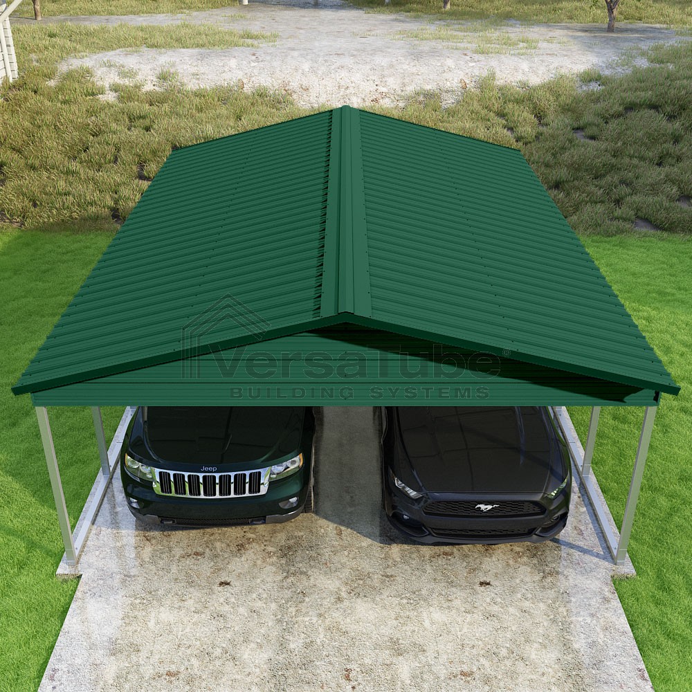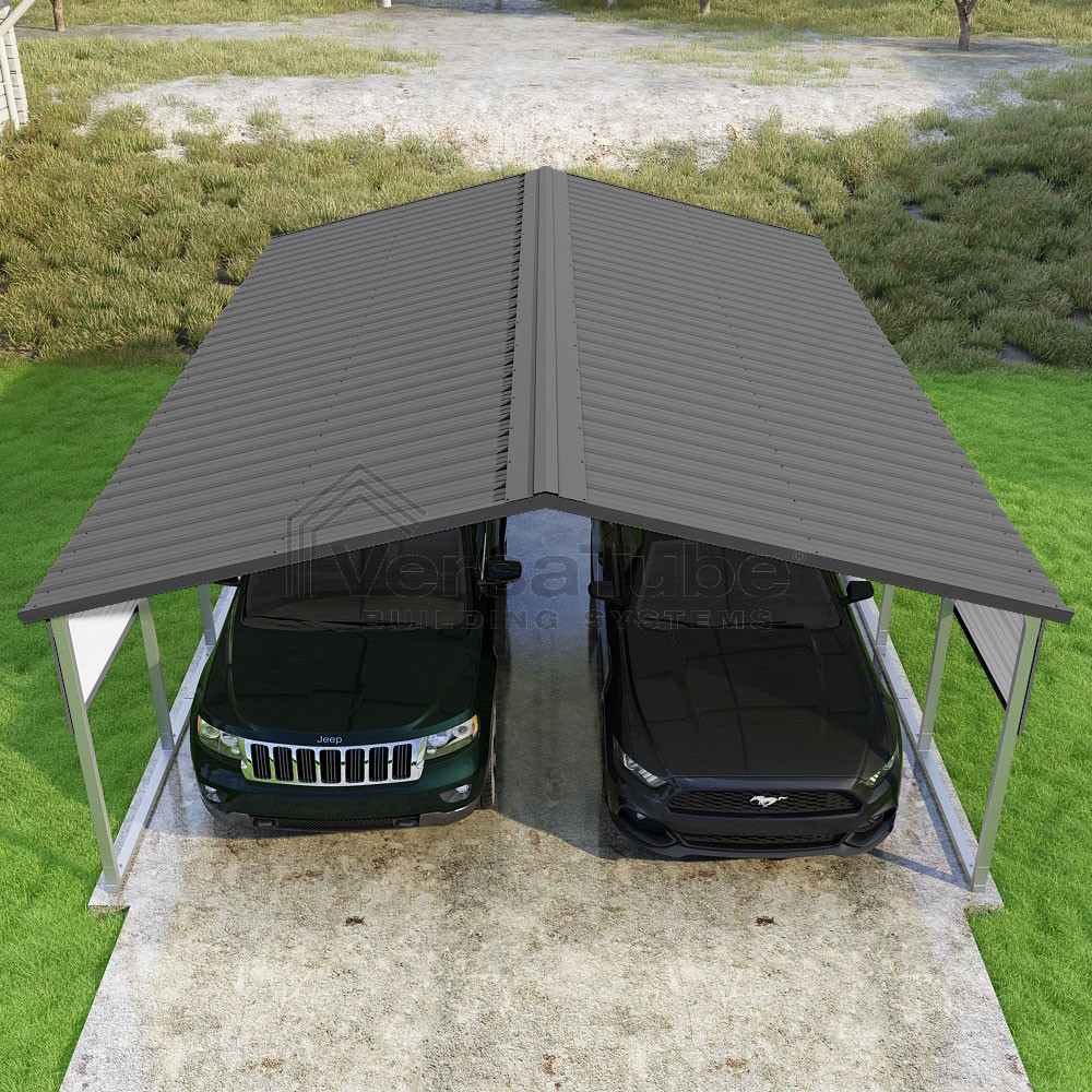 Pinnacle Series DIY carport kit features vertical sheet metal roof panels with ridge cap, gable and eave trim for an A-frame roof style and extended coverage on both ends.