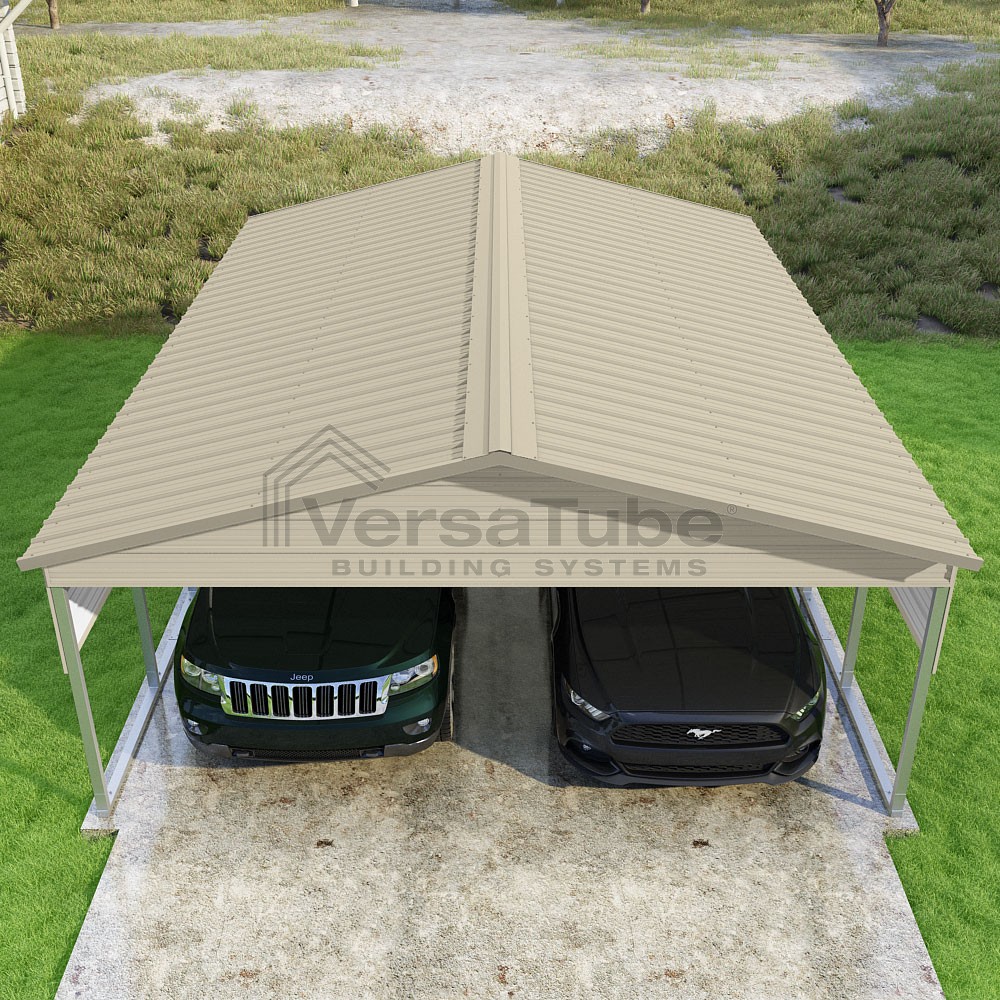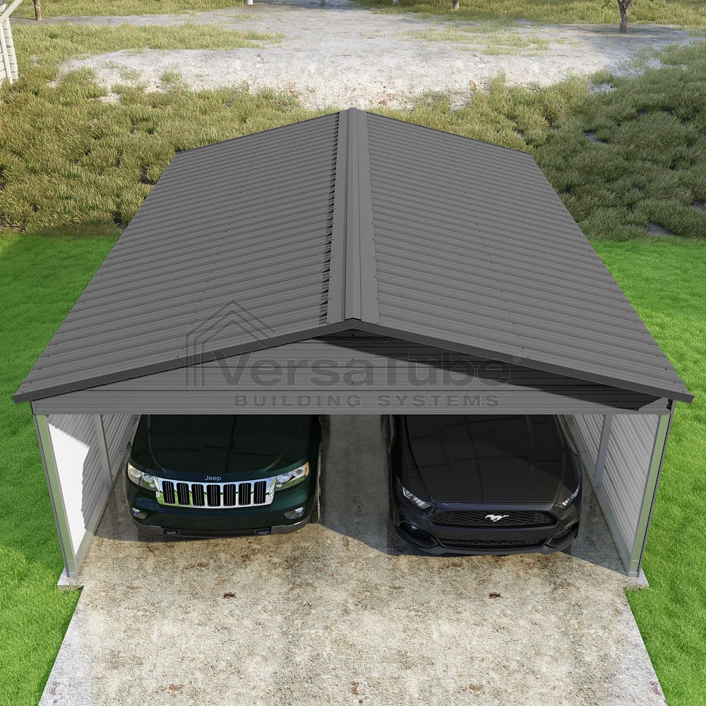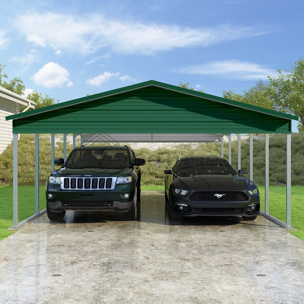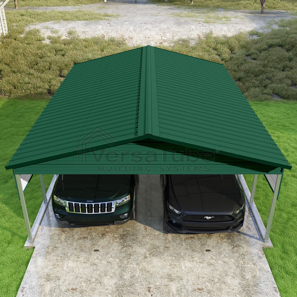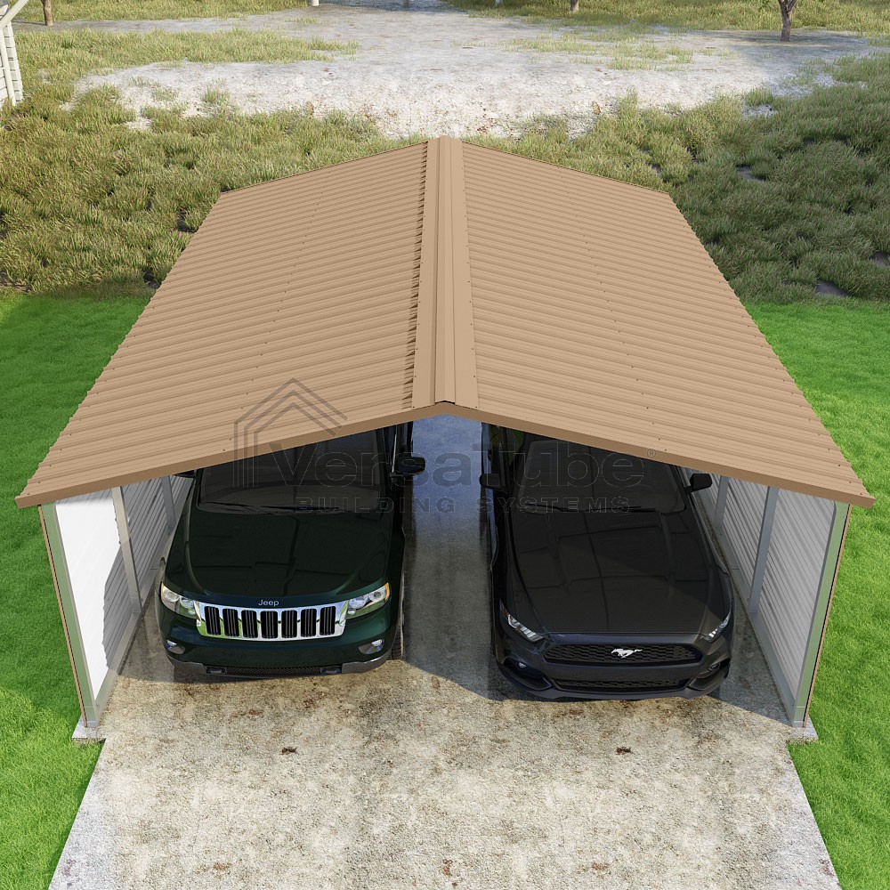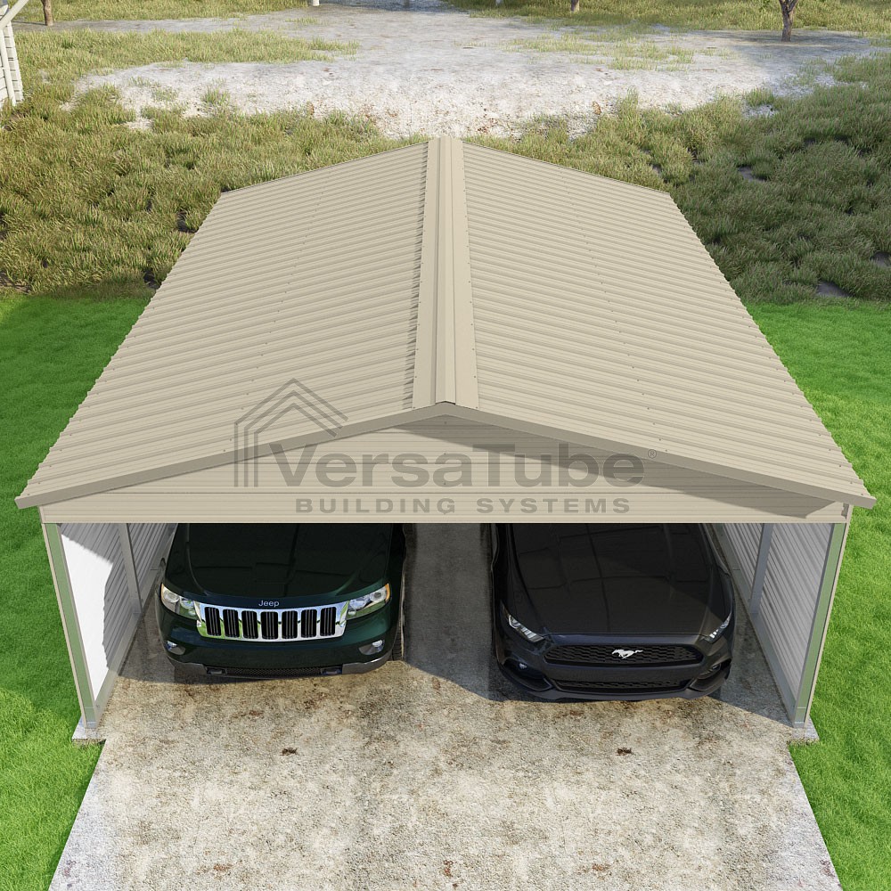 Pinnacle Series DIY carport kit features vertical sheet metal roof panels with ridge cap, gable and eave trim for an A-frame roof style and extended coverage on both ends.
