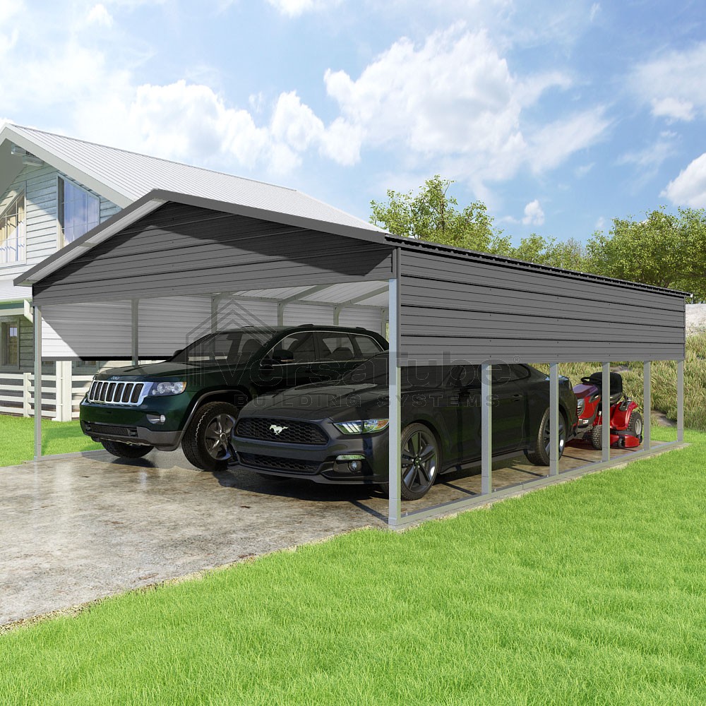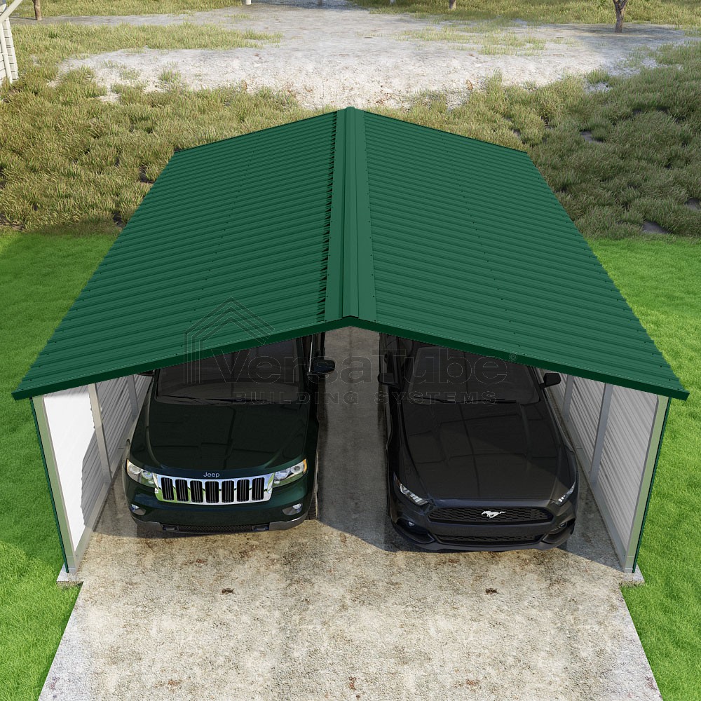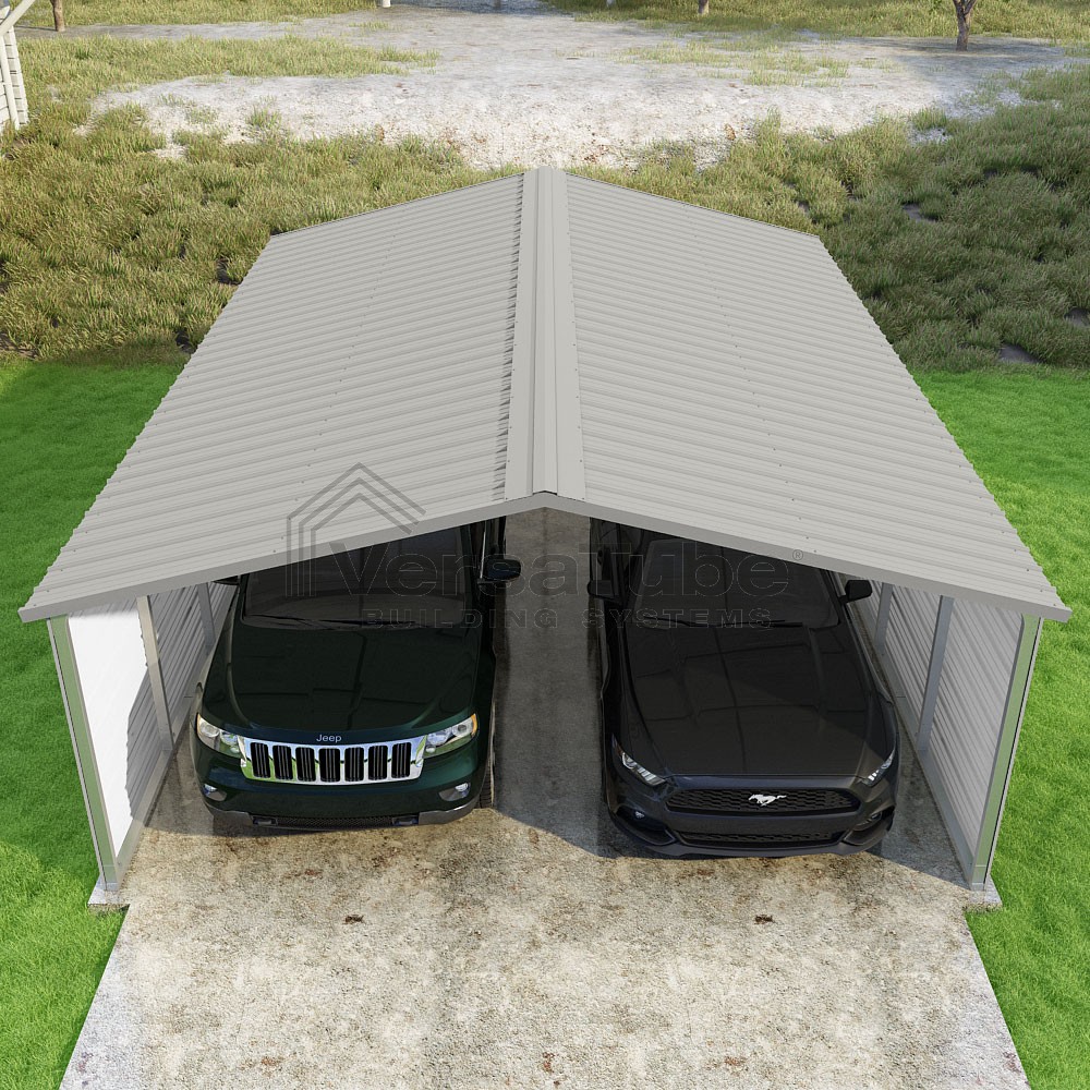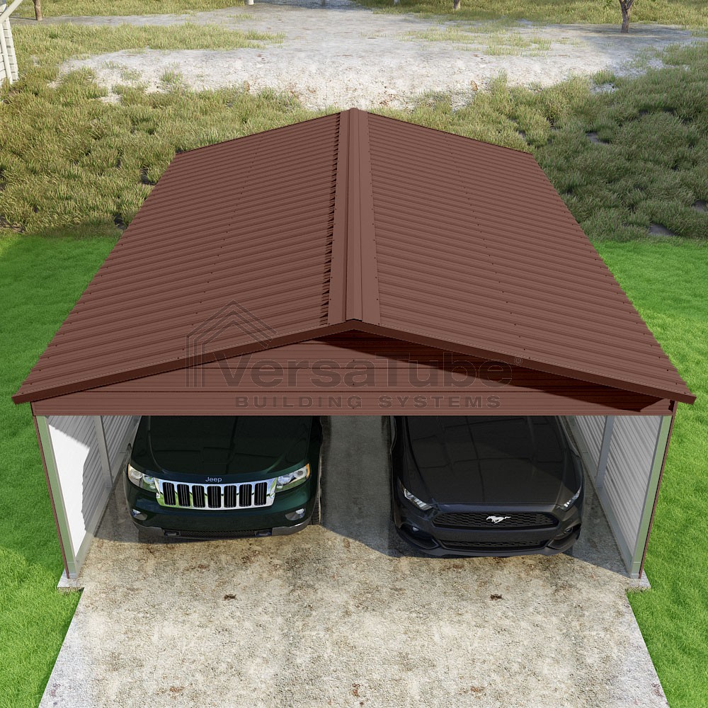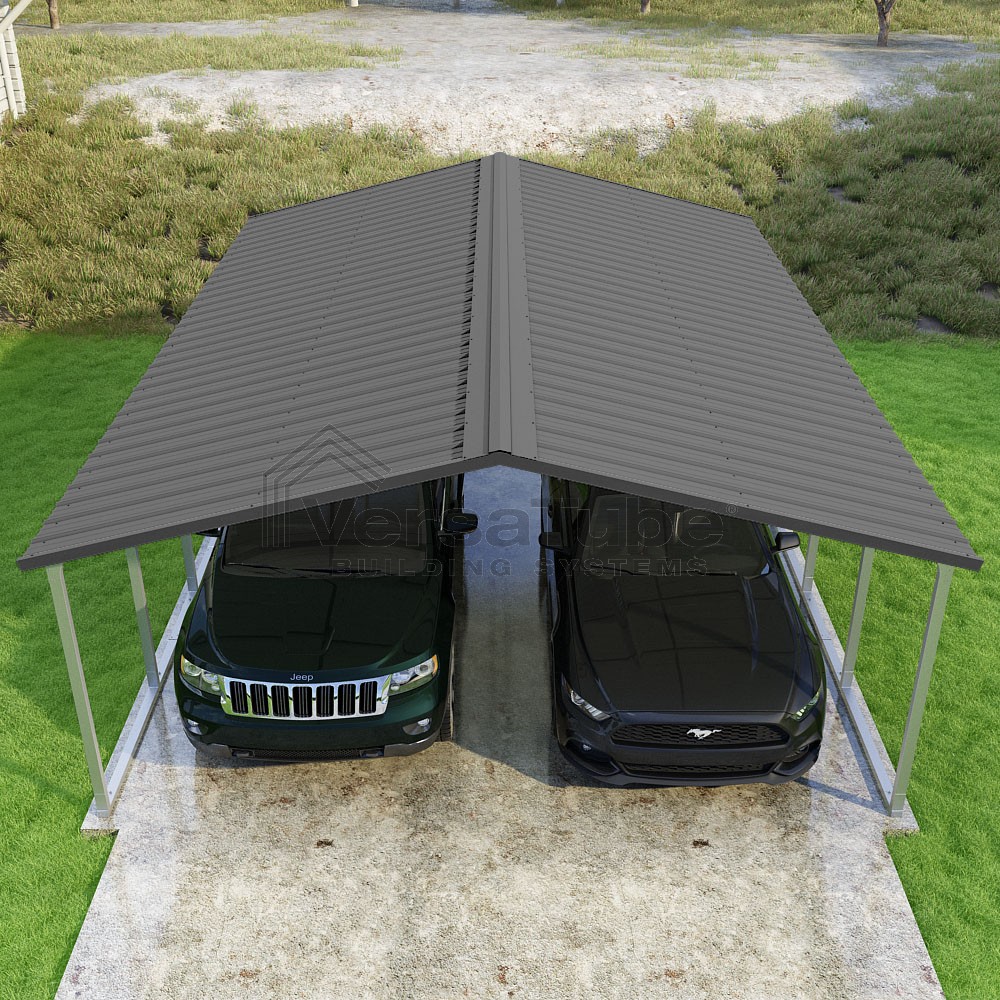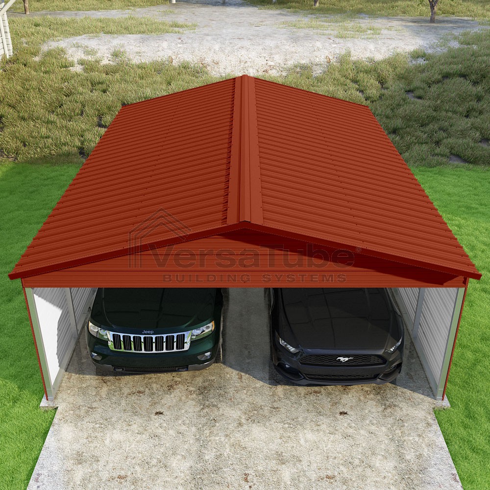 Pinnacle Series DIY carport kit features vertical sheet metal roof panels with ridge cap, gable and eave trim for an A-frame roof style and extended coverage on both ends.