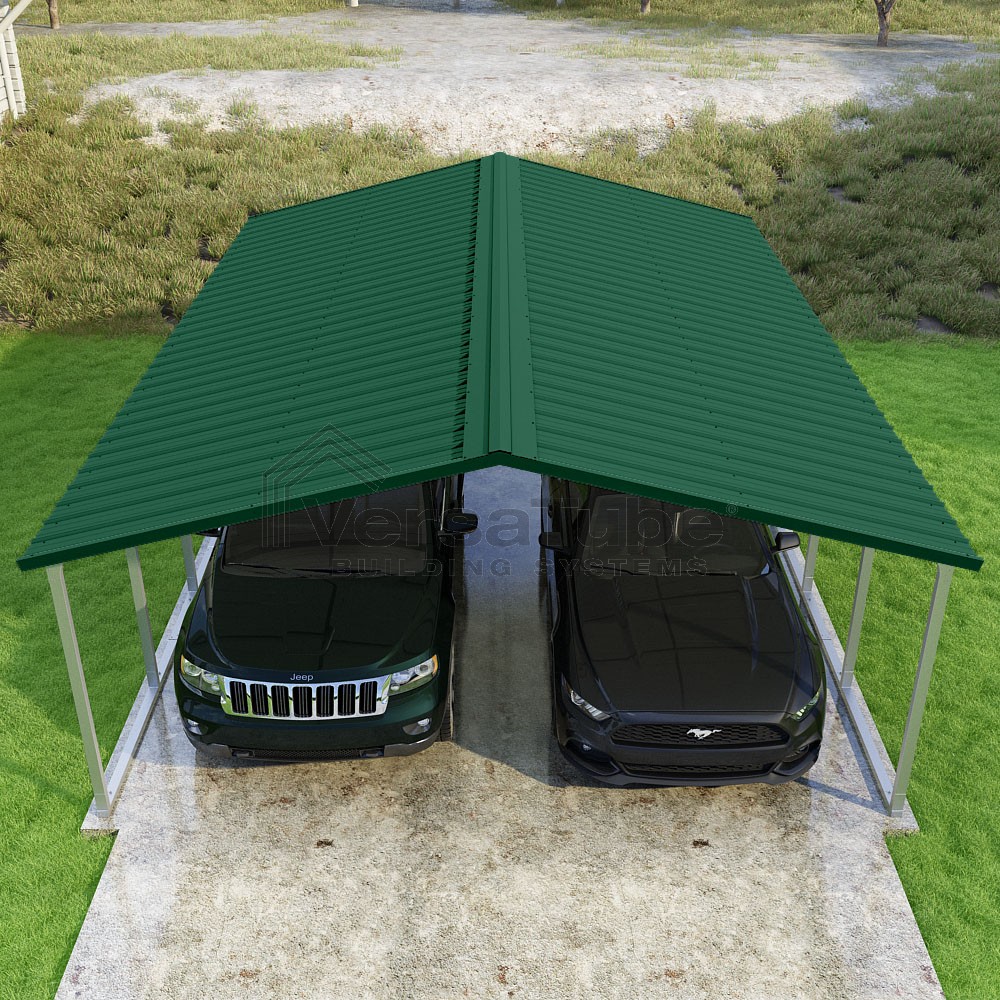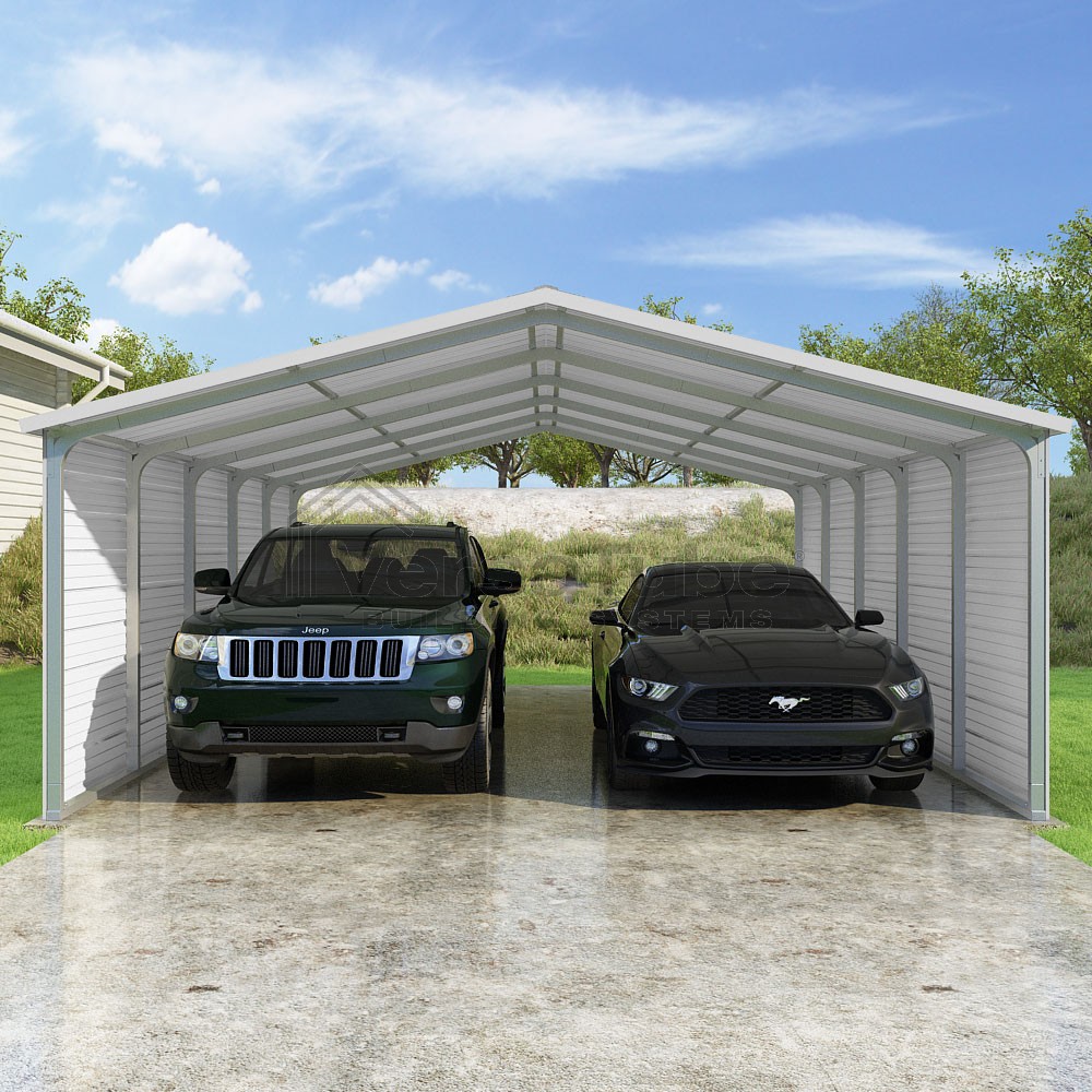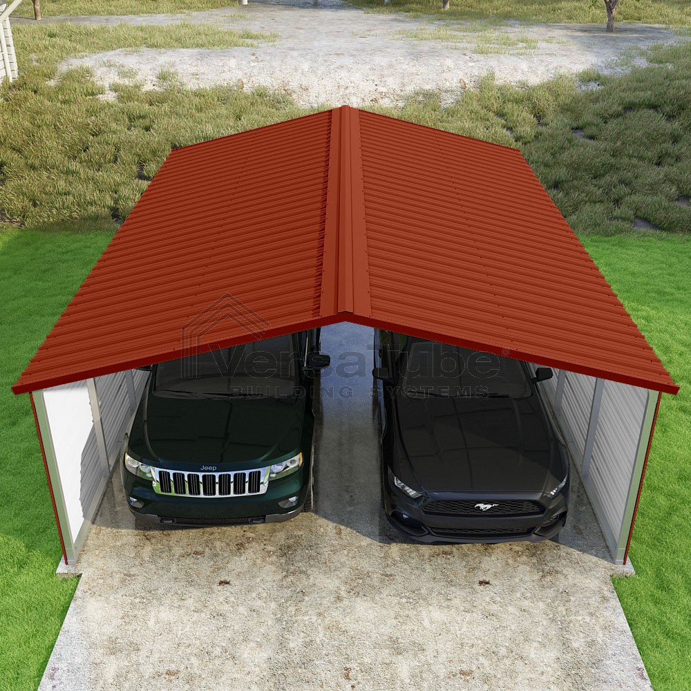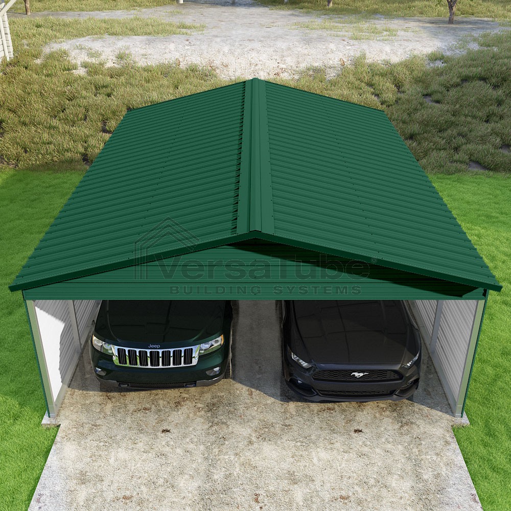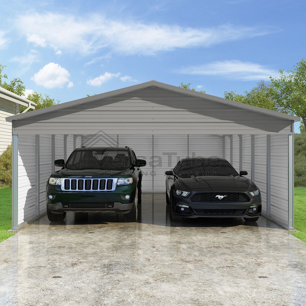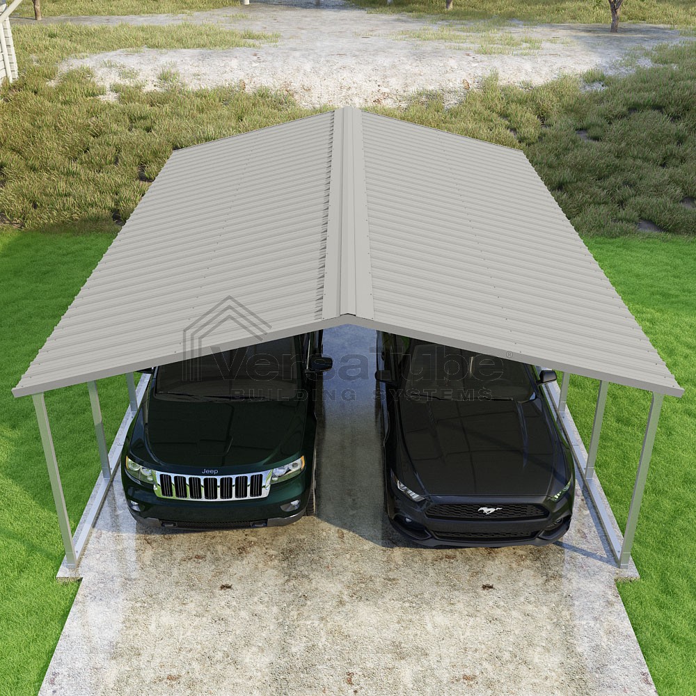 Pinnacle Series DIY carport kit features vertical sheet metal roof panels with ridge cap, gable and eave trim for an A-frame roof style and extended coverage on both ends.
