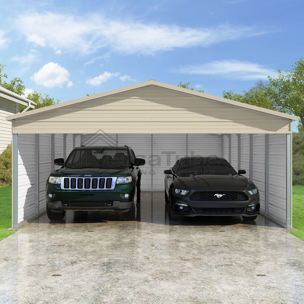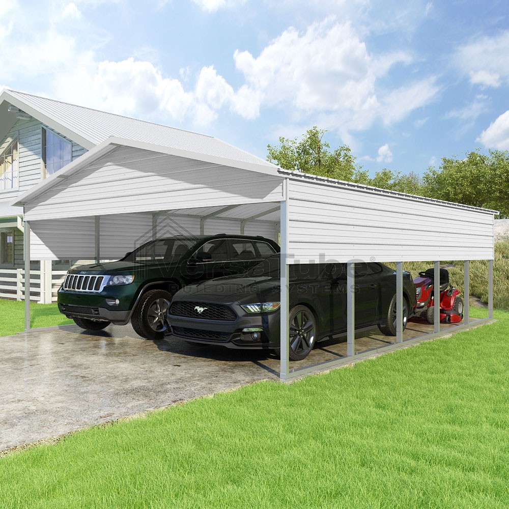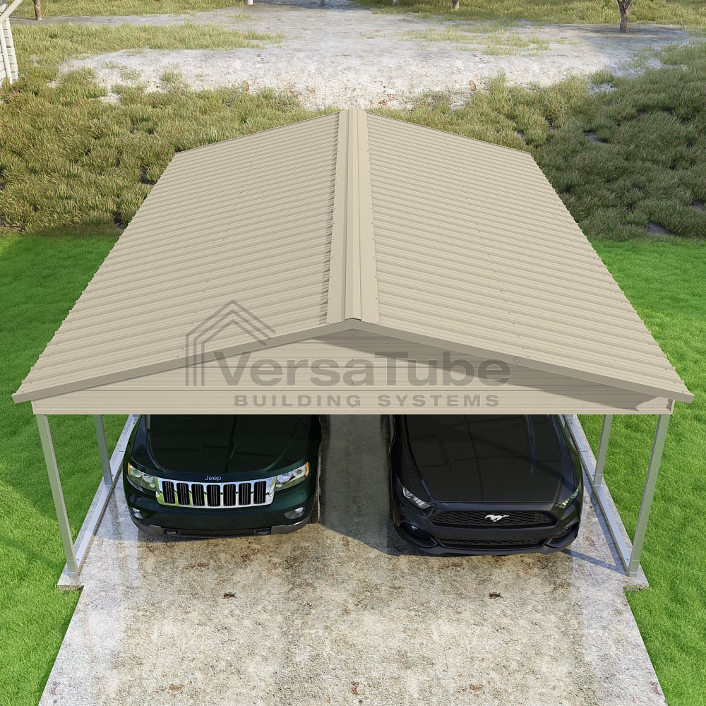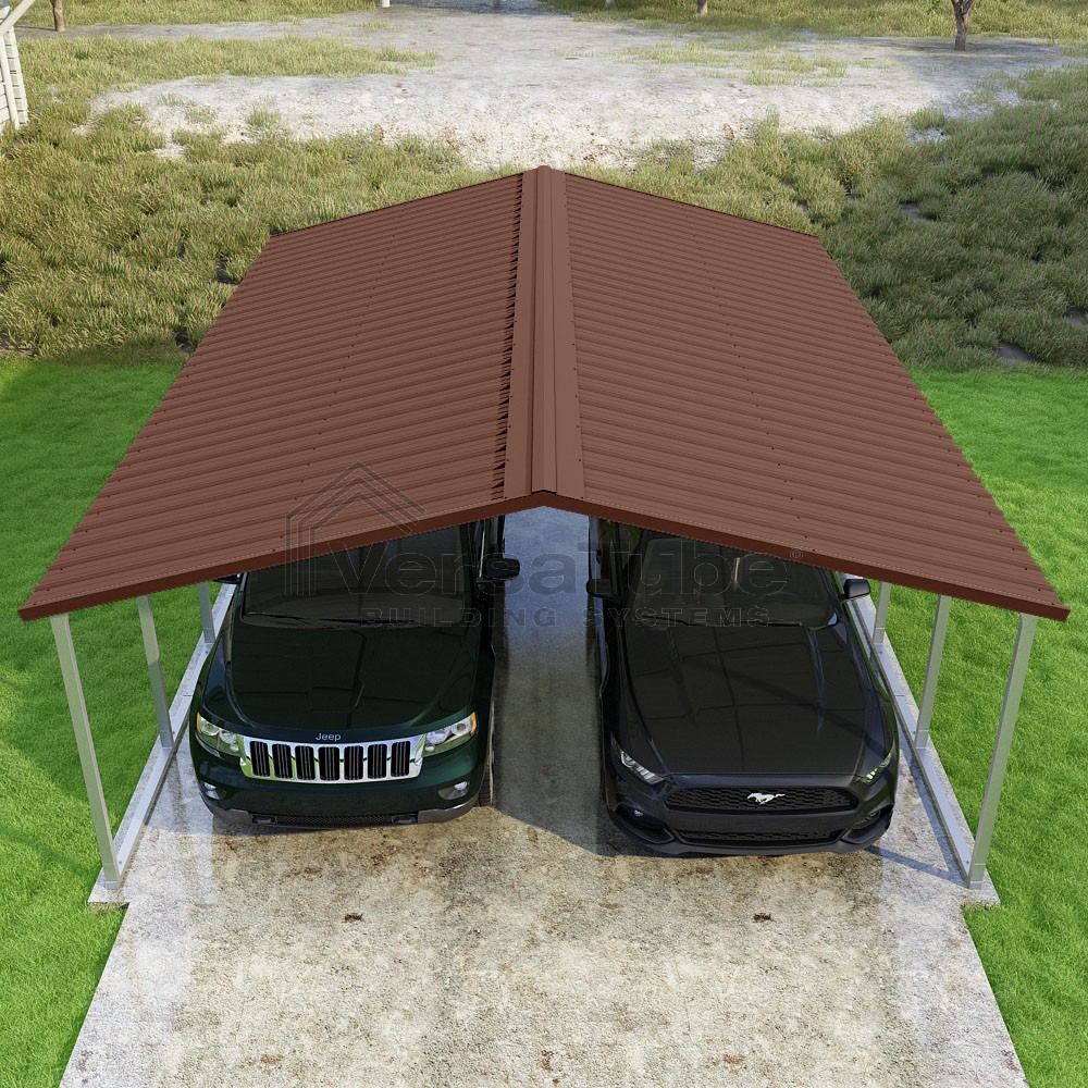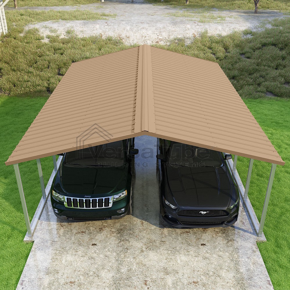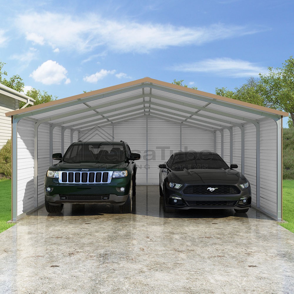 Pinnacle Series DIY carport kit features vertical sheet metal roof panels with ridge cap, gable and eave trim for an A-frame roof style and extended coverage on both ends.