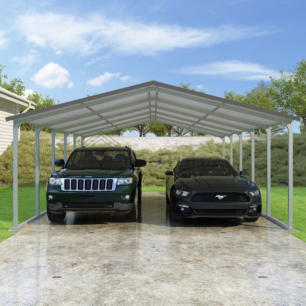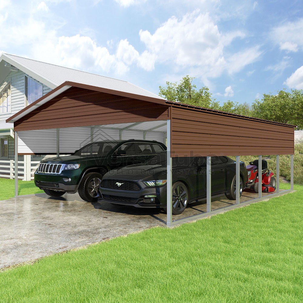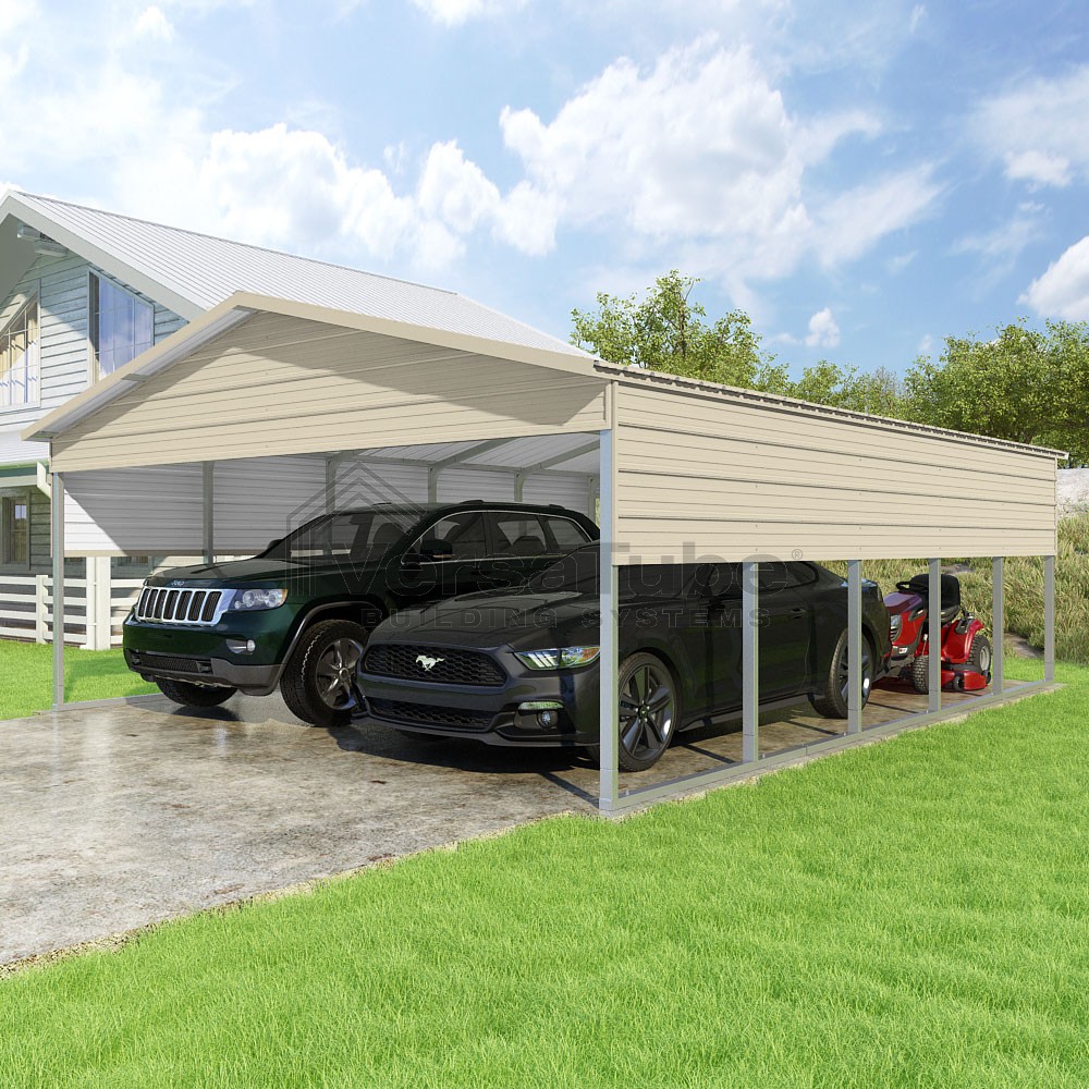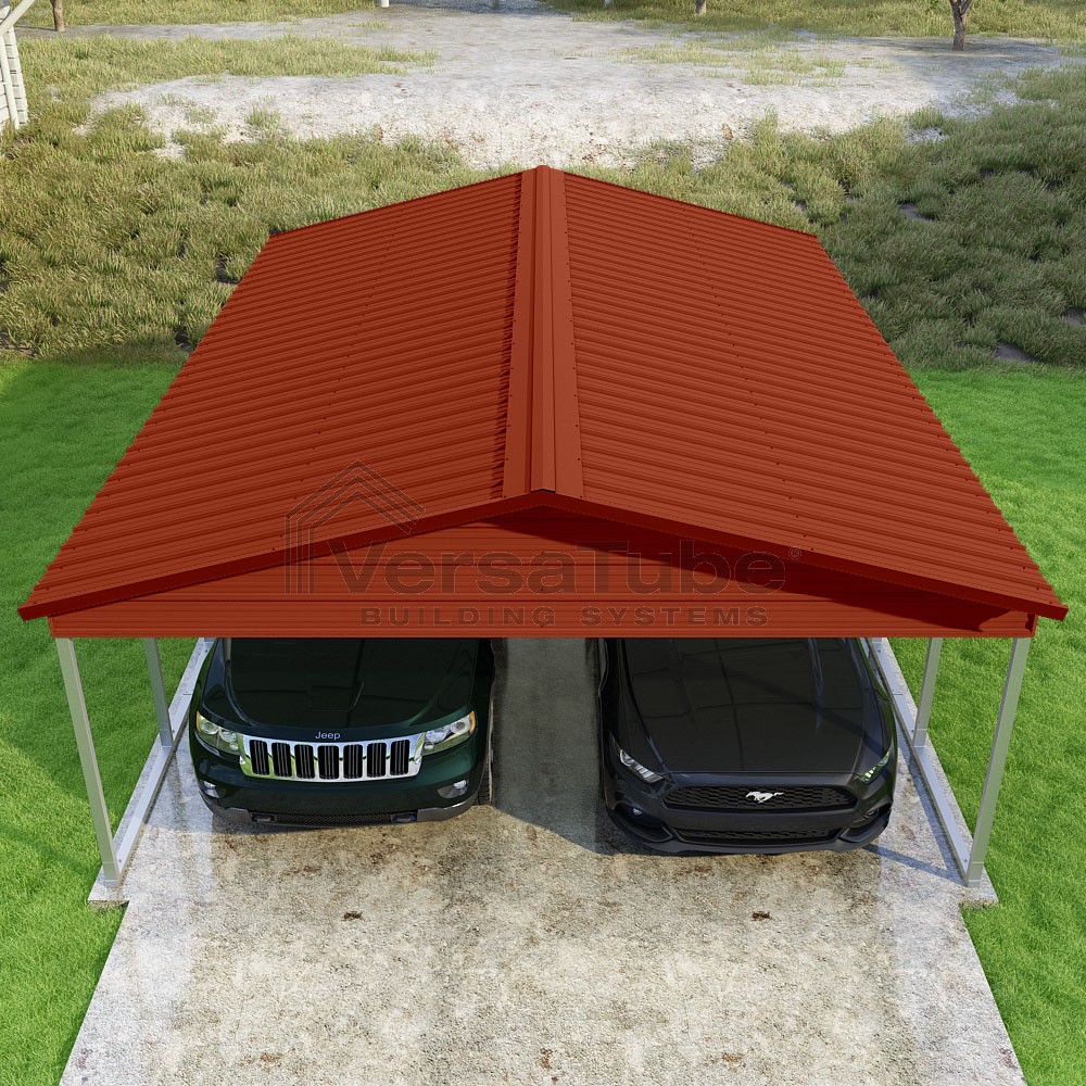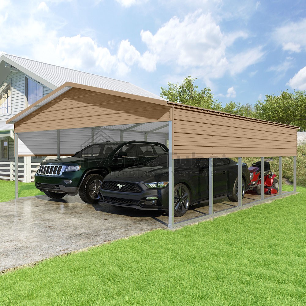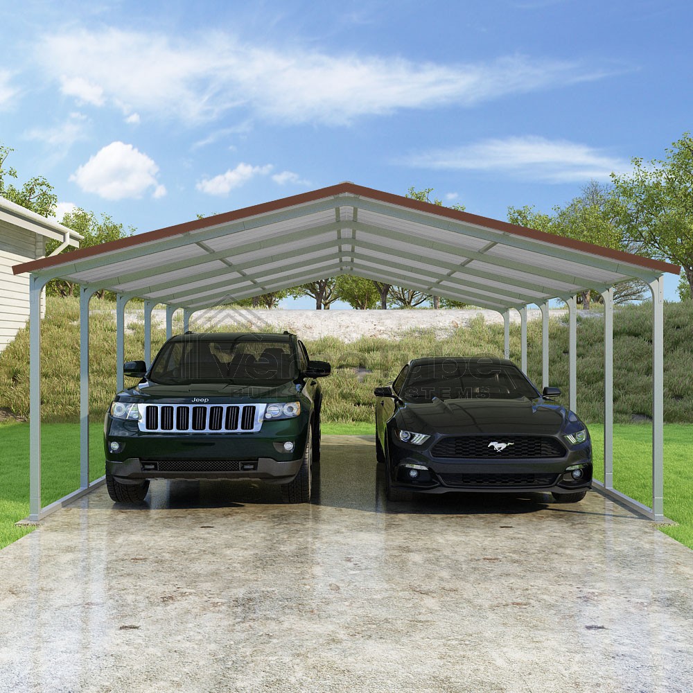 Pinnacle Series DIY carport kit features vertical sheet metal roof panels with ridge cap, gable and eave trim for an A-frame roof style and extended coverage on both ends.