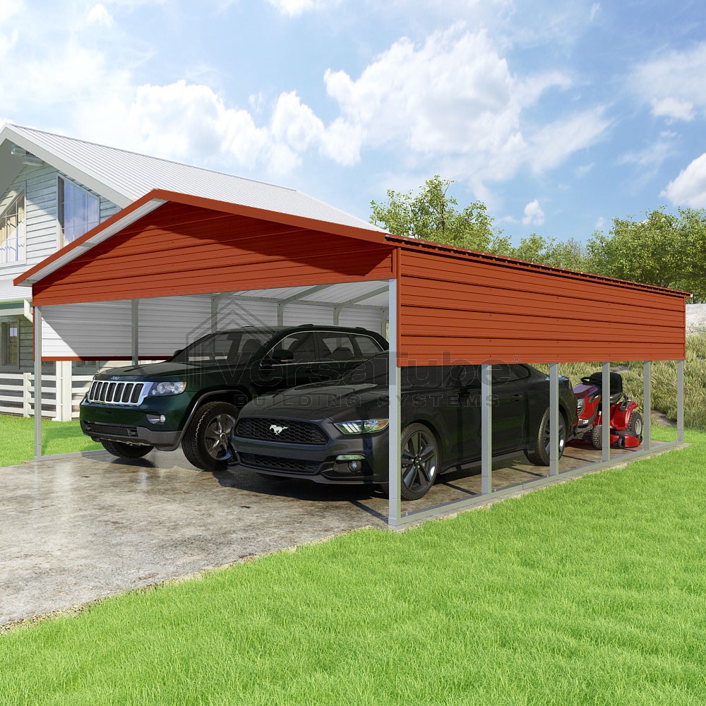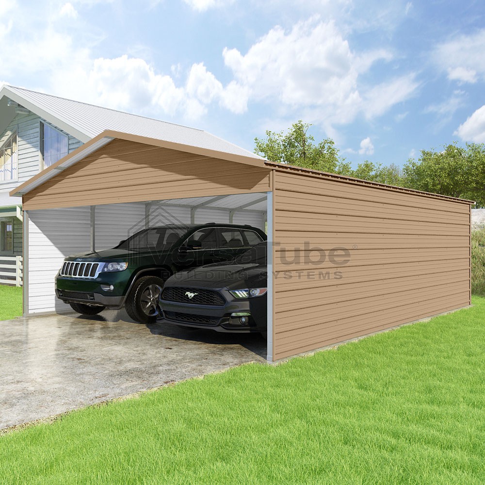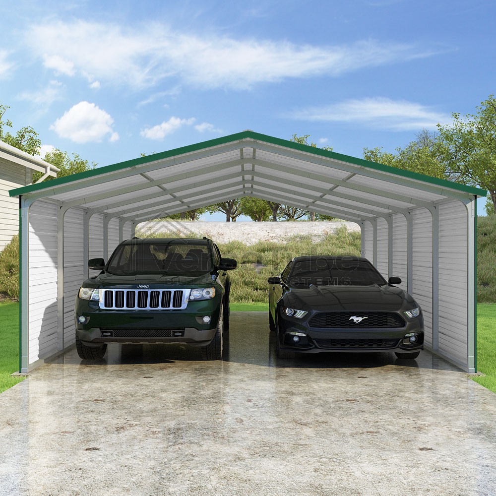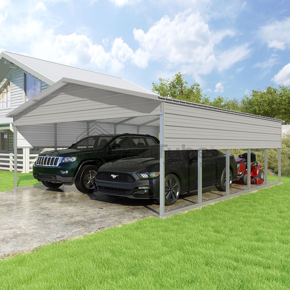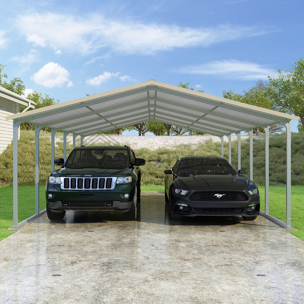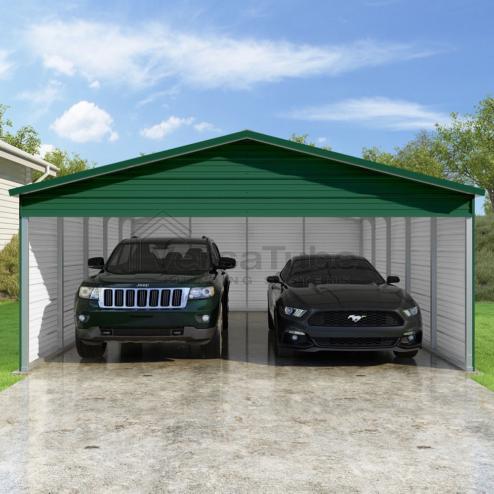 Pinnacle Series DIY carport kit features vertical sheet metal roof panels with ridge cap, gable and eave trim for an A-frame roof style and extended coverage on both ends.
