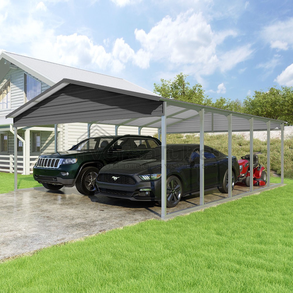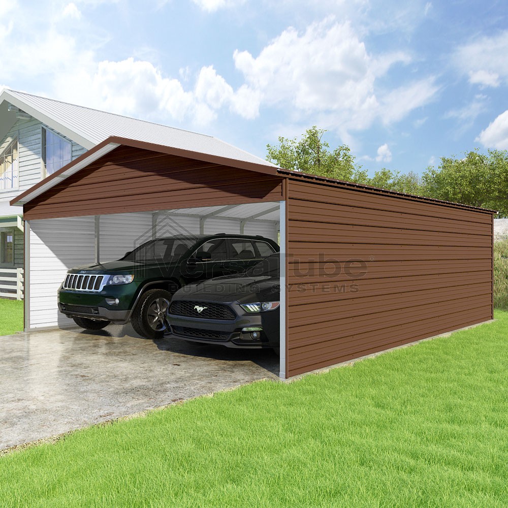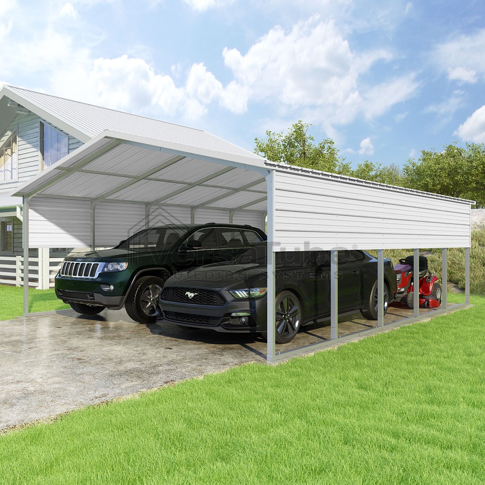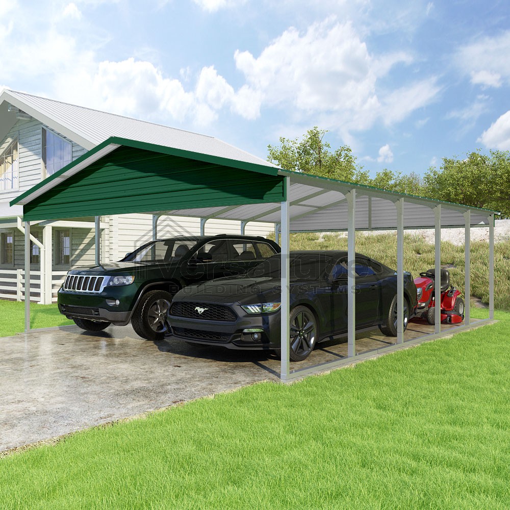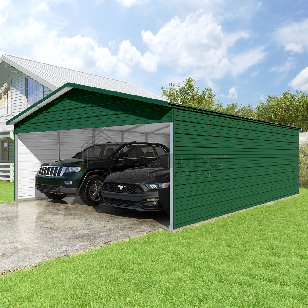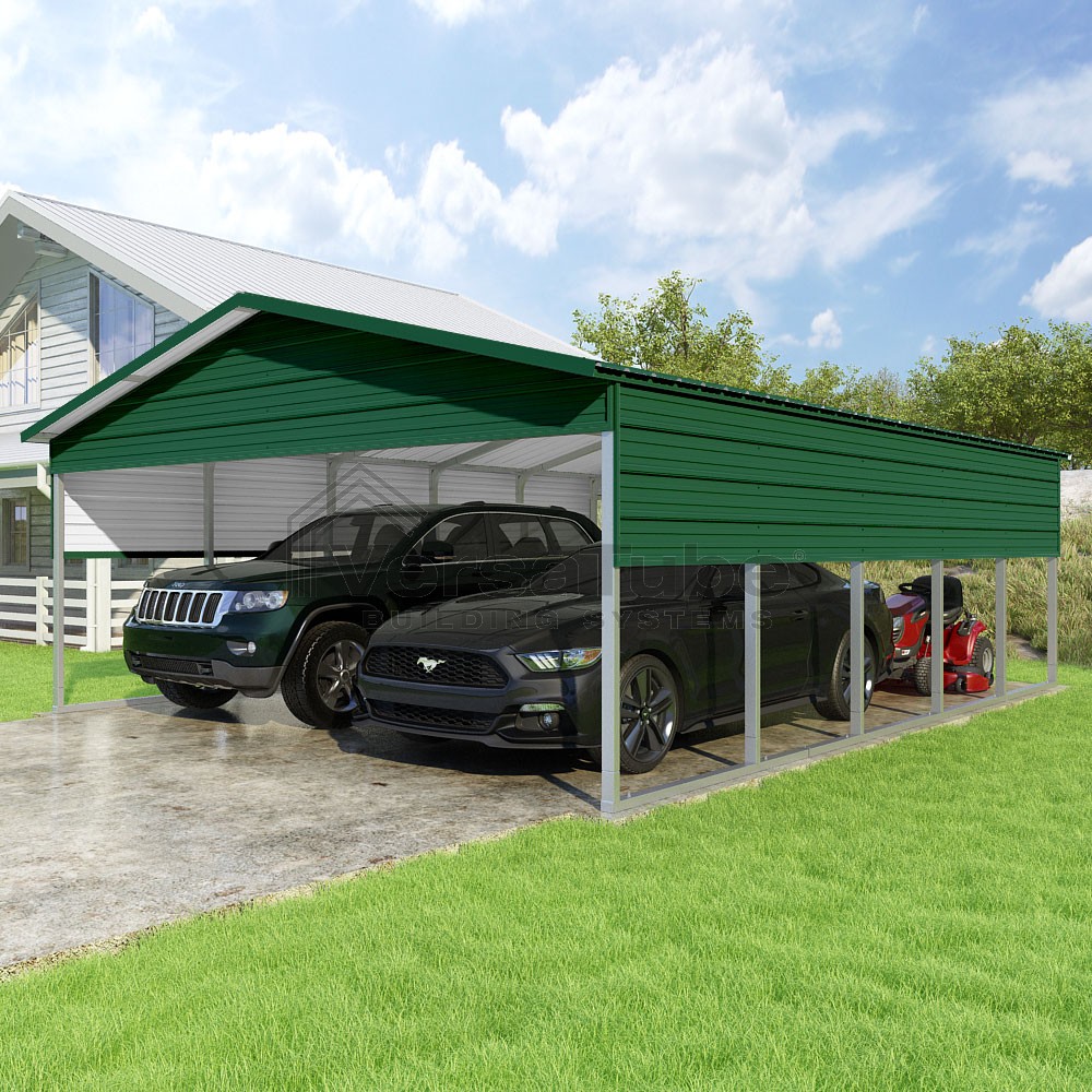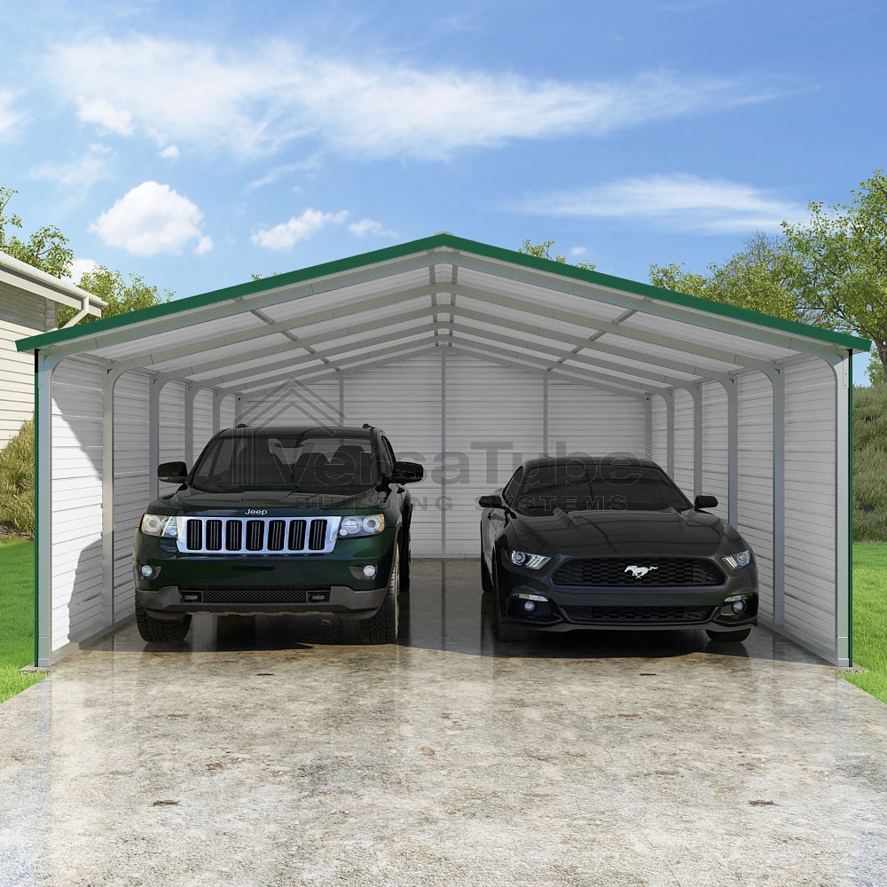 Pinnacle Series DIY carport kit features vertical sheet metal roof panels with ridge cap, gable and eave trim for an A-frame roof style and extended coverage on both ends.