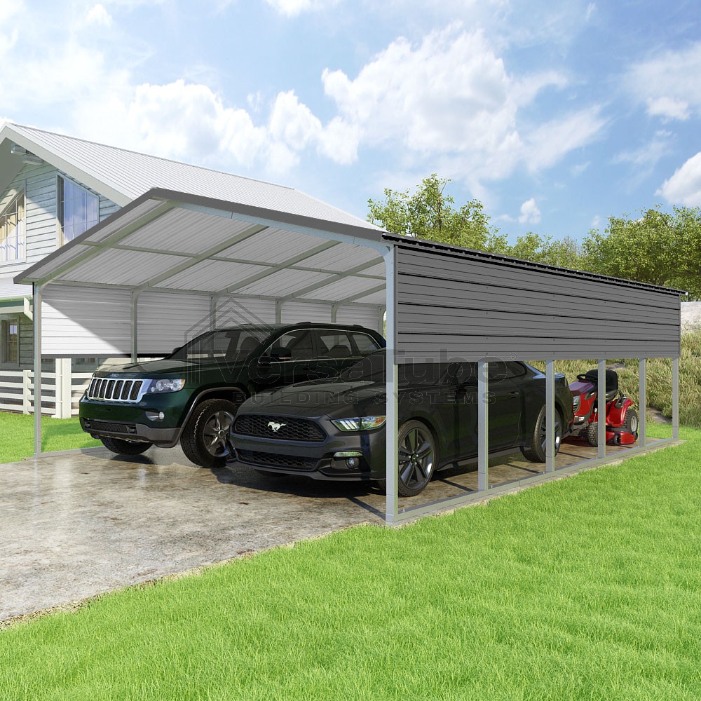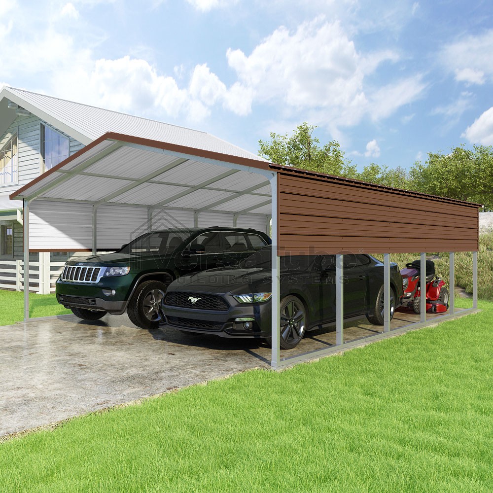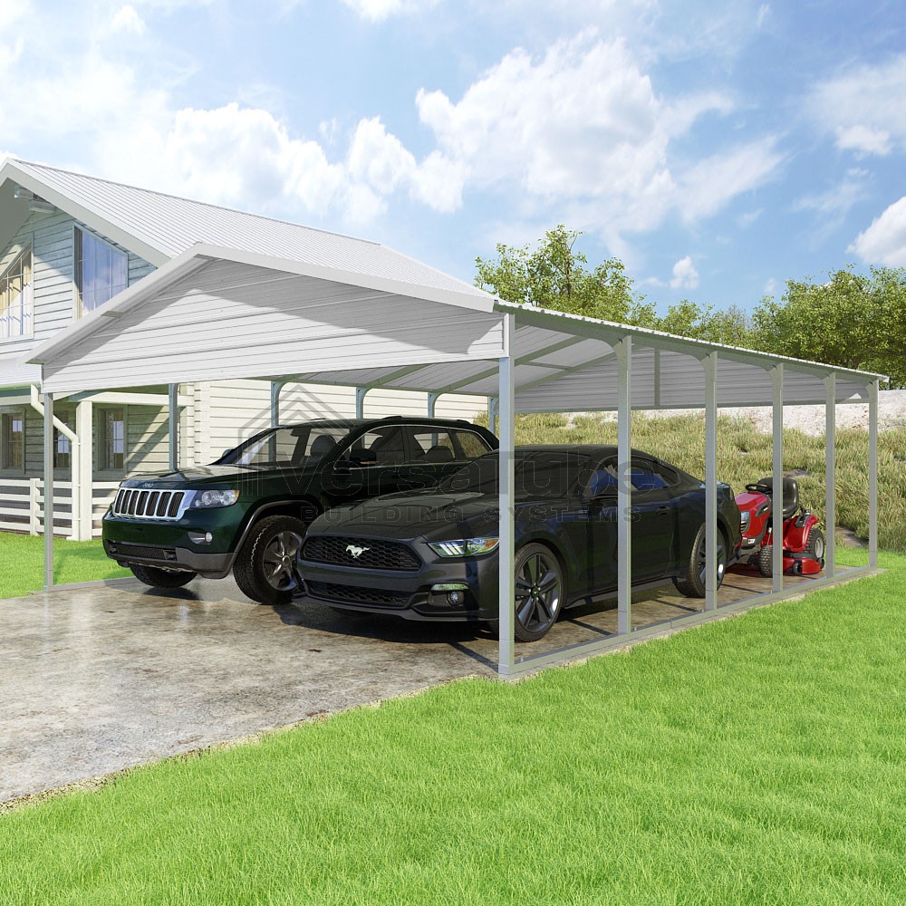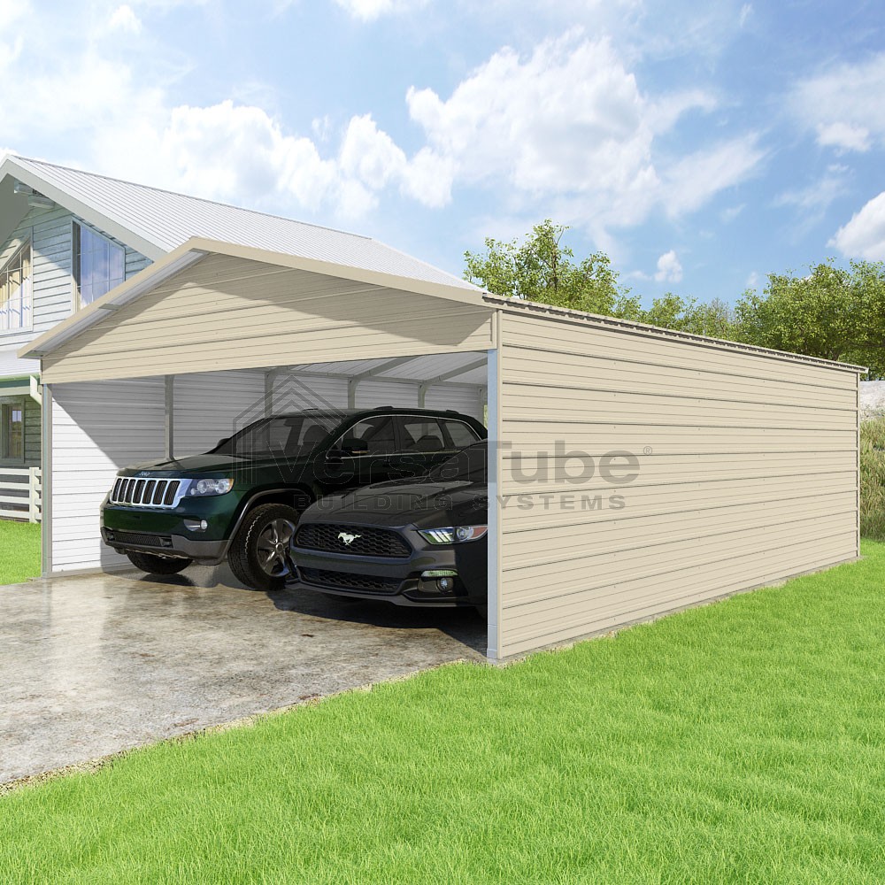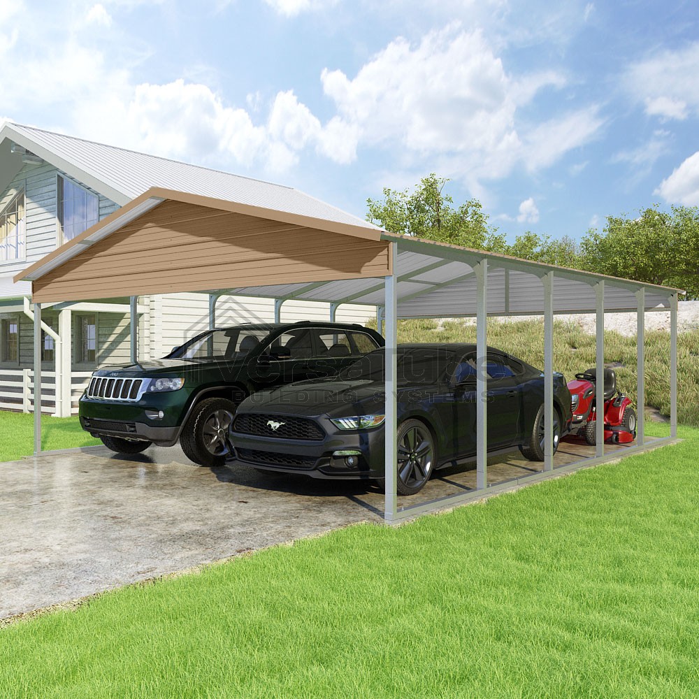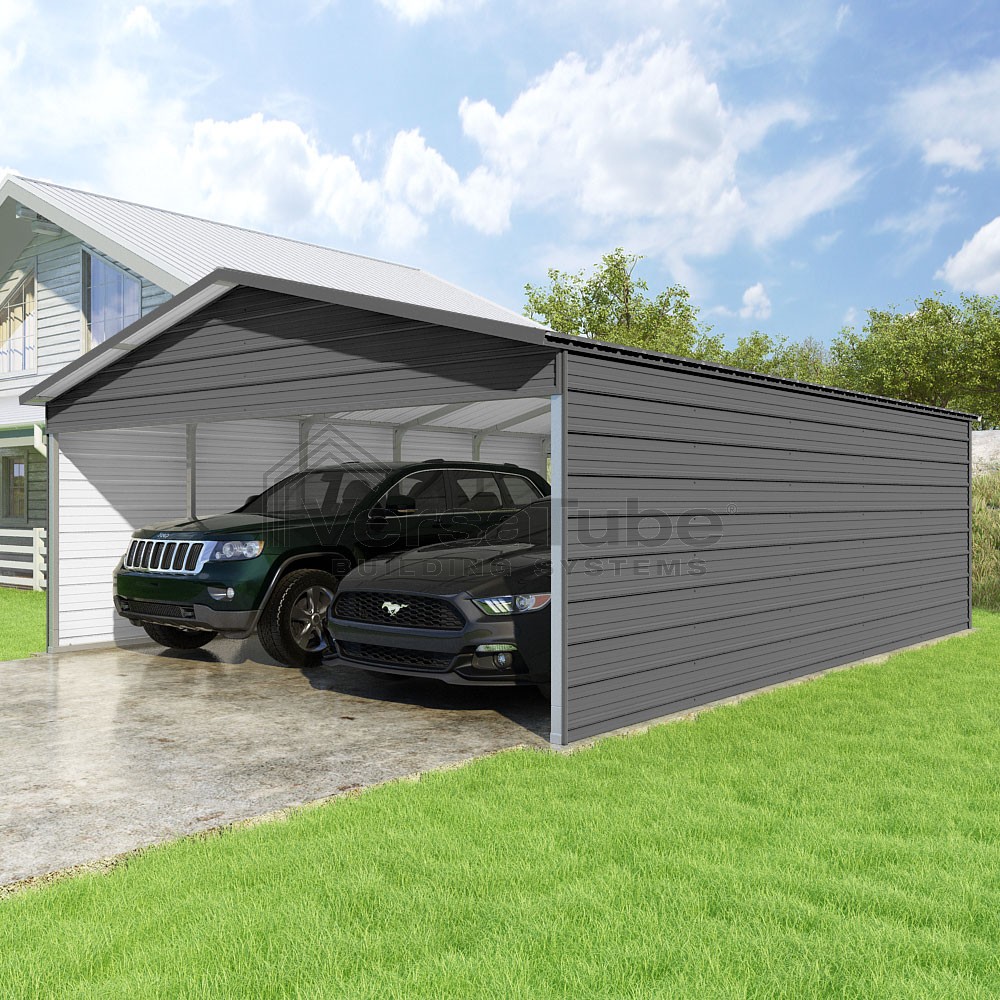 Pinnacle Series DIY carport kit features vertical sheet metal roof panels with ridge cap, gable and eave trim for an A-frame roof style and extended coverage on both ends.