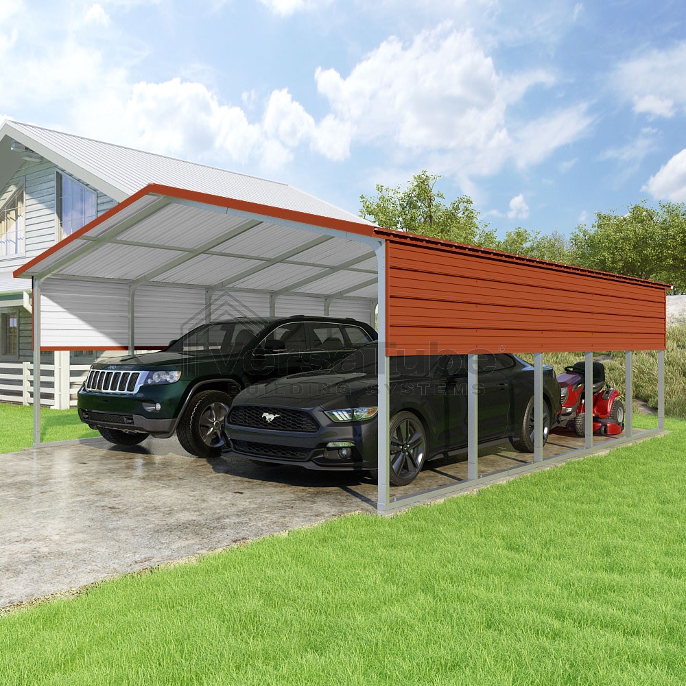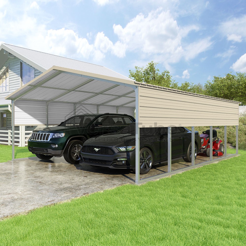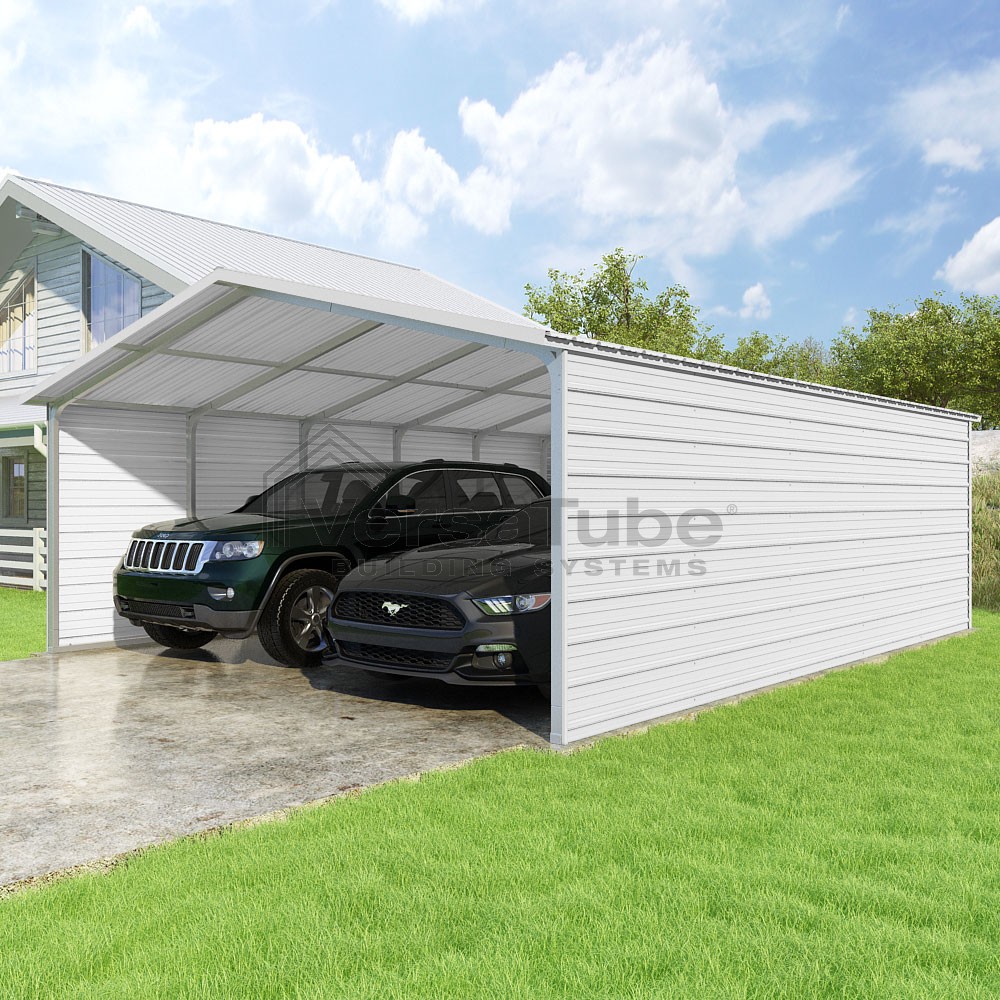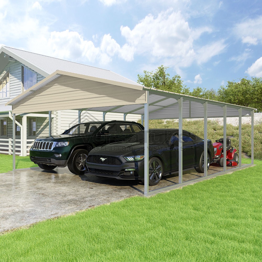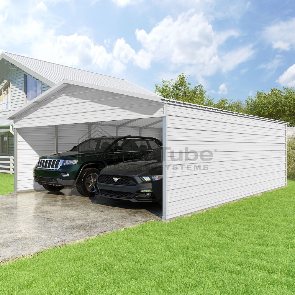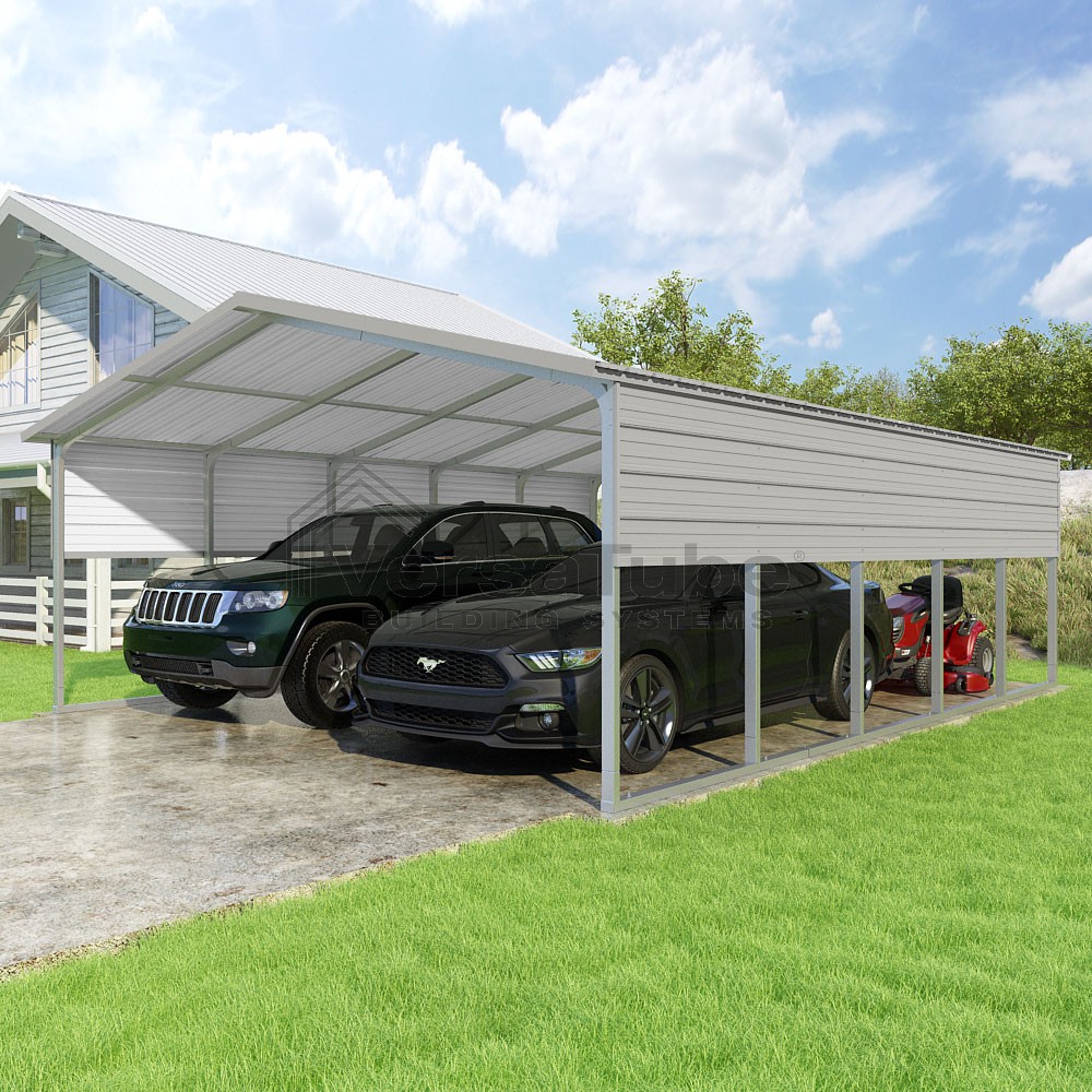Pinnacle Series DIY carport kit features vertical sheet metal roof panels with ridge cap, gable and eave trim for an A-frame roof style and extended coverage on both ends.