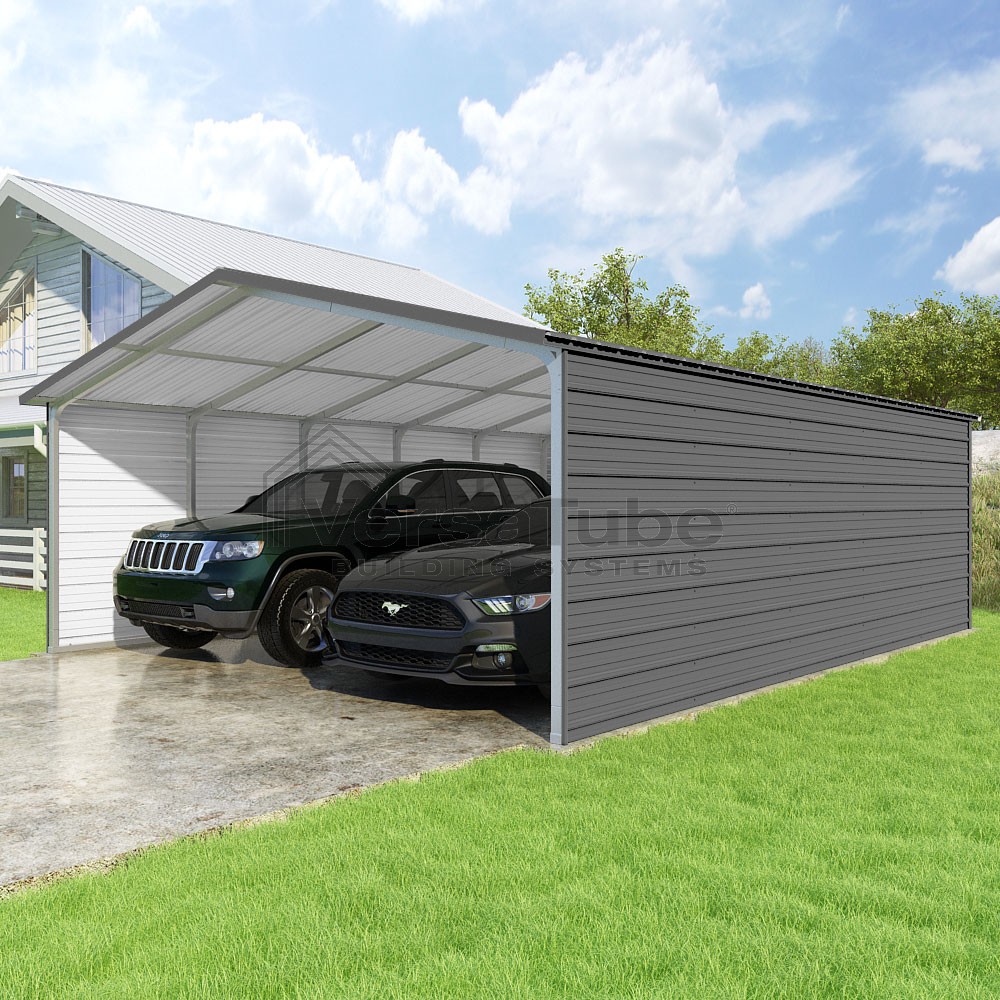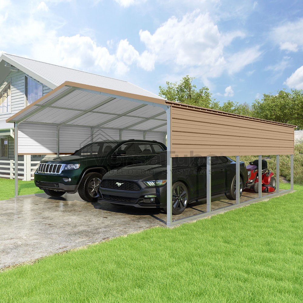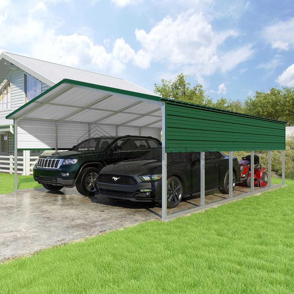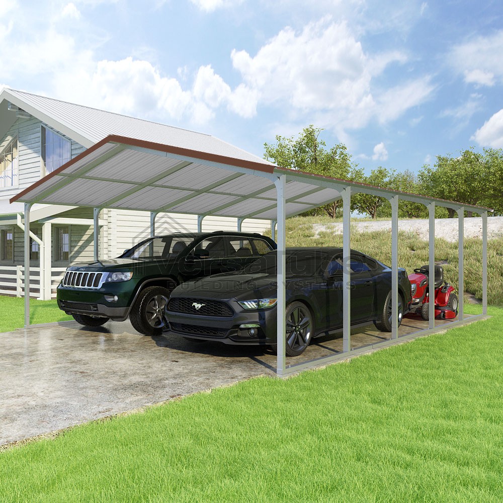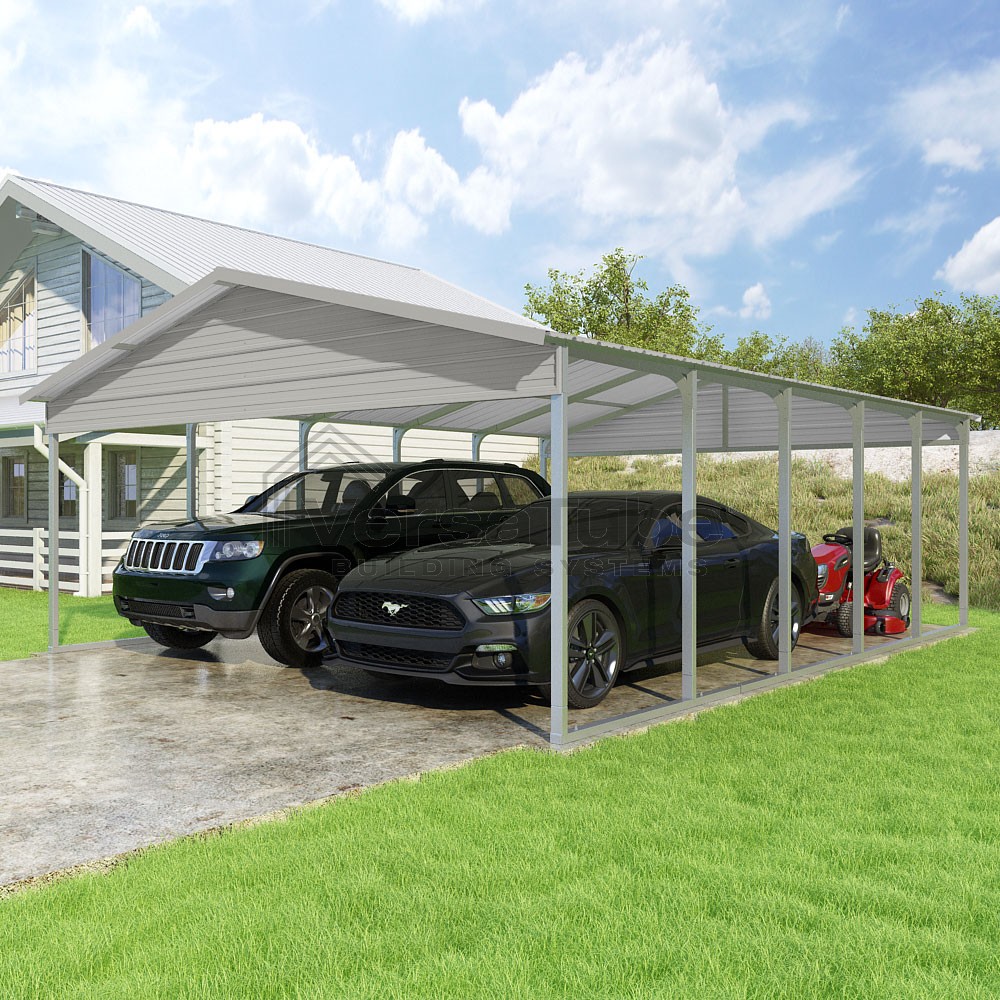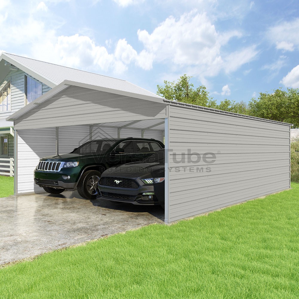 Pinnacle Series DIY carport kit features vertical sheet metal roof panels with ridge cap, gable and eave trim for an A-frame roof style and extended coverage on both ends.