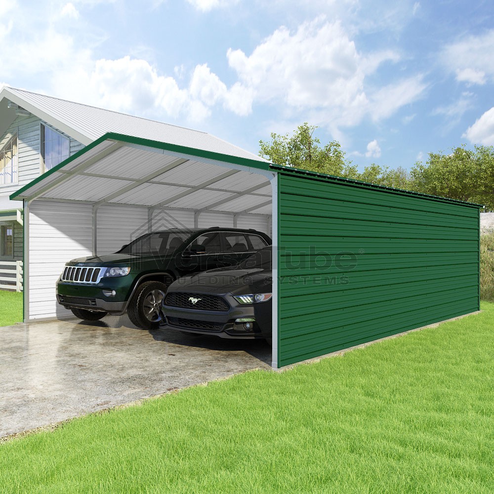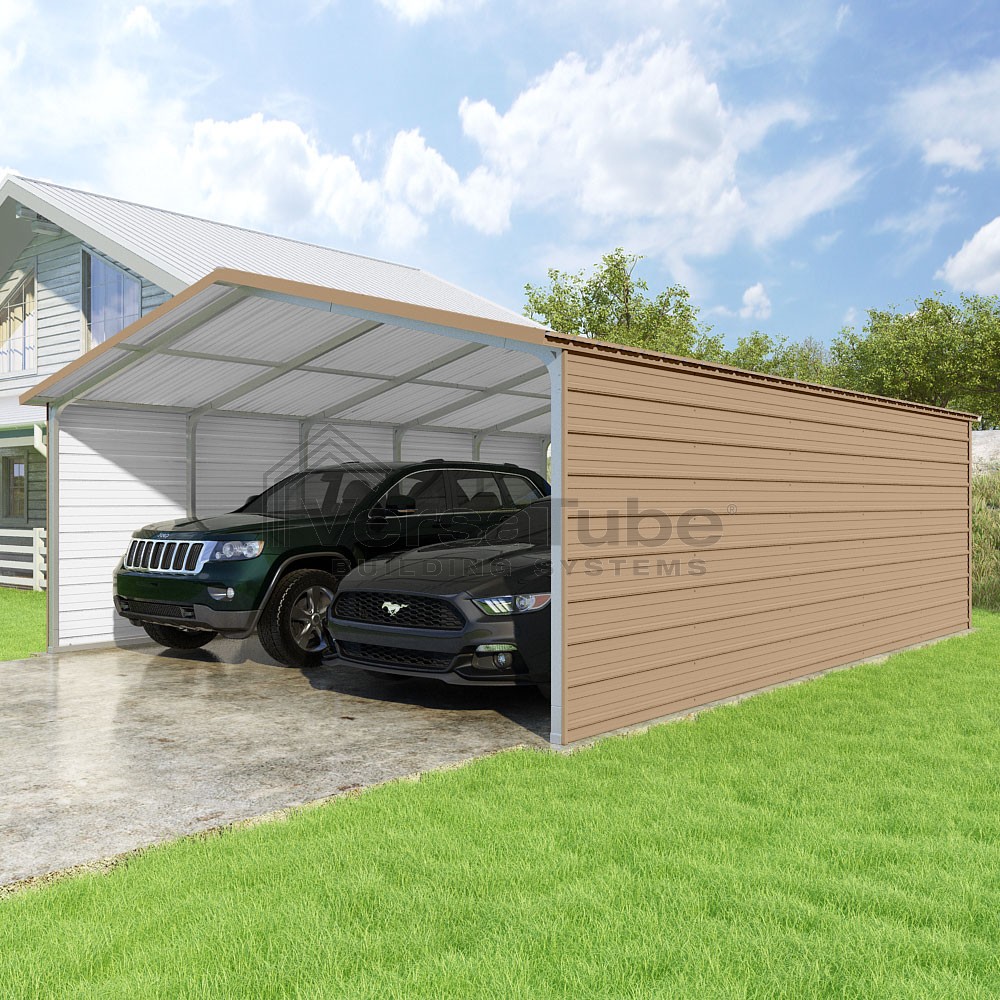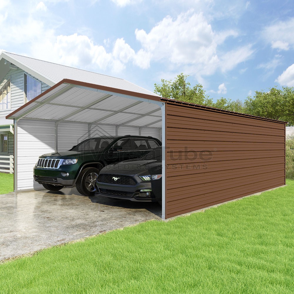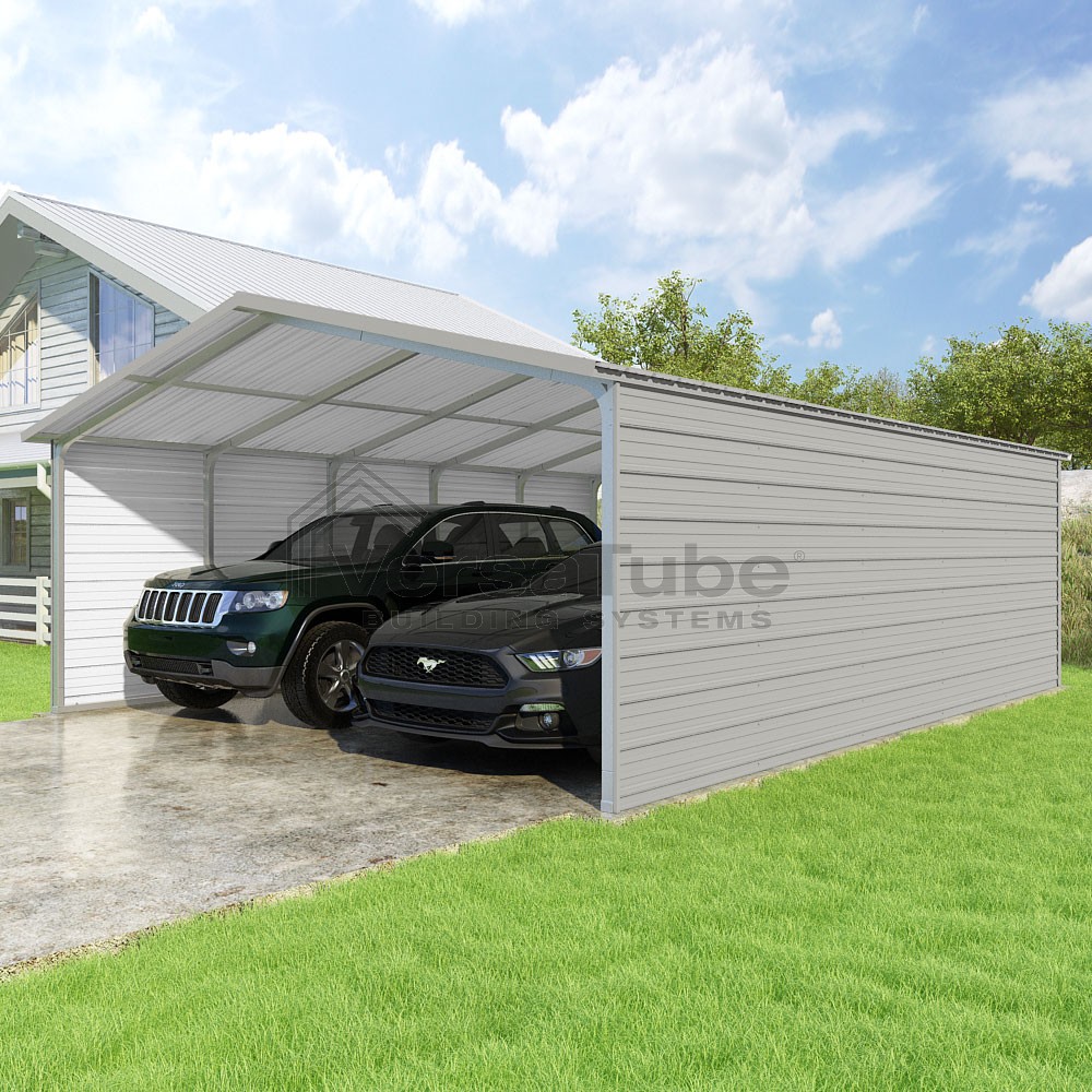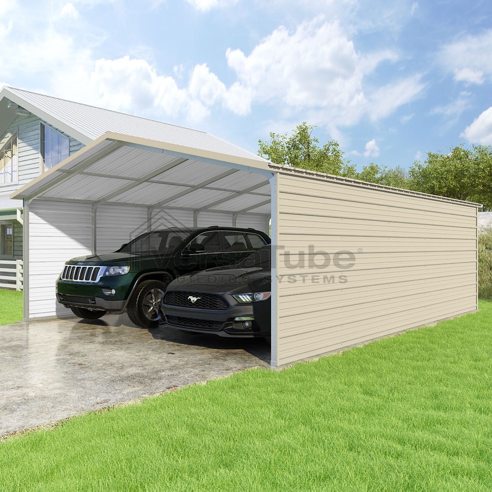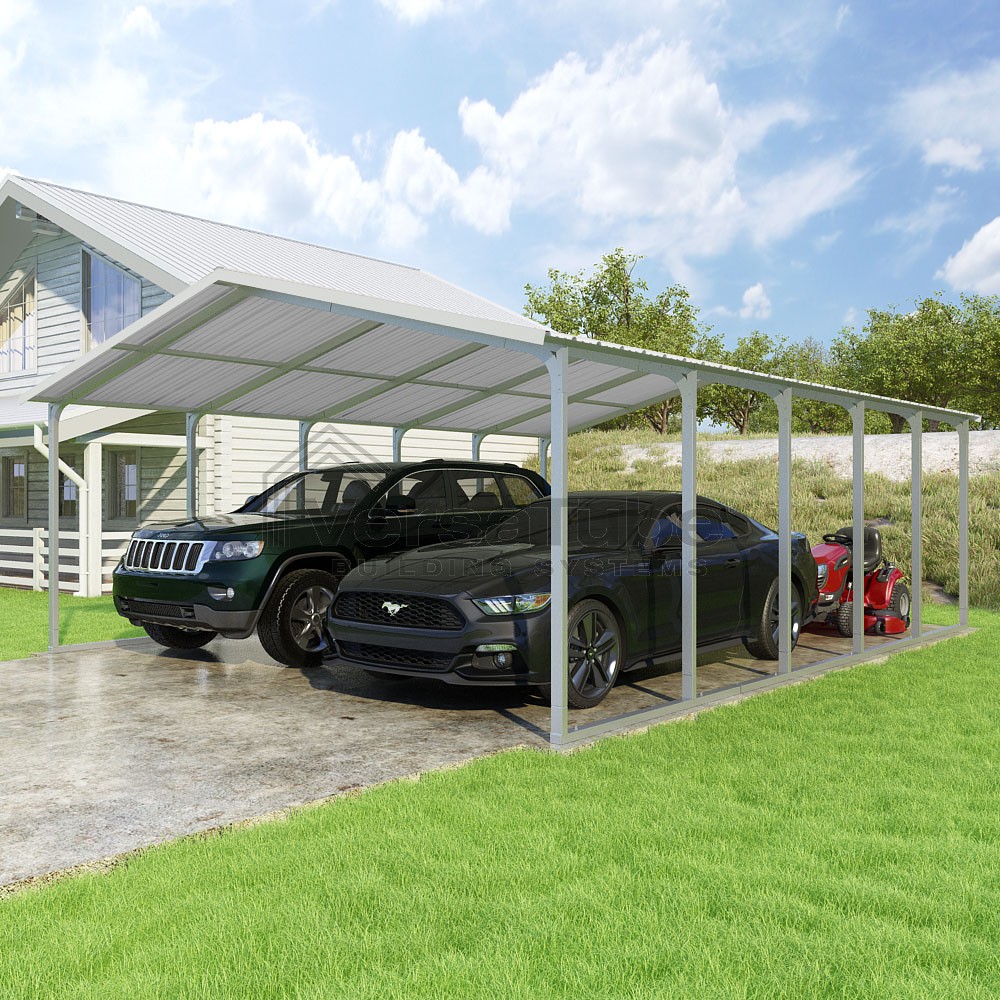 Pinnacle Series DIY carport kit features vertical sheet metal roof panels with ridge cap, gable and eave trim for an A-frame roof style and extended coverage on both ends.