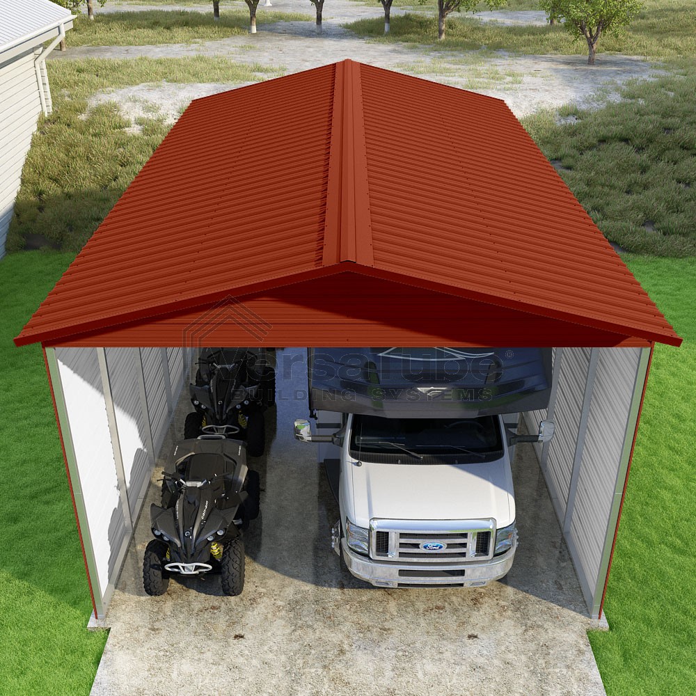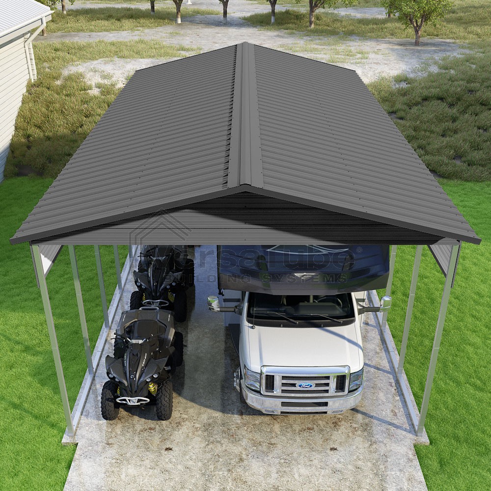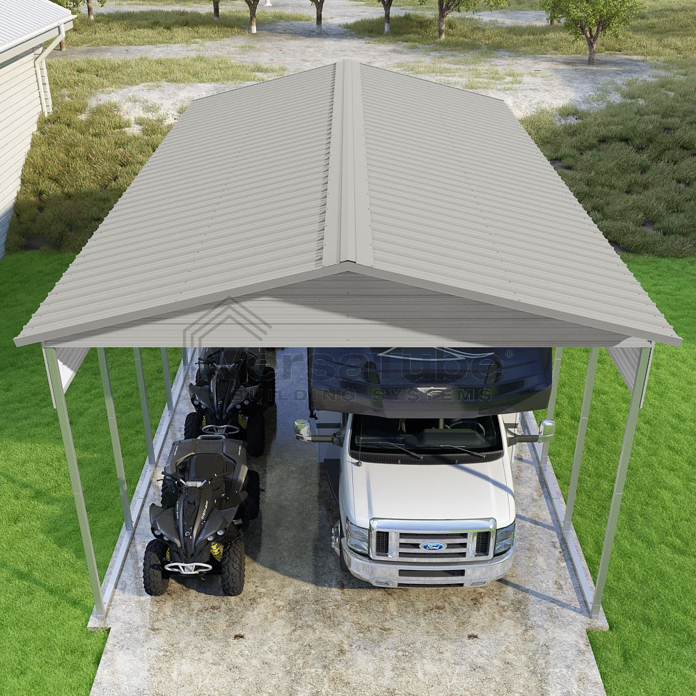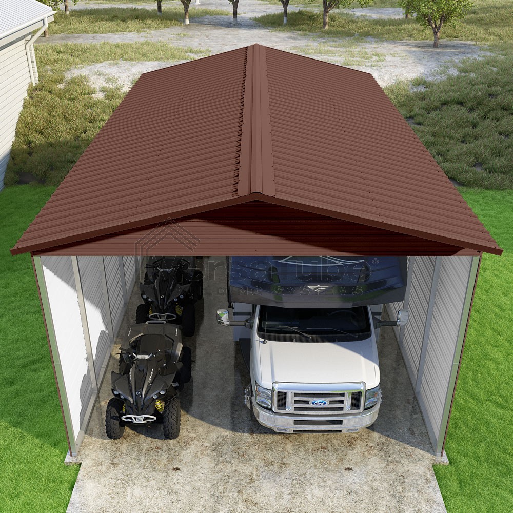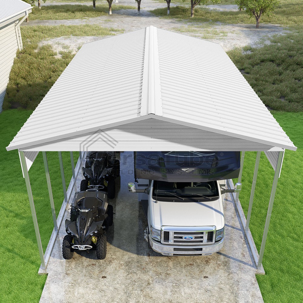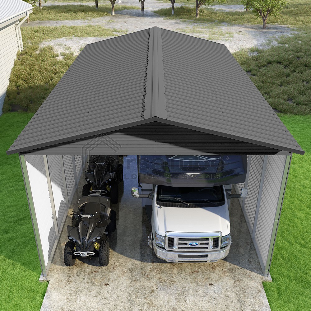 Pinnacle Series DIY carport kit features vertical sheet metal roof panels with ridge cap, gable and eave trim for an A-frame roof style and extended coverage on both ends.