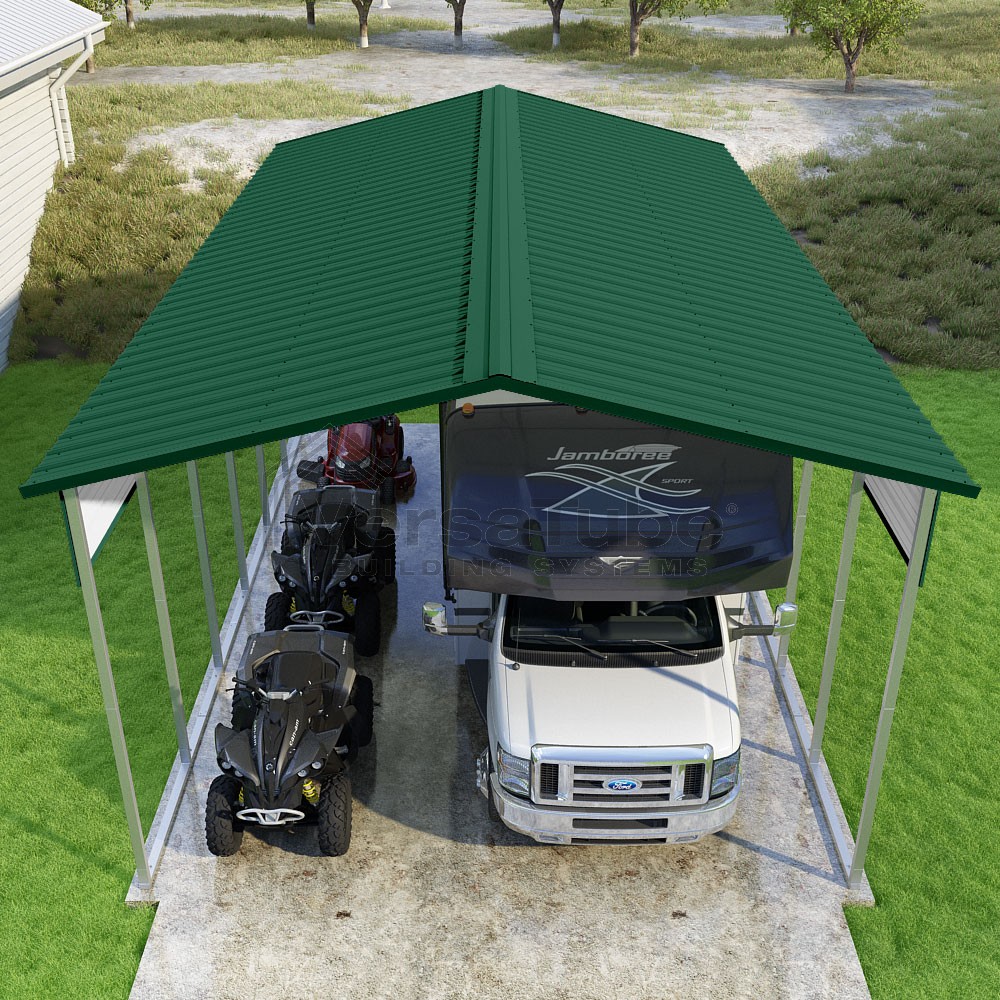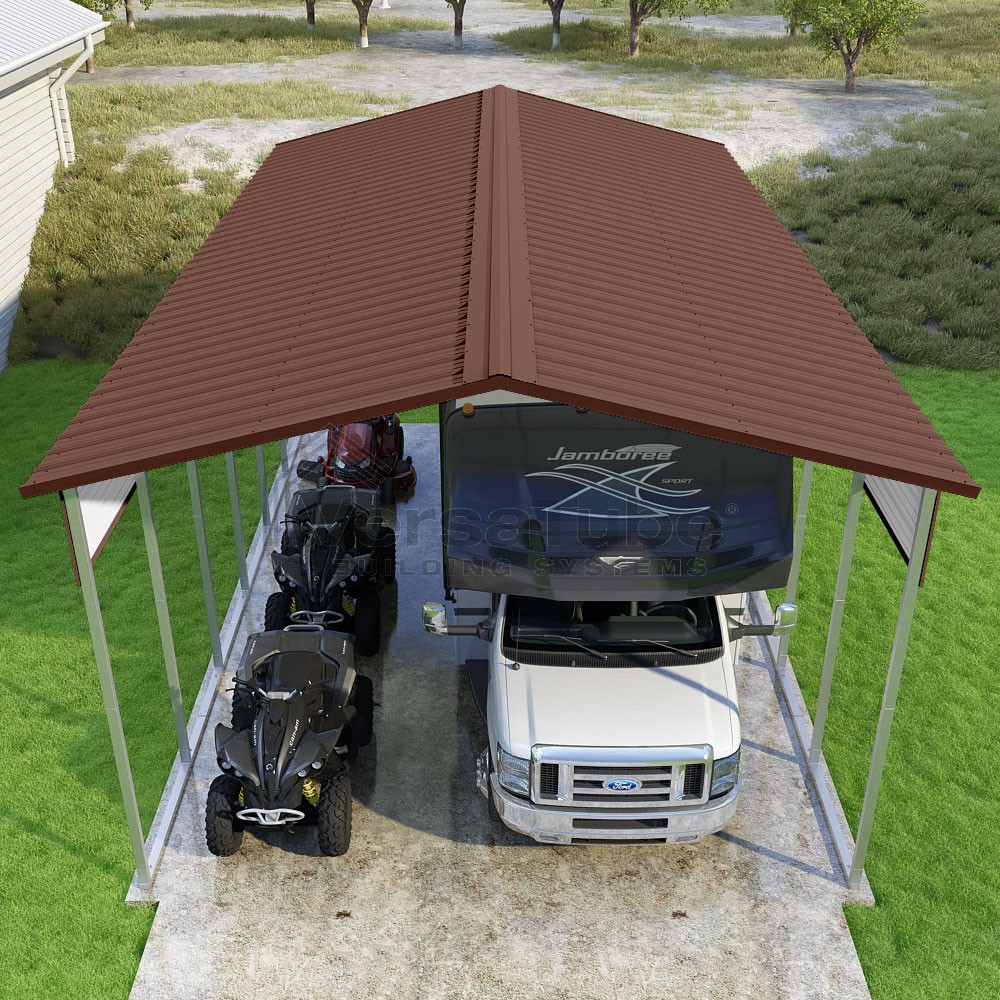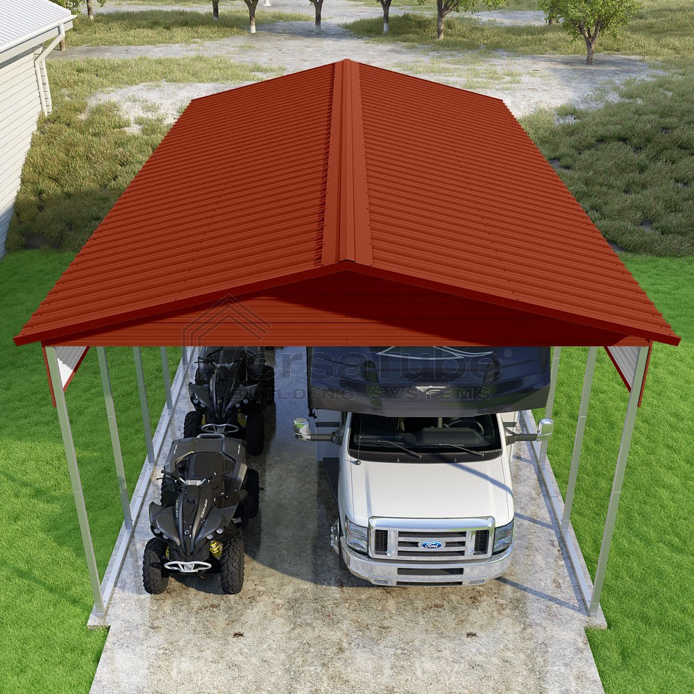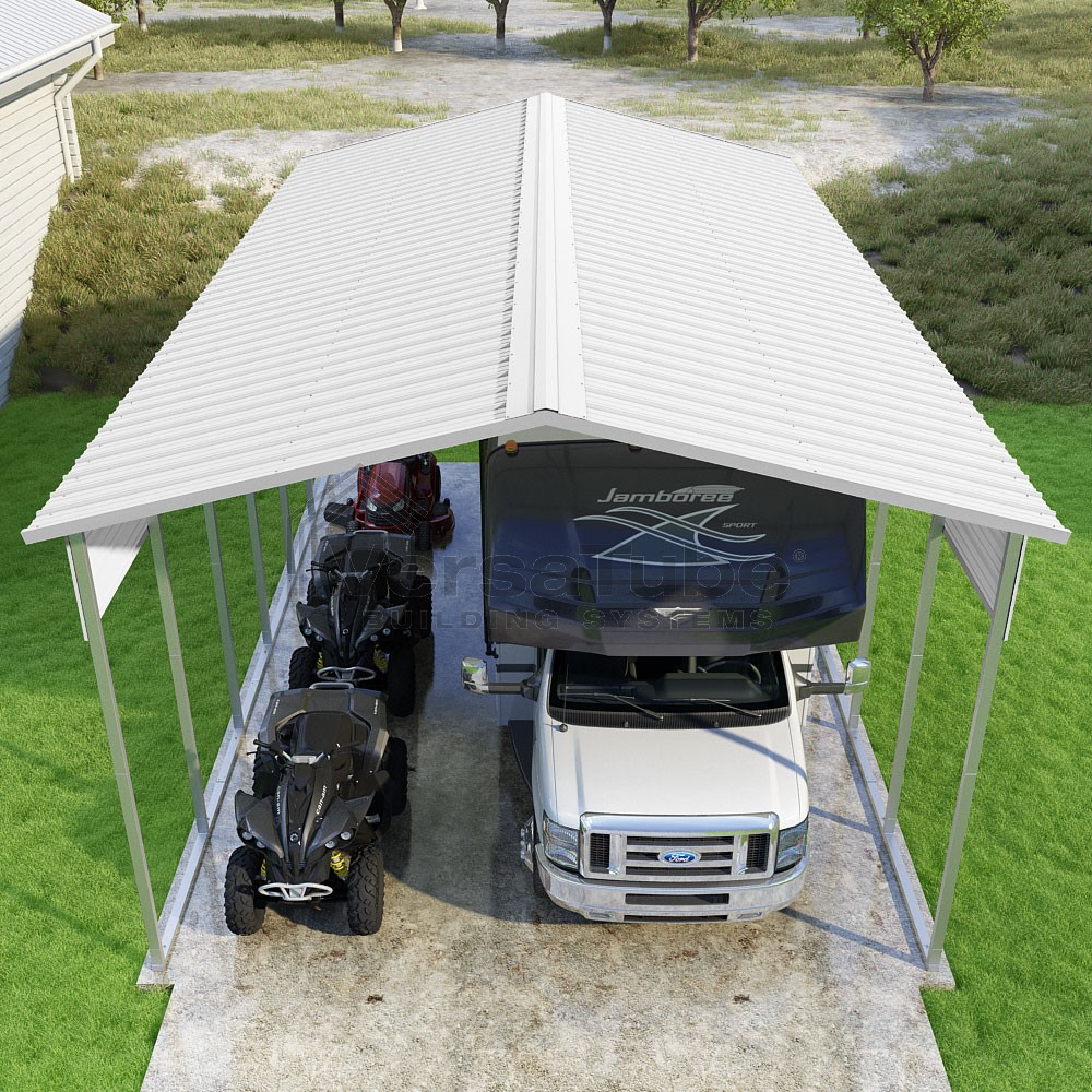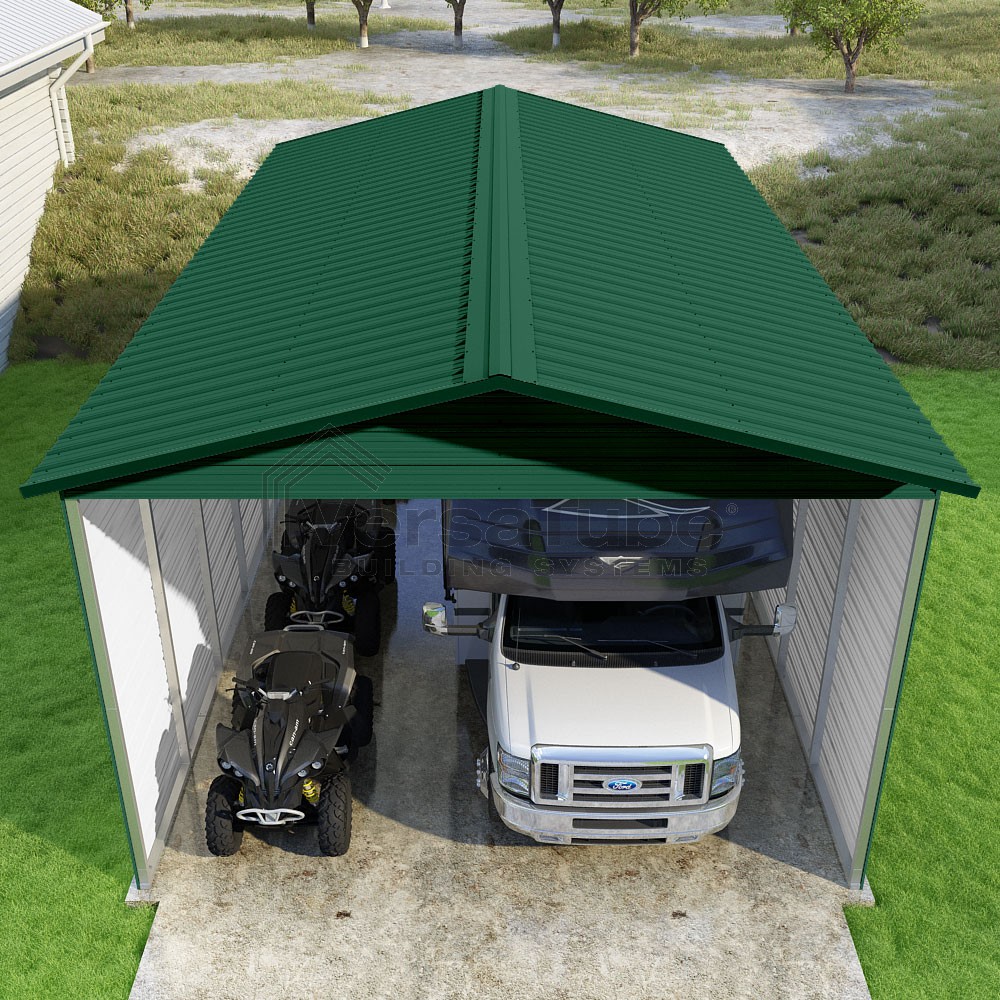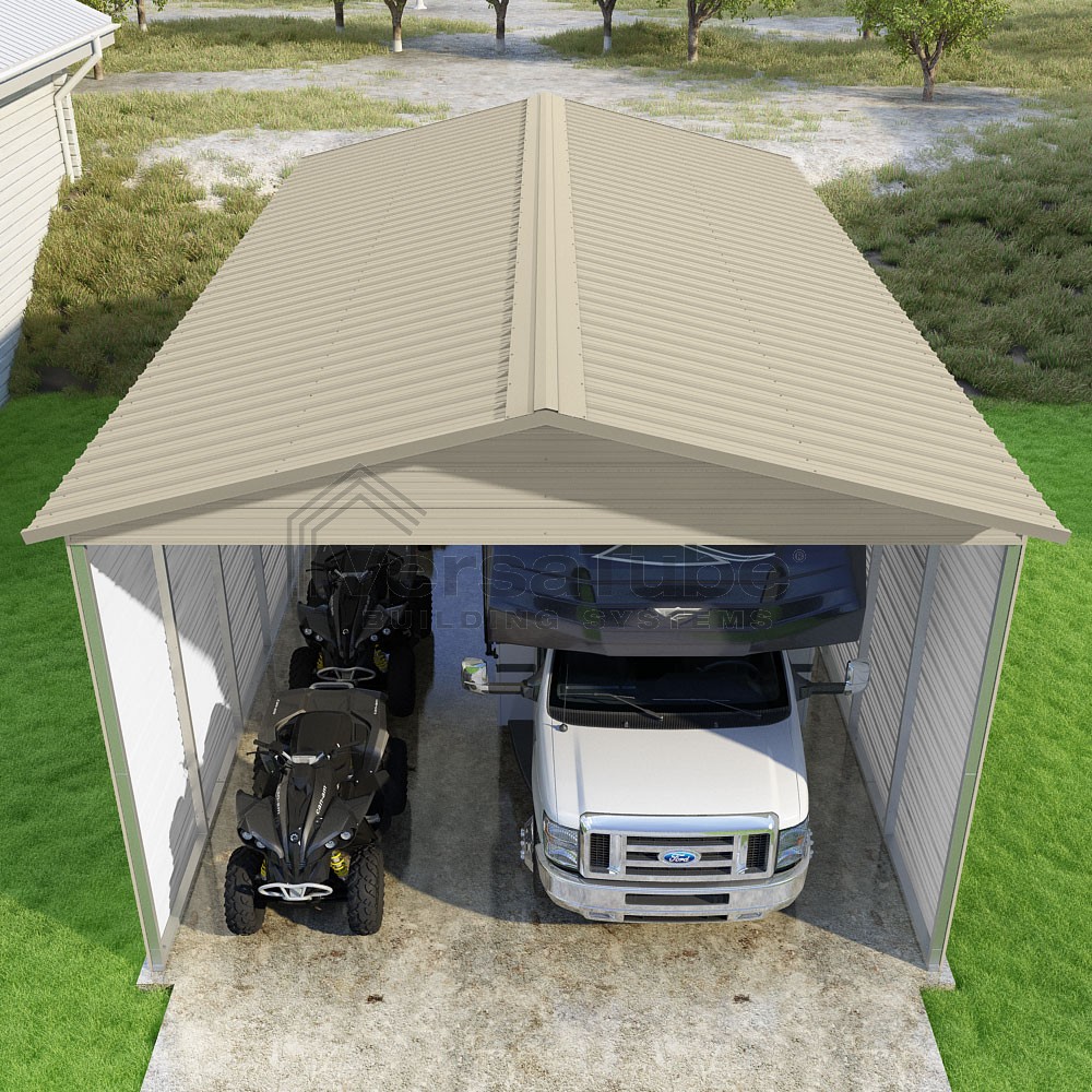 Pinnacle Series DIY carport kit features vertical sheet metal roof panels with ridge cap, gable and eave trim for an A-frame roof style and extended coverage on both ends.