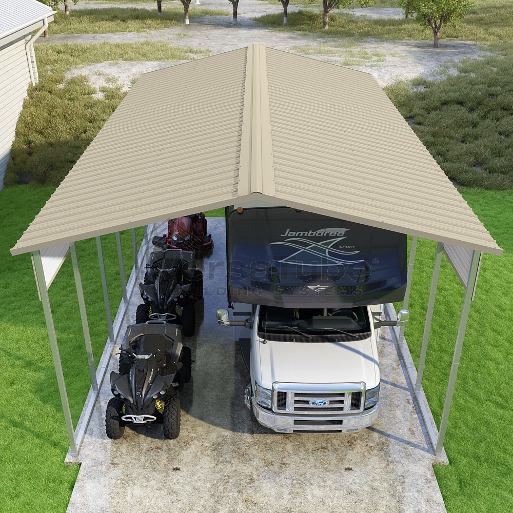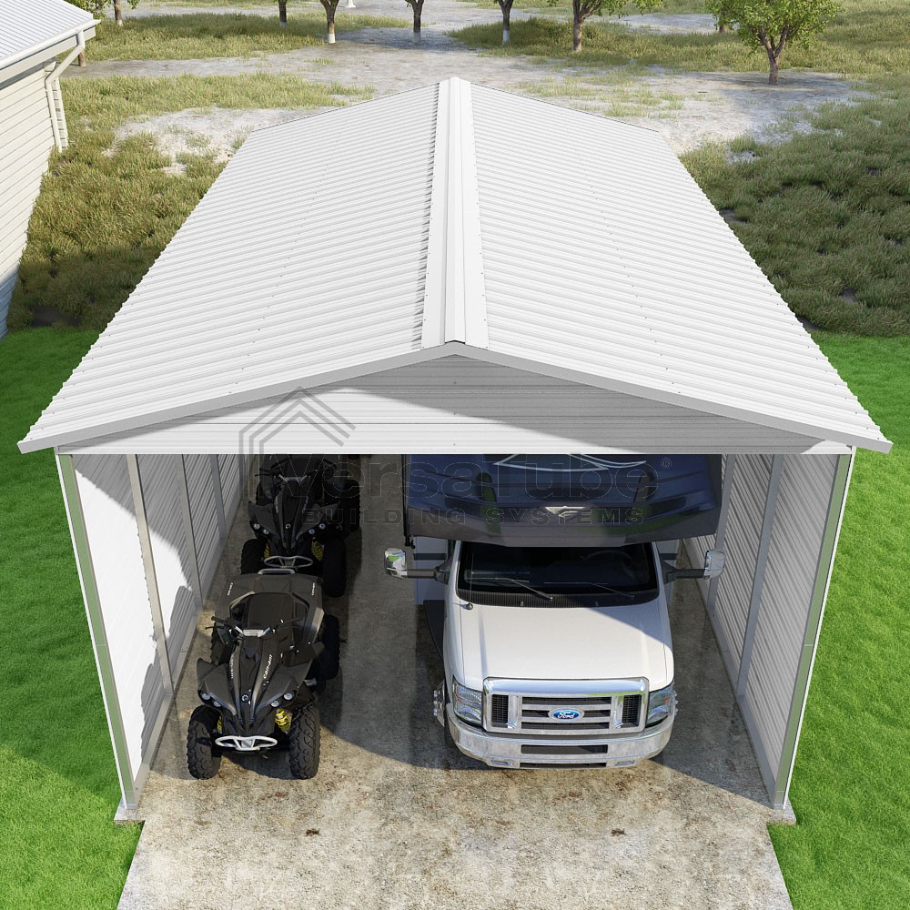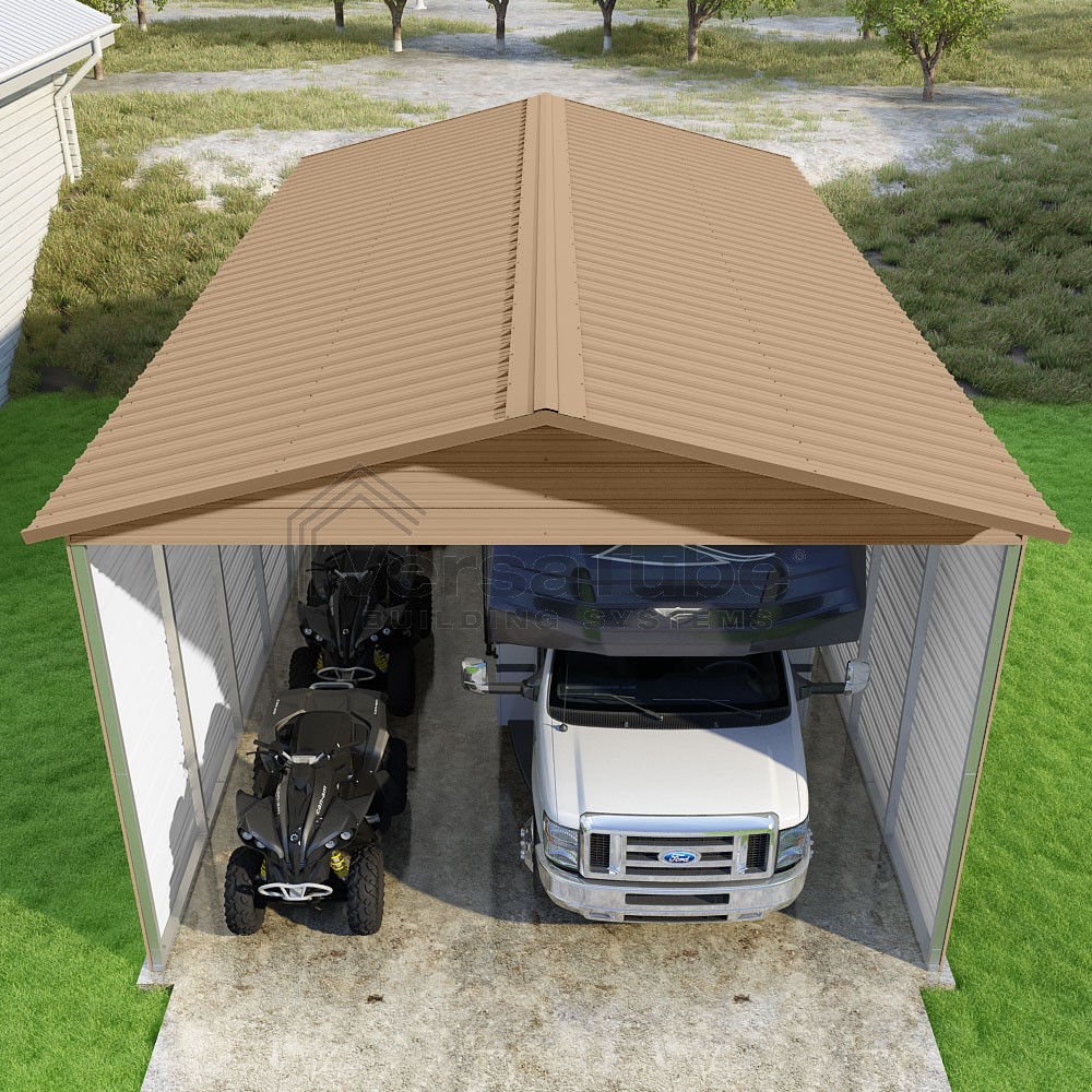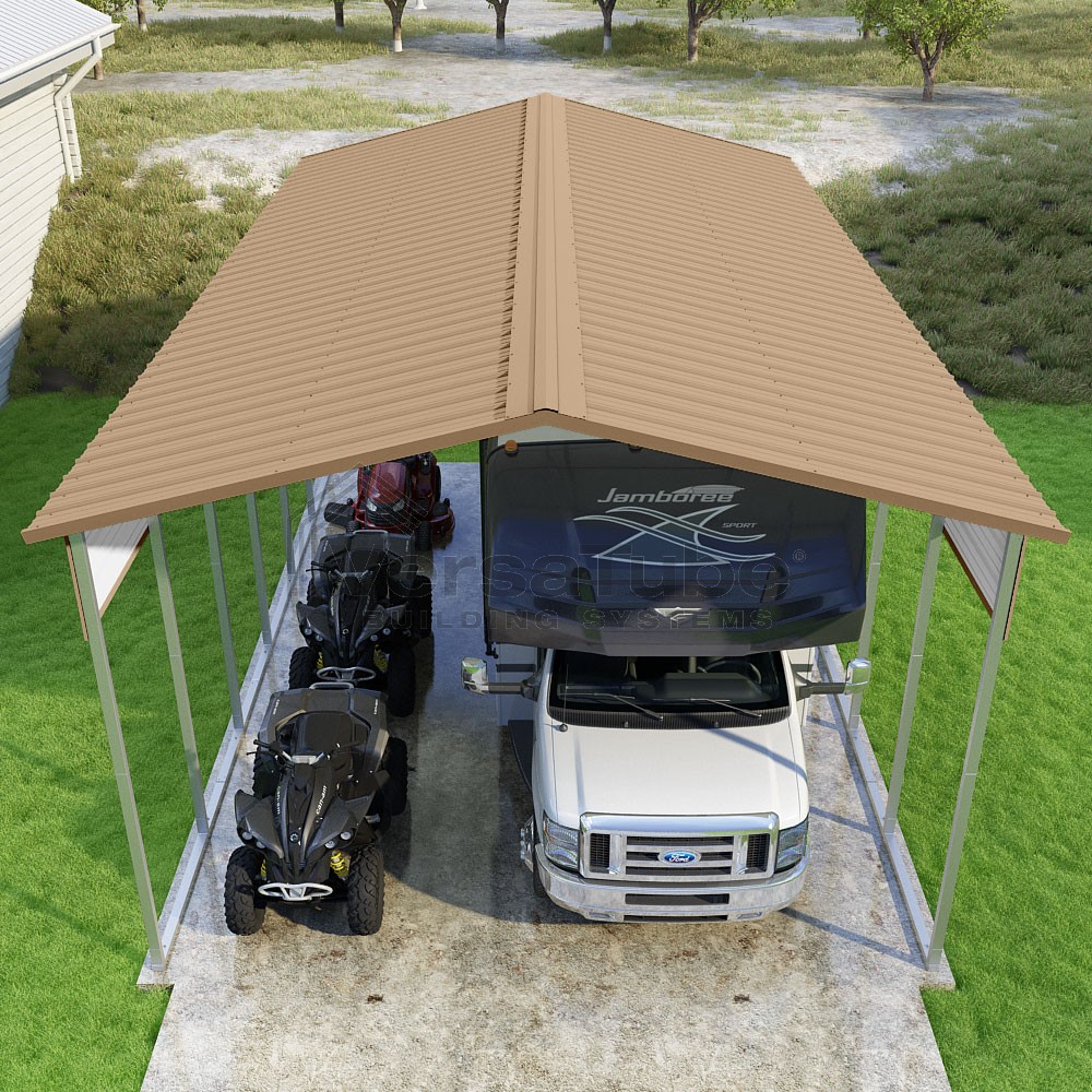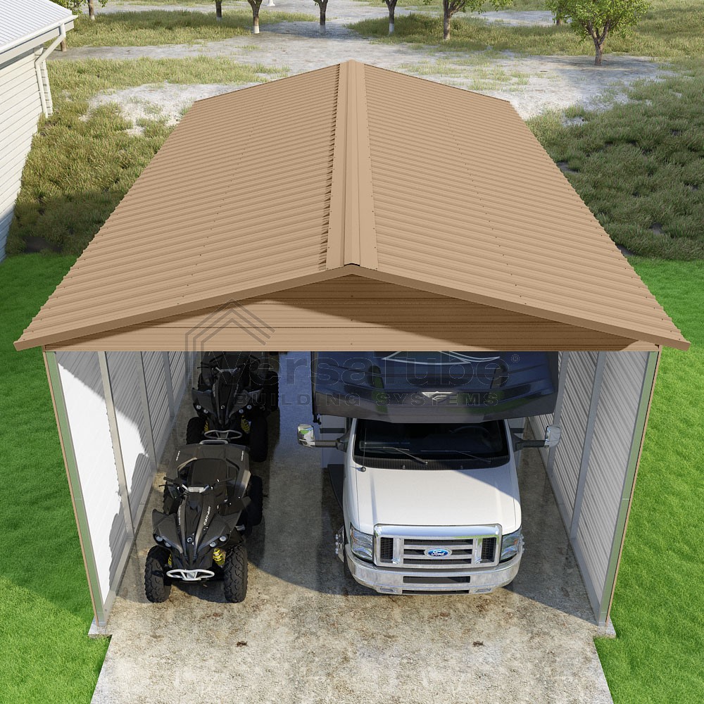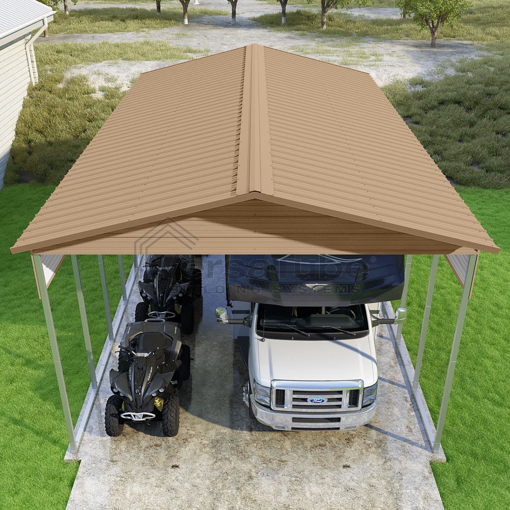 Pinnacle Series DIY carport kit features vertical sheet metal roof panels with ridge cap, gable and eave trim for an A-frame roof style and extended coverage on both ends.