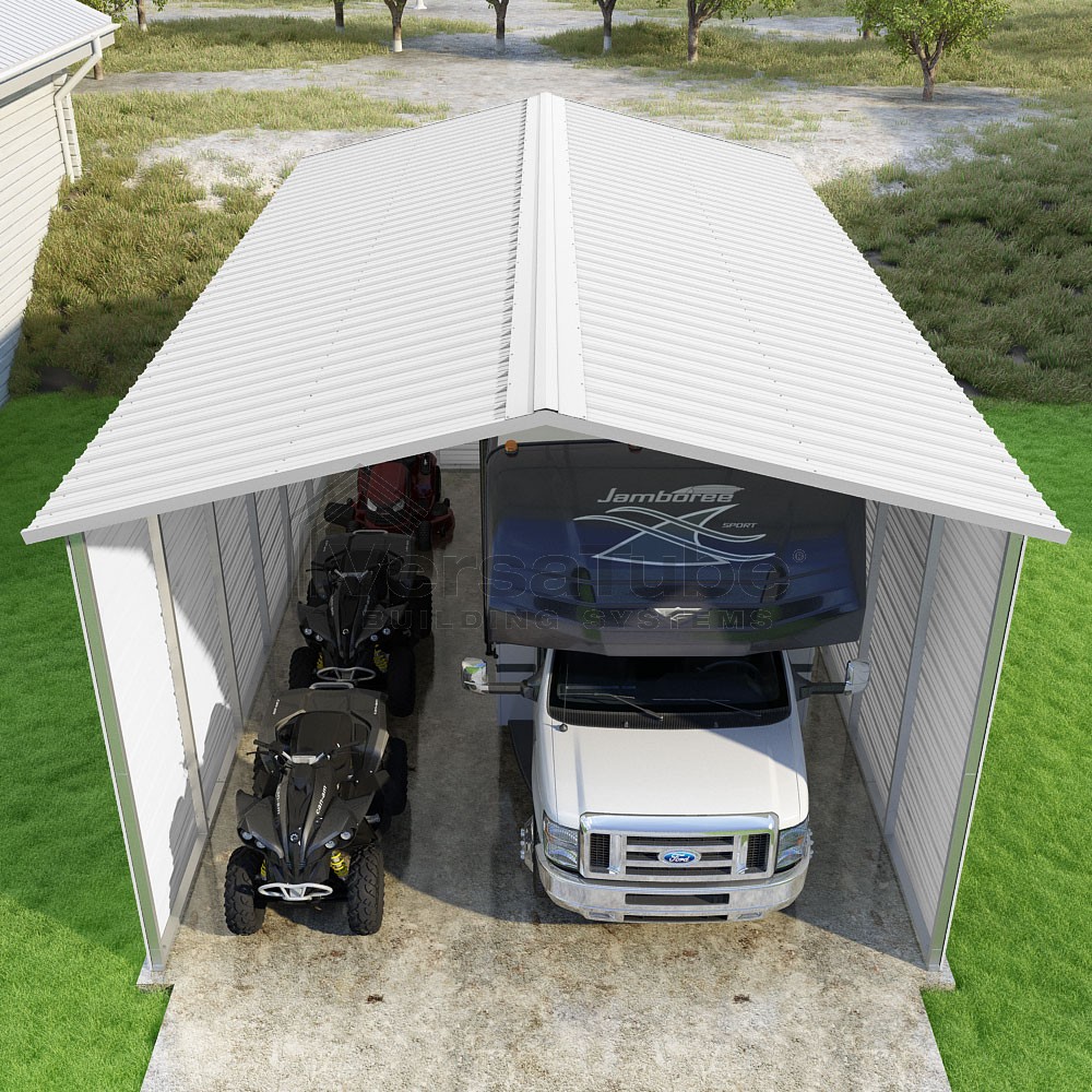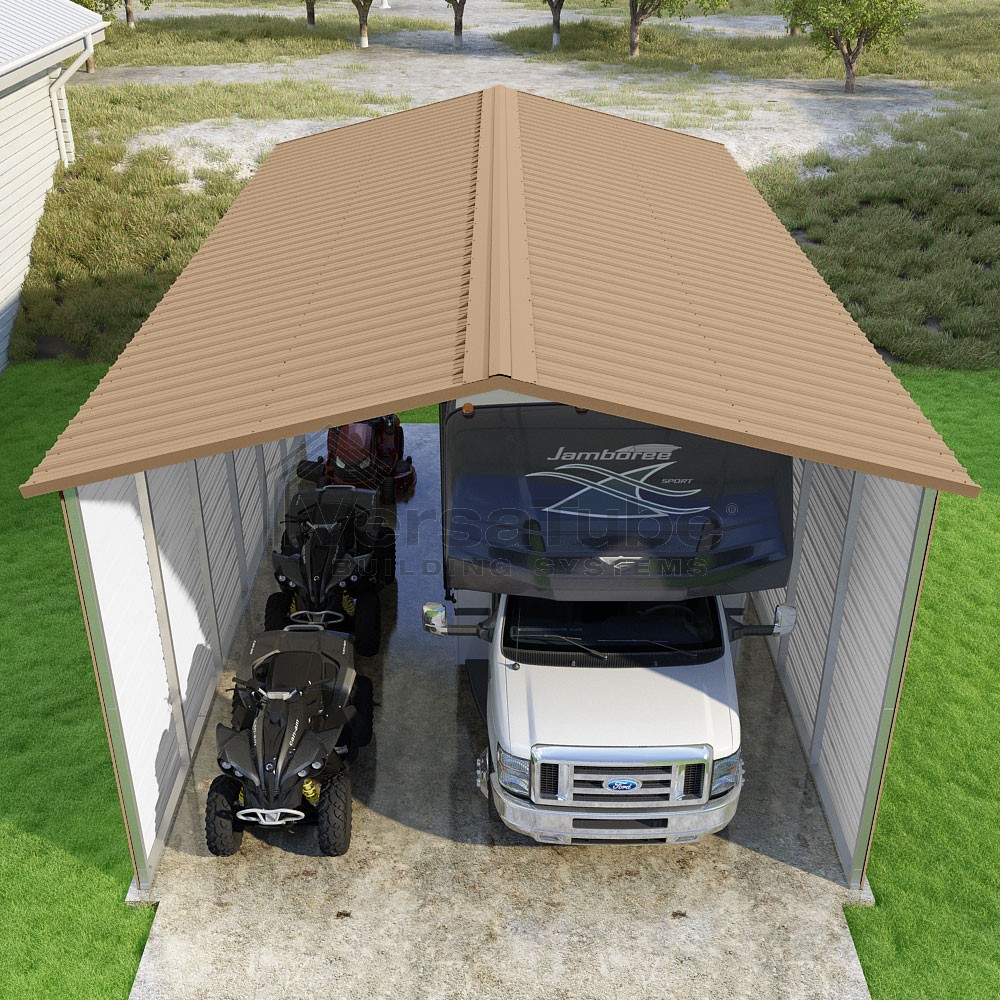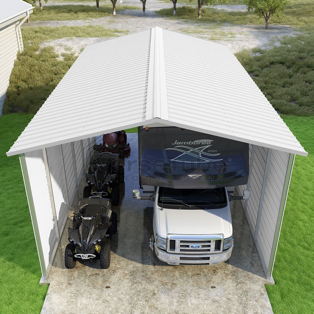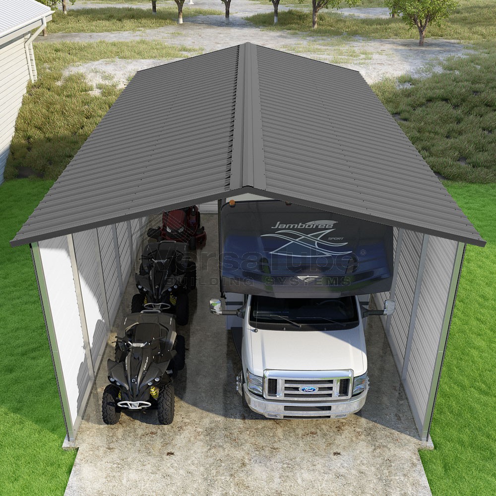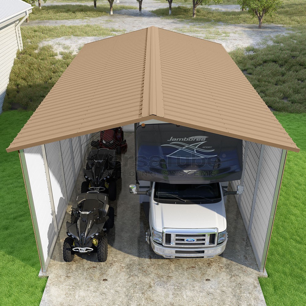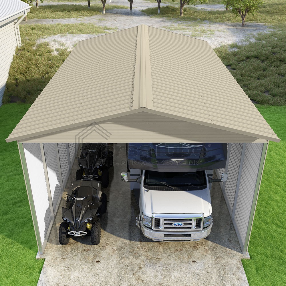Pinnacle Series DIY carport kit features vertical sheet metal roof panels with ridge cap, gable and eave trim for an A-frame roof style and extended coverage on both ends.