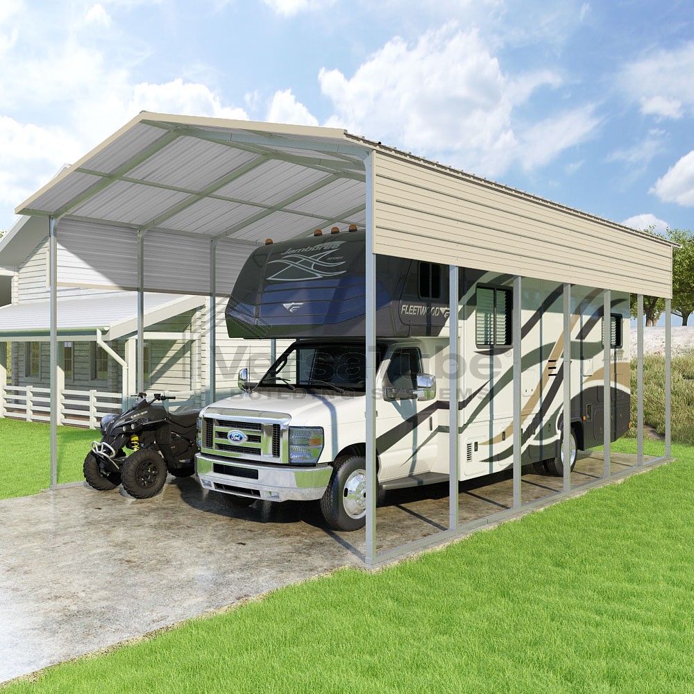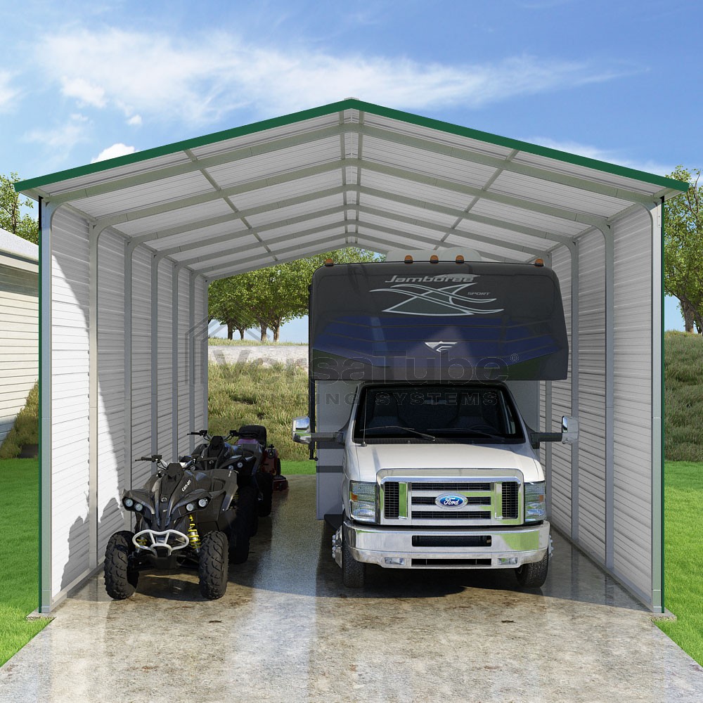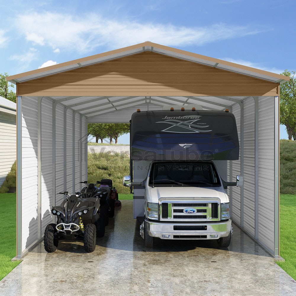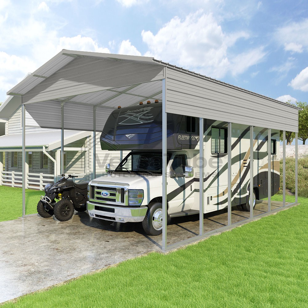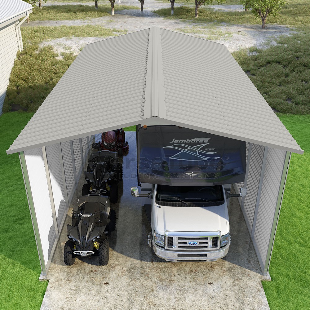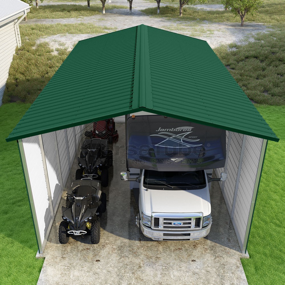 Pinnacle Series DIY carport kit features vertical sheet metal roof panels with ridge cap, gable and eave trim for an A-frame roof style and extended coverage on both ends.