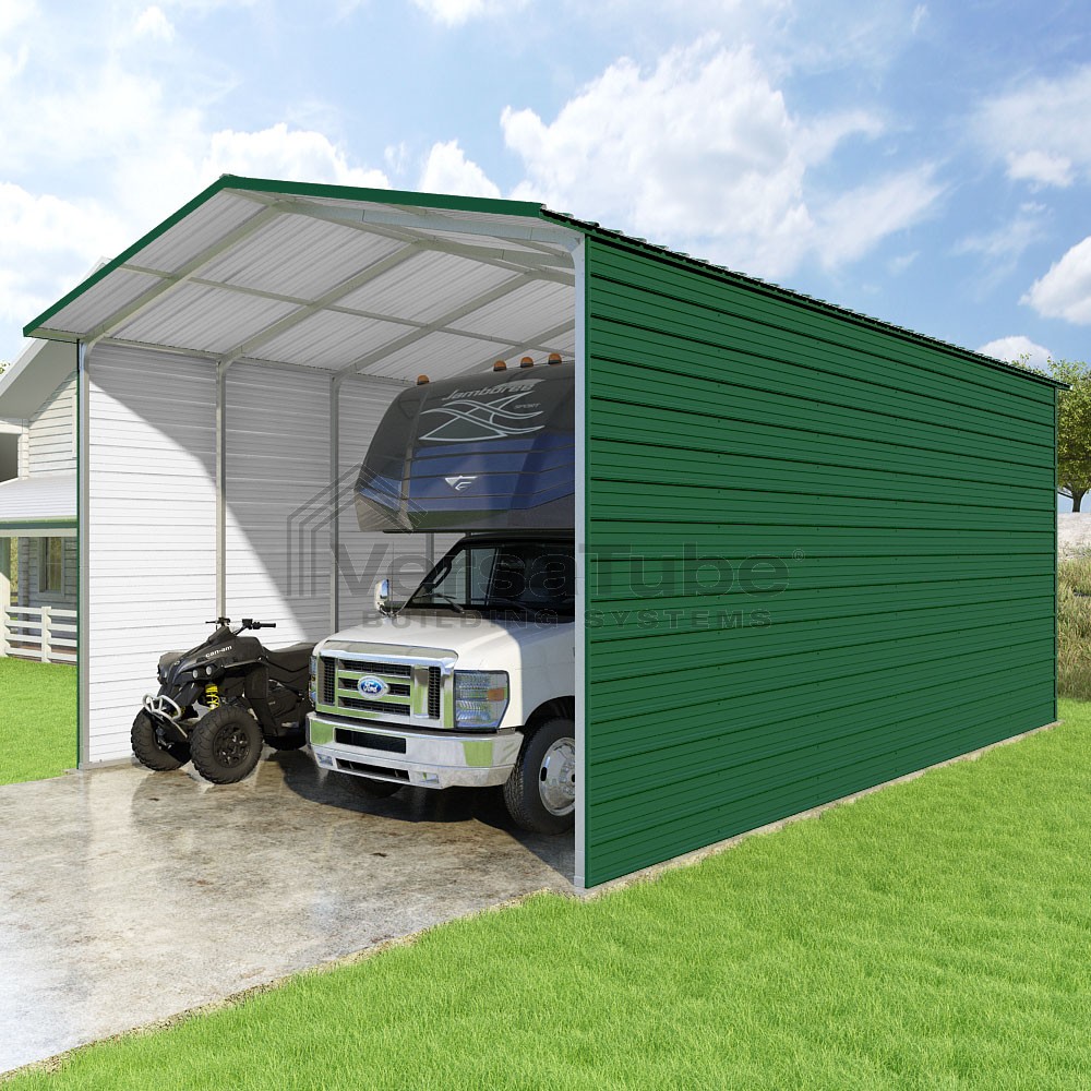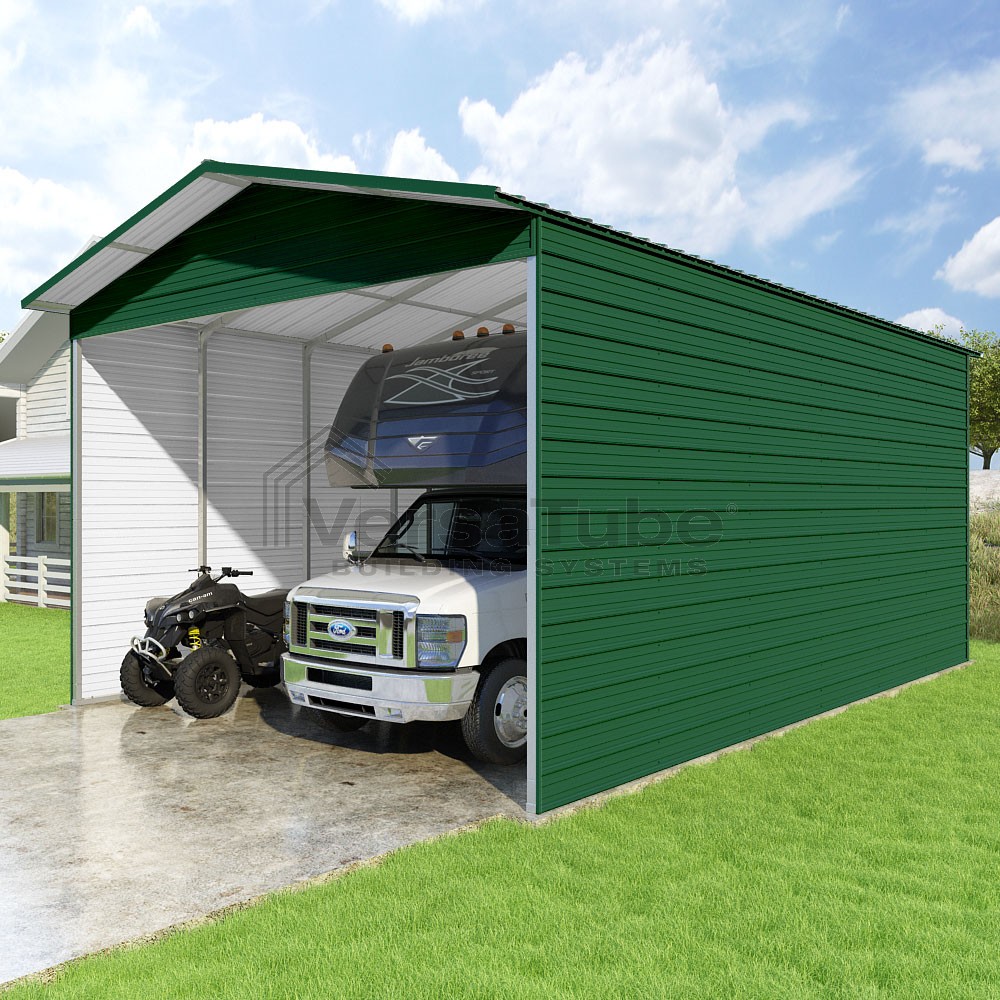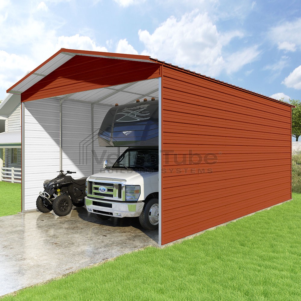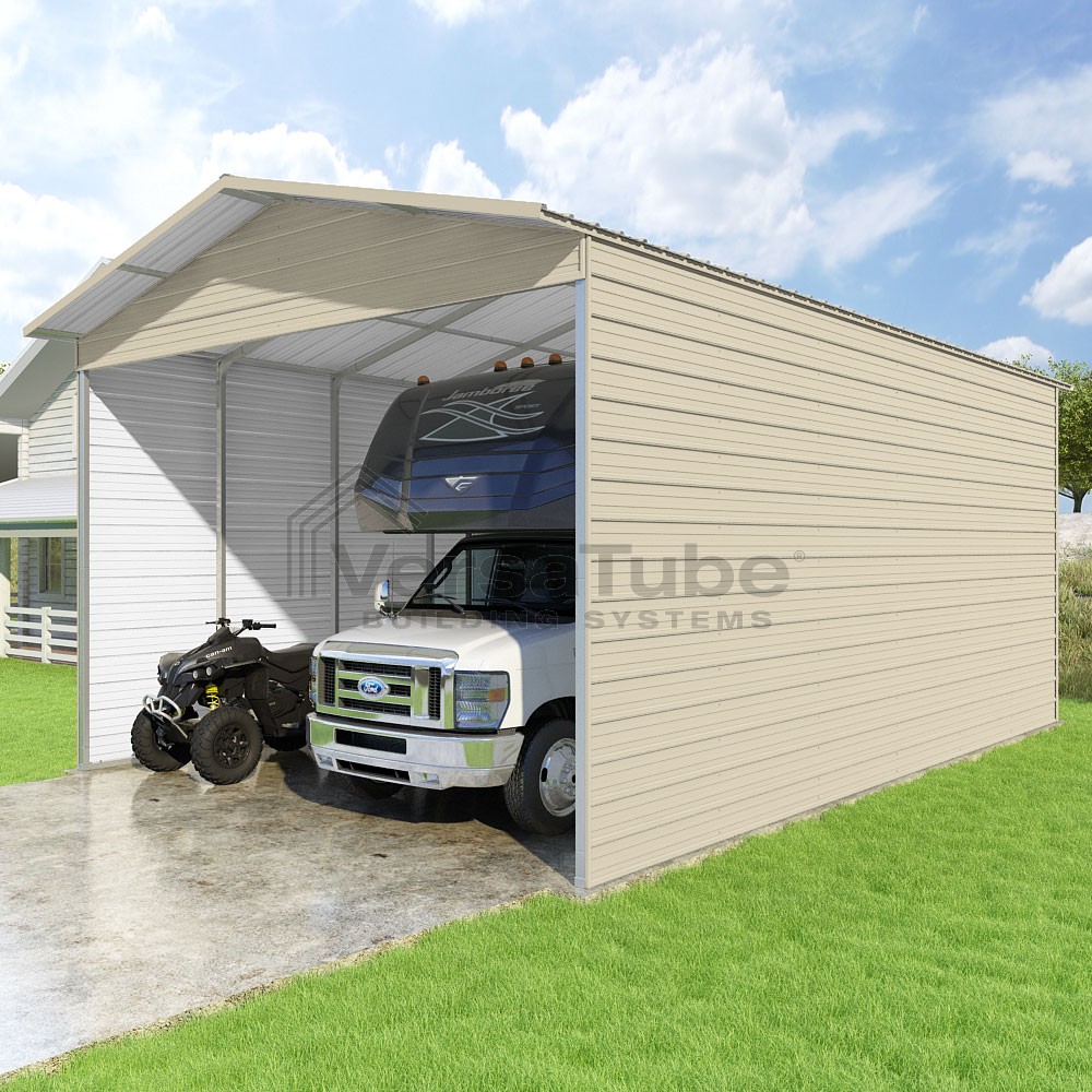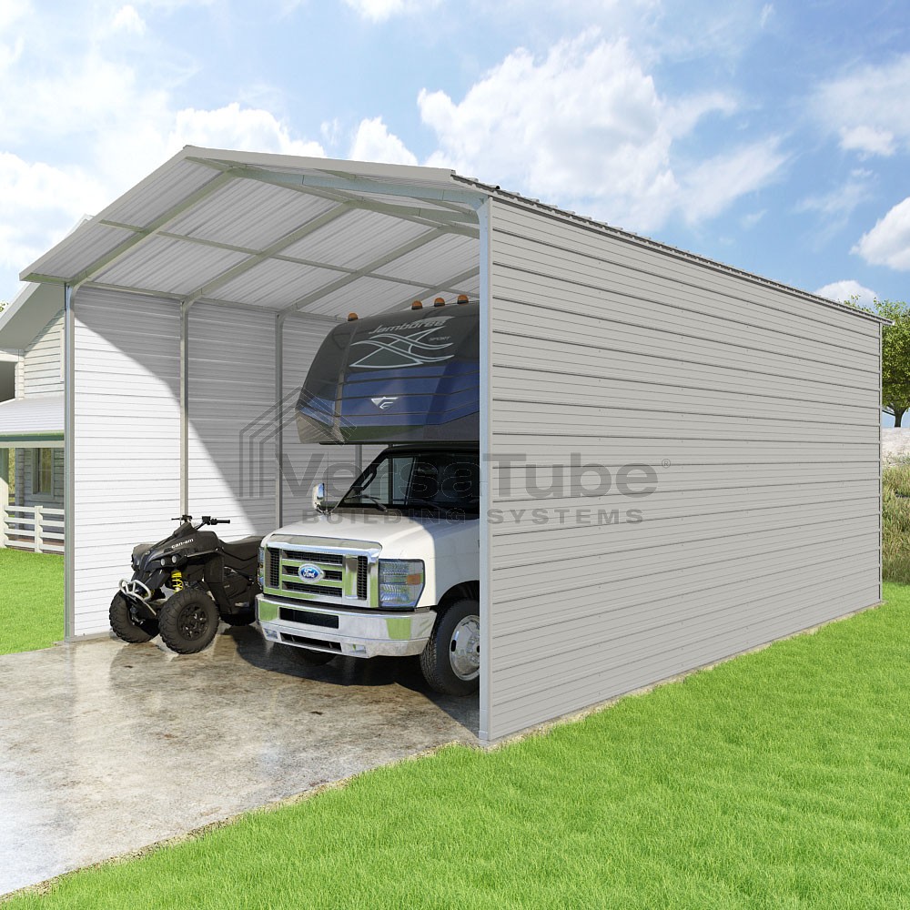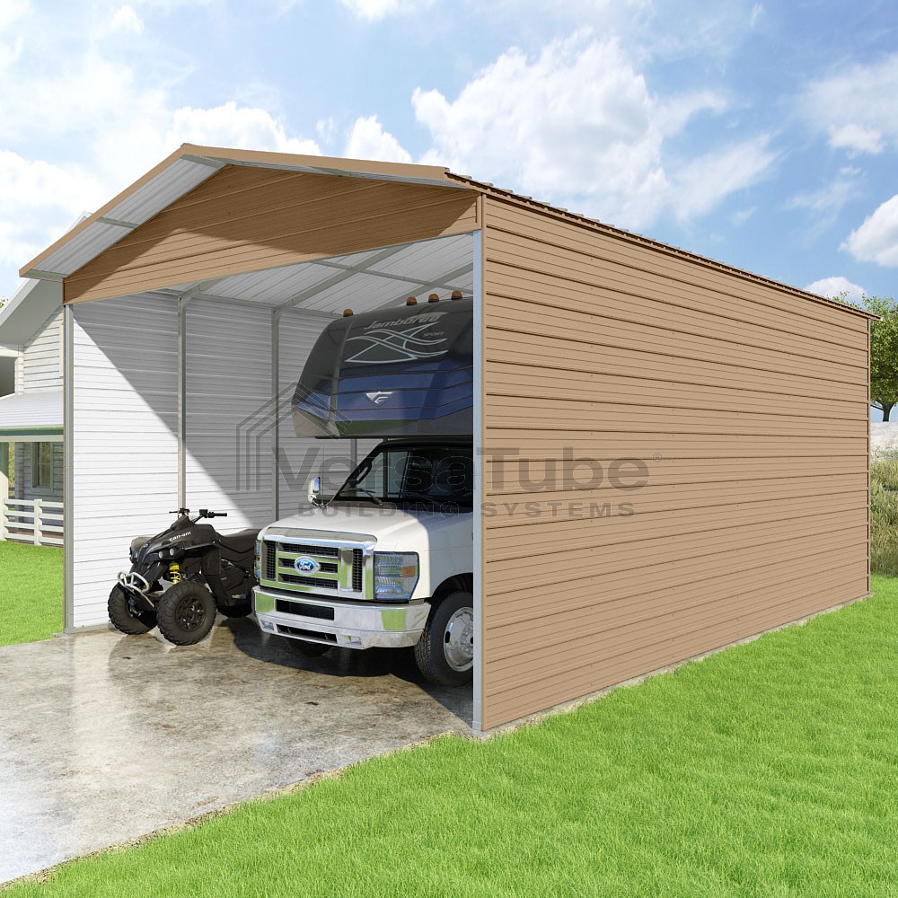 Pinnacle Series DIY carport kit features vertical sheet metal roof panels with ridge cap, gable and eave trim for an A-frame roof style and extended coverage on both ends.