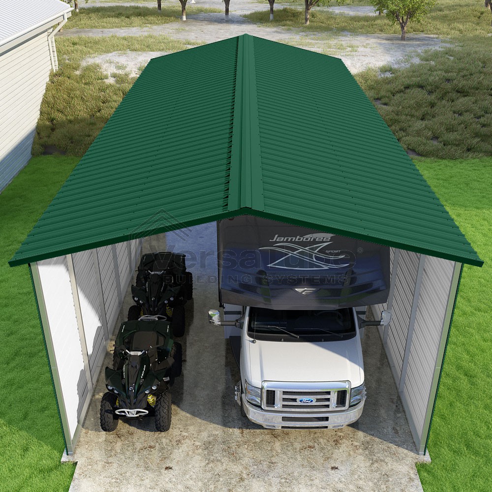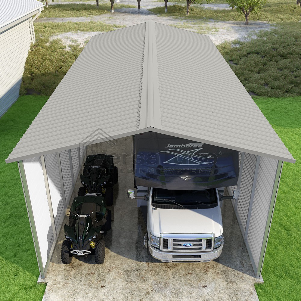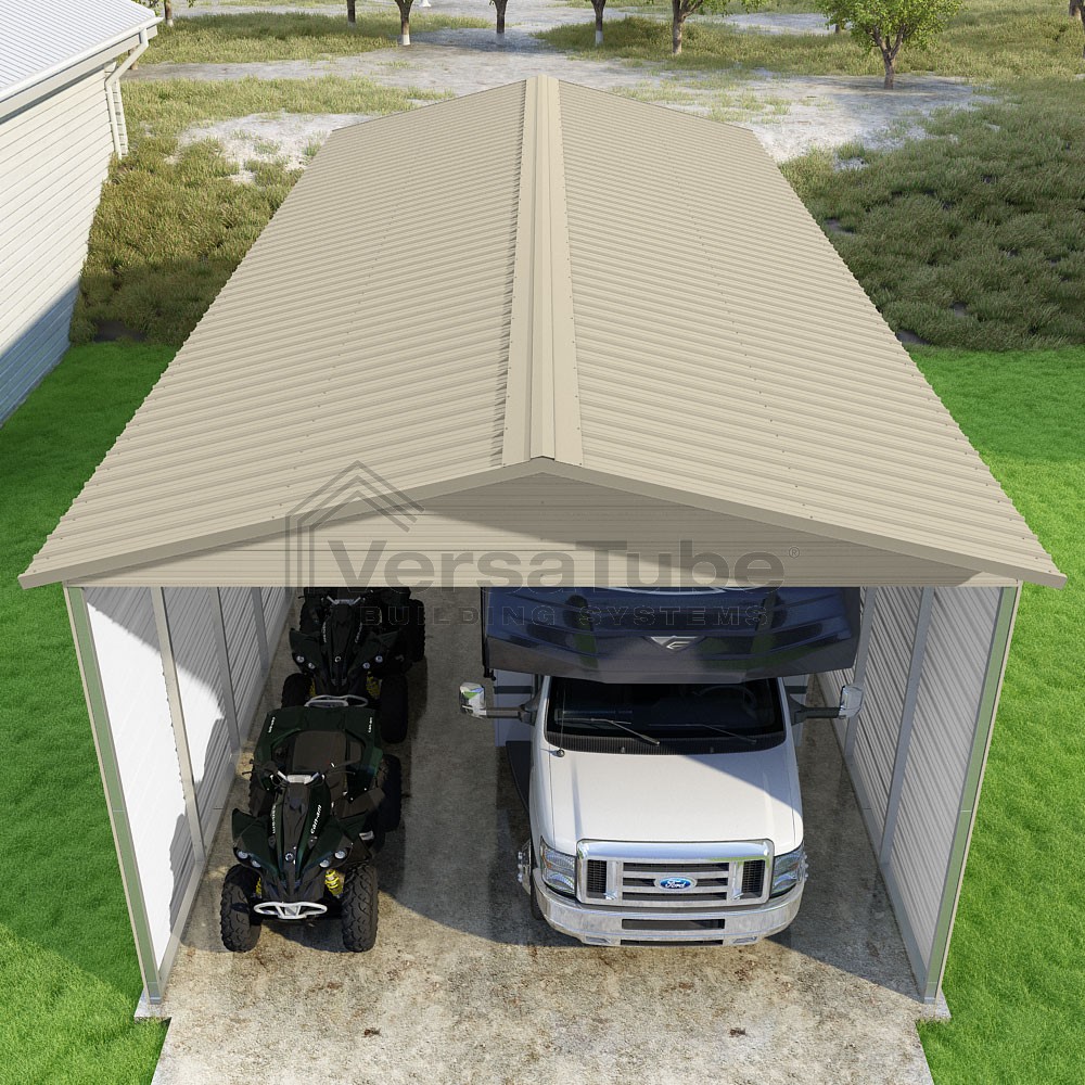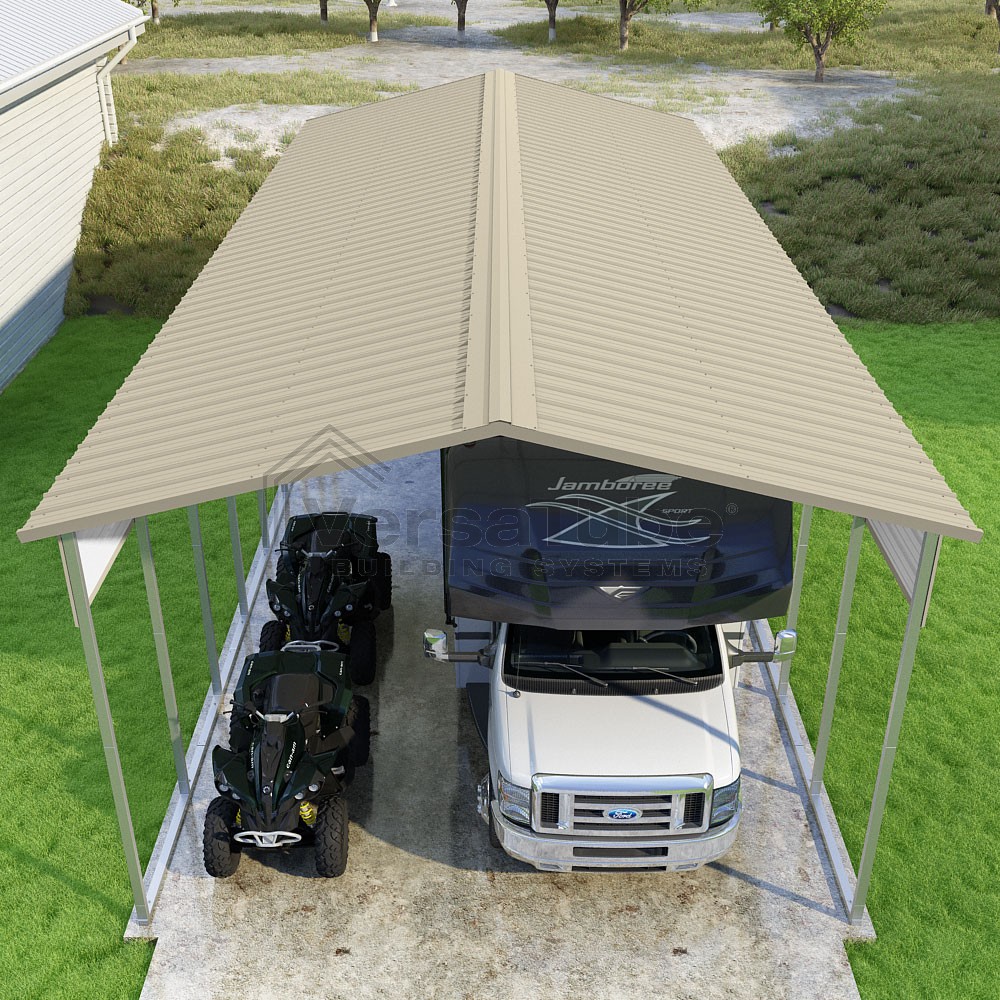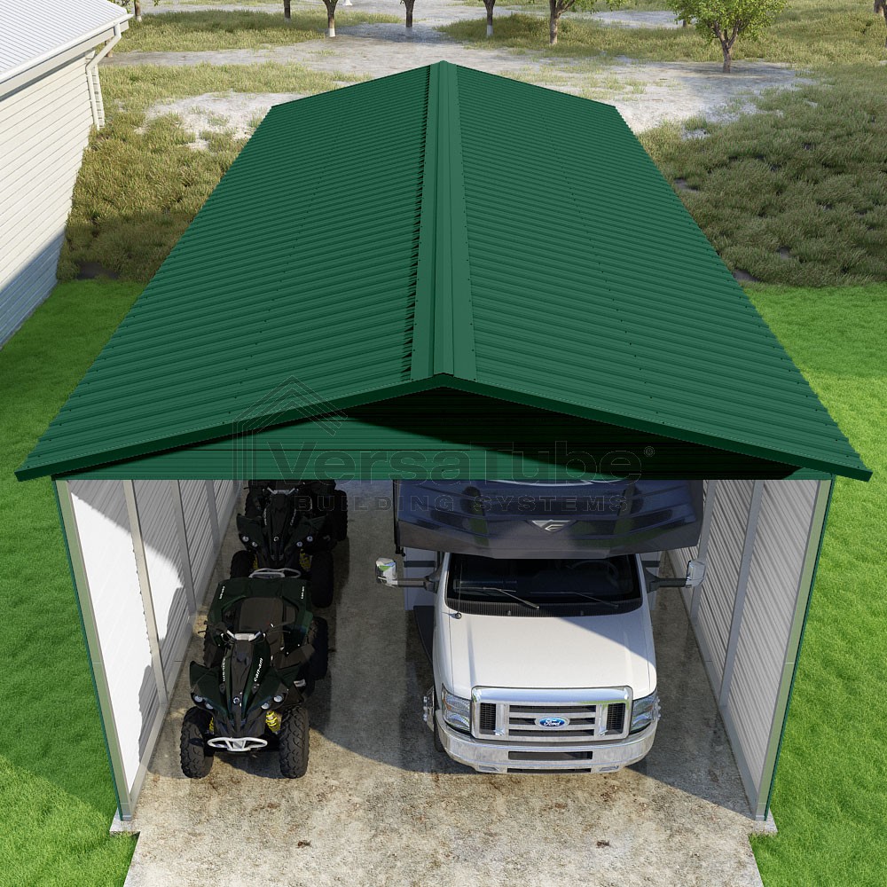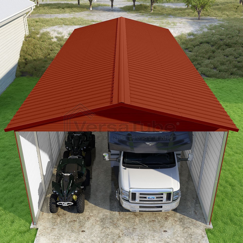 Pinnacle Series DIY carport kit features vertical sheet metal roof panels with ridge cap, gable and eave trim for an A-frame roof style and extended coverage on both ends.