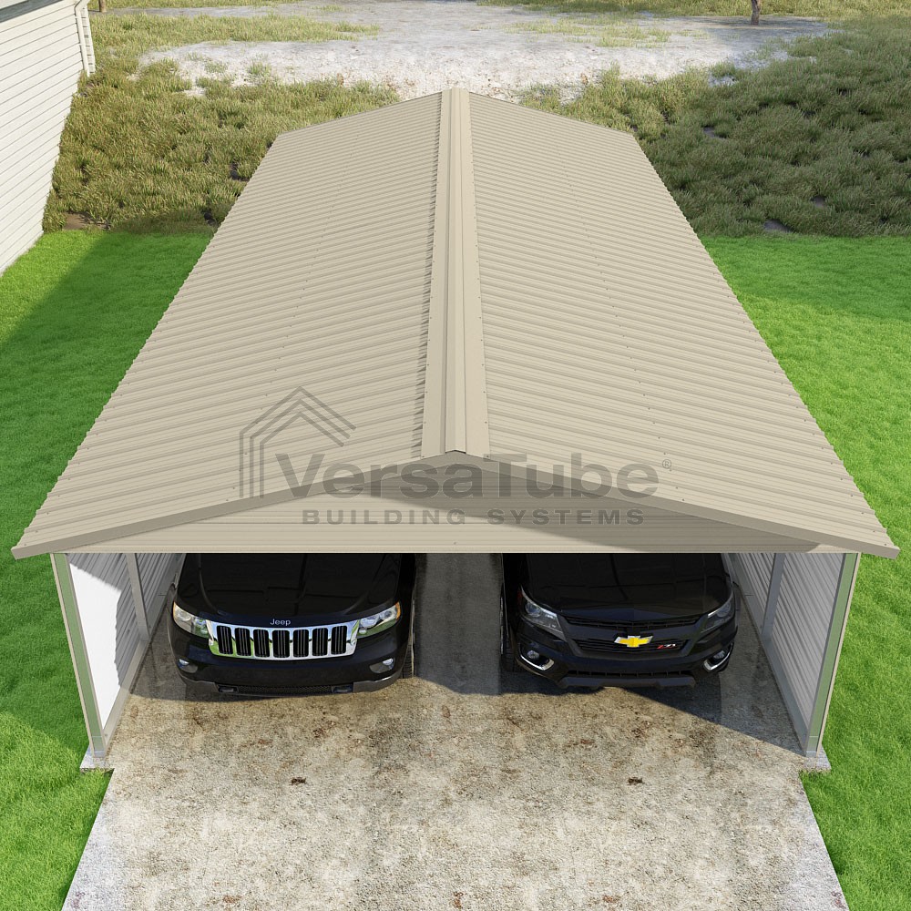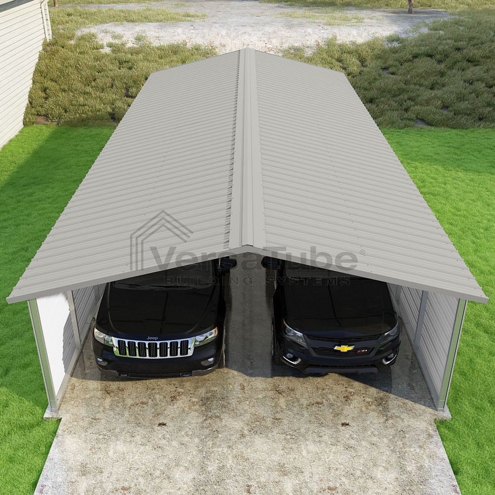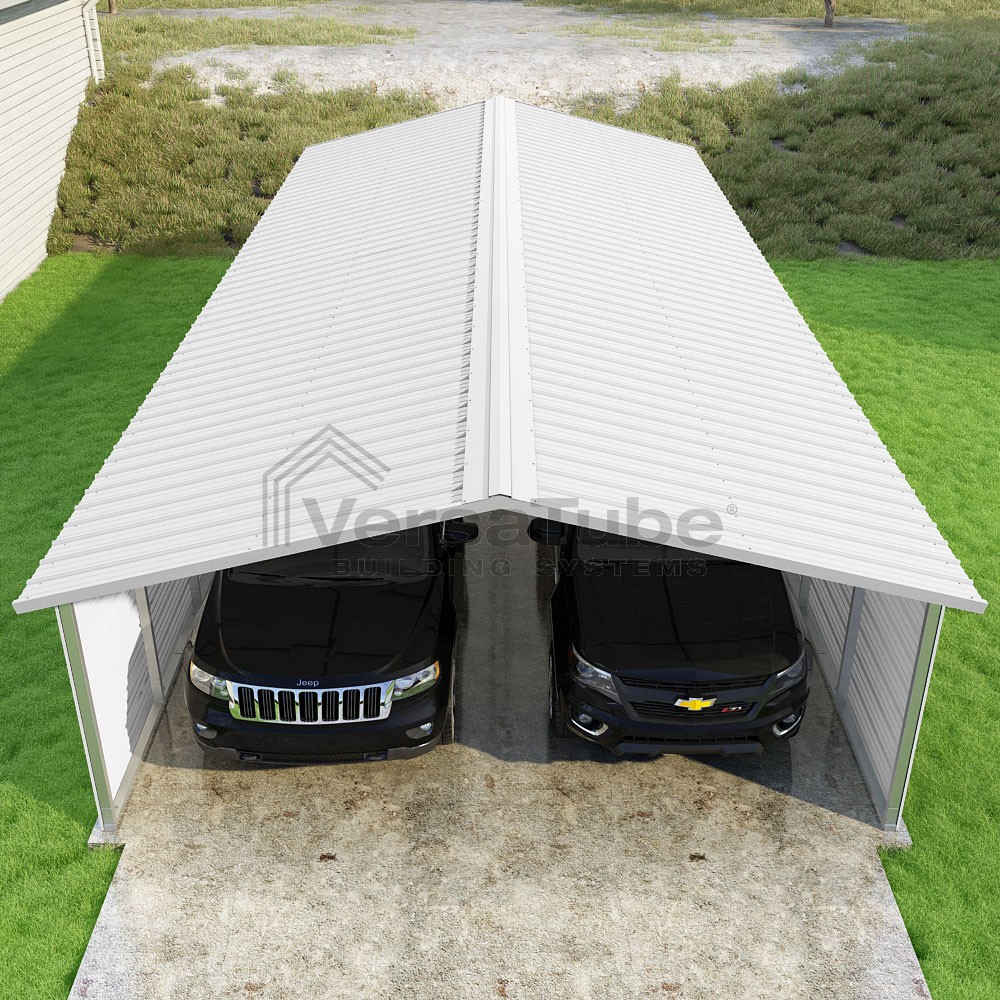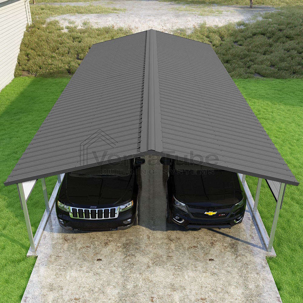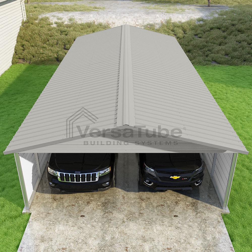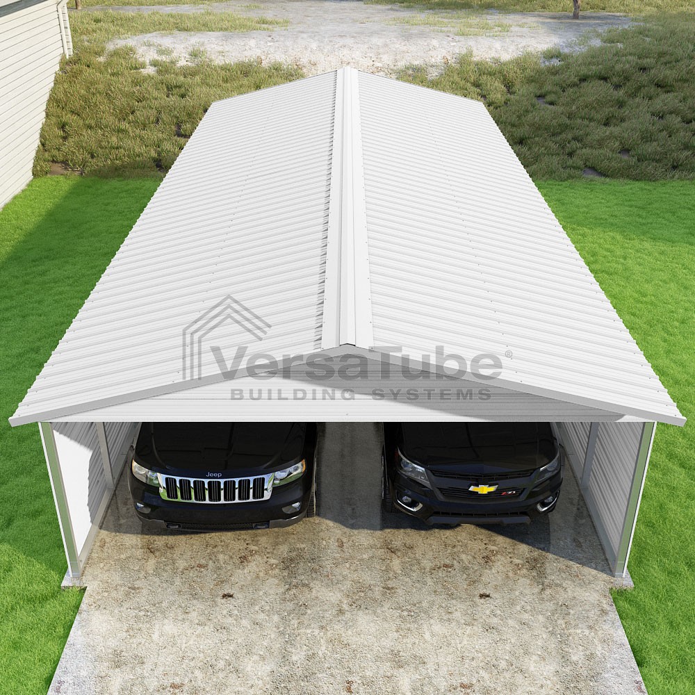 Pinnacle Series DIY carport kit features vertical sheet metal roof panels with ridge cap, gable and eave trim for an A-frame roof style and extended coverage on both ends.