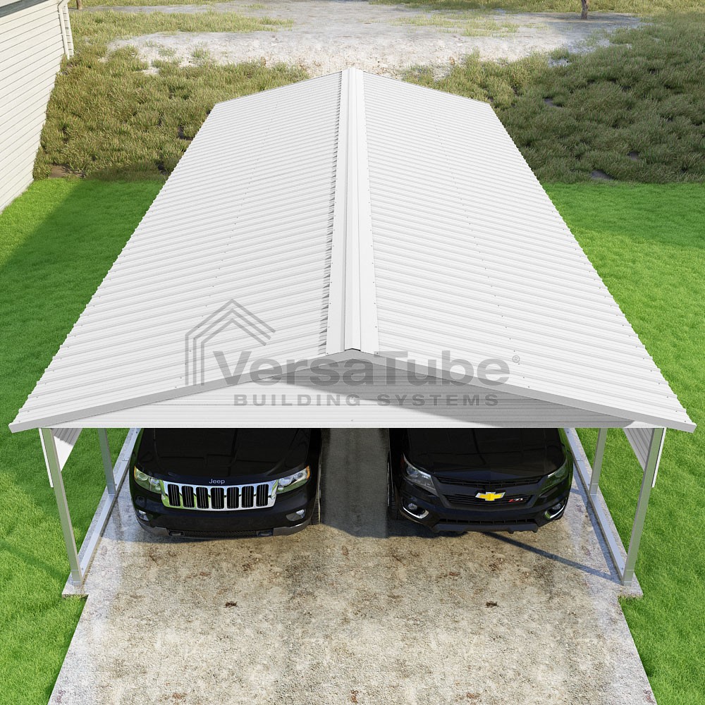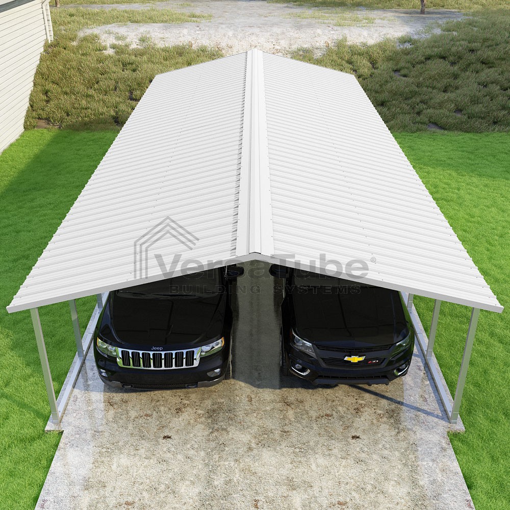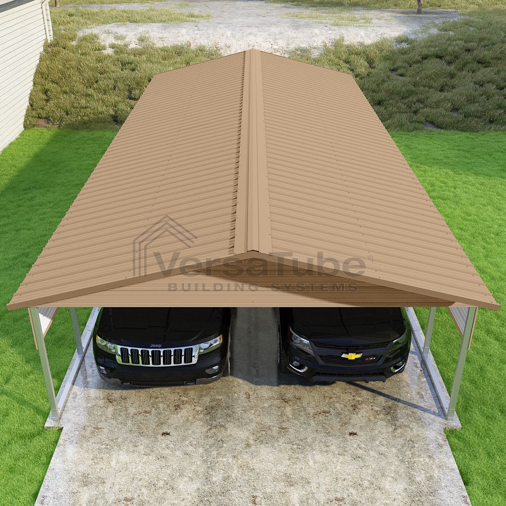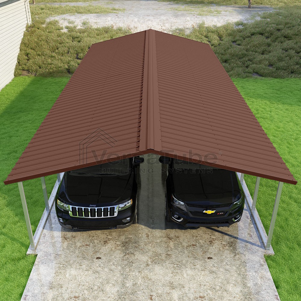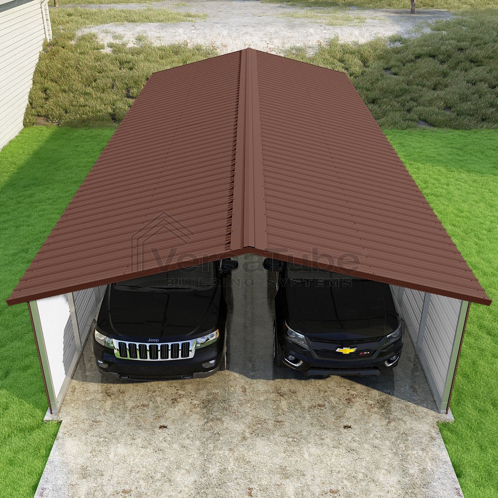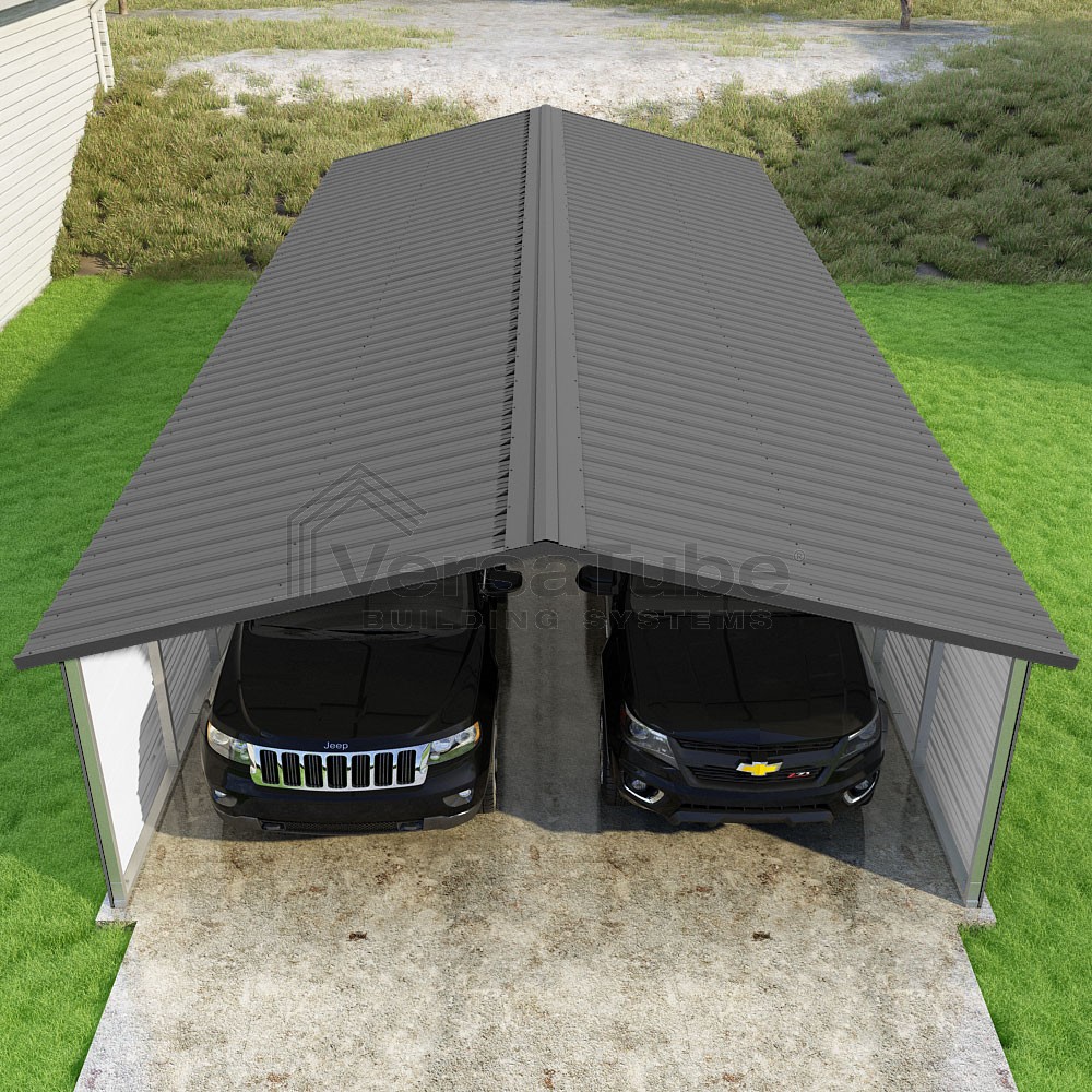 Pinnacle Series DIY carport kit features vertical sheet metal roof panels with ridge cap, gable and eave trim for an A-frame roof style and extended coverage on both ends.