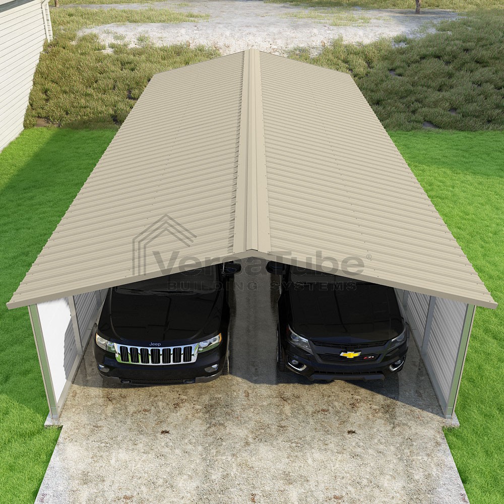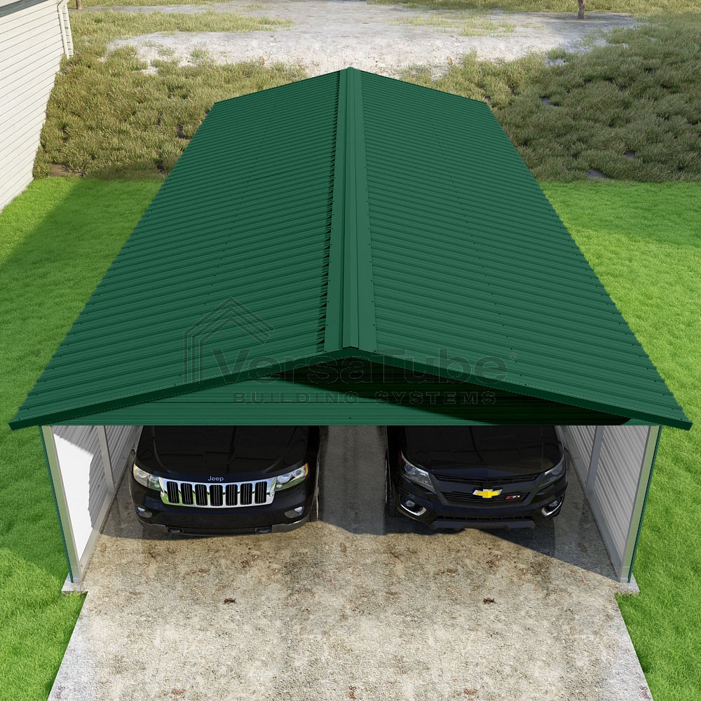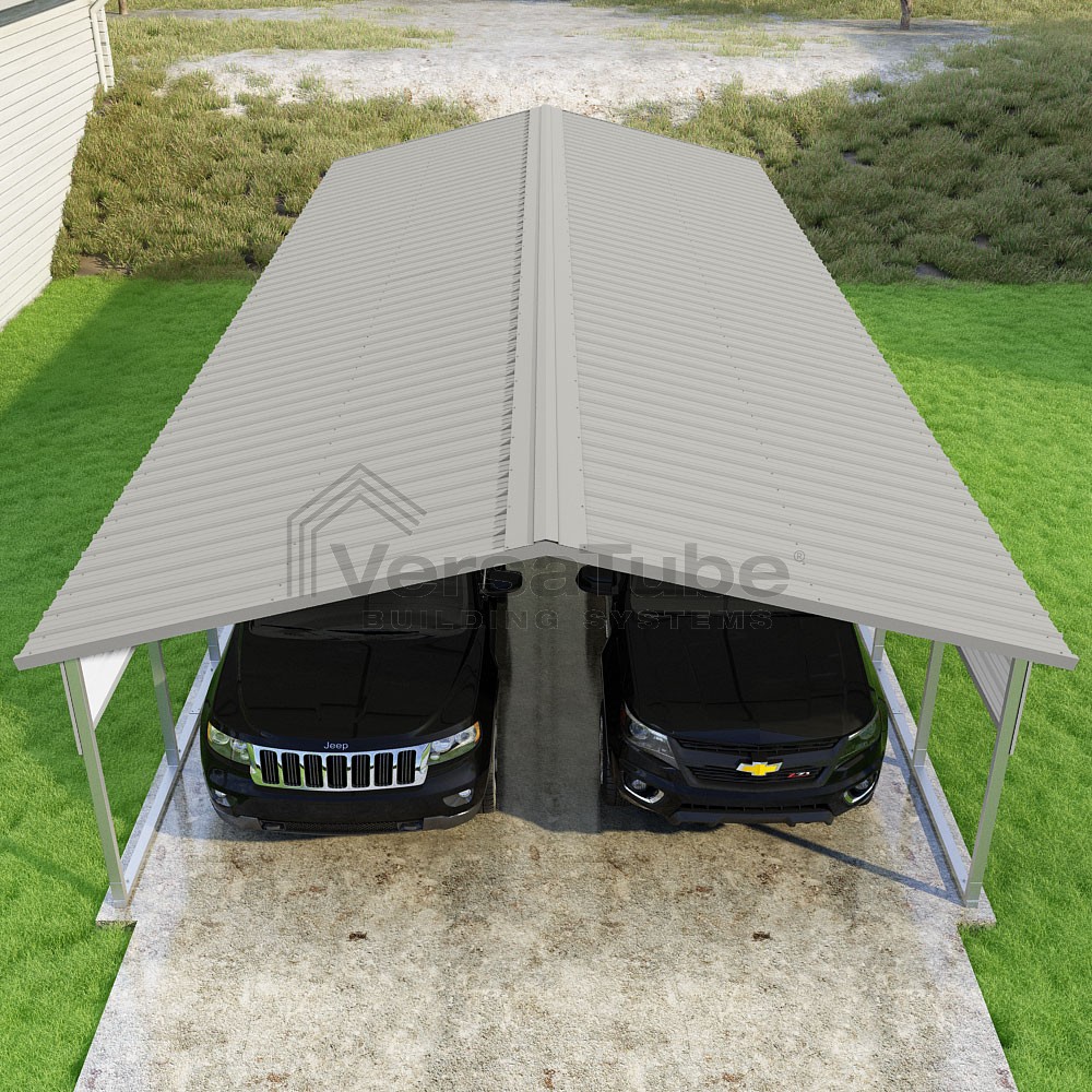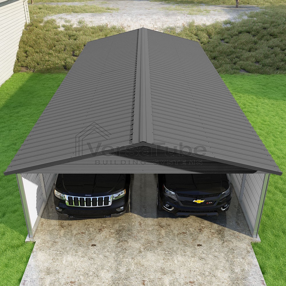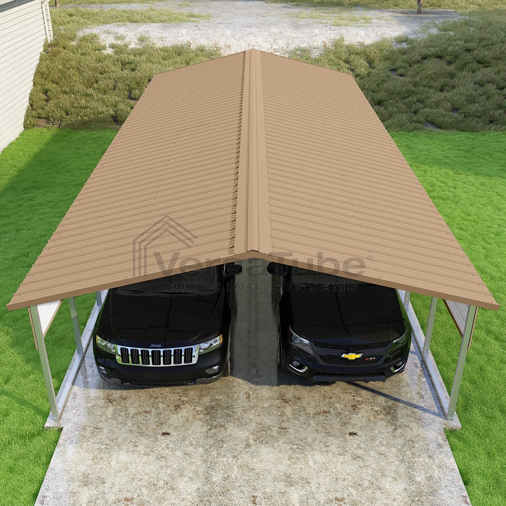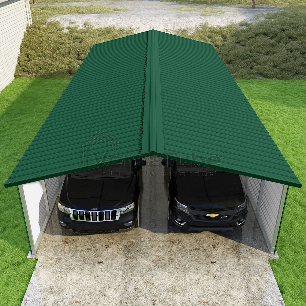 Pinnacle Series DIY carport kit features vertical sheet metal roof panels with ridge cap, gable and eave trim for an A-frame roof style and extended coverage on both ends.