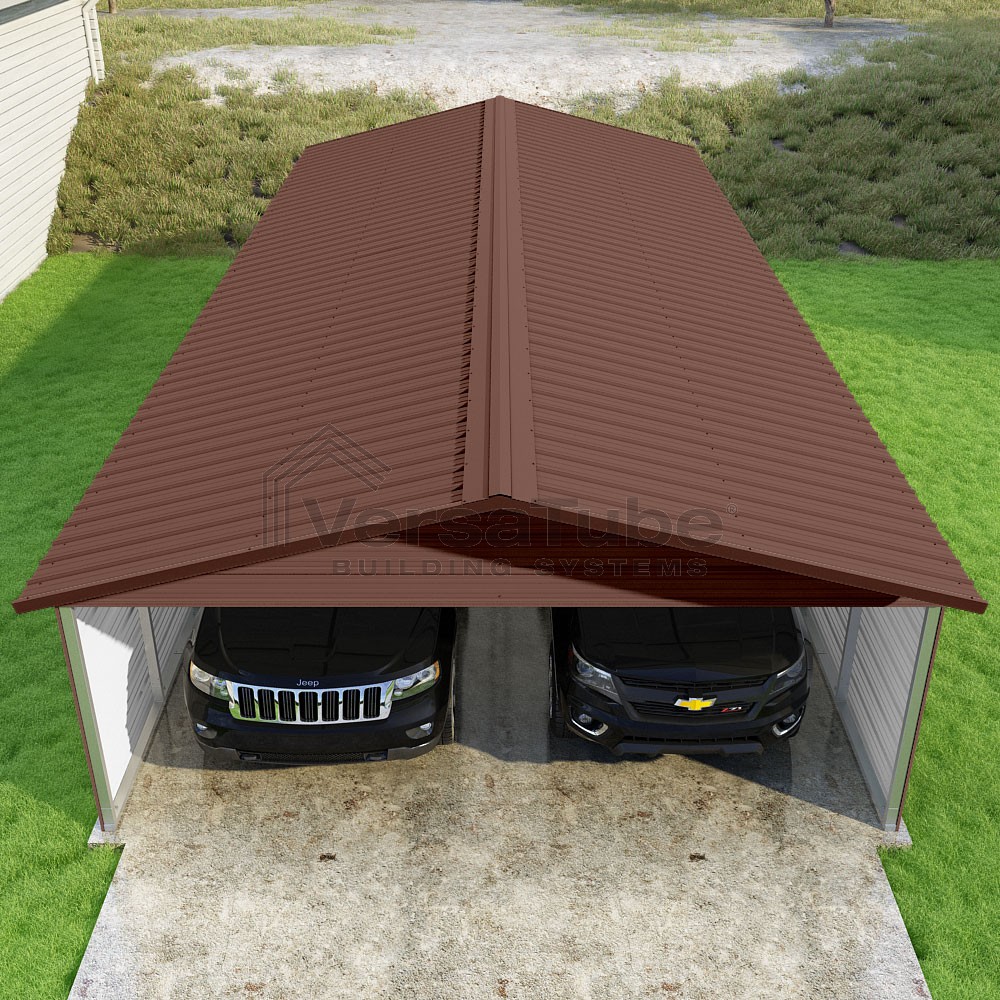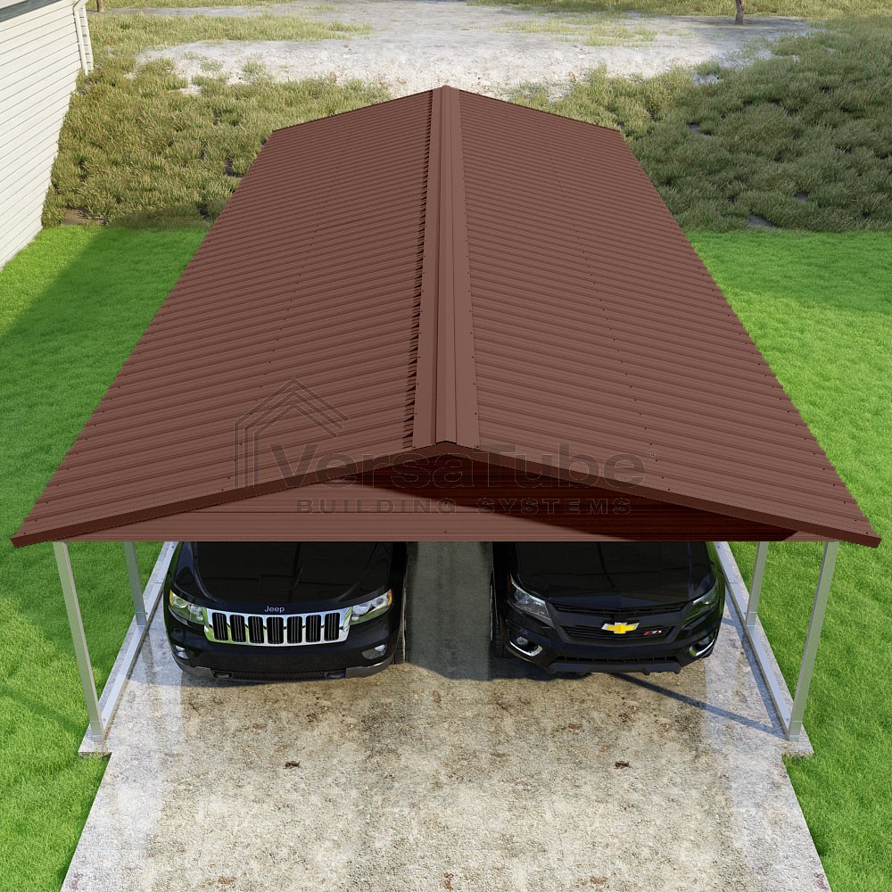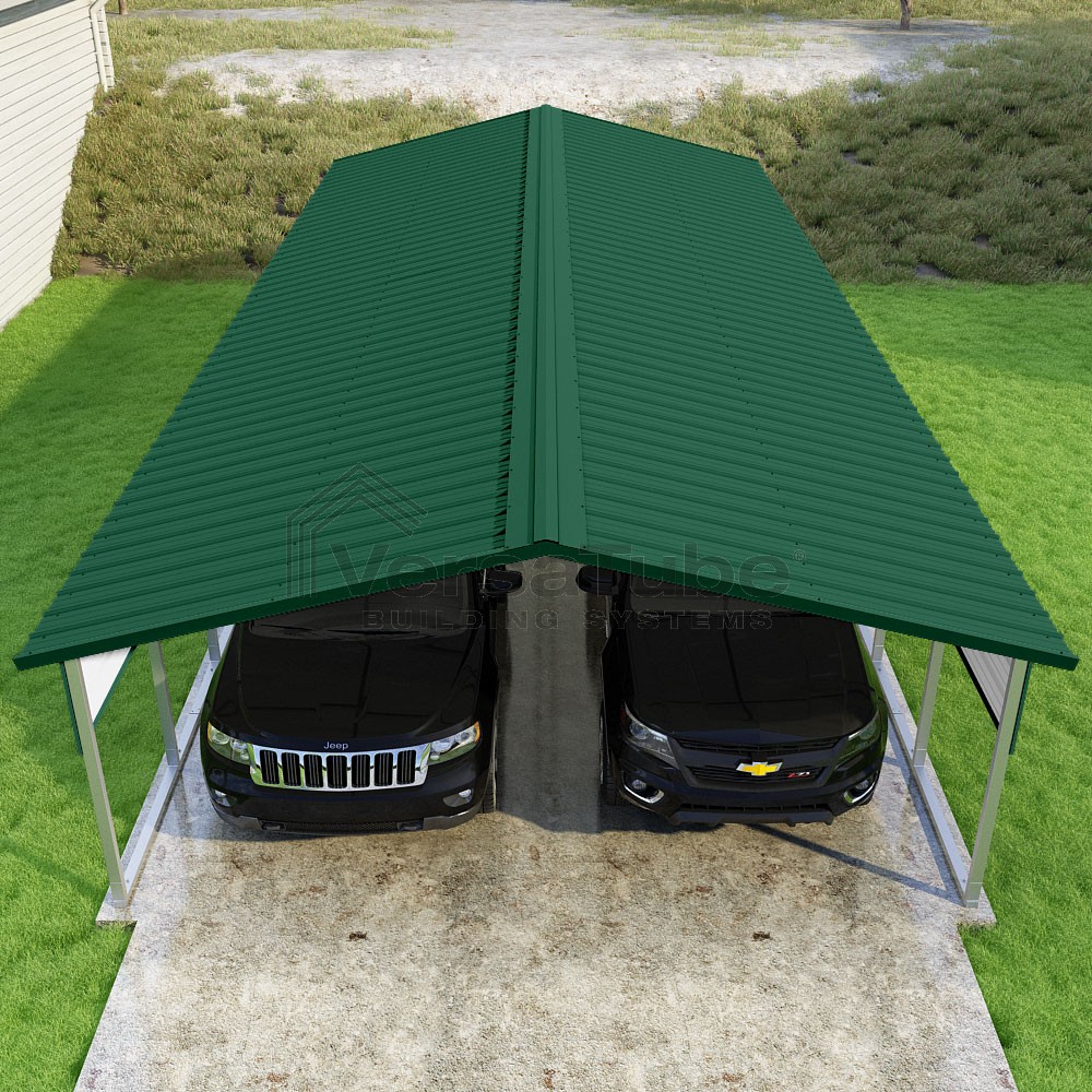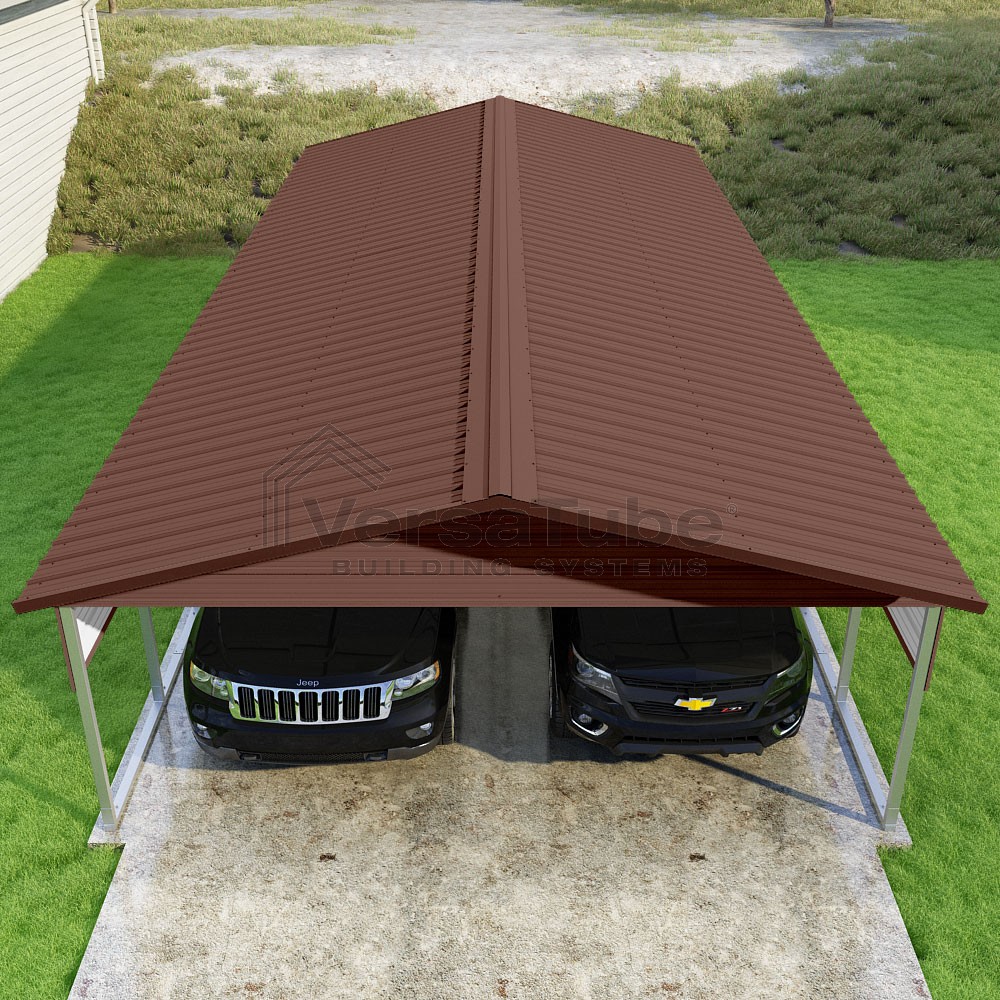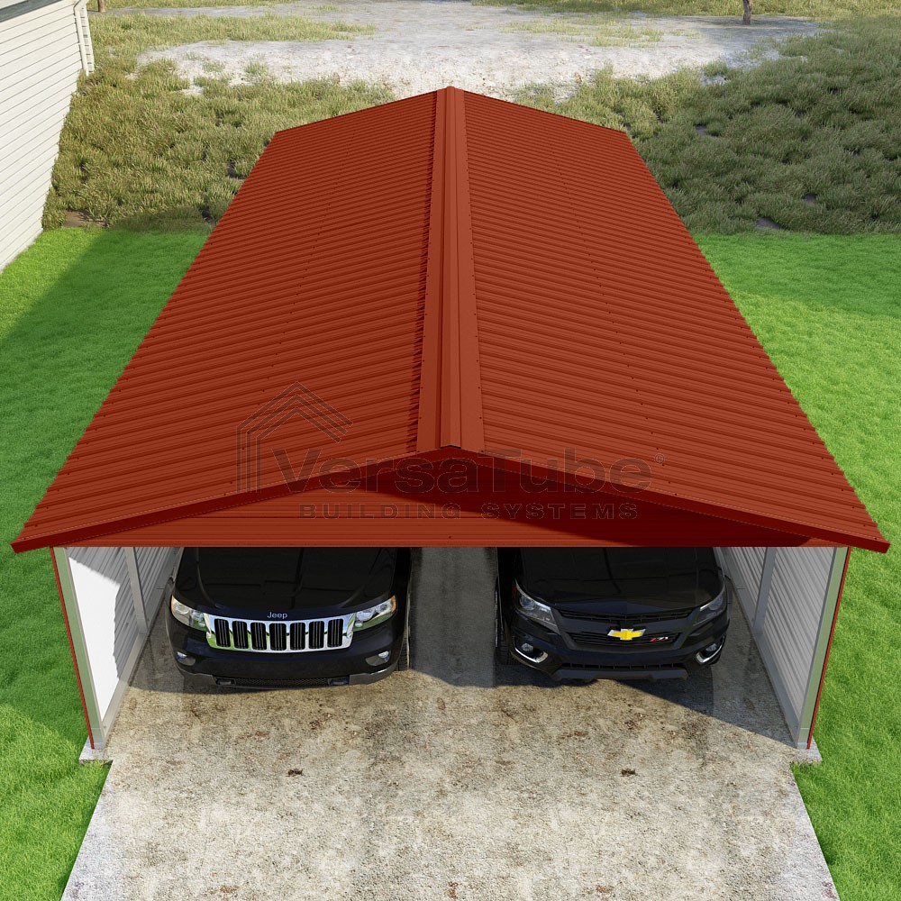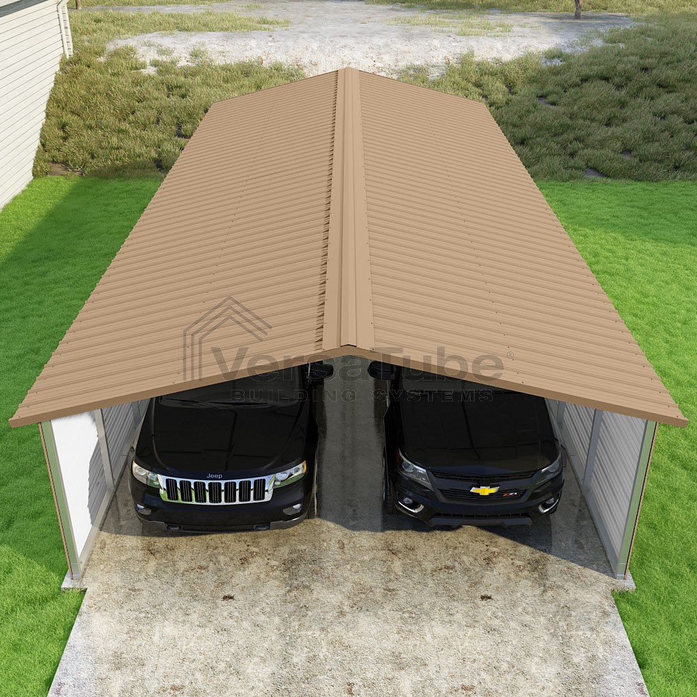 Pinnacle Series DIY carport kit features vertical sheet metal roof panels with ridge cap, gable and eave trim for an A-frame roof style and extended coverage on both ends.