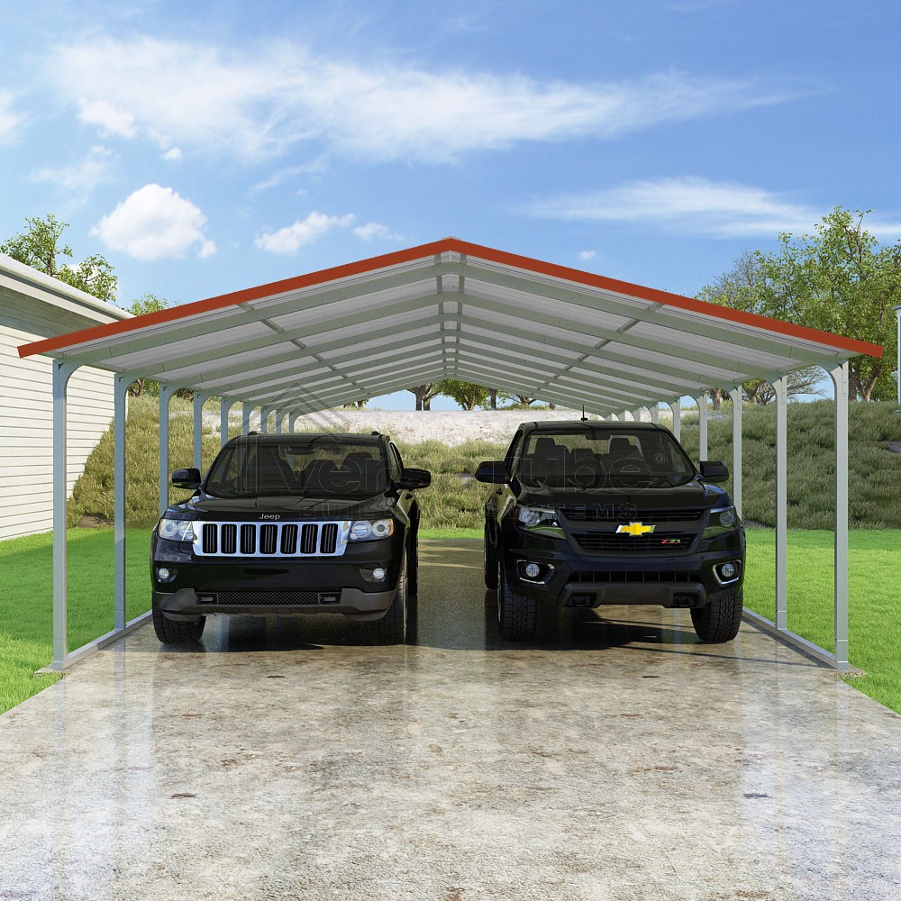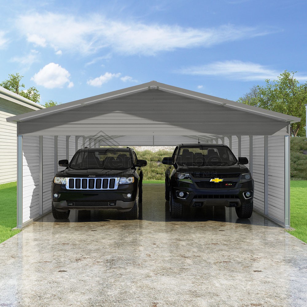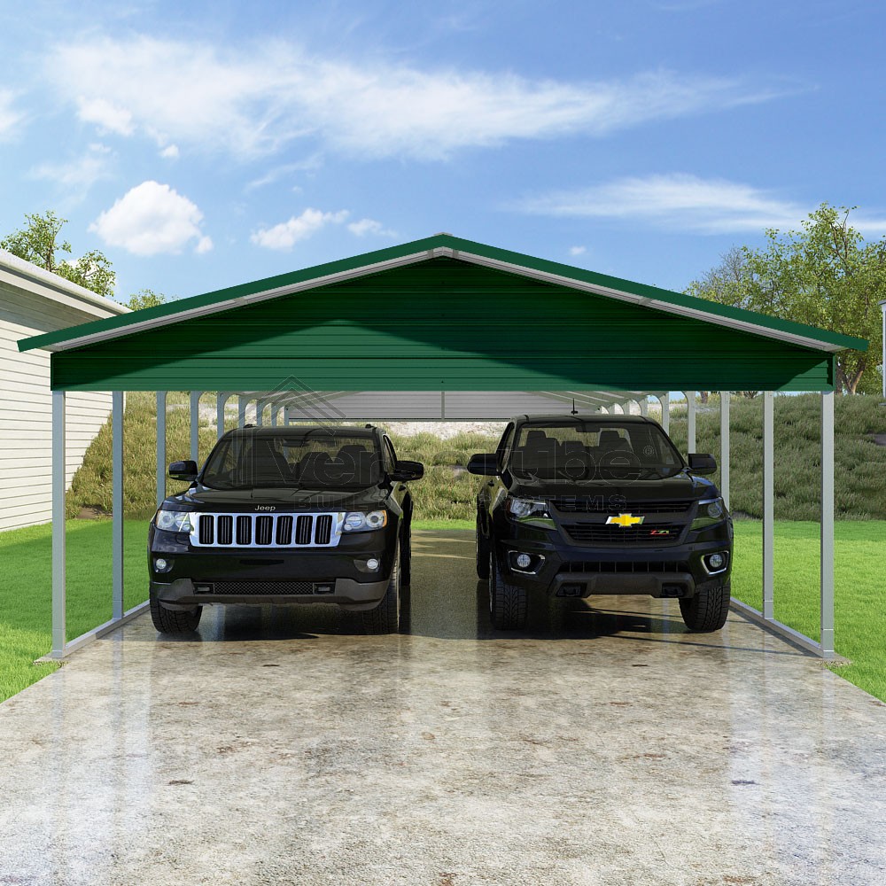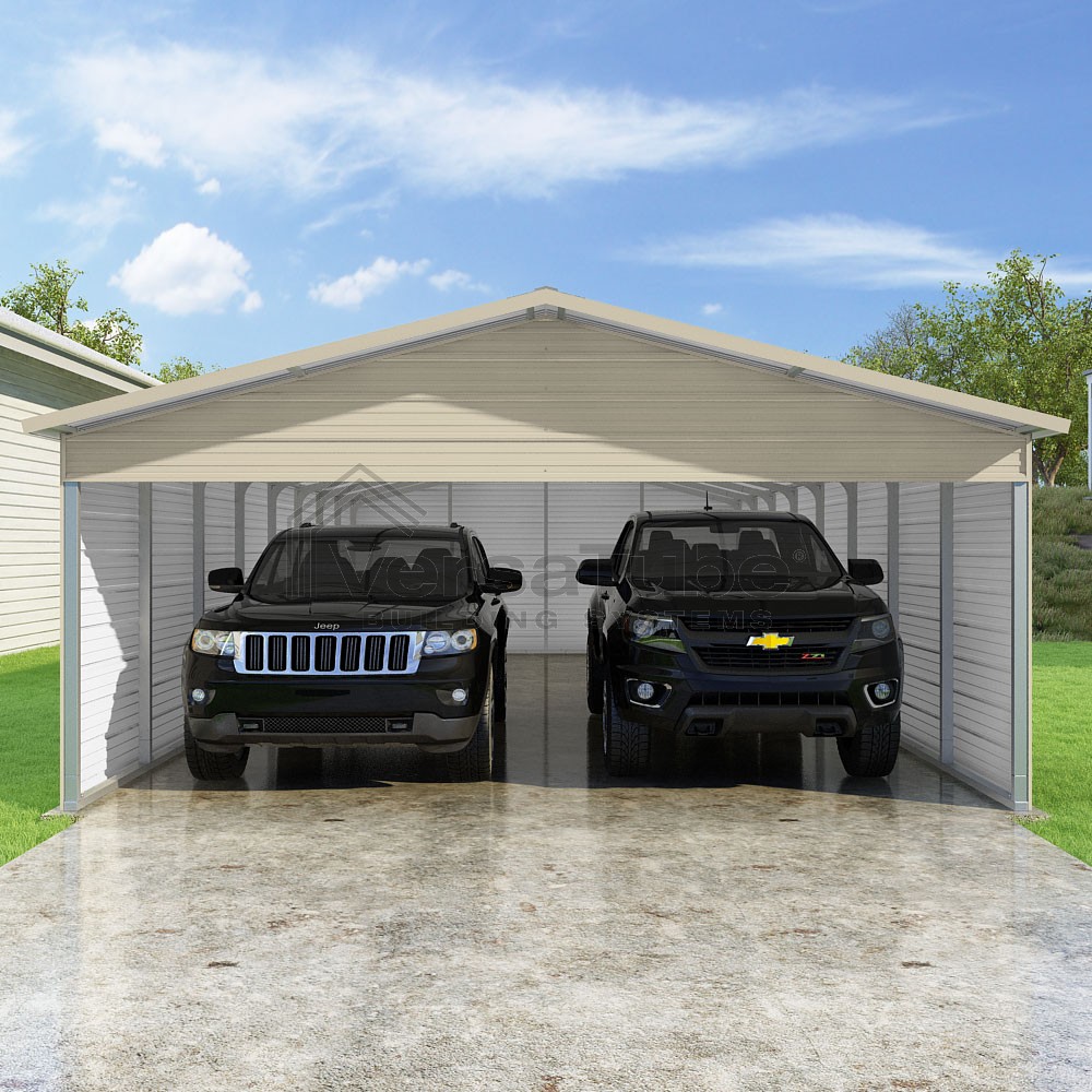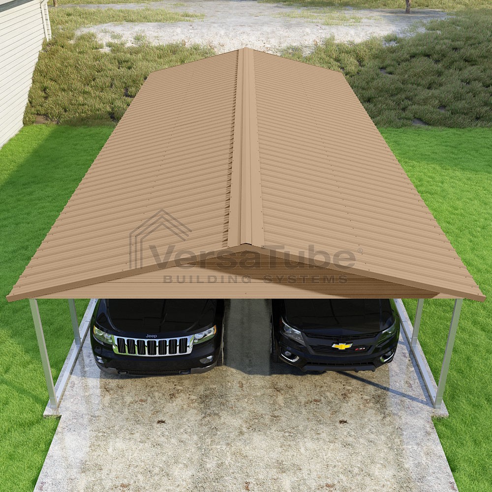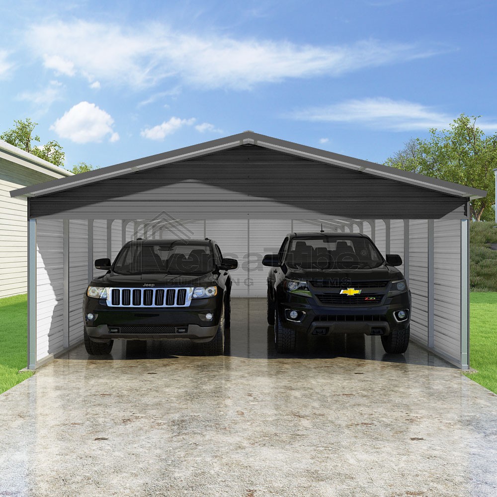 Pinnacle Series DIY carport kit features vertical sheet metal roof panels with ridge cap, gable and eave trim for an A-frame roof style and extended coverage on both ends.