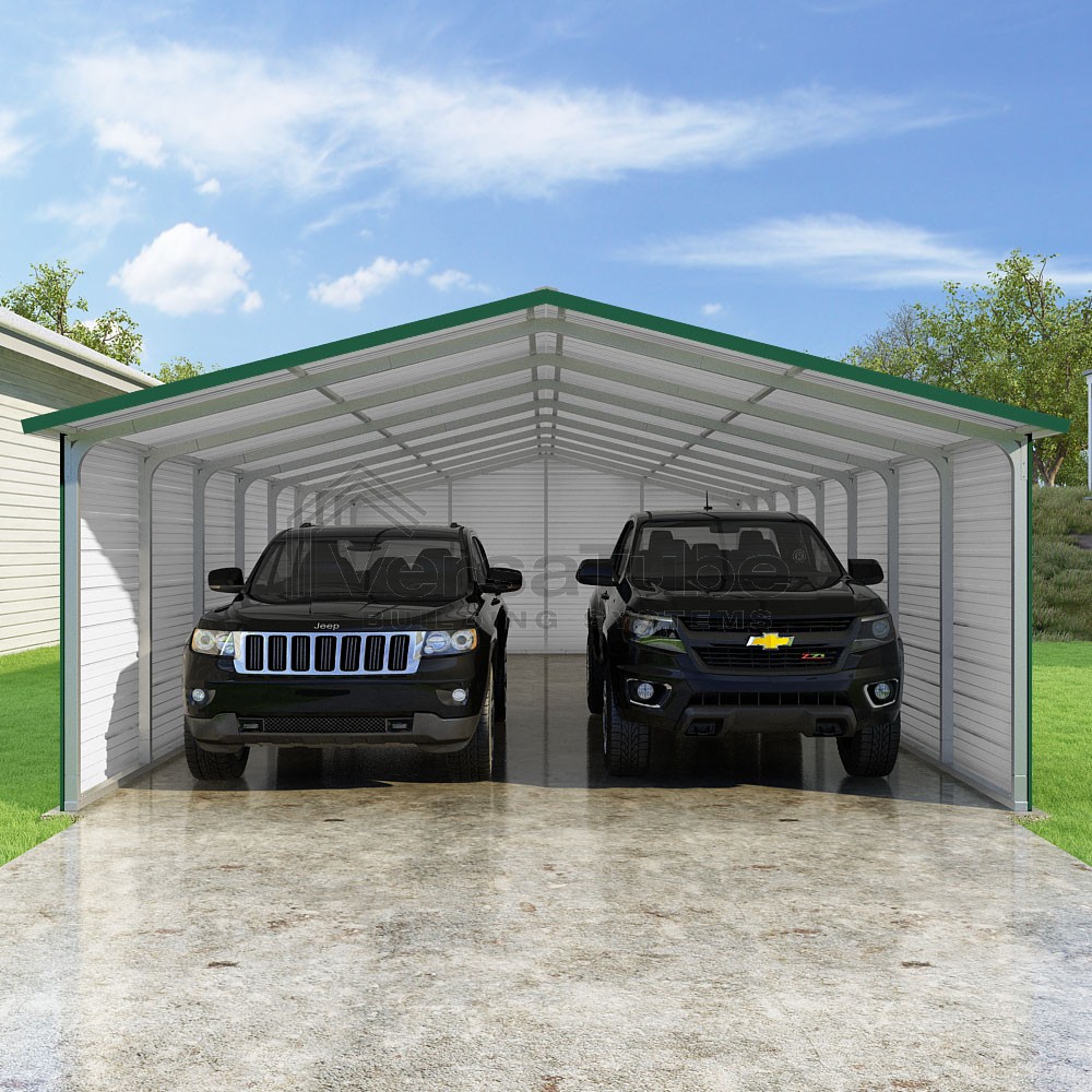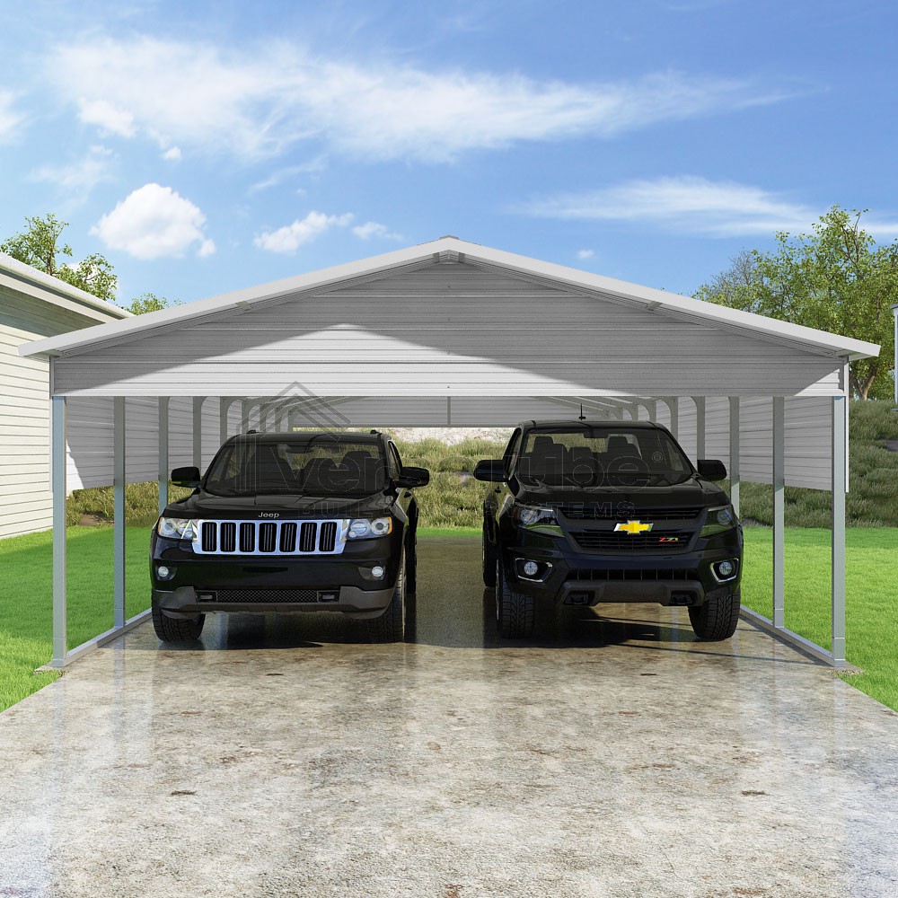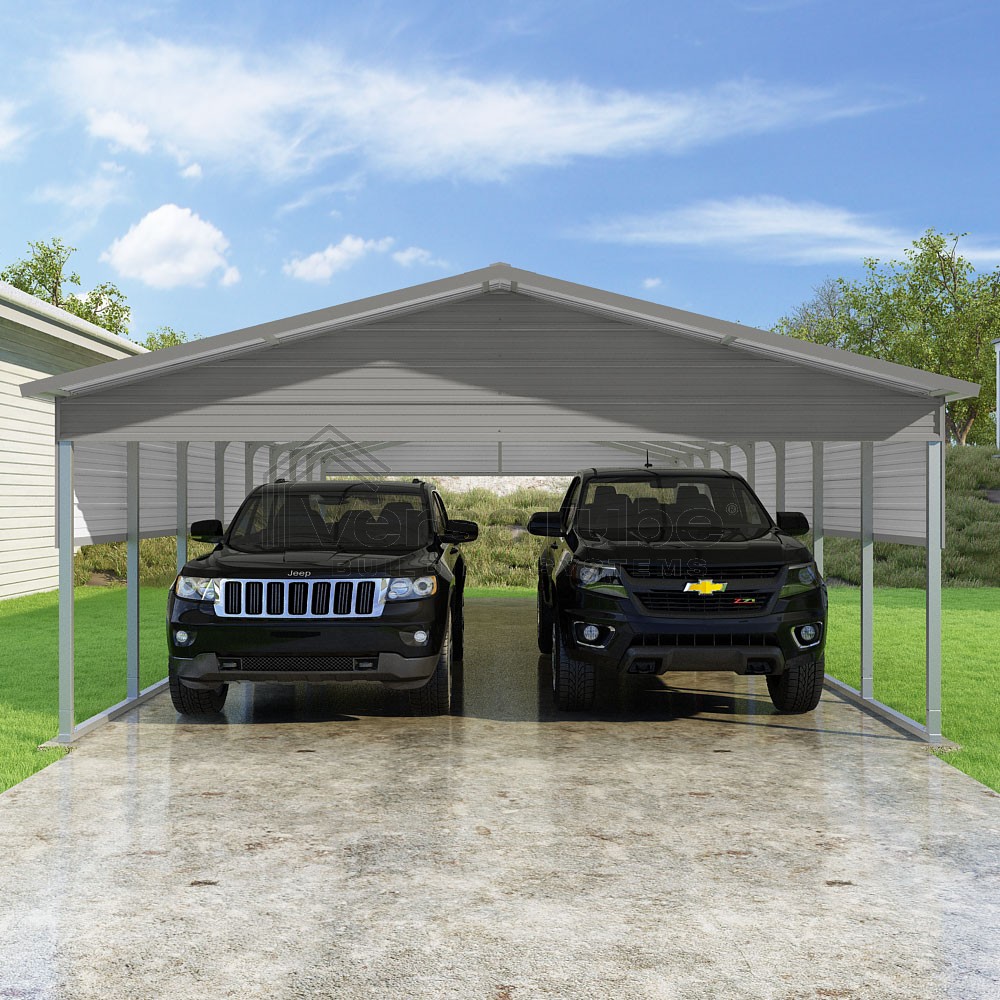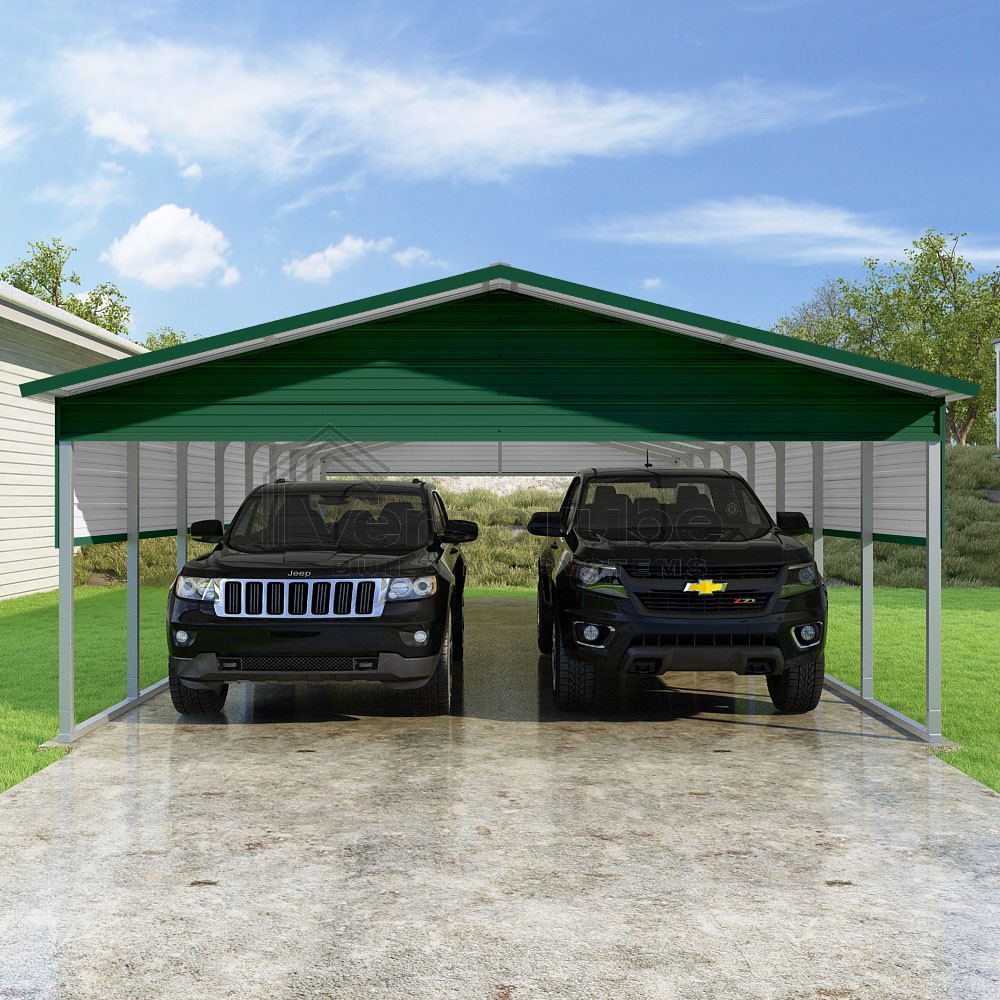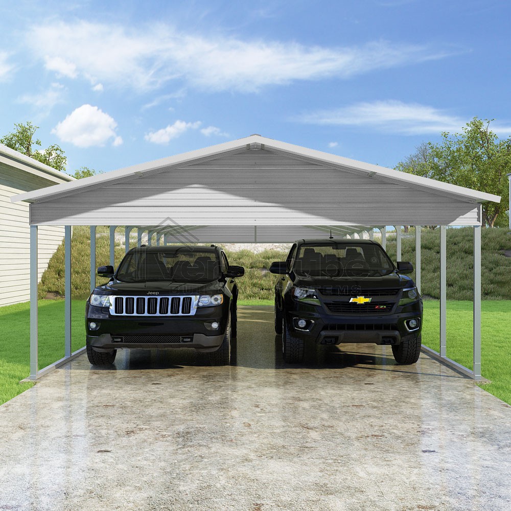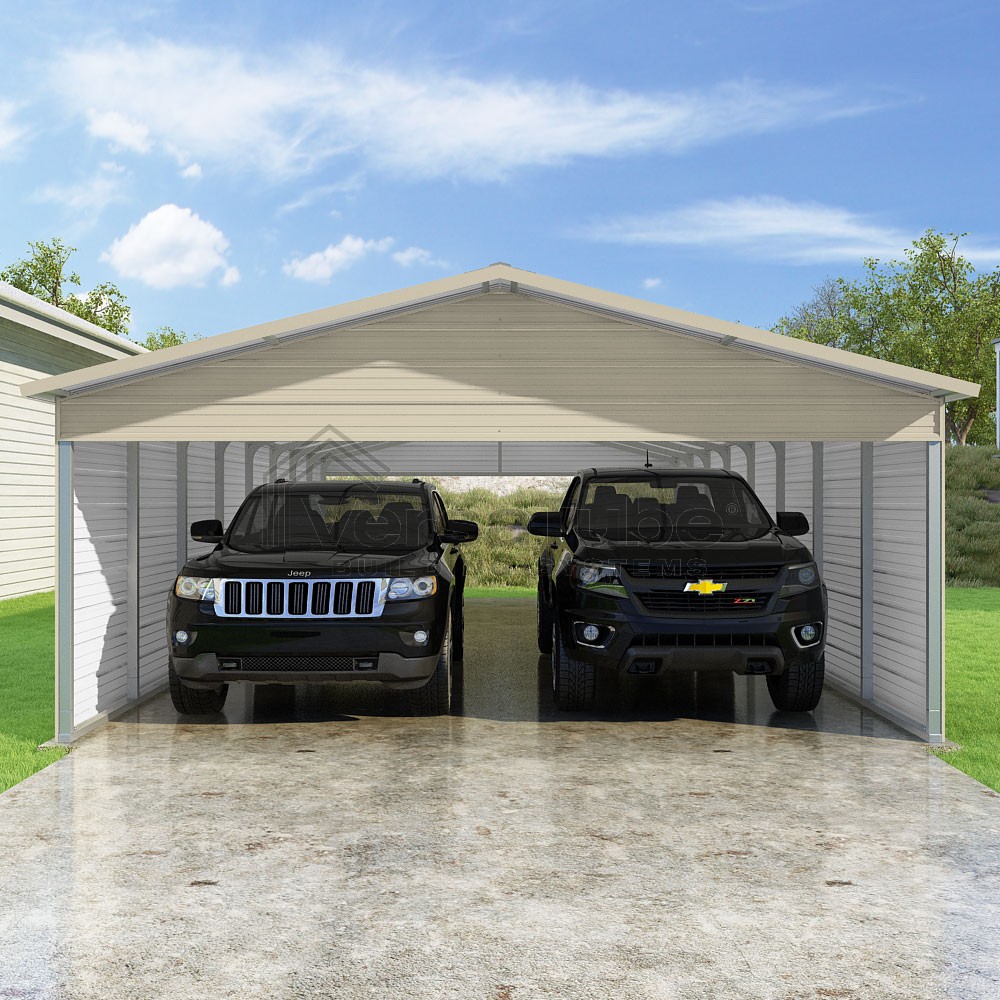 Pinnacle Series DIY carport kit features vertical sheet metal roof panels with ridge cap, gable and eave trim for an A-frame roof style and extended coverage on both ends.