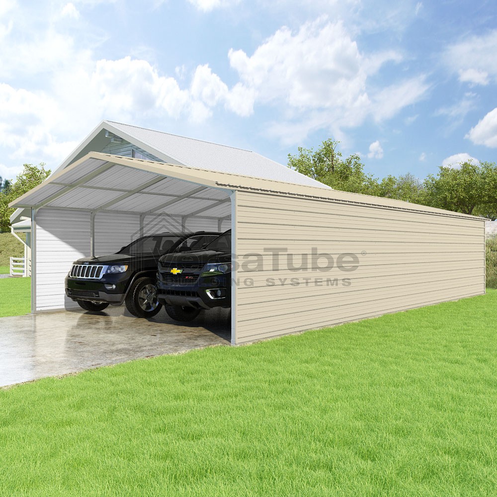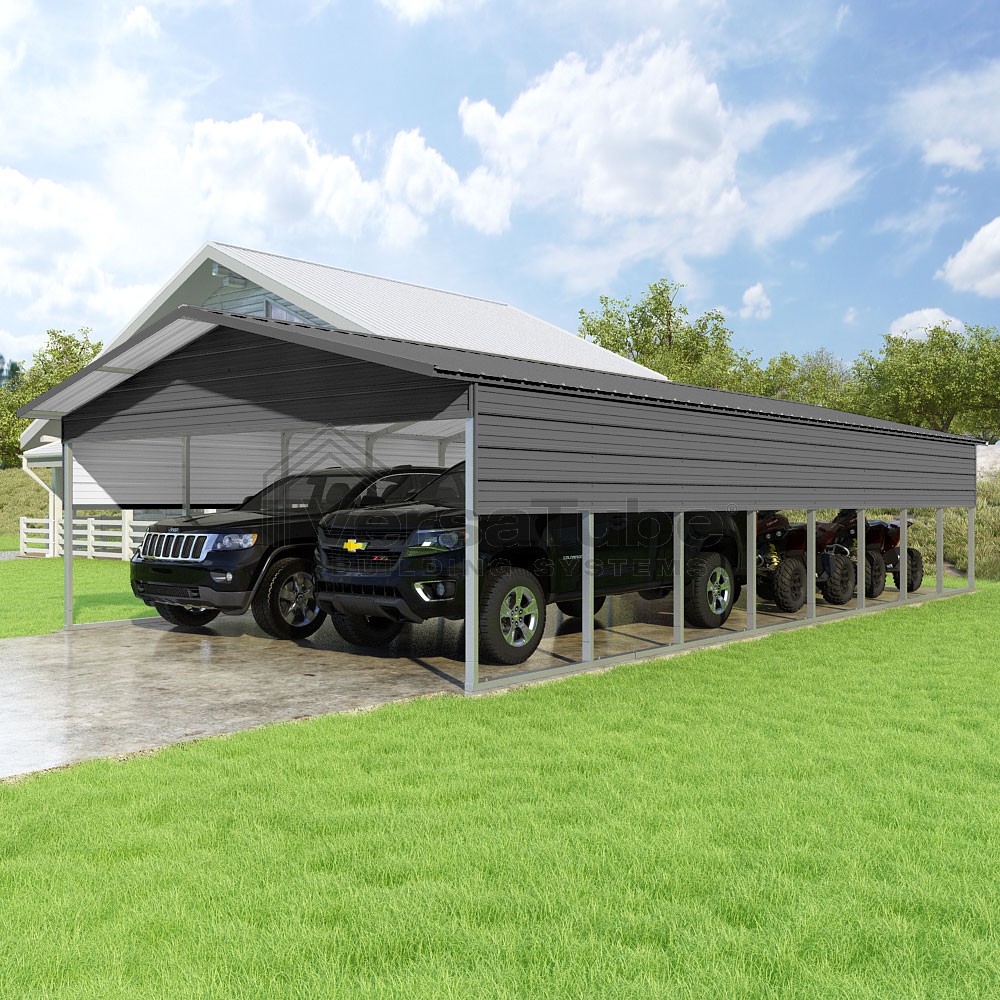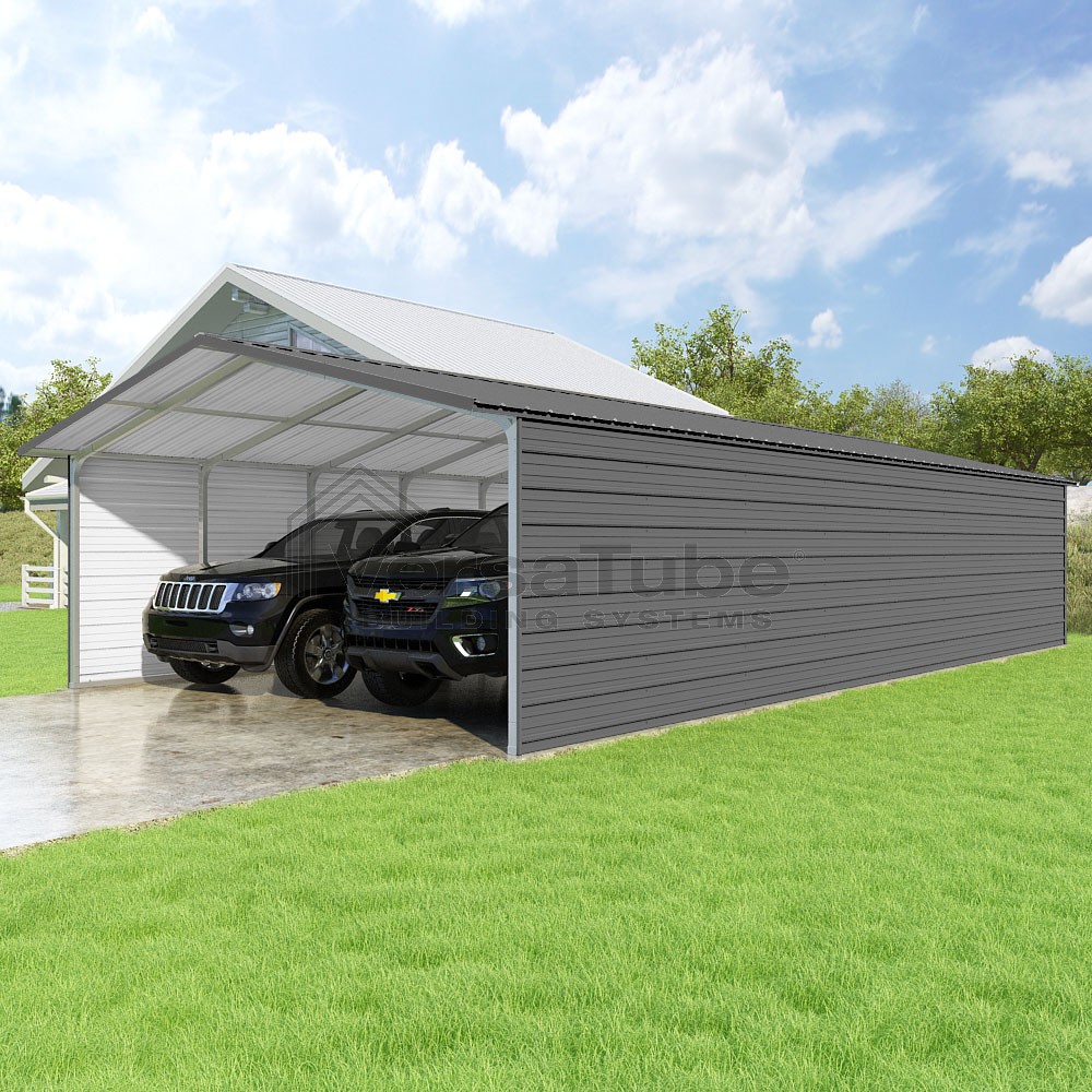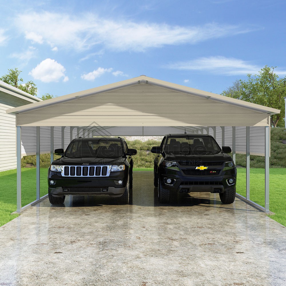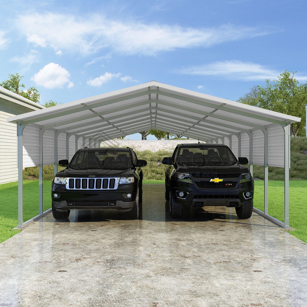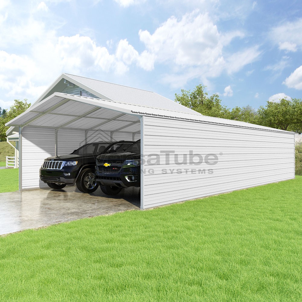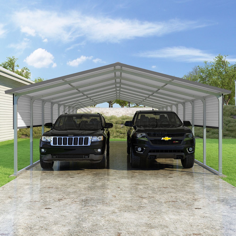 Pinnacle Series DIY carport kit features vertical sheet metal roof panels with ridge cap, gable and eave trim for an A-frame roof style and extended coverage on both ends.