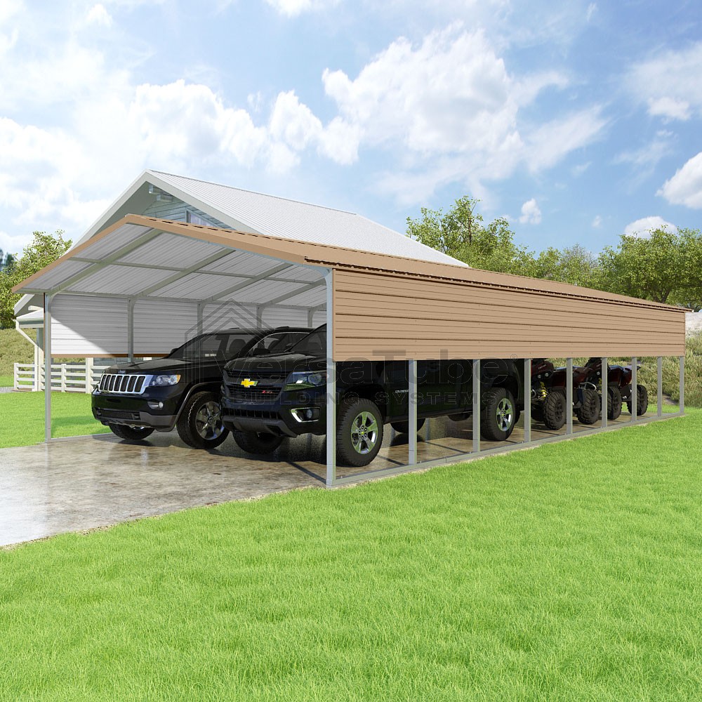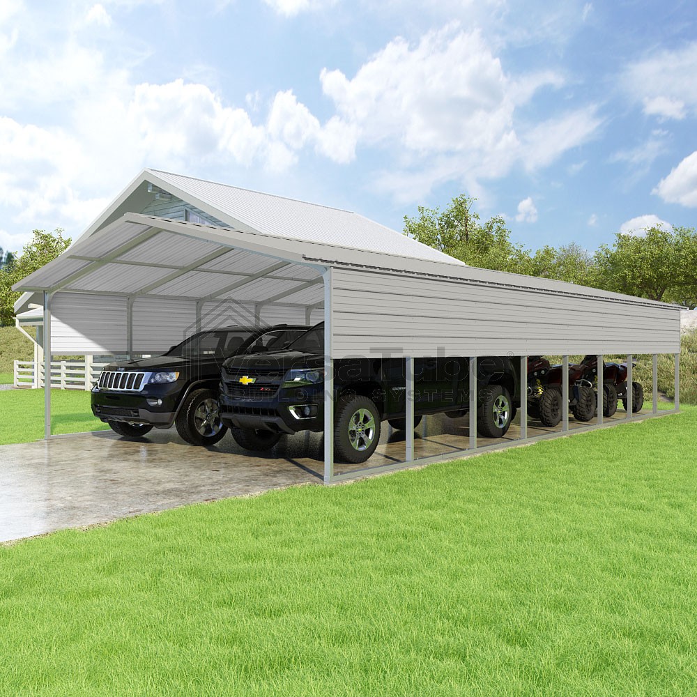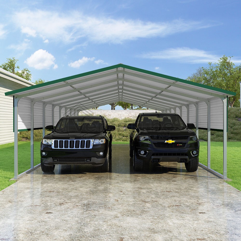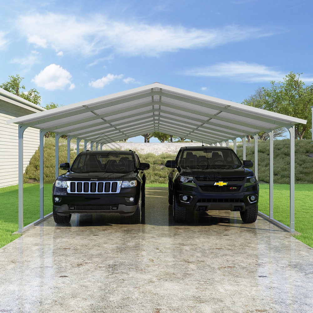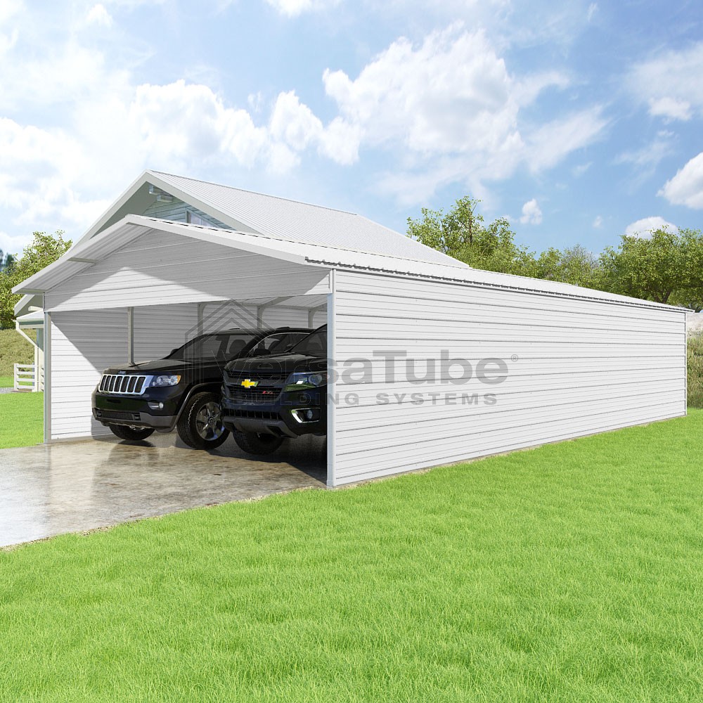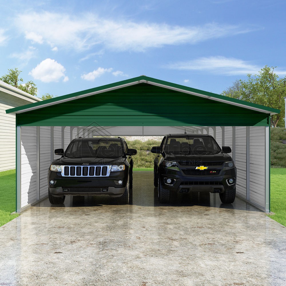 Pinnacle Series DIY carport kit features vertical sheet metal roof panels with ridge cap, gable and eave trim for an A-frame roof style and extended coverage on both ends.