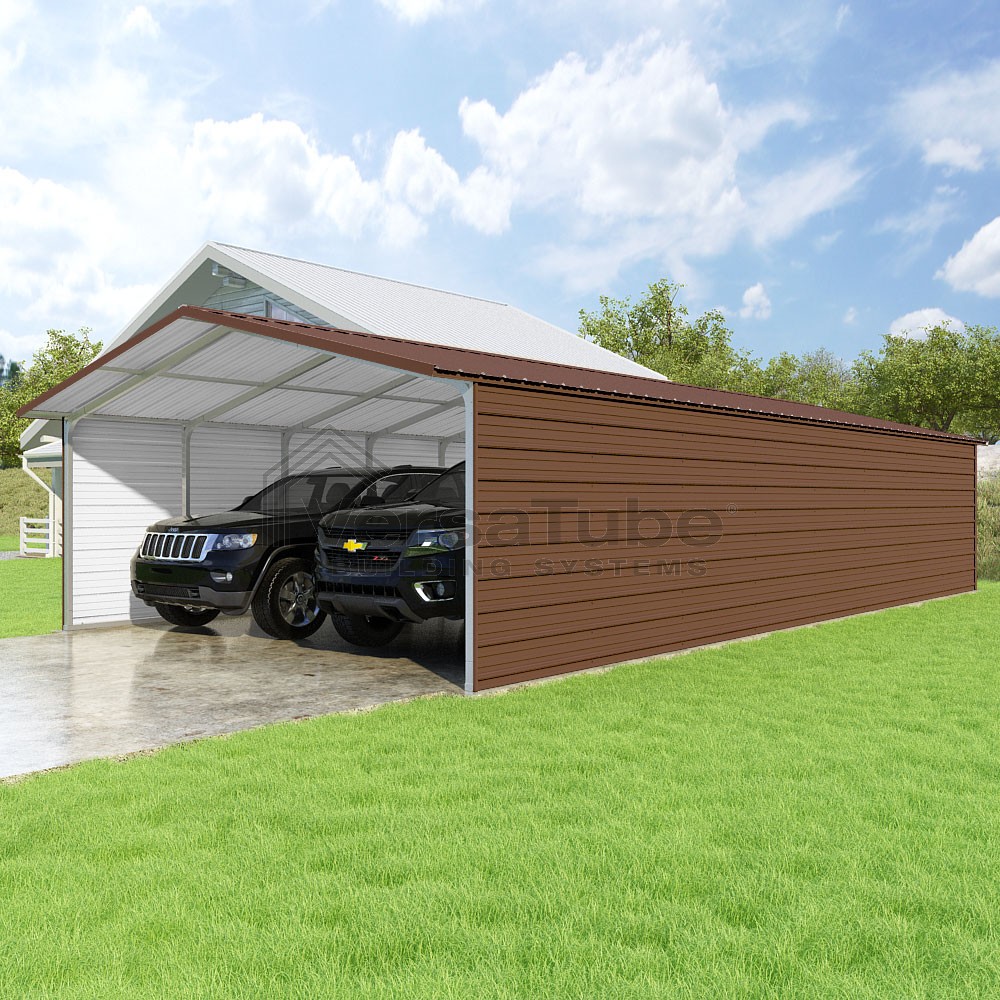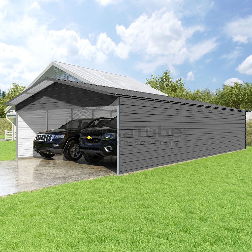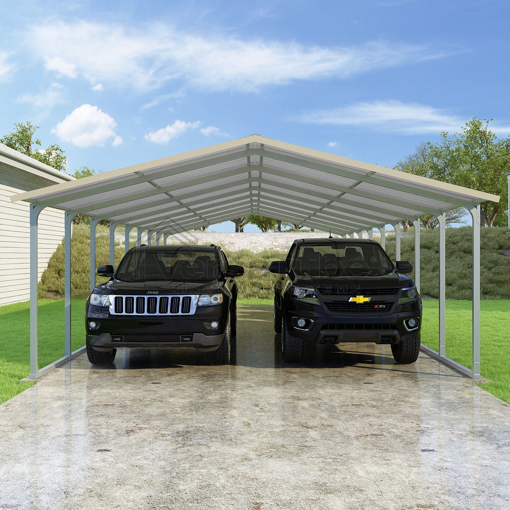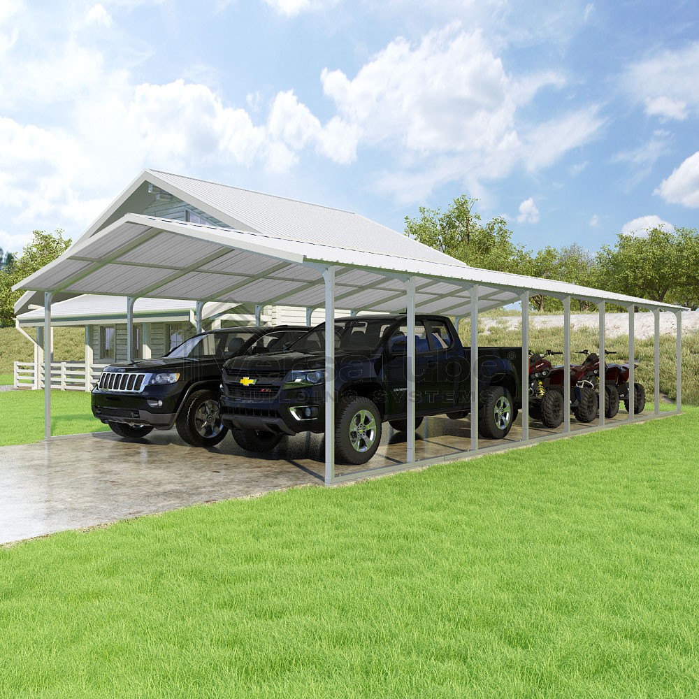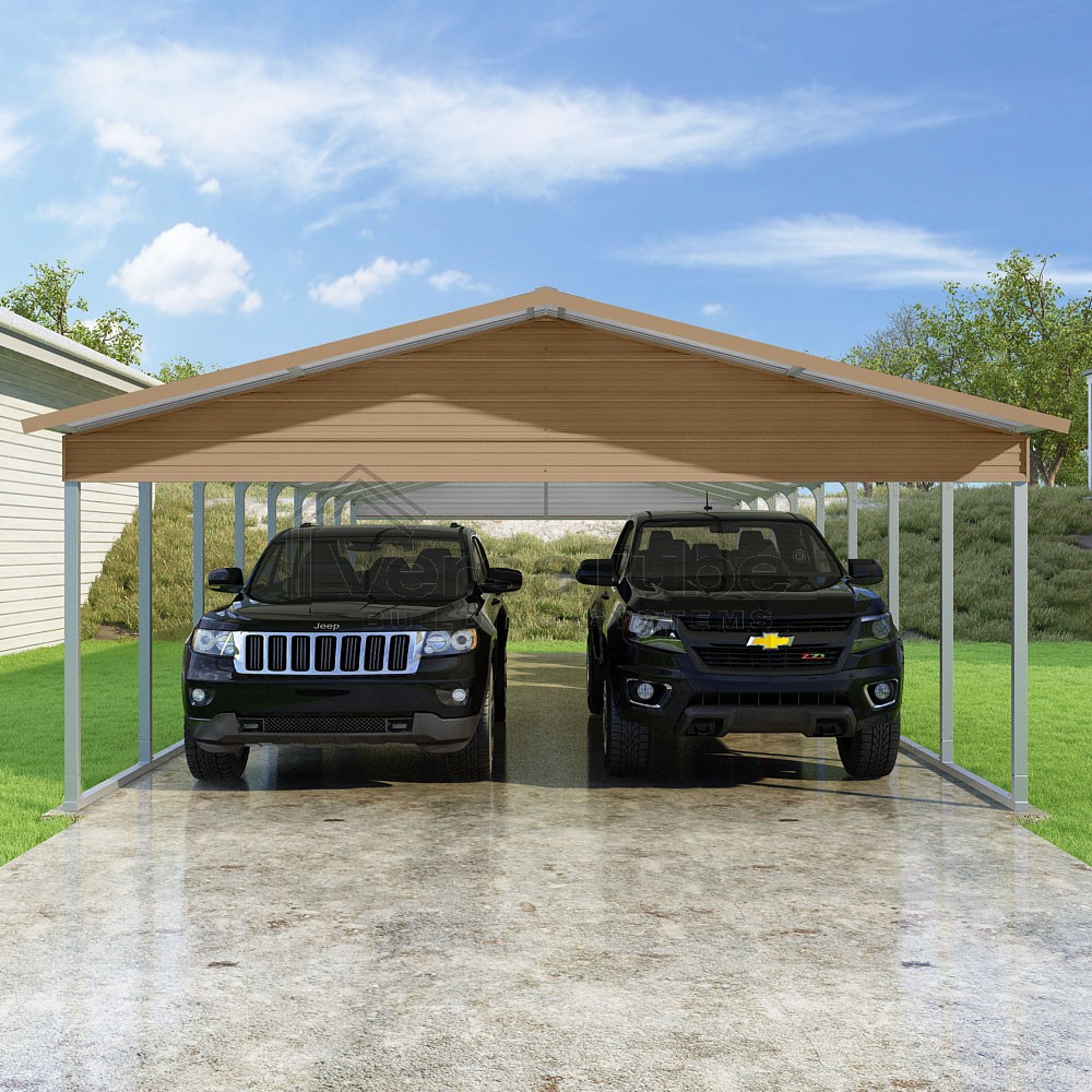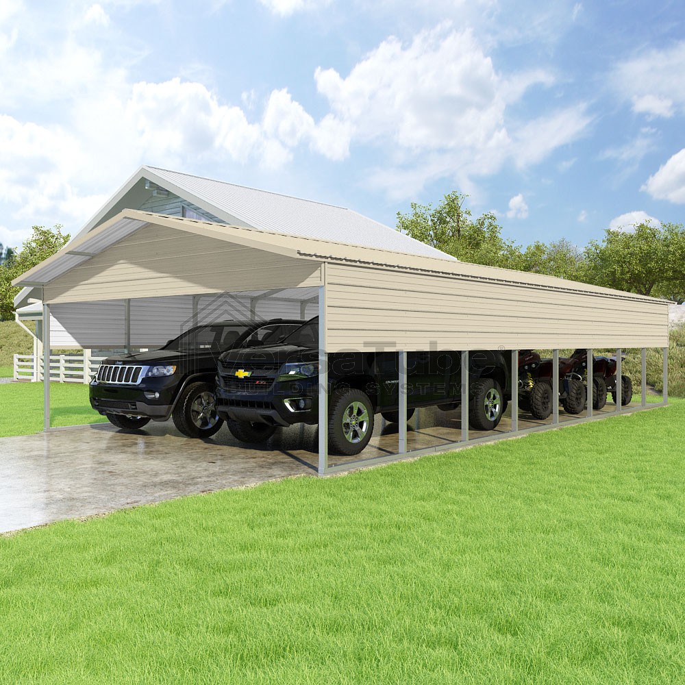 Pinnacle Series DIY carport kit features vertical sheet metal roof panels with ridge cap, gable and eave trim for an A-frame roof style and extended coverage on both ends.