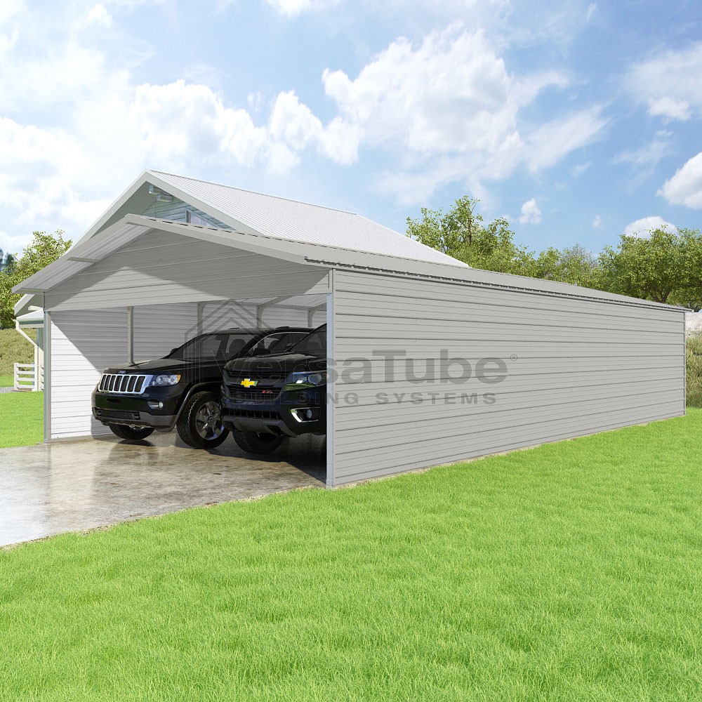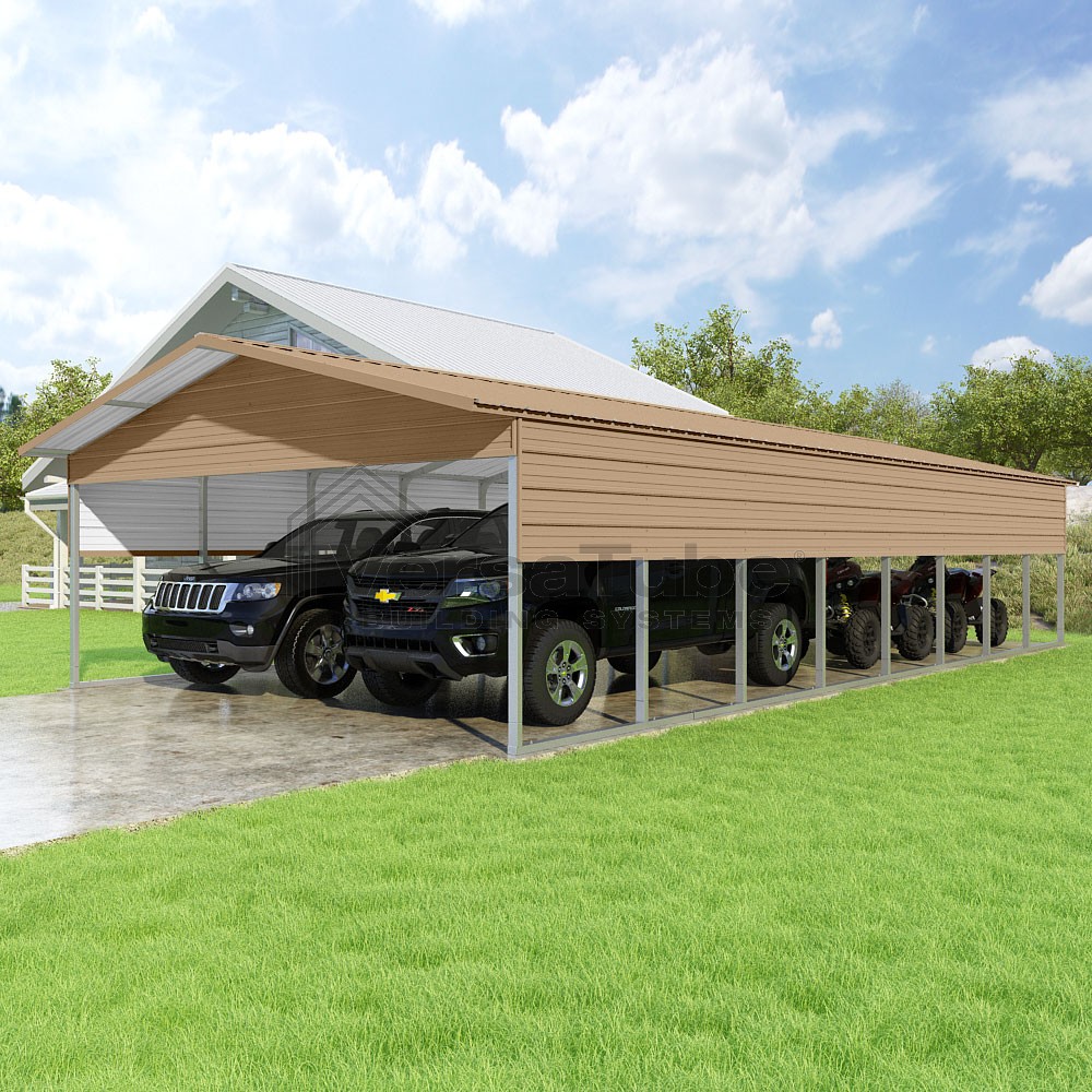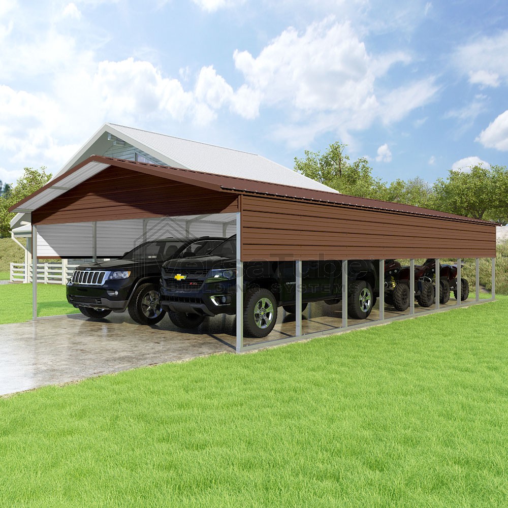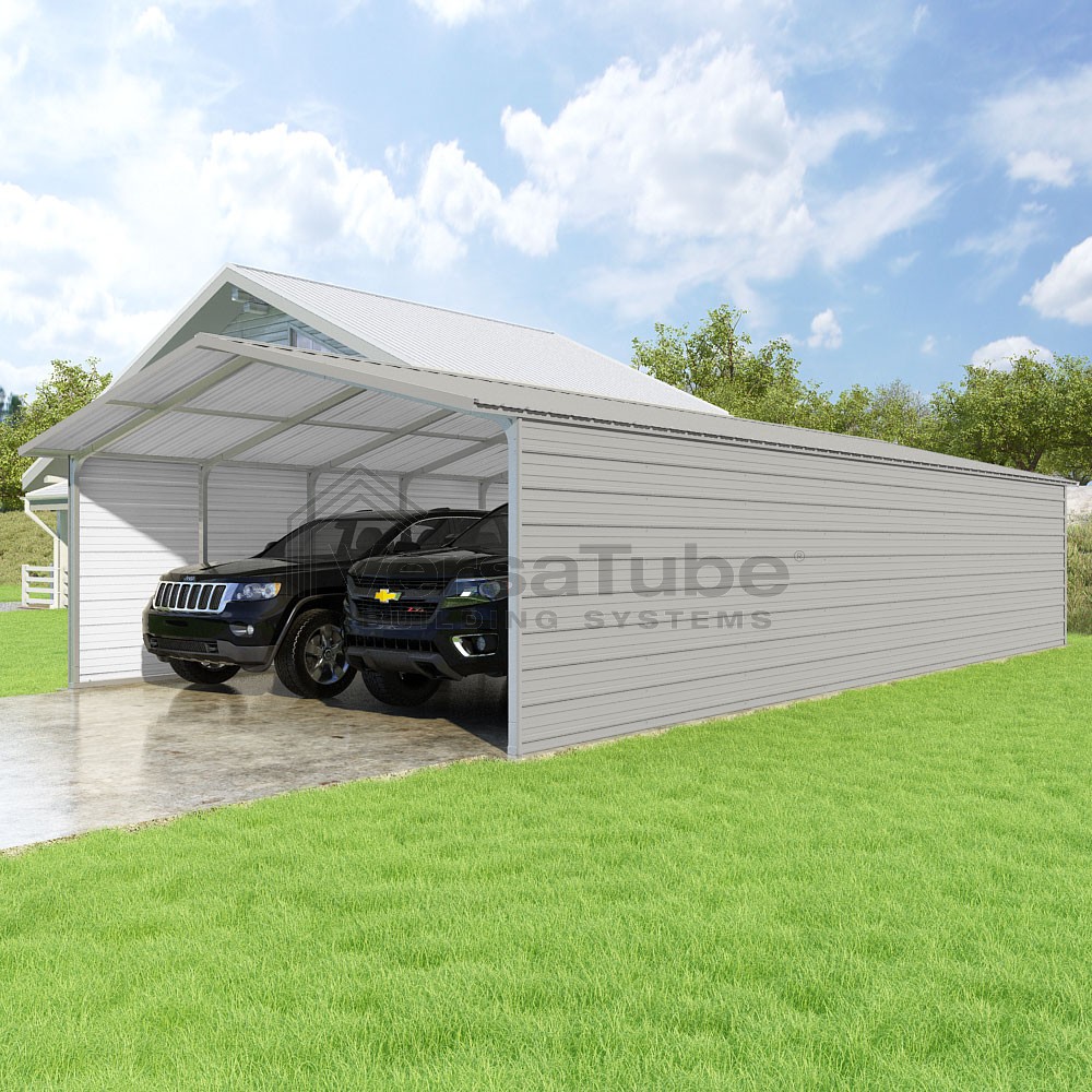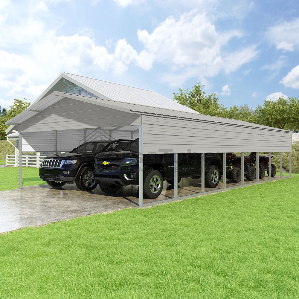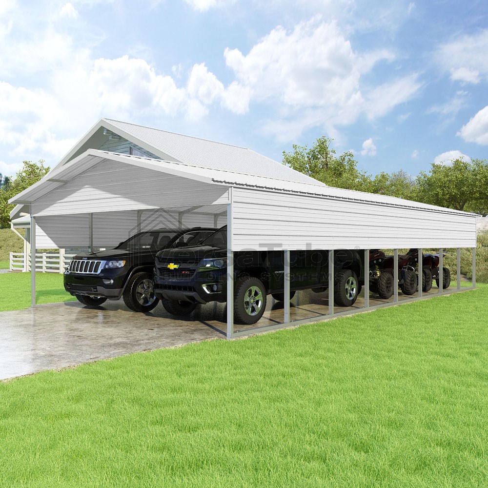 Pinnacle Series DIY carport kit features vertical sheet metal roof panels with ridge cap, gable and eave trim for an A-frame roof style and extended coverage on both ends.